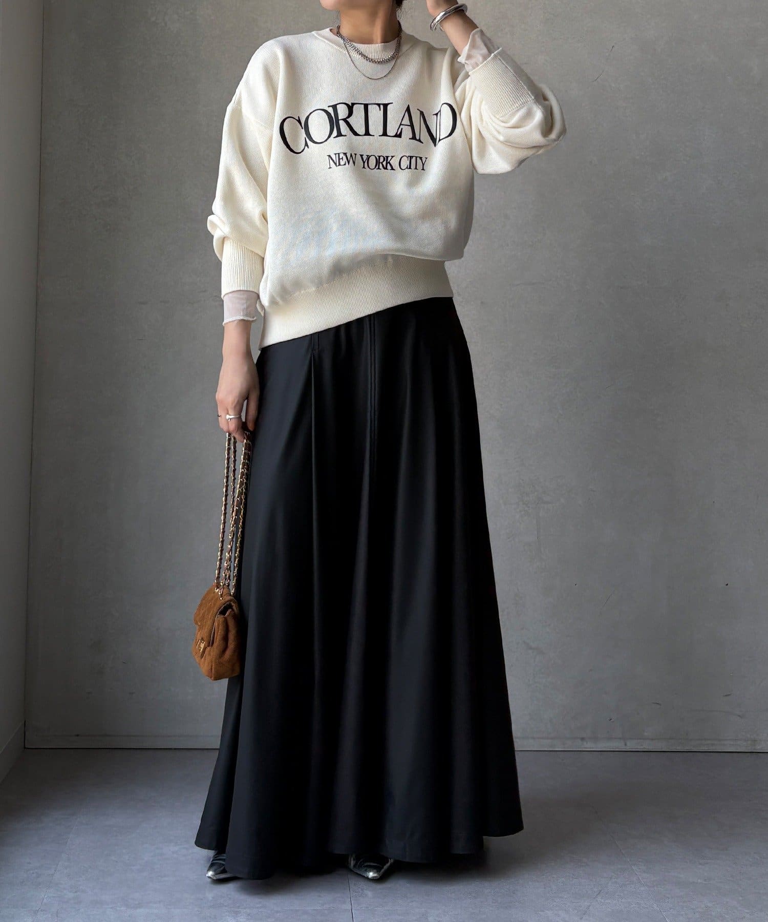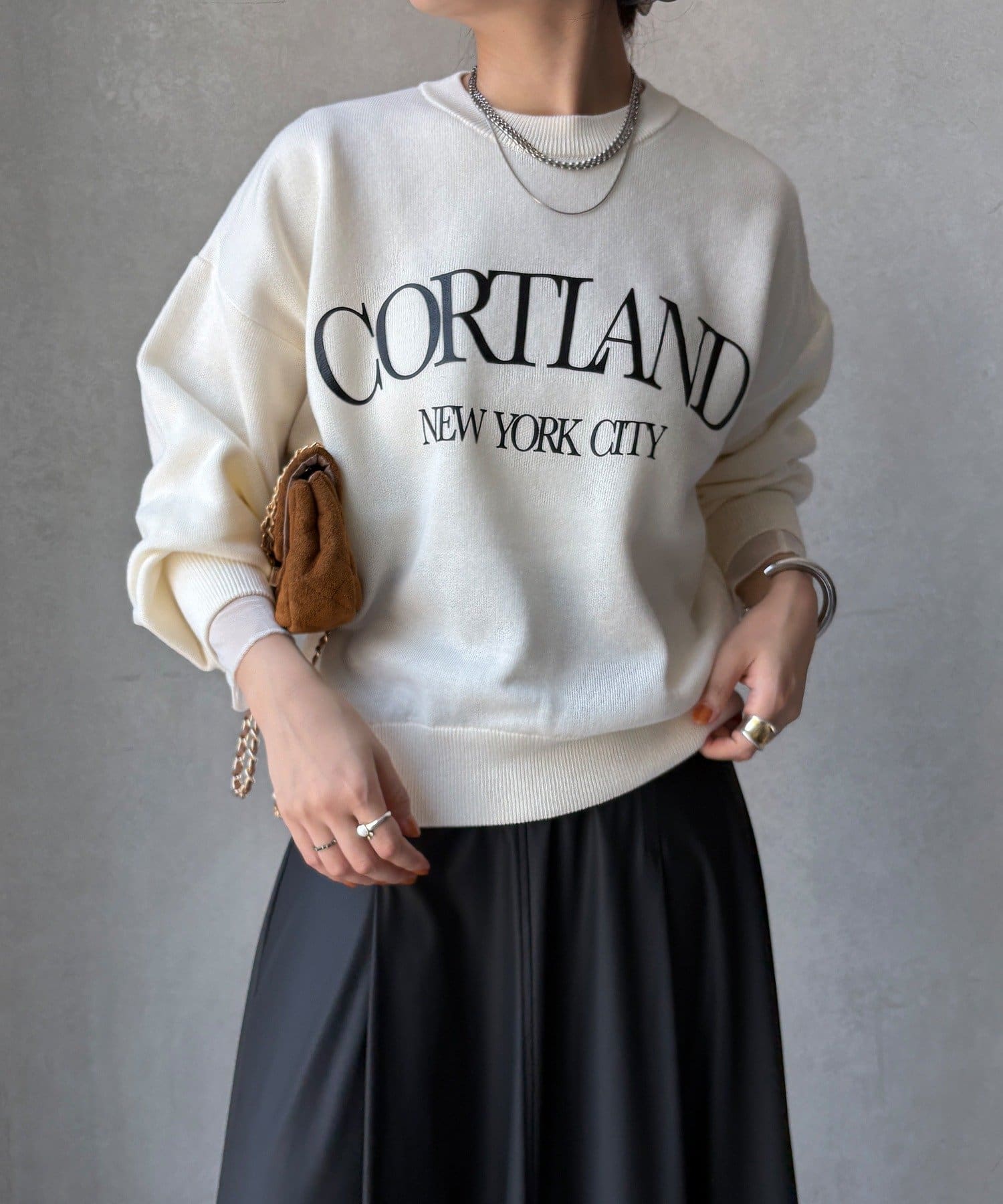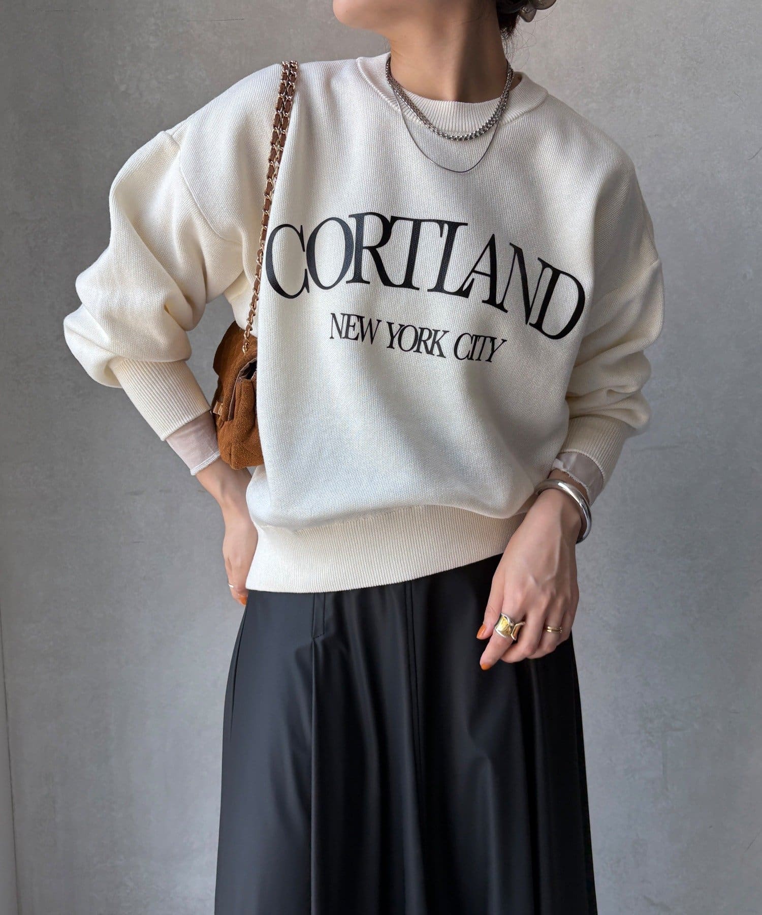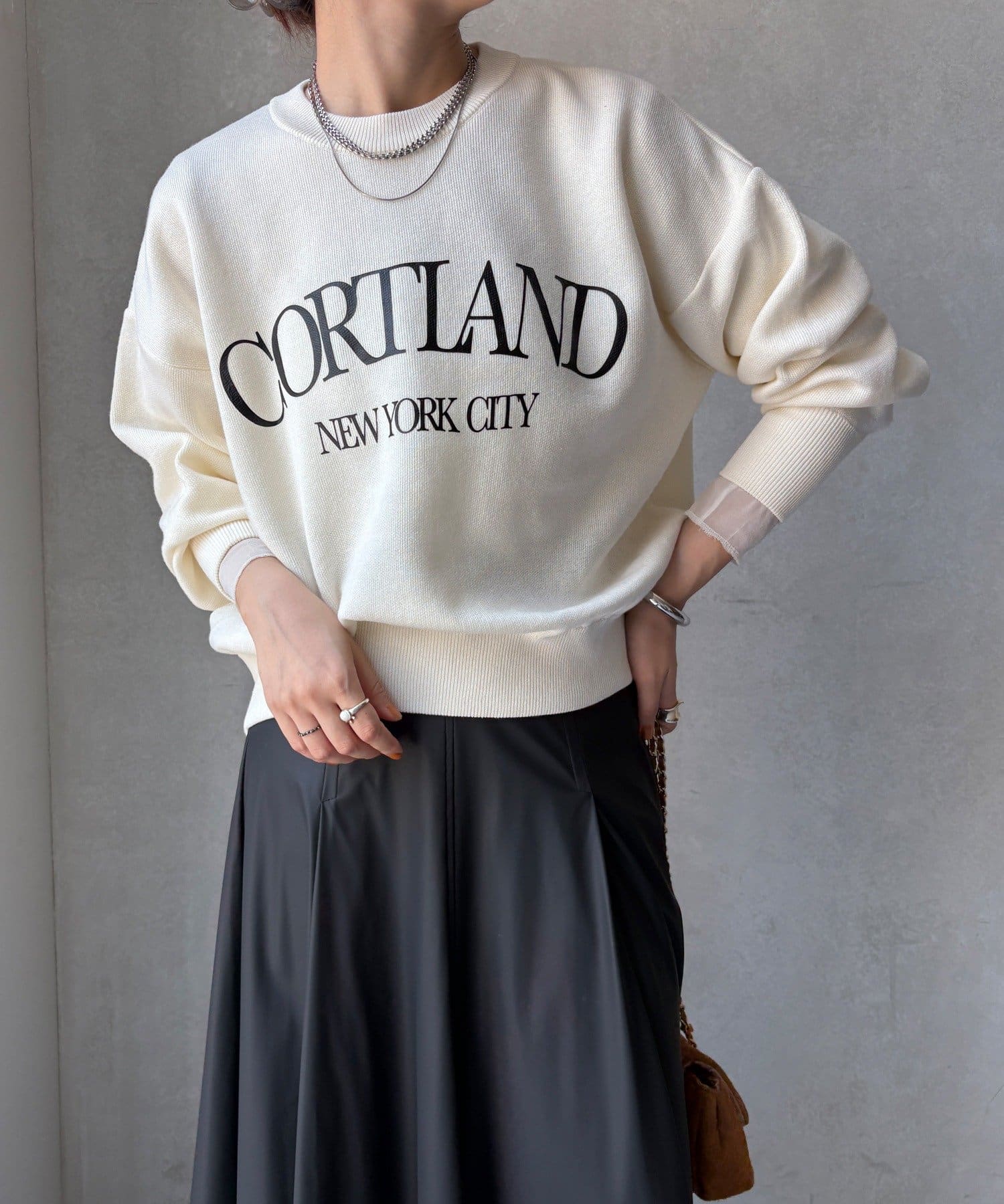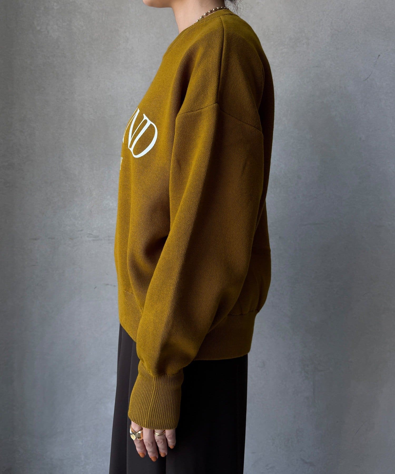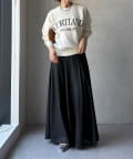 カジュアルなロゴデザインながら、キレイめに着れる素材感なので大人っぽい印象に。