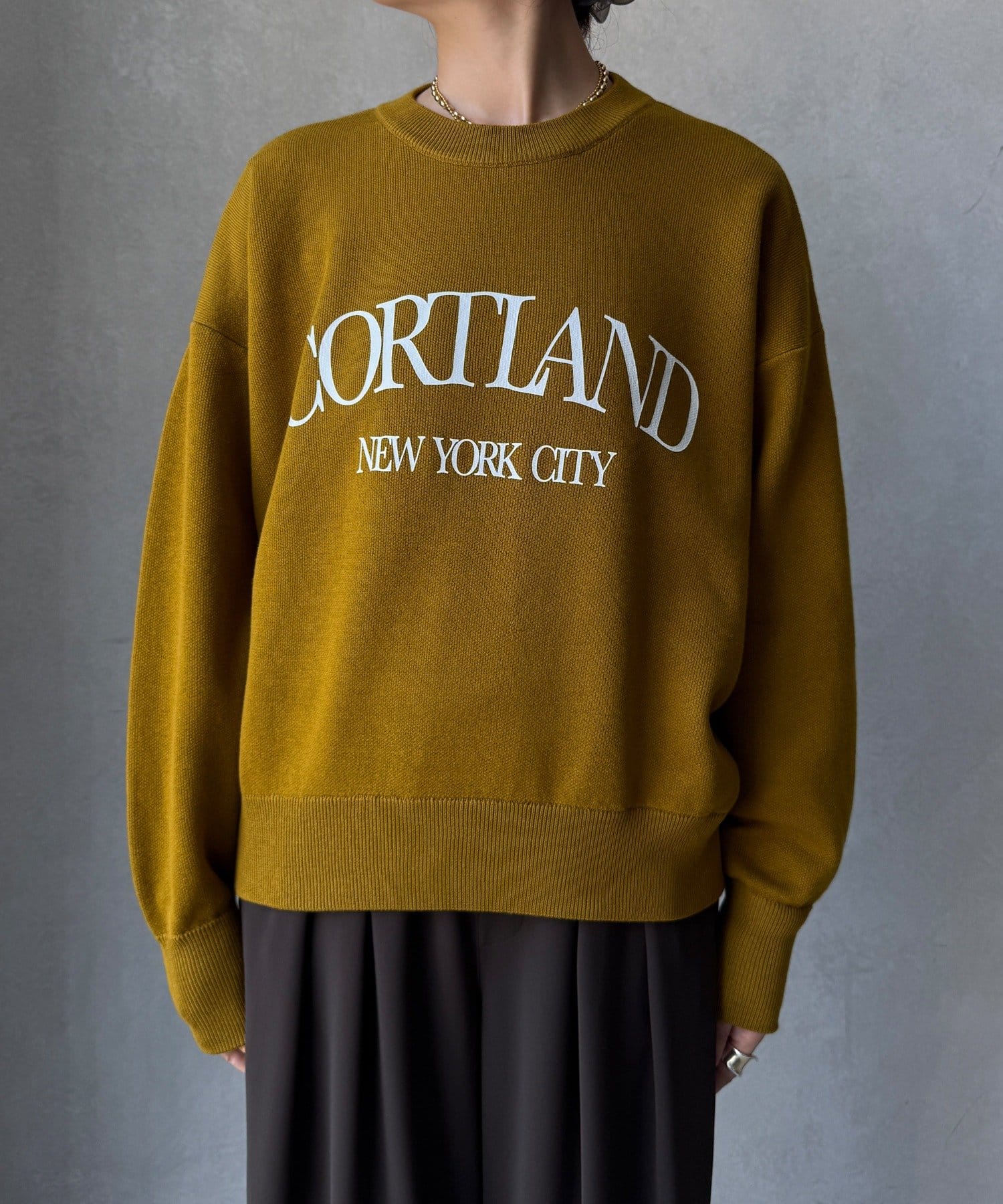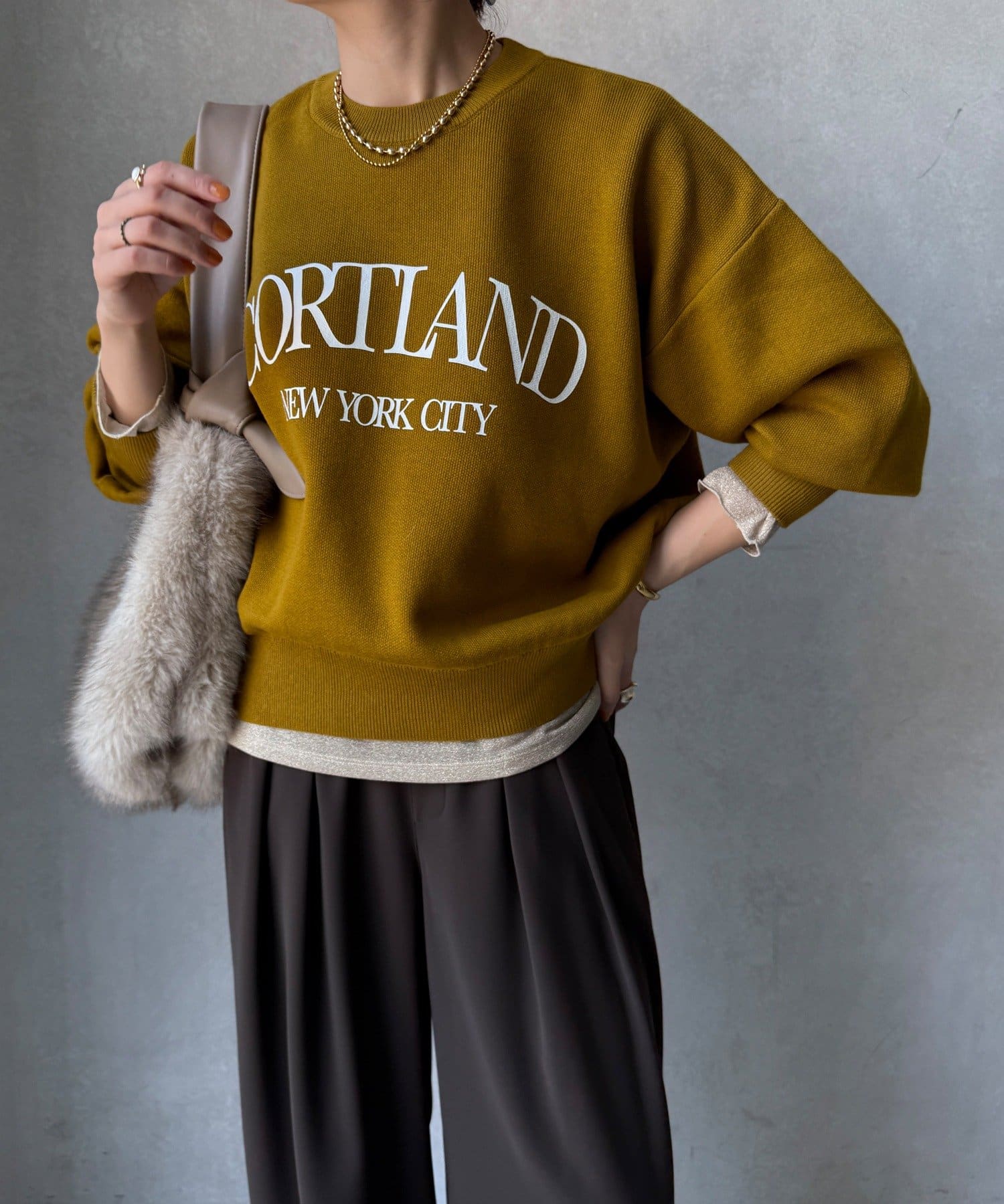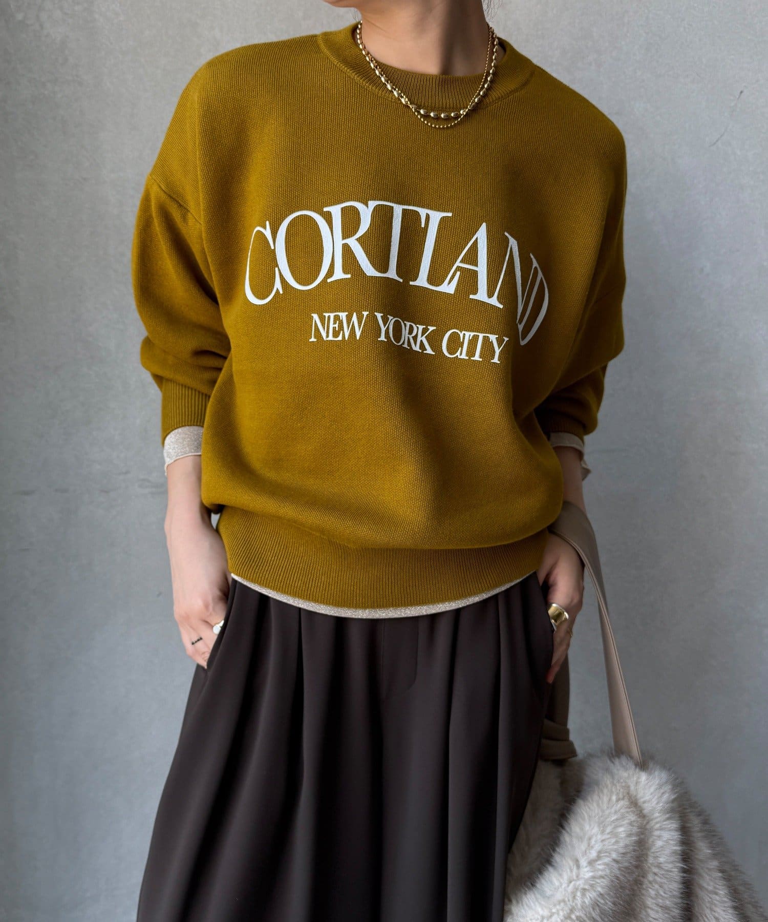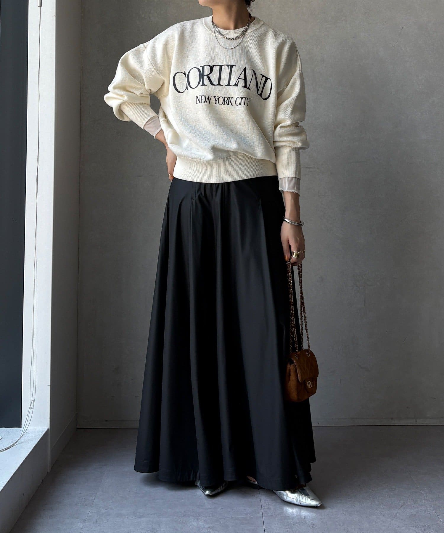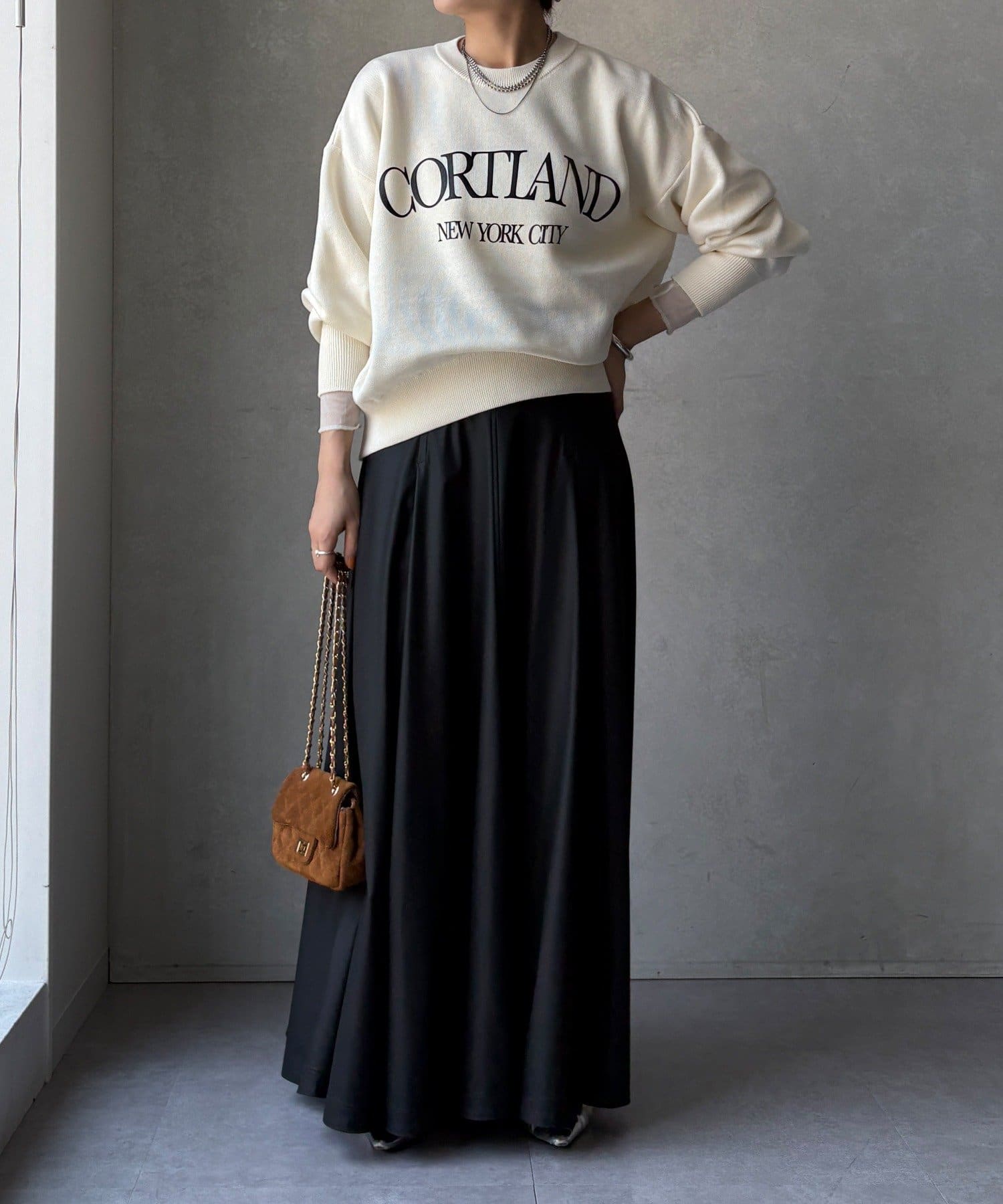 カジュアルなロゴデザインながら、キレイめに着れる素材感なので大人っぽい印象に。