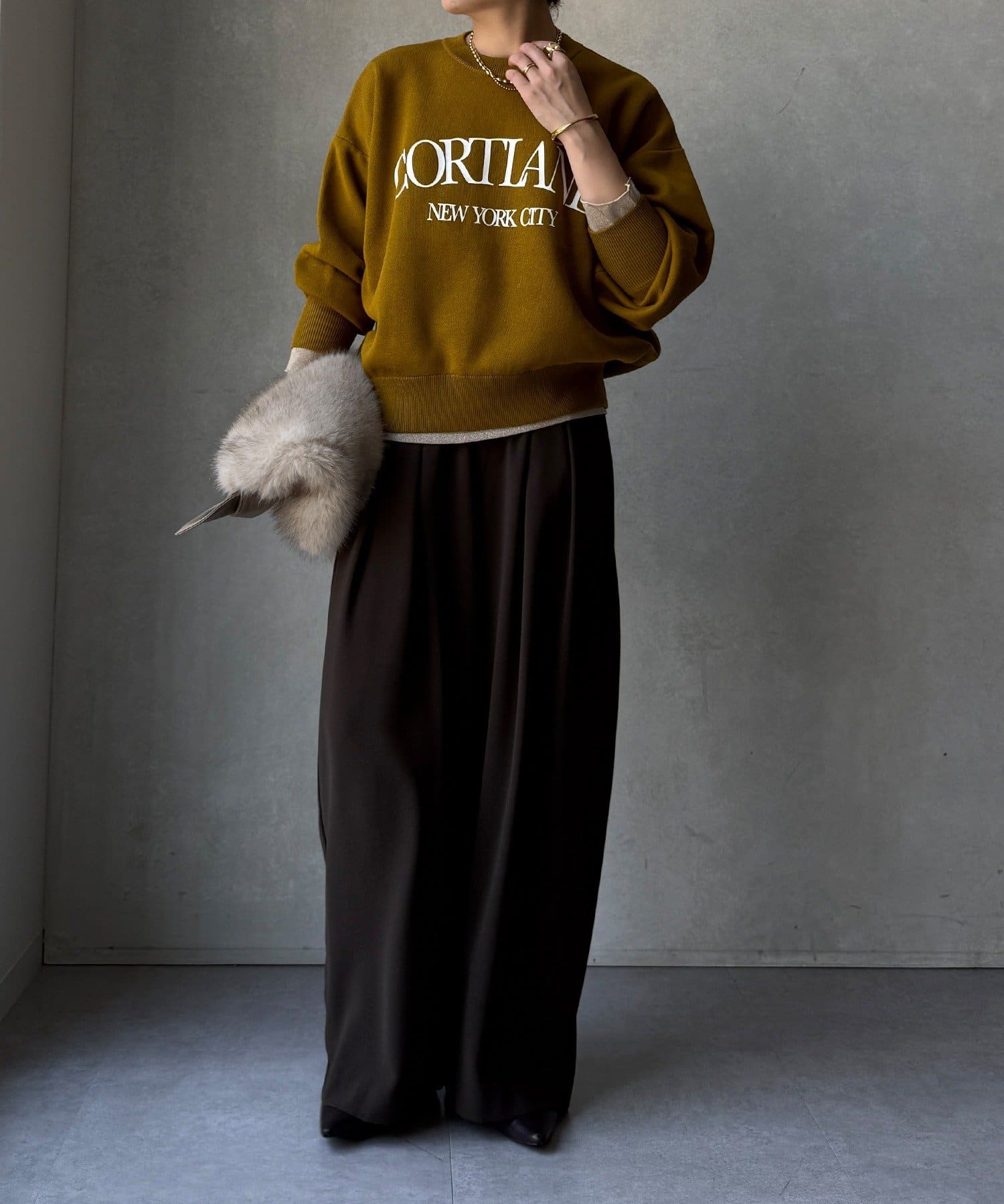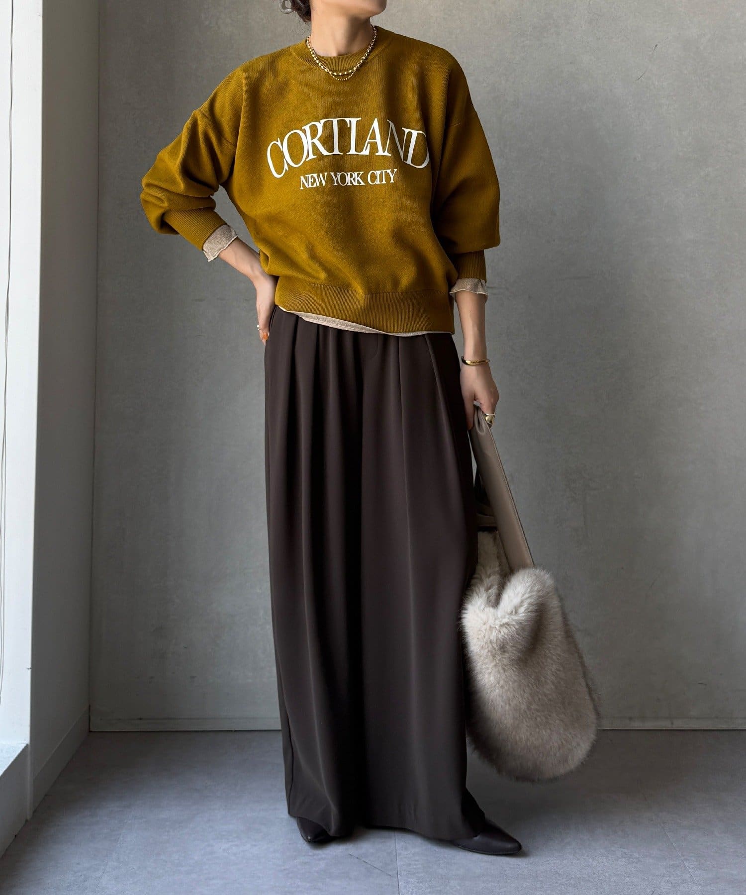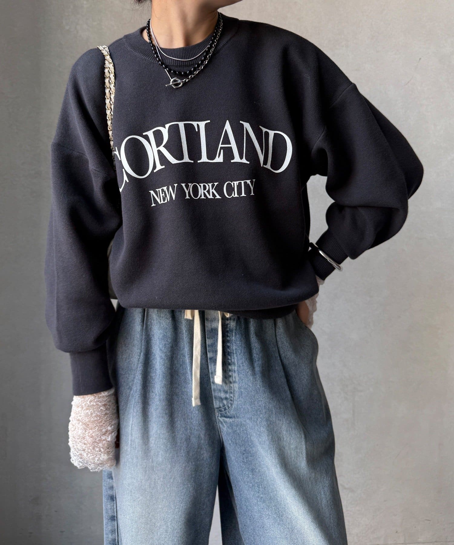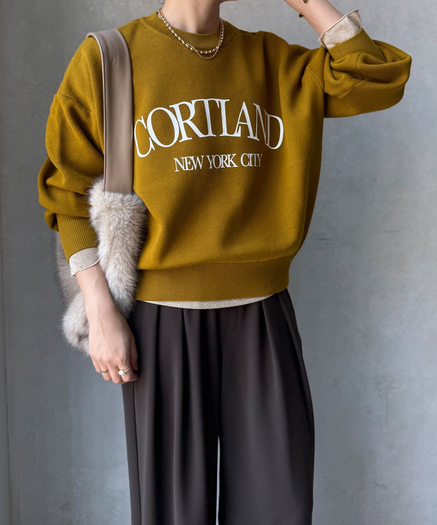 カジュアルなロゴデザインながら、キレイめに着れる素材感なので大人っぽい印象に。
