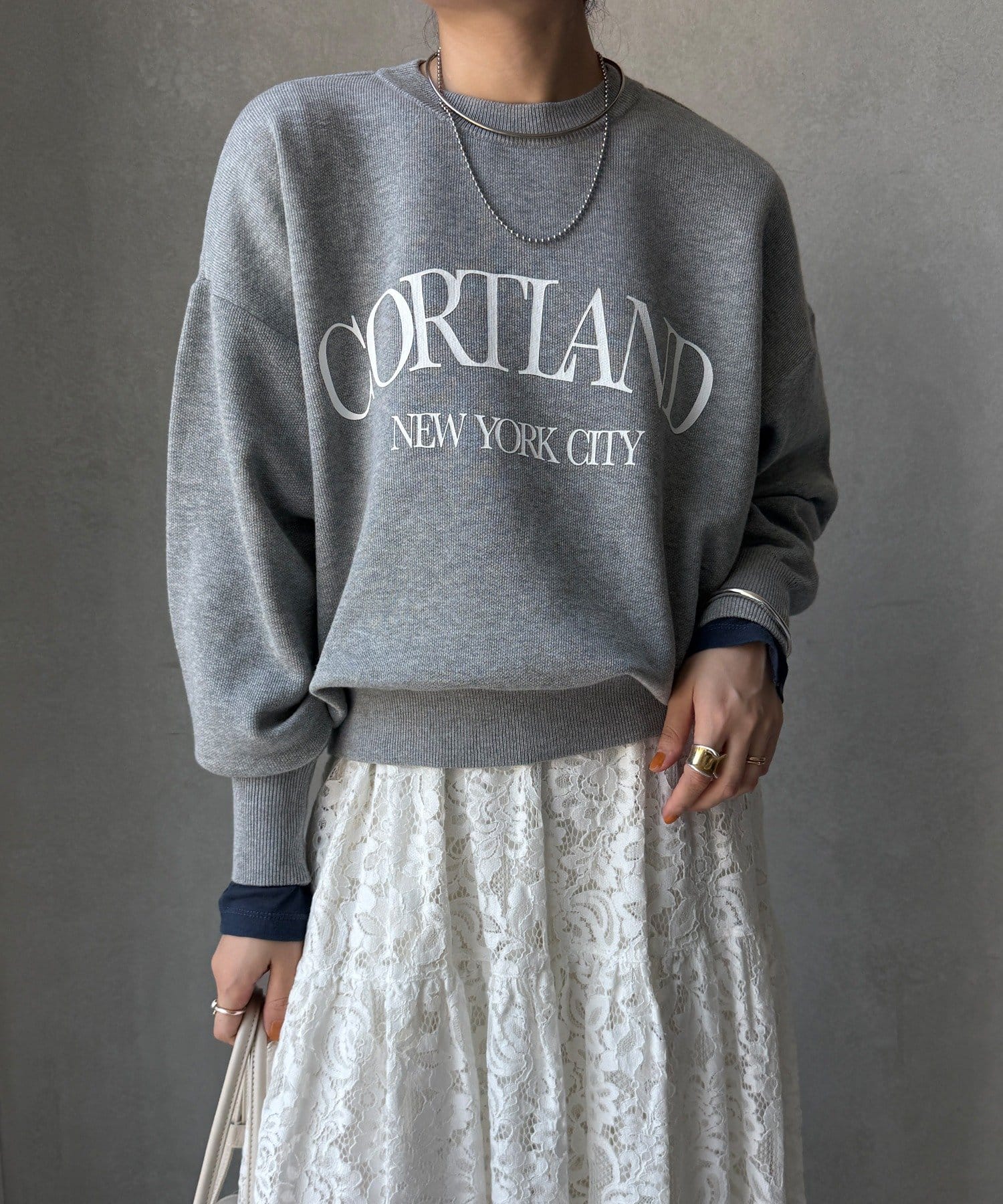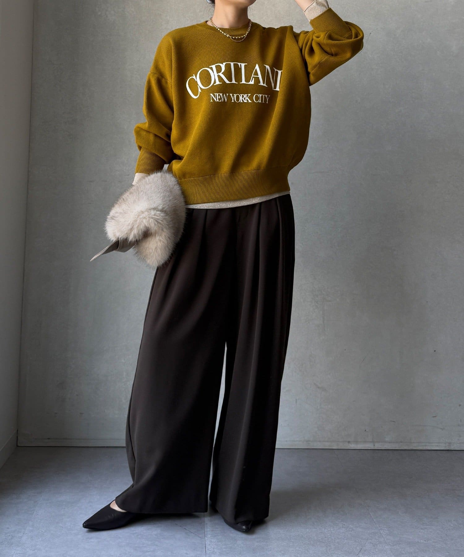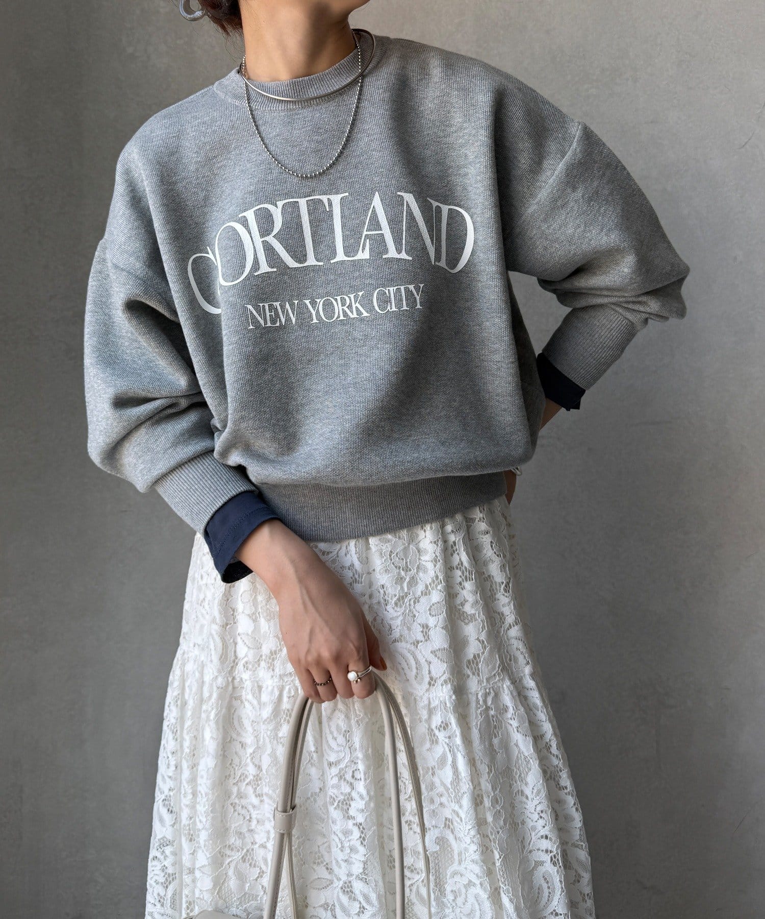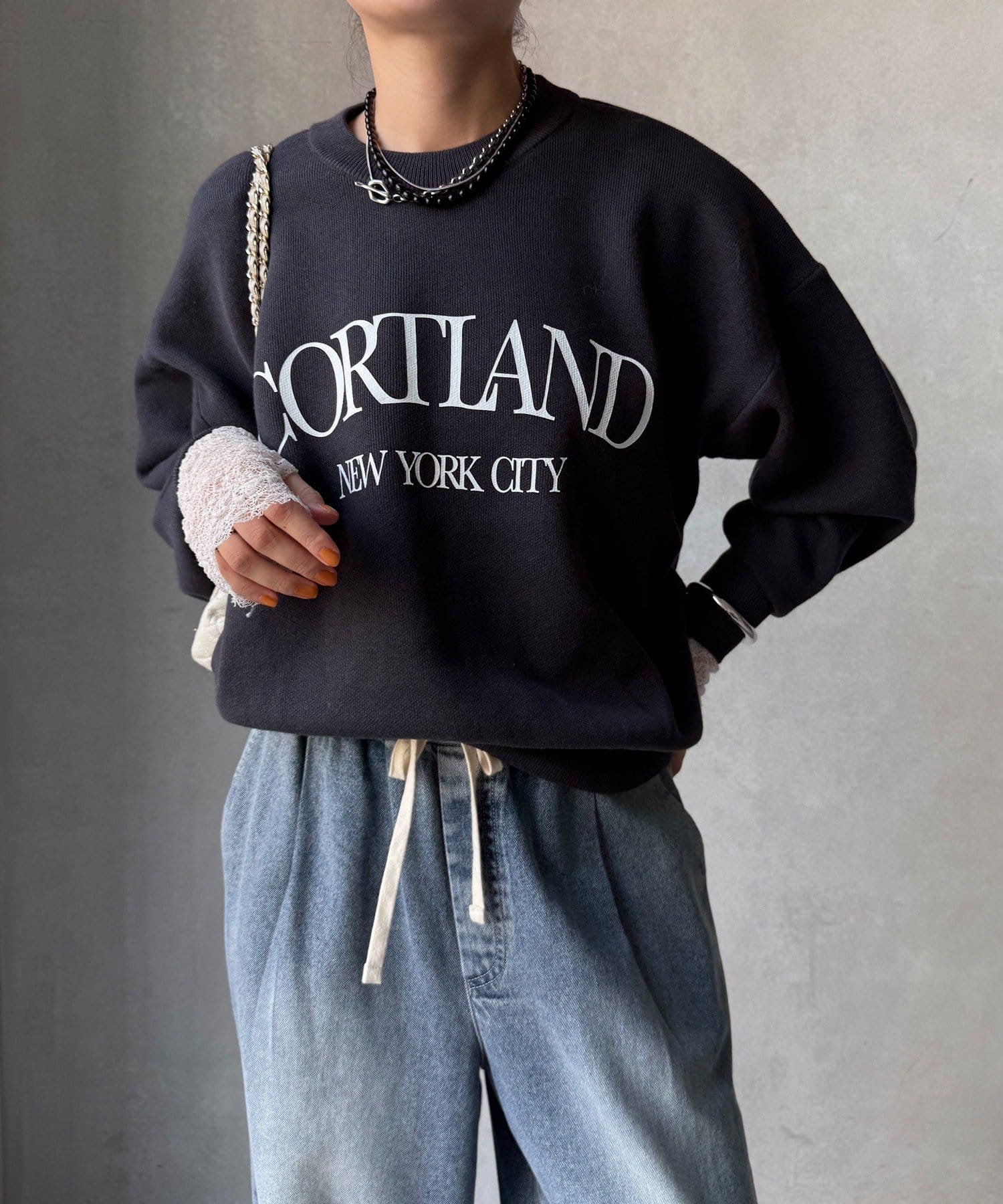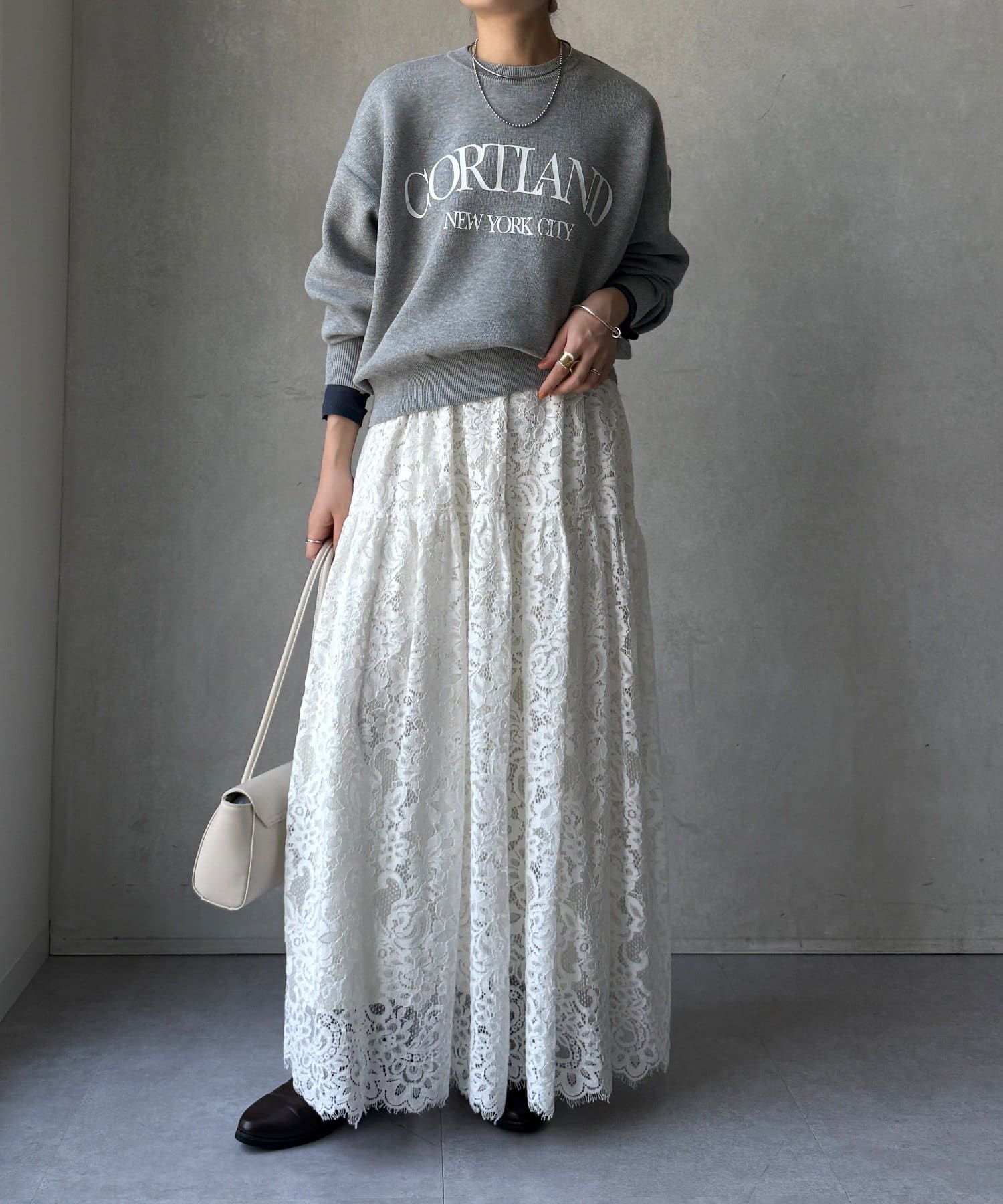 カジュアルなロゴデザインながら、キレイめに着れる素材感なので大人っぽい印象に。