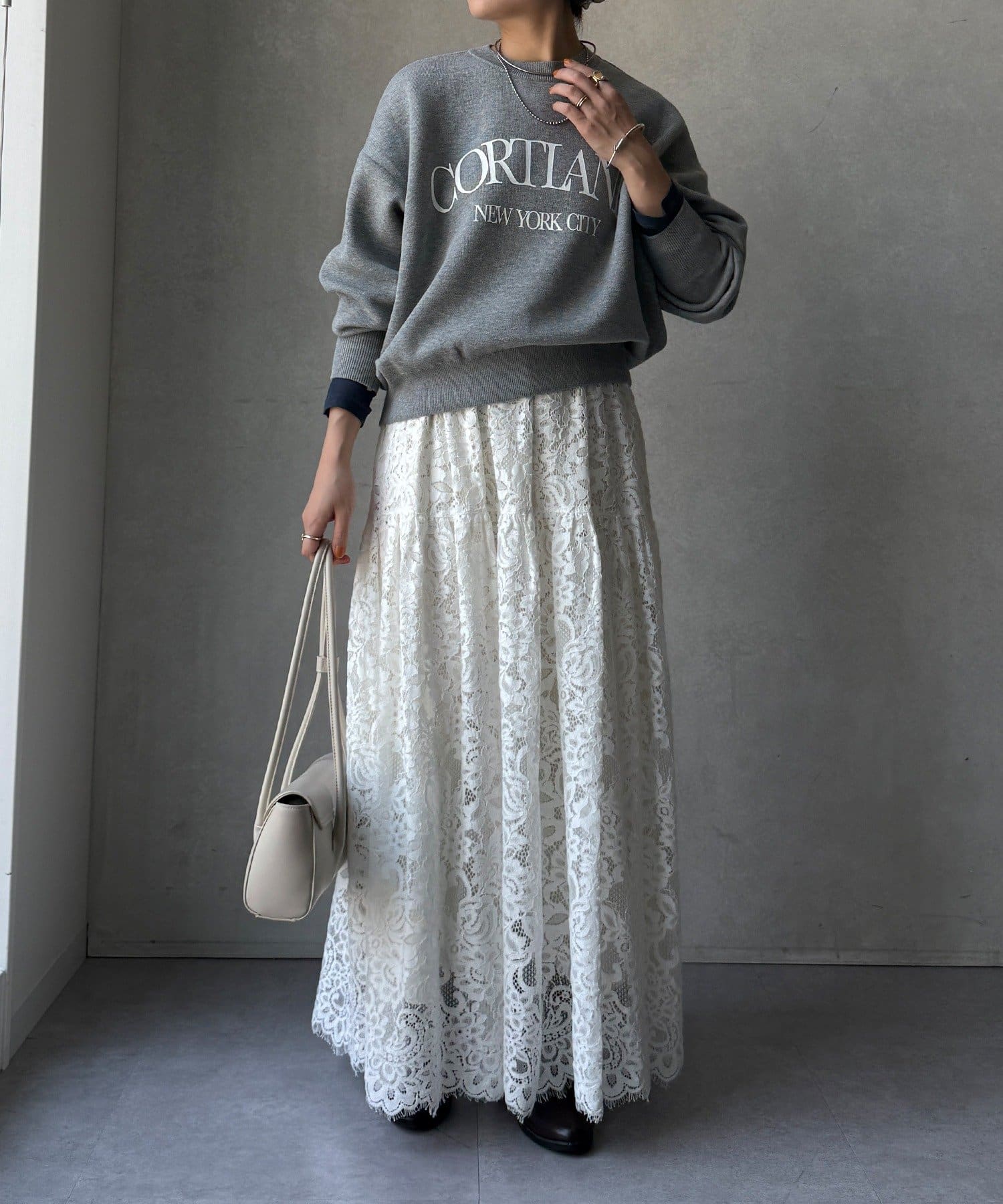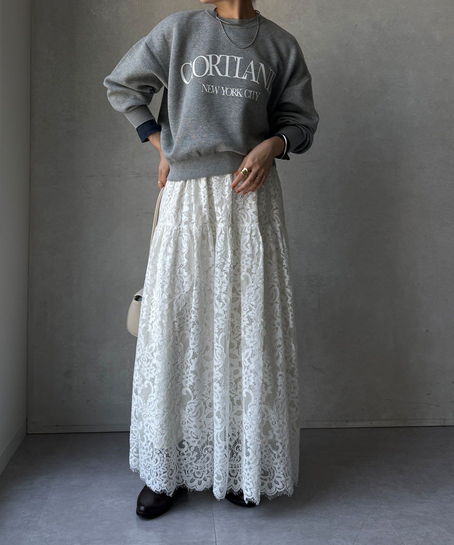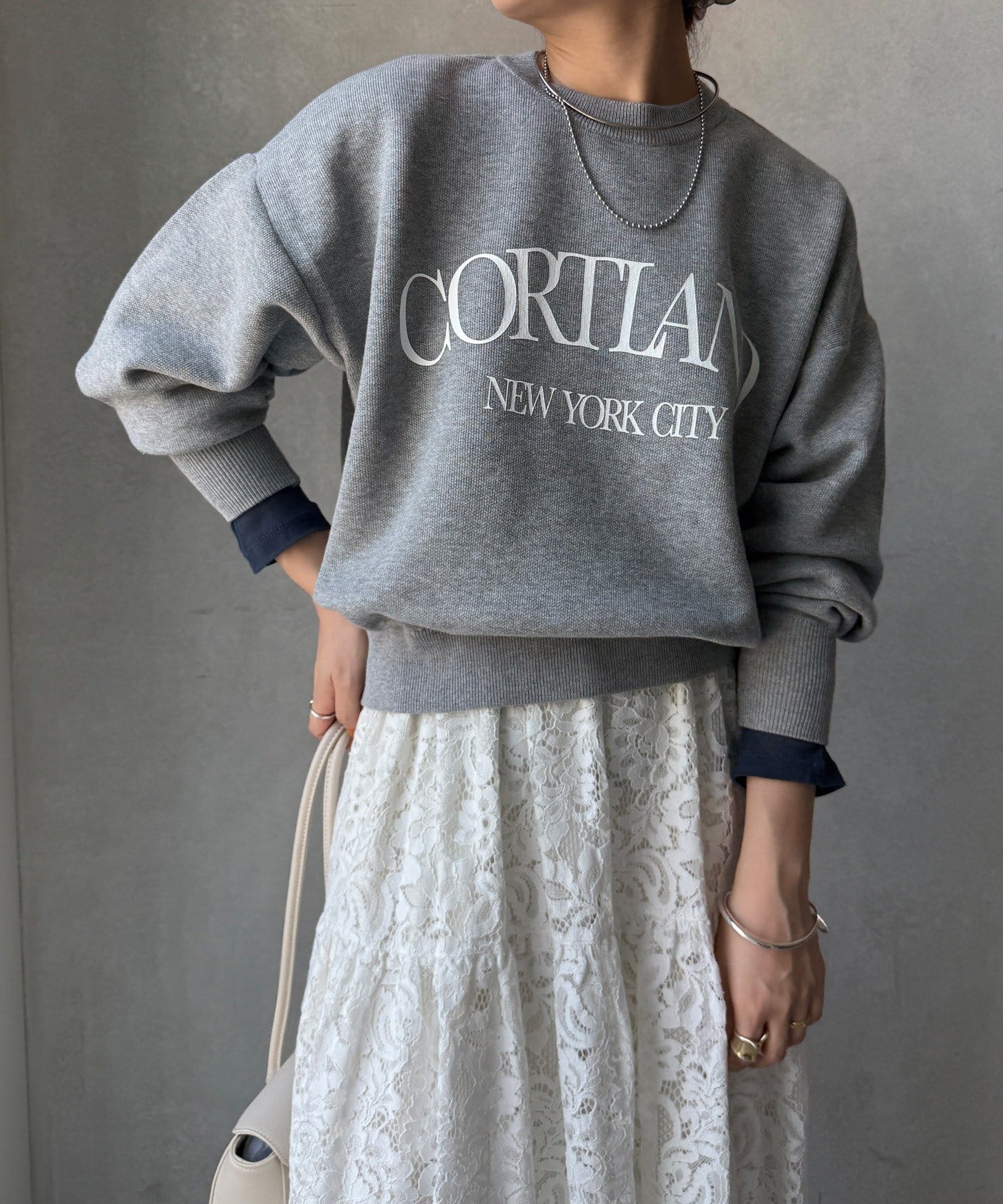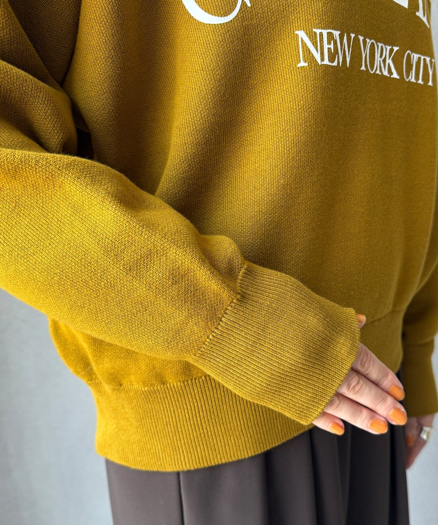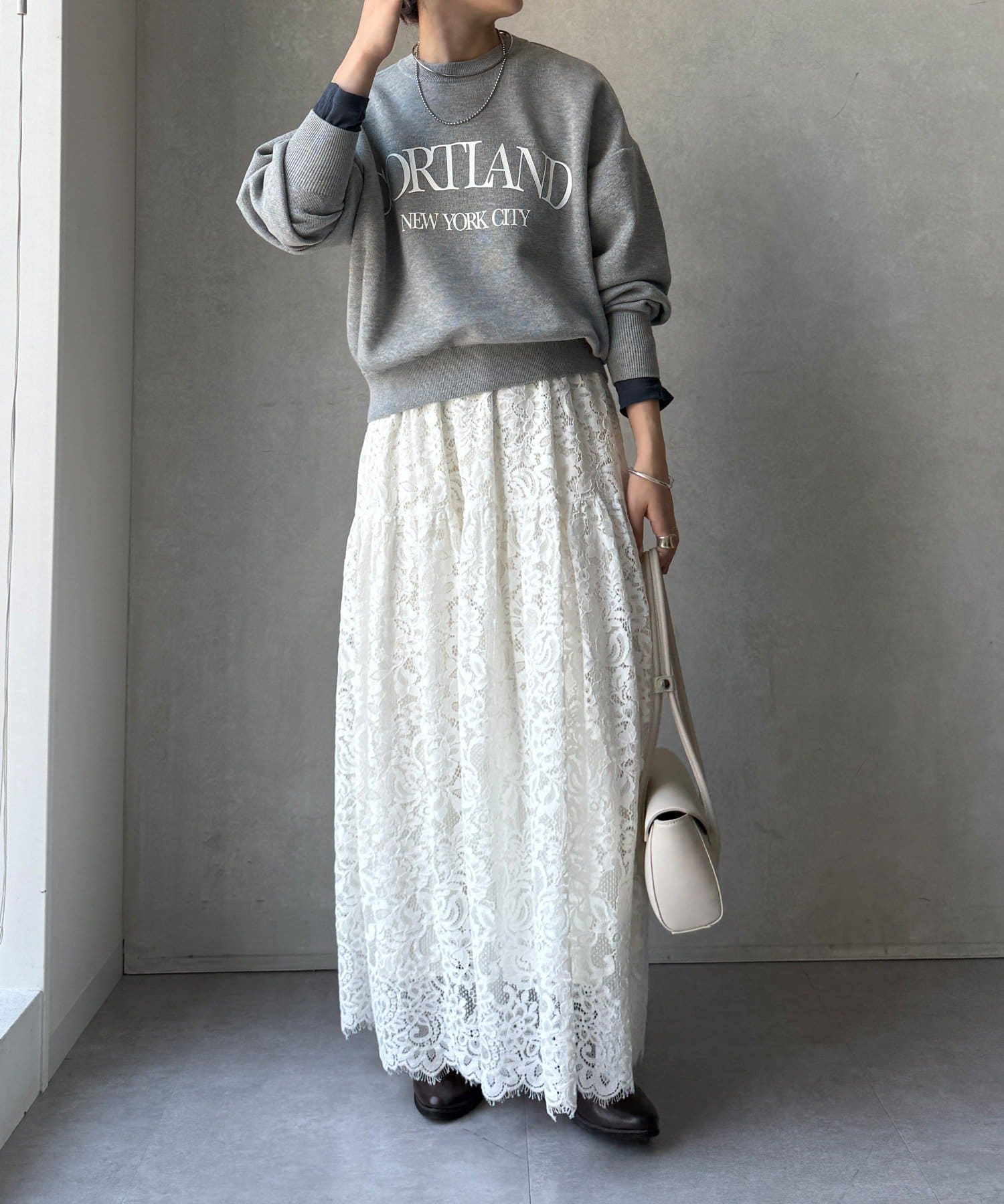 カジュアルなロゴデザインながら、キレイめに着れる素材感なので大人っぽい印象に。