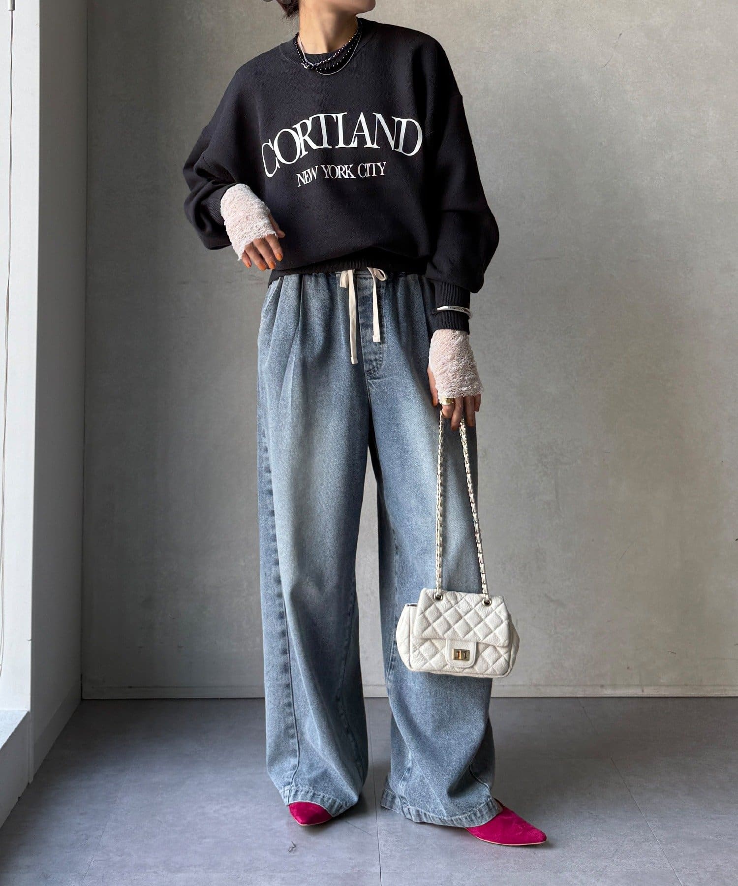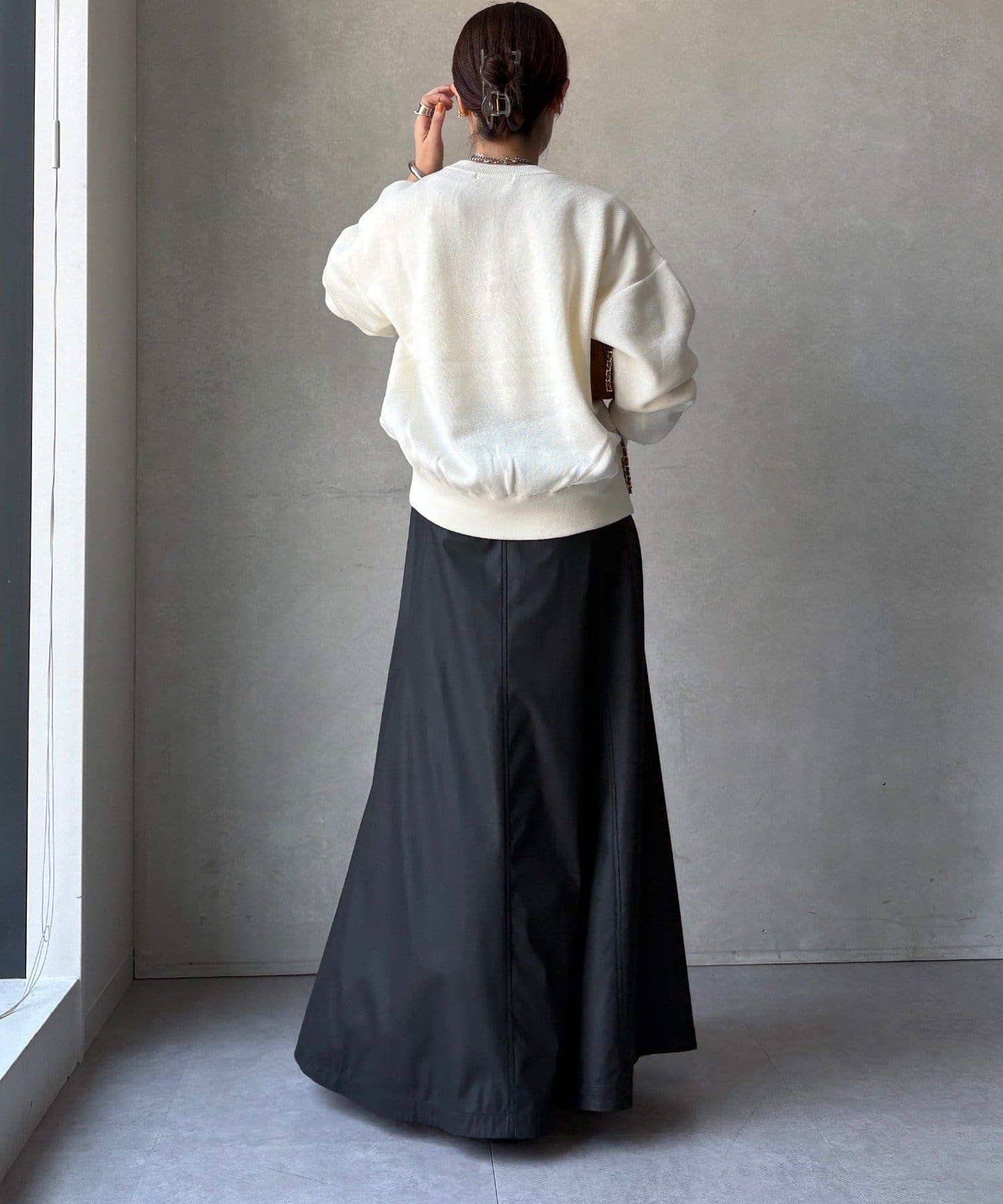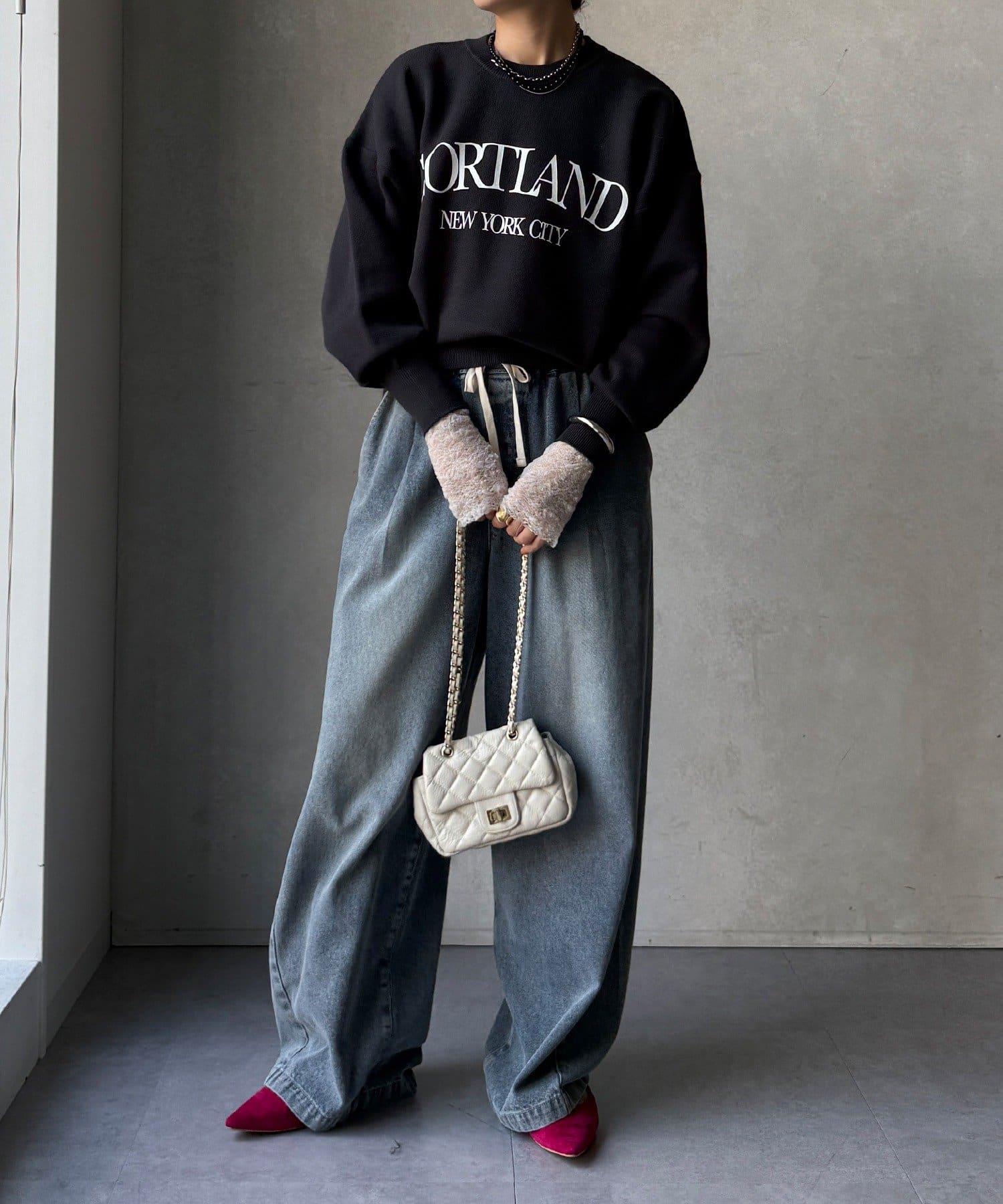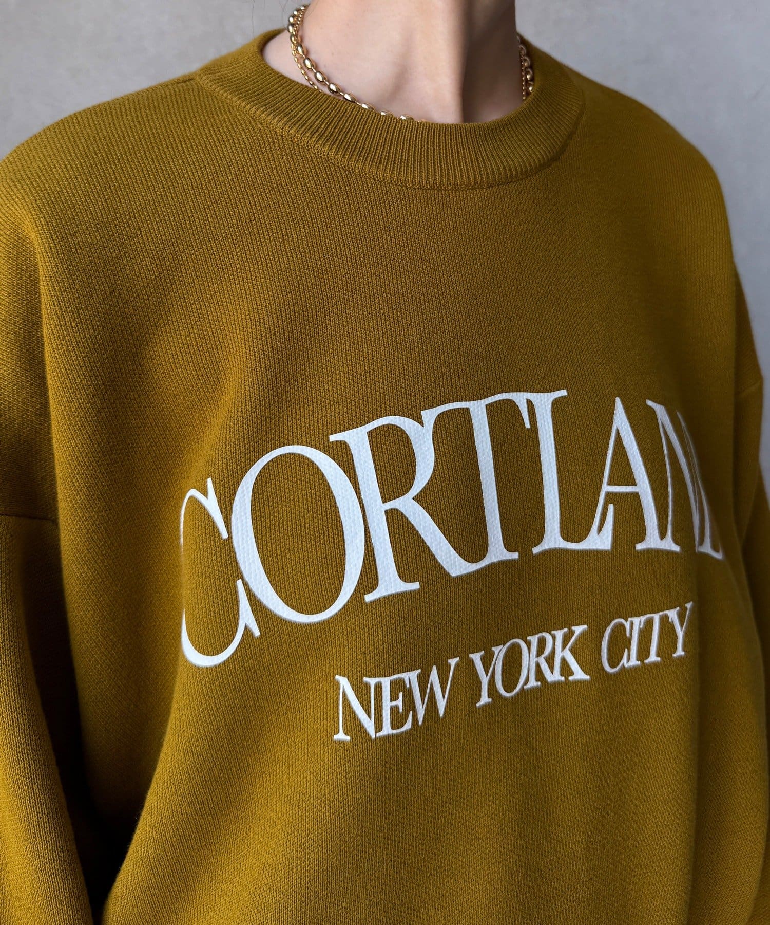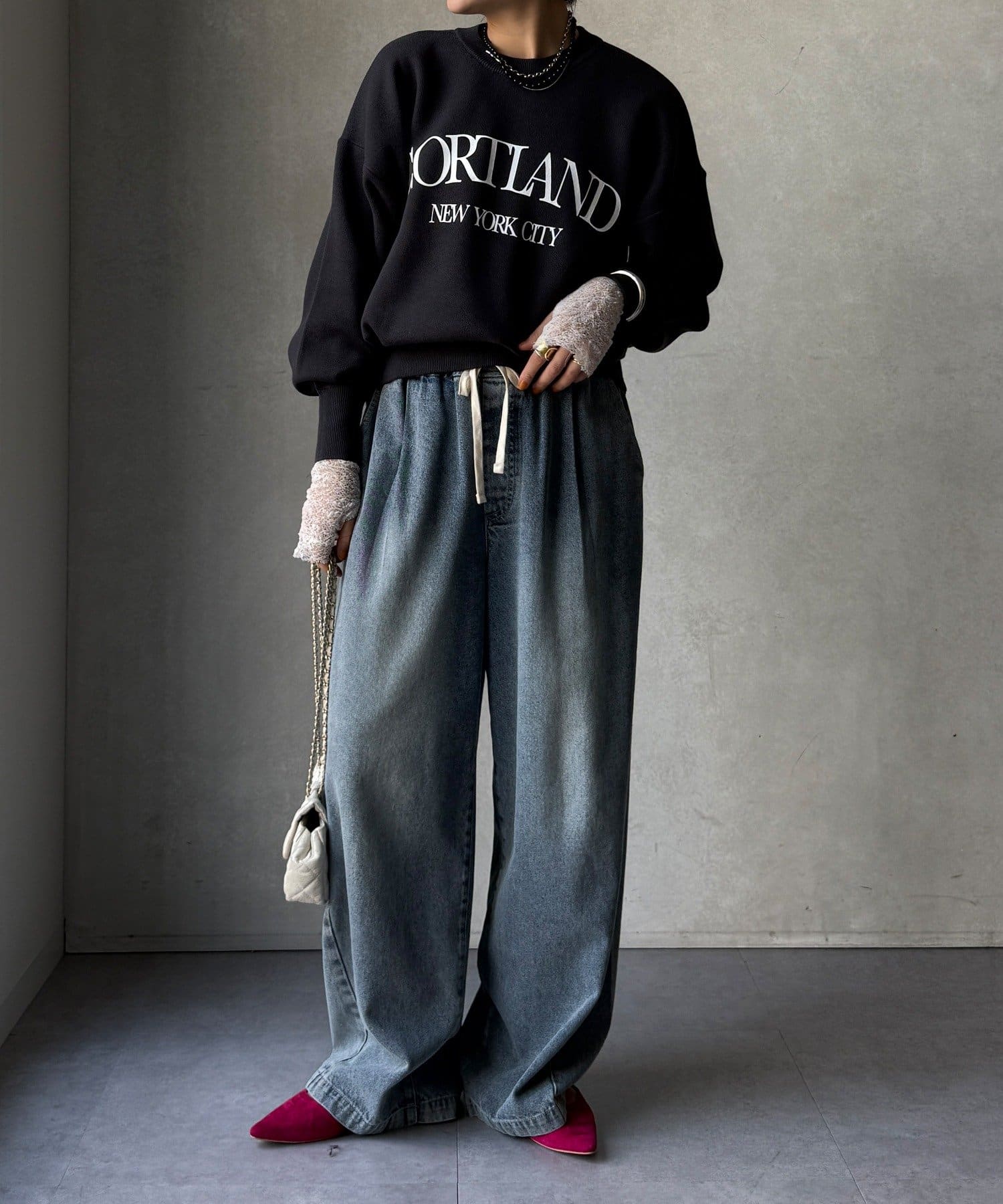 カジュアルなロゴデザインながら、キレイめに着れる素材感なので大人っぽい印象に。