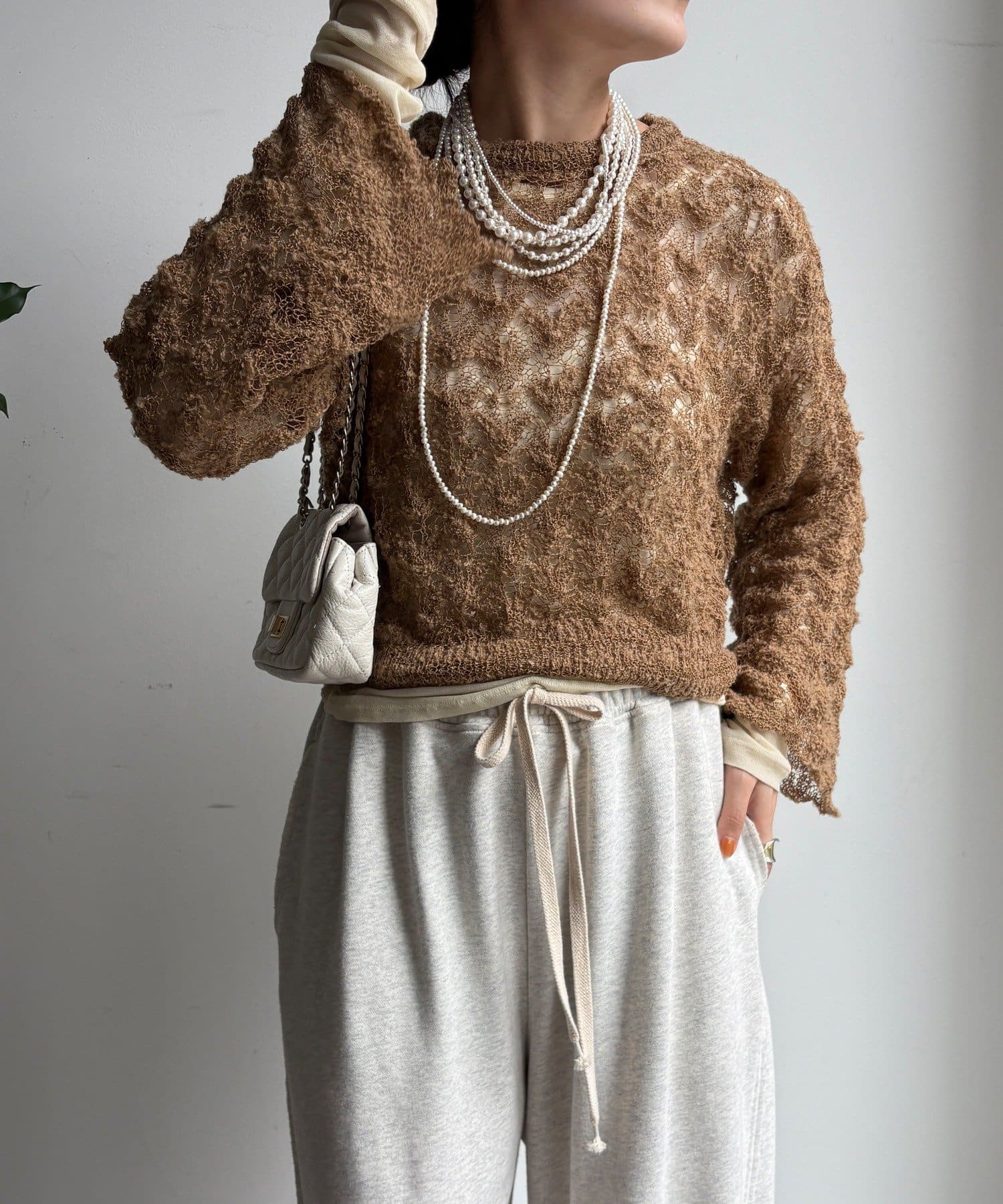 繊細な透かし編みが、ヘルシーな肌見せスタイルに。