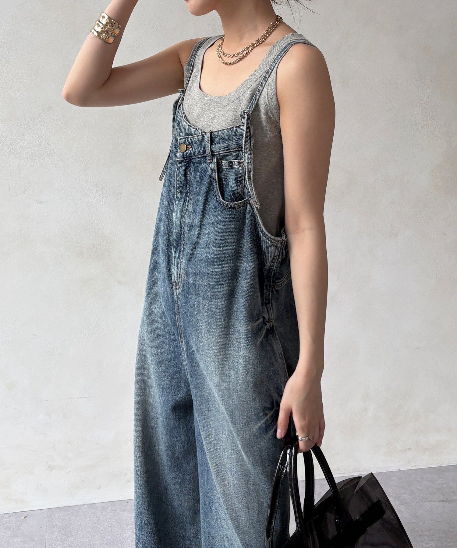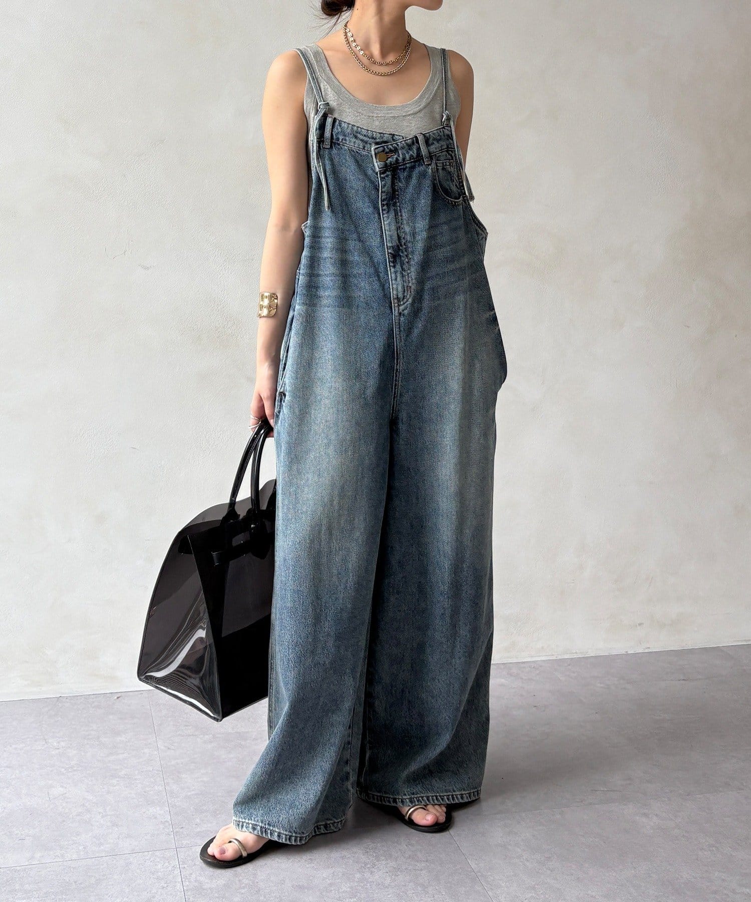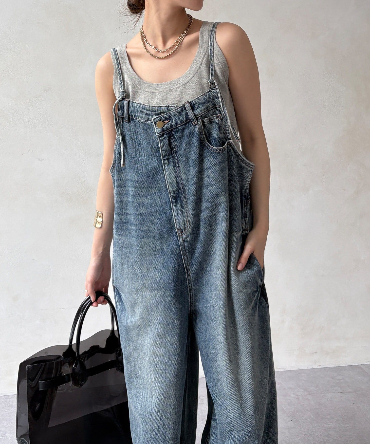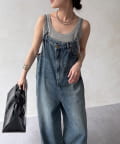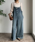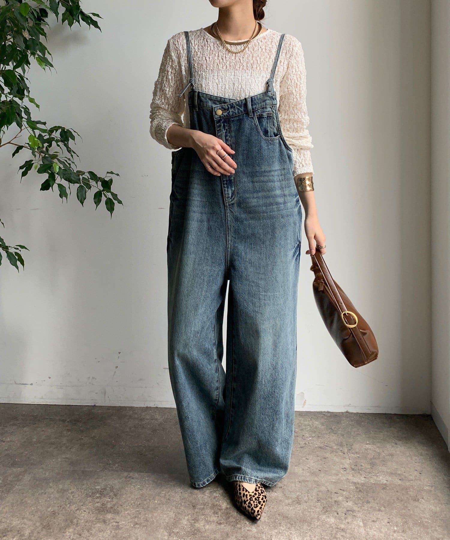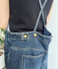 カジュアルでありながら、洗練された印象を与えるデニムオーバーオール。