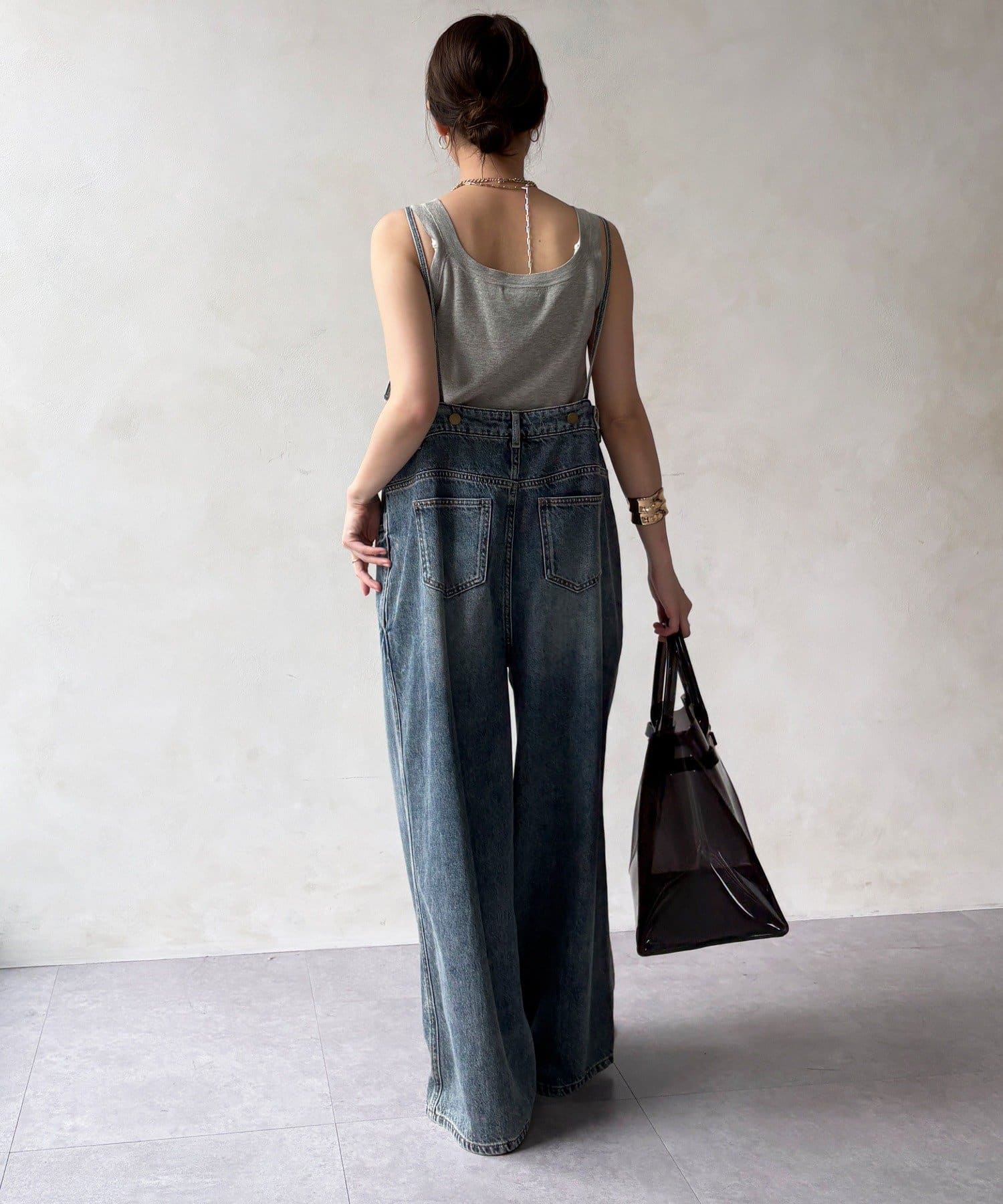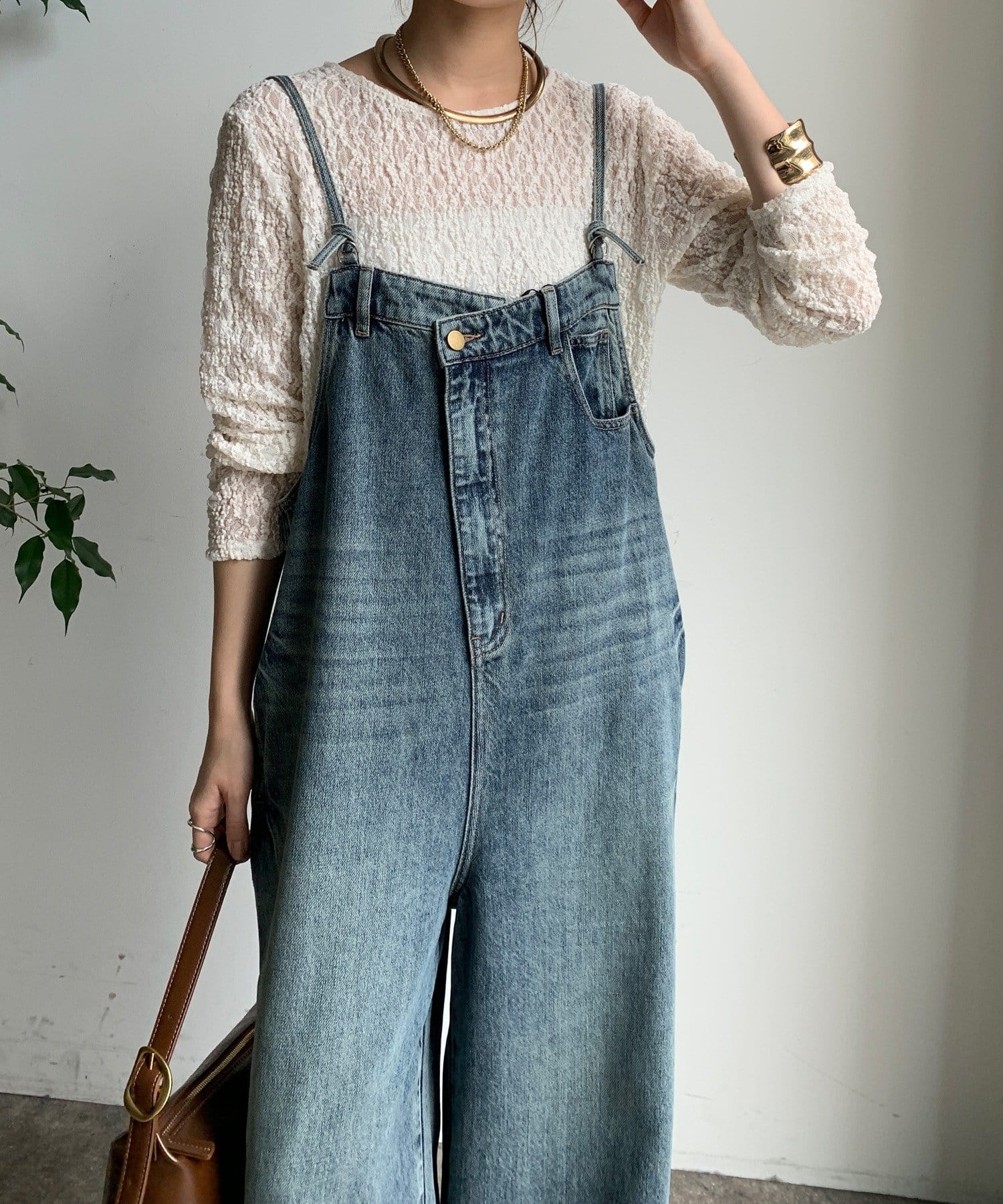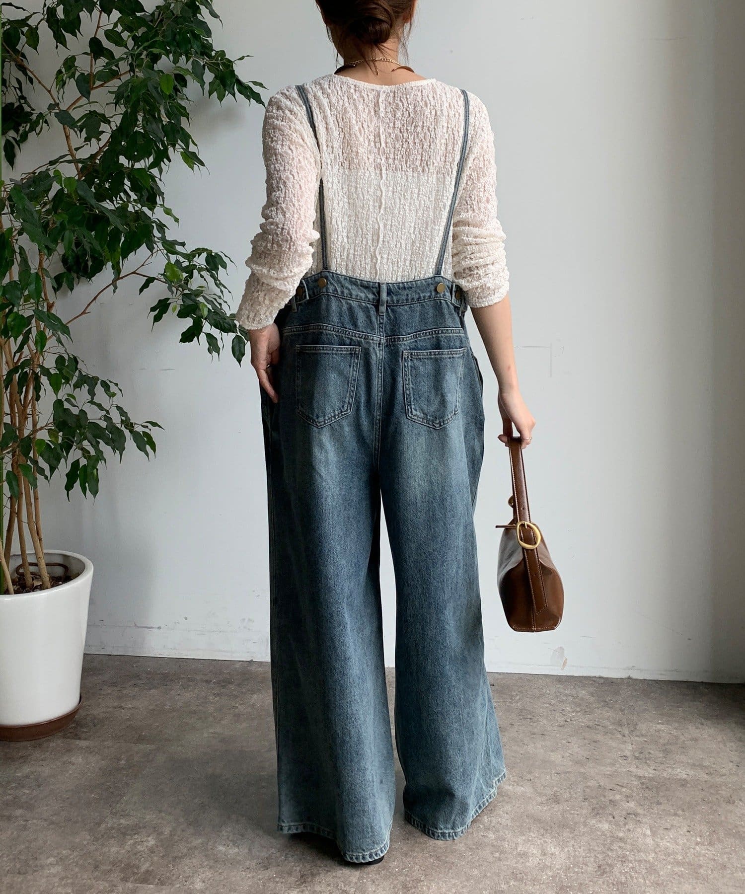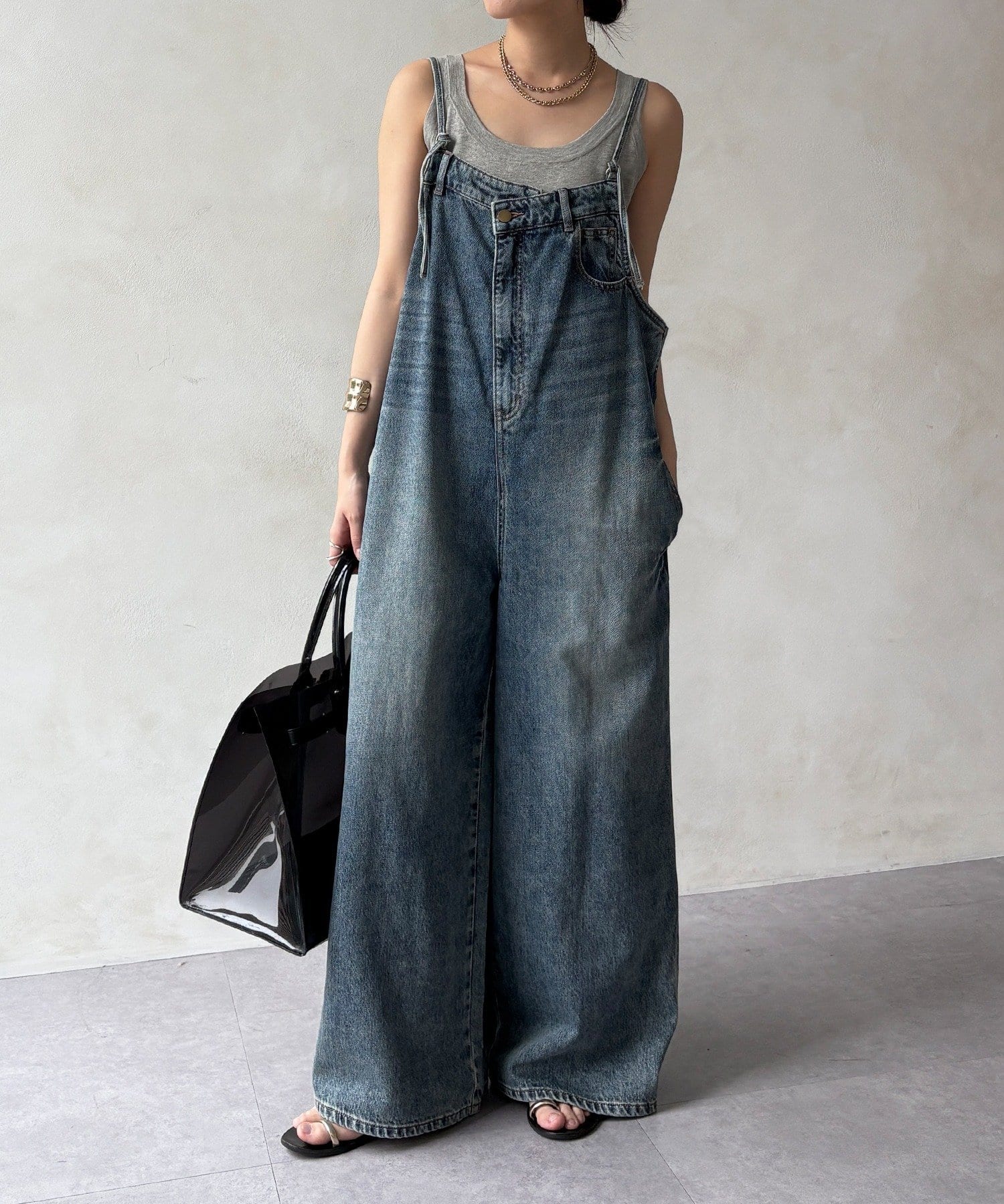 カジュアルでありながら、洗練された印象を与えるデニムオーバーオール。