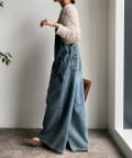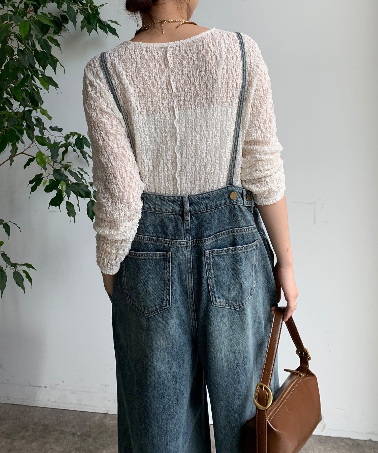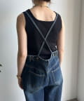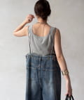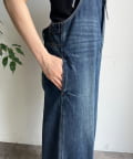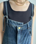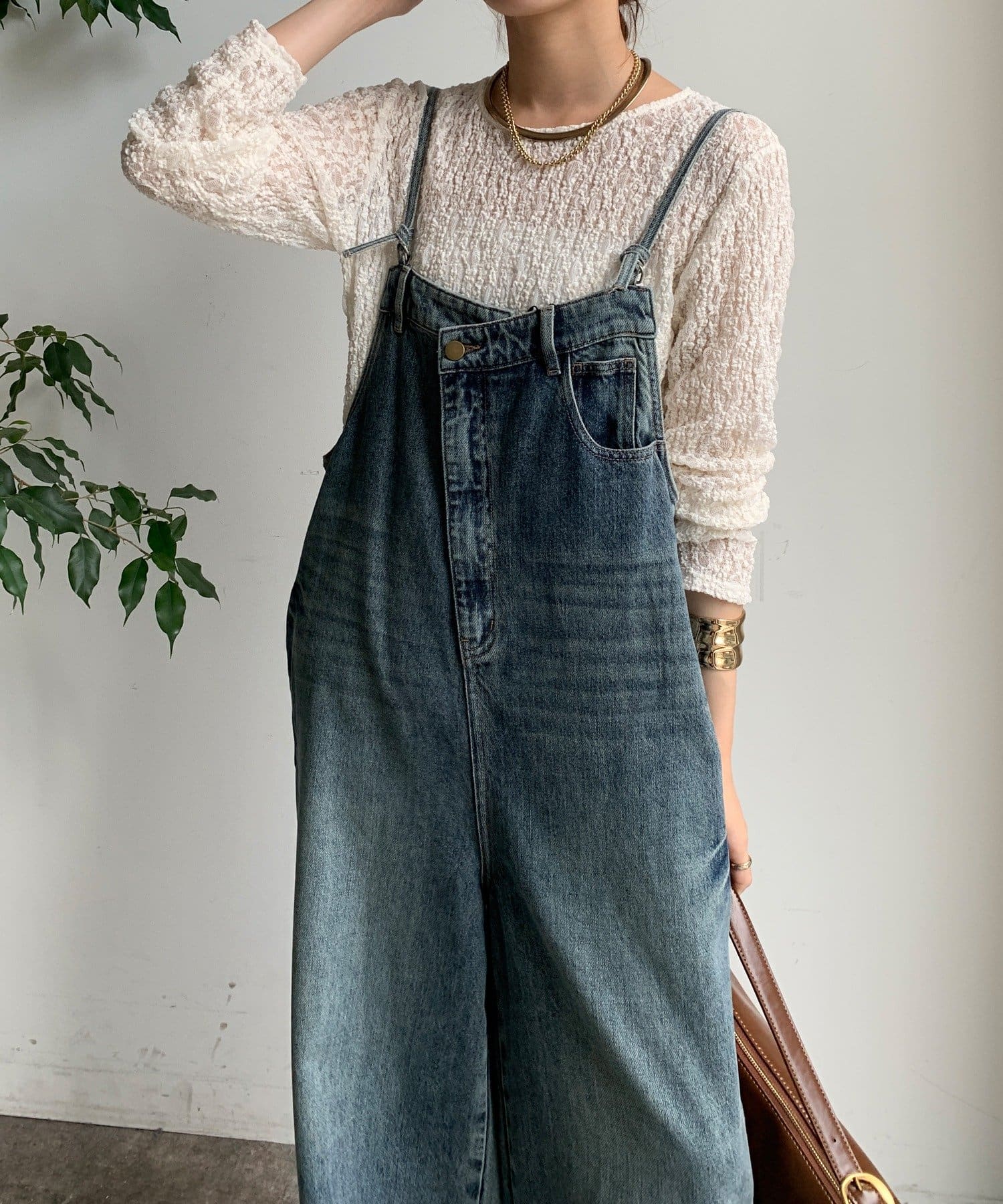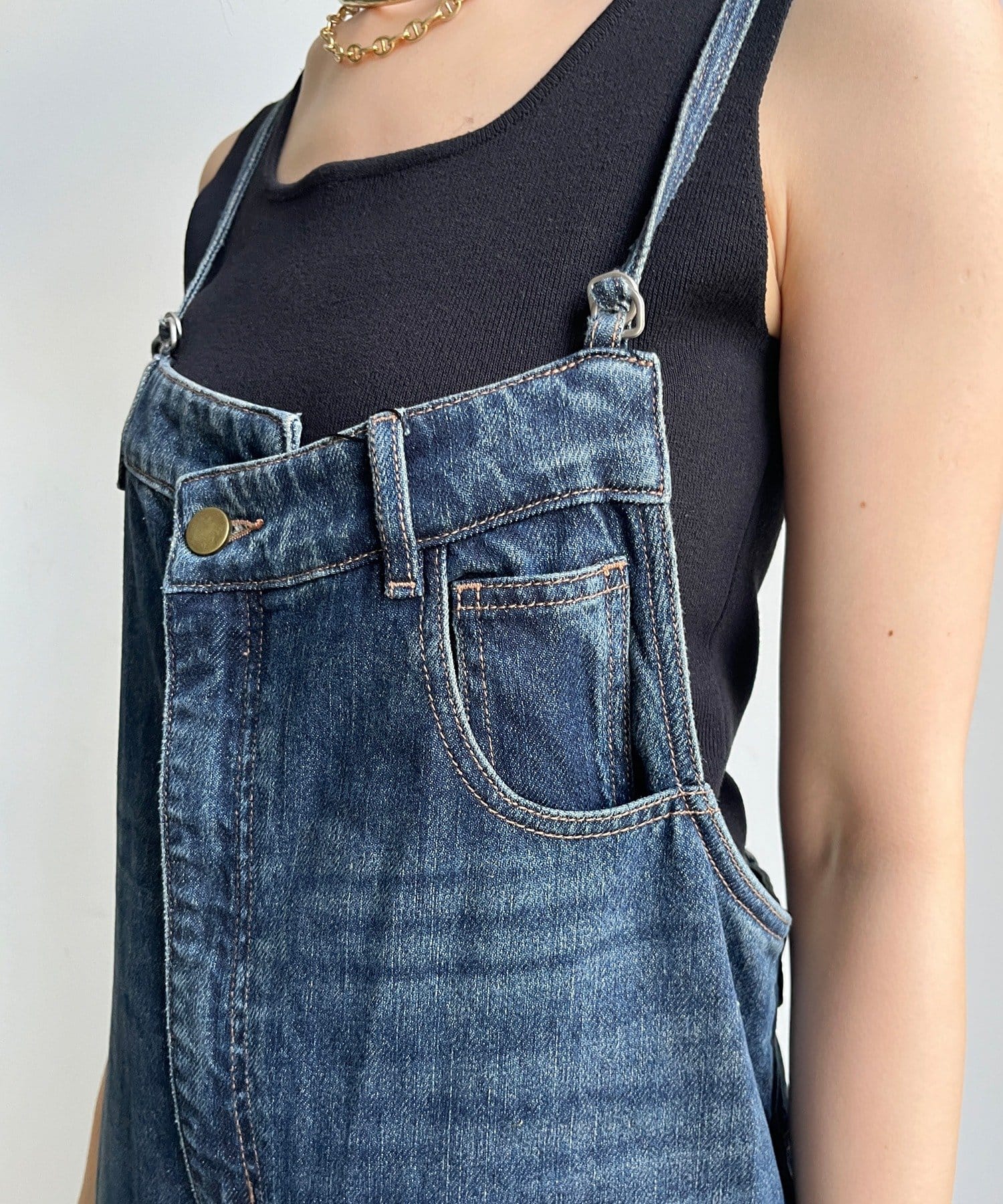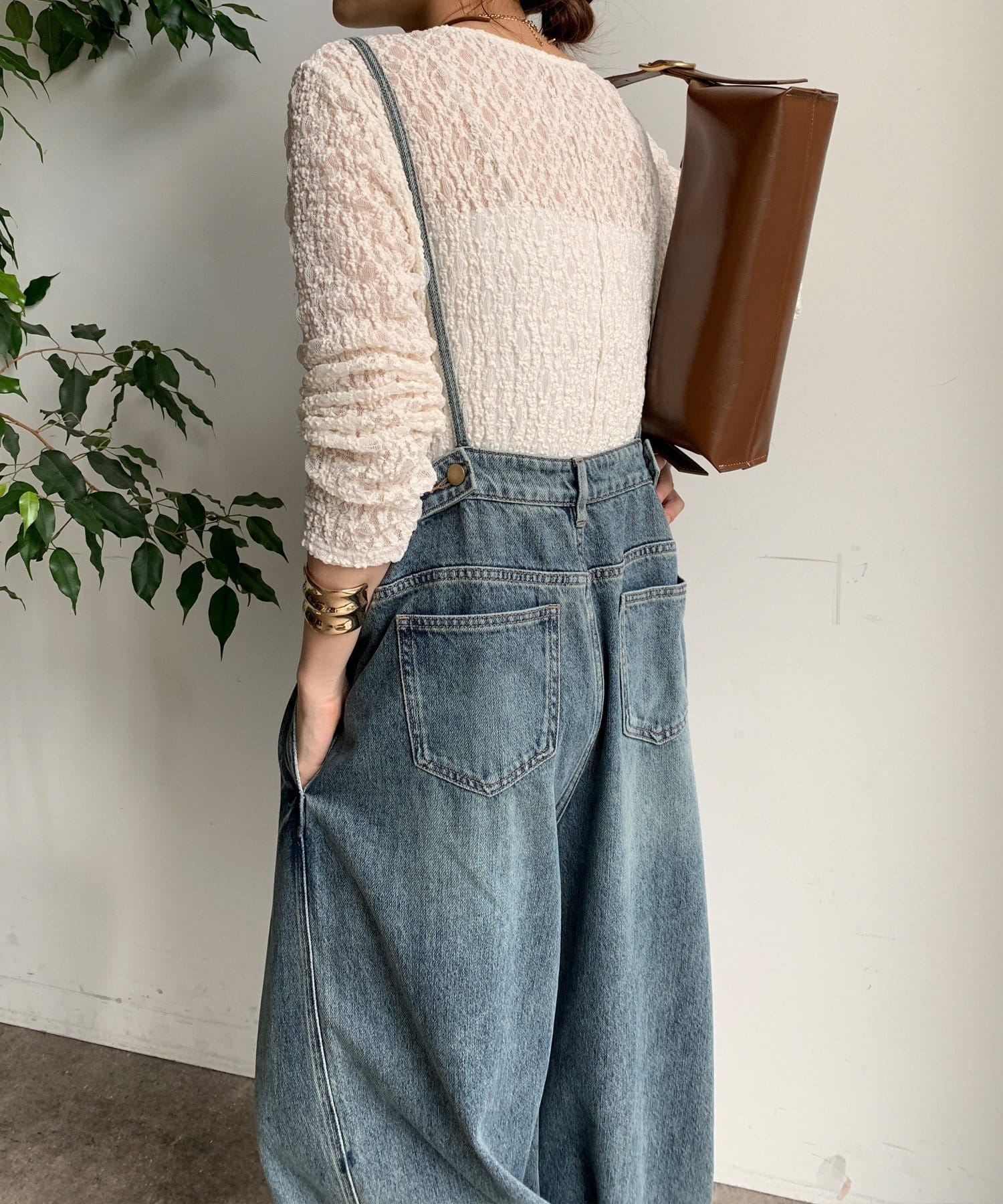 カジュアルでありながら、洗練された印象を与えるデニムオーバーオール。