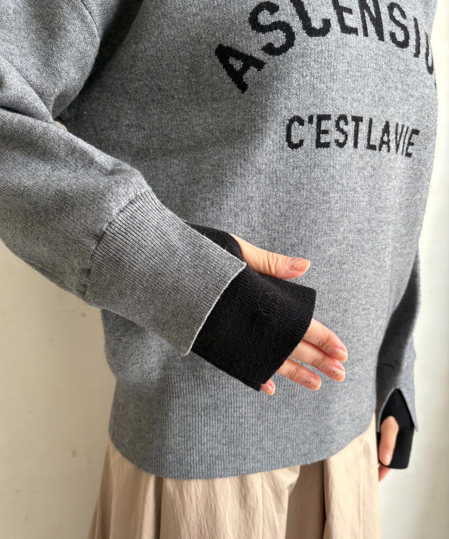 袖部分にはレイヤードデザインで別色の布を重ねており、フィンガーホールを施すことで