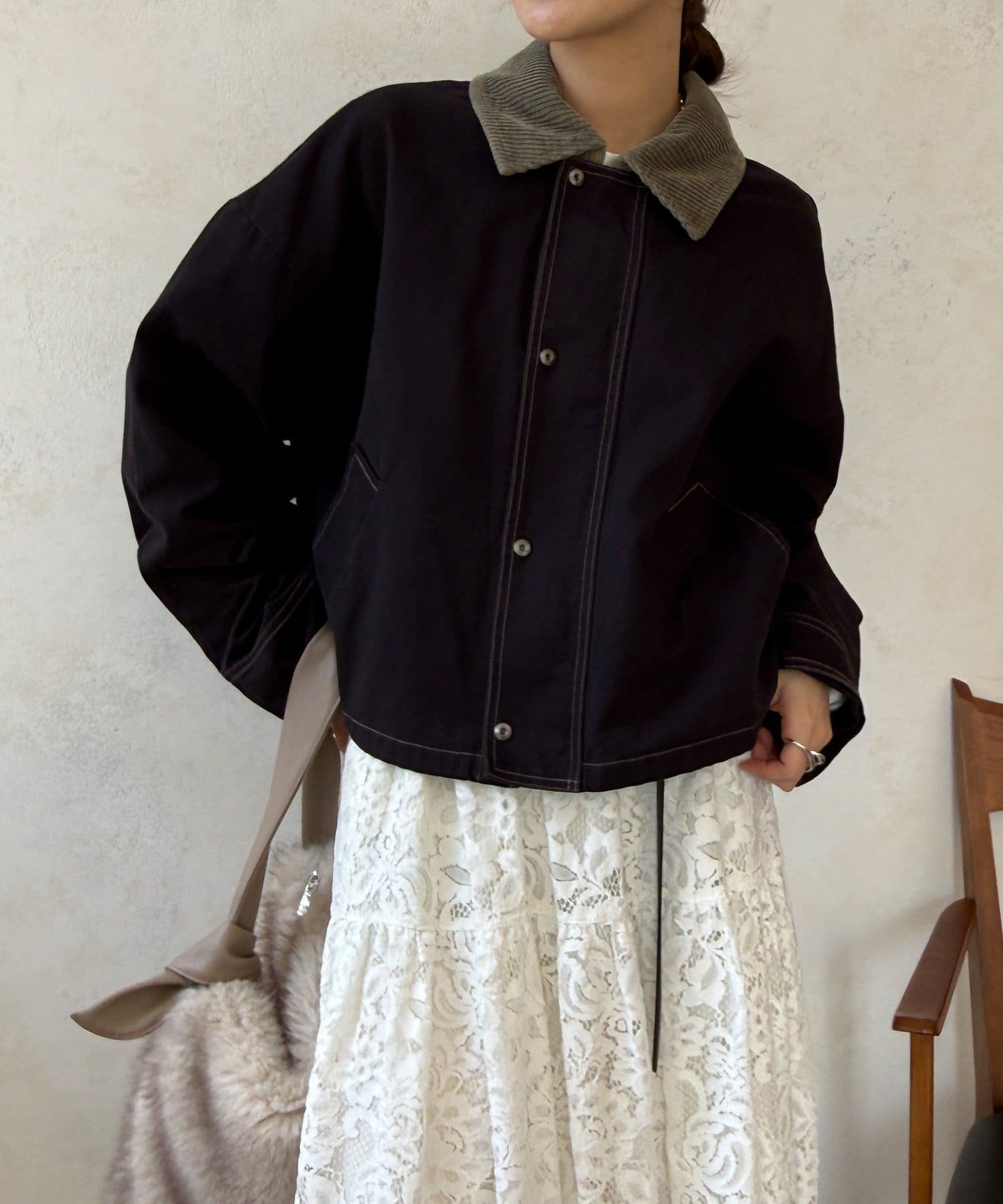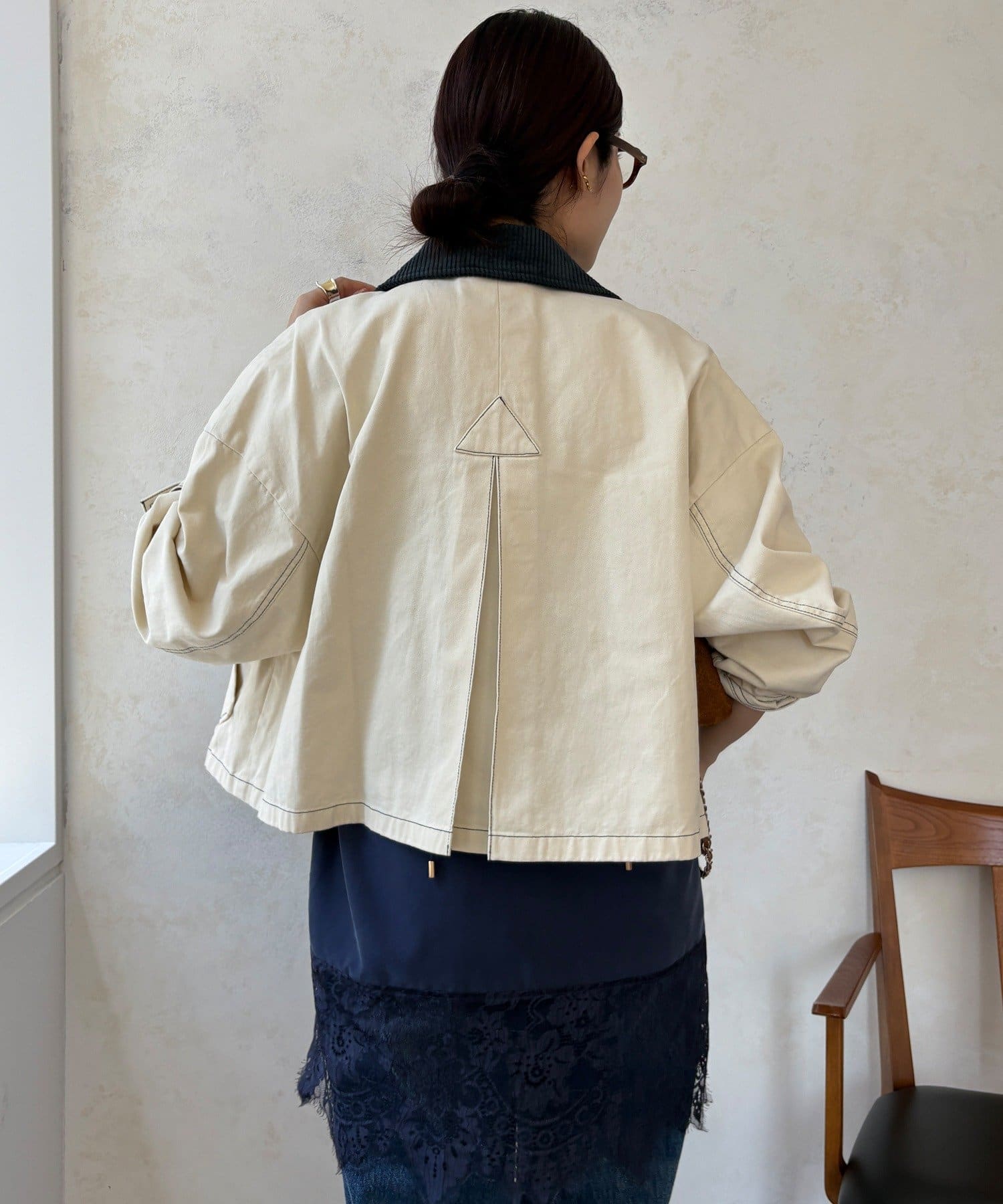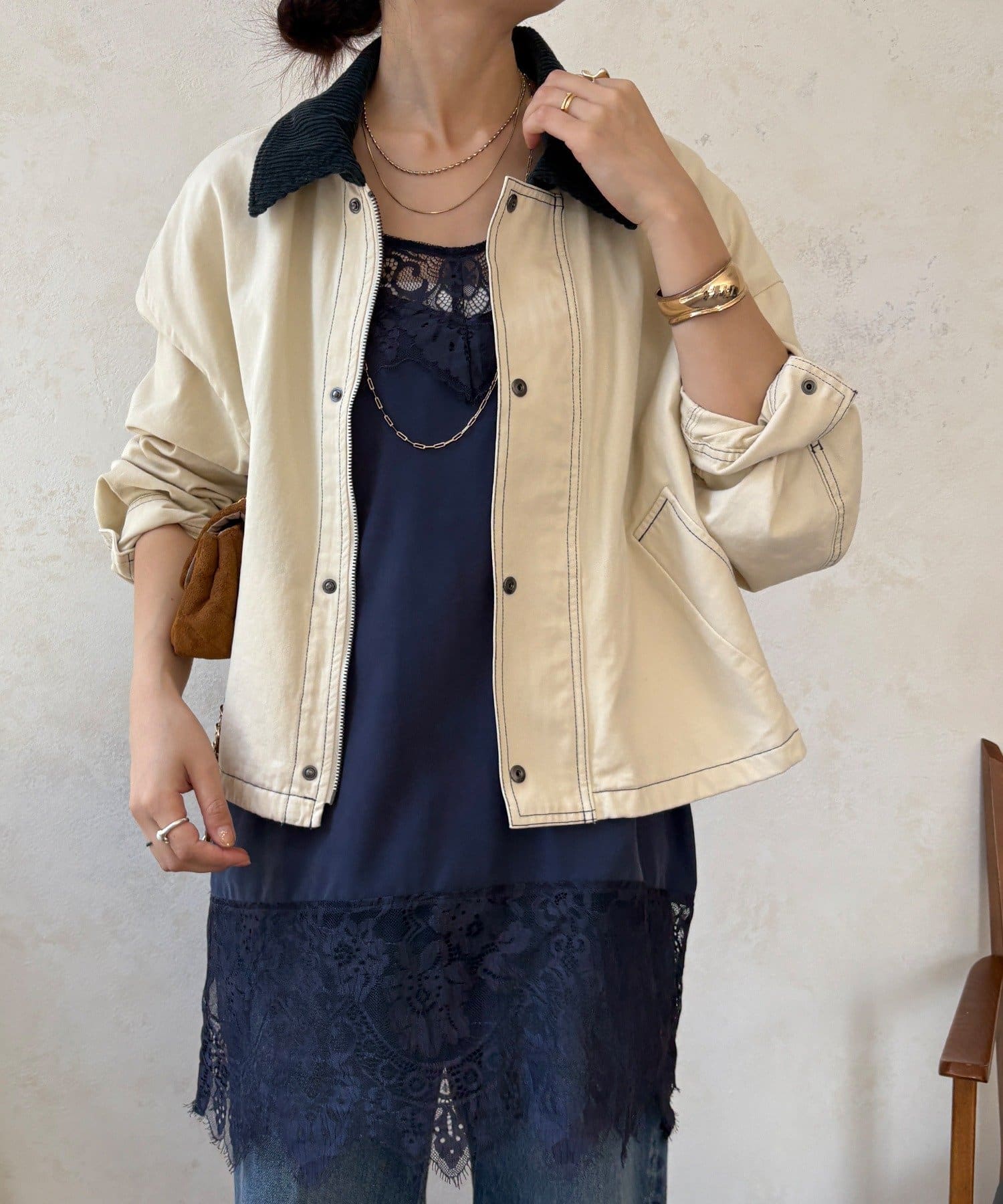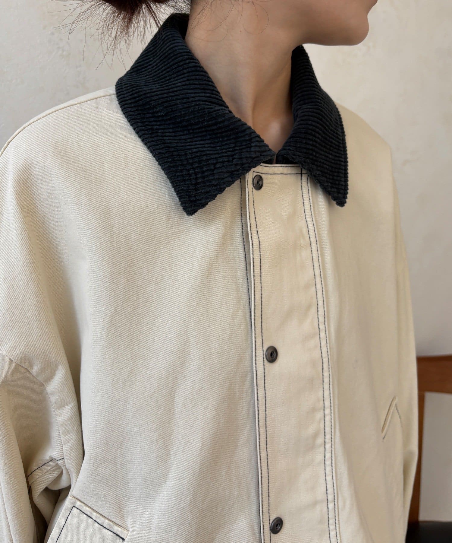 ステッチがアクセント!コーデュロイ襟で仕上げた大人のジャケット