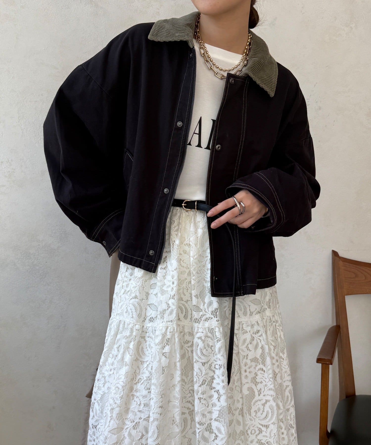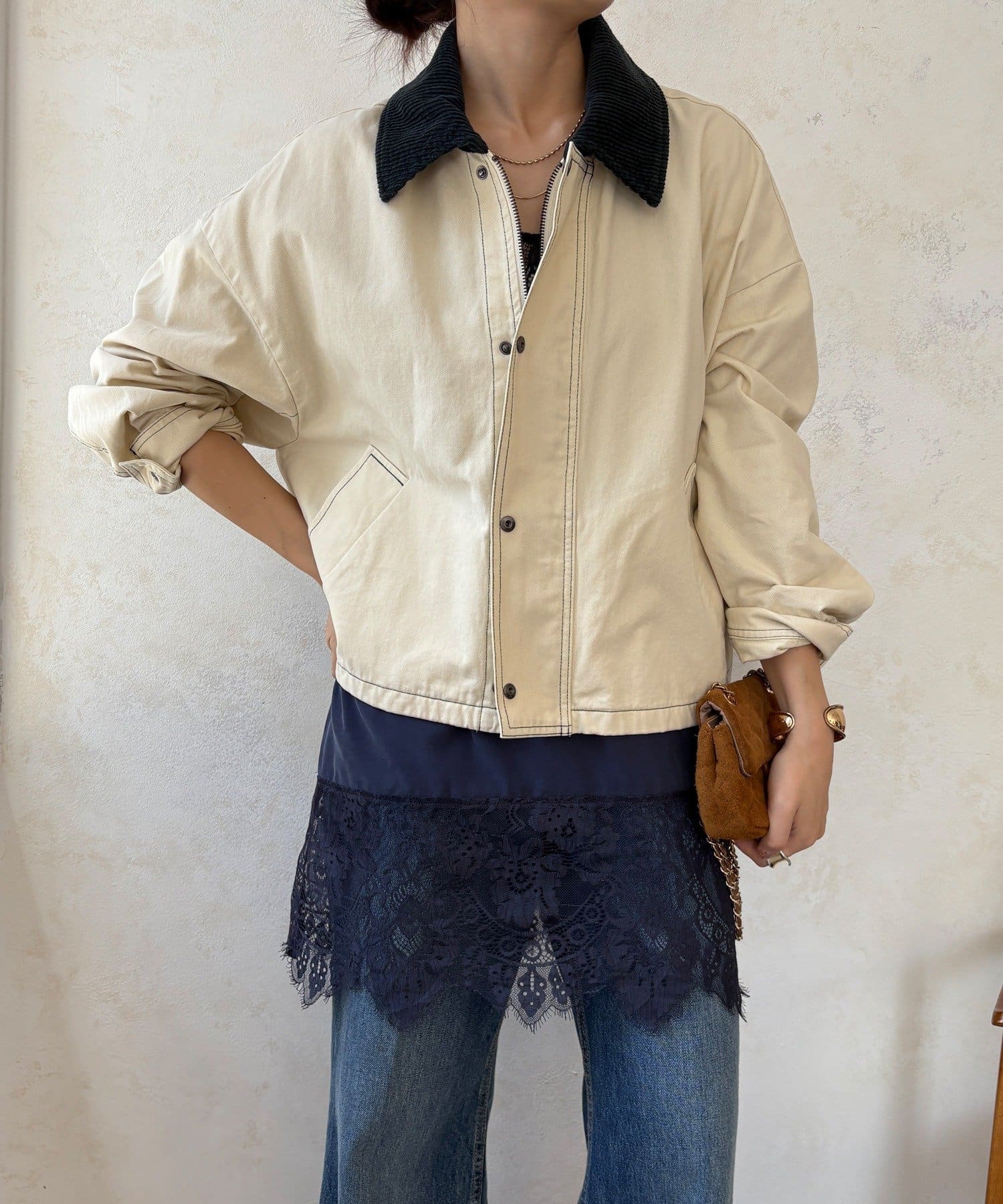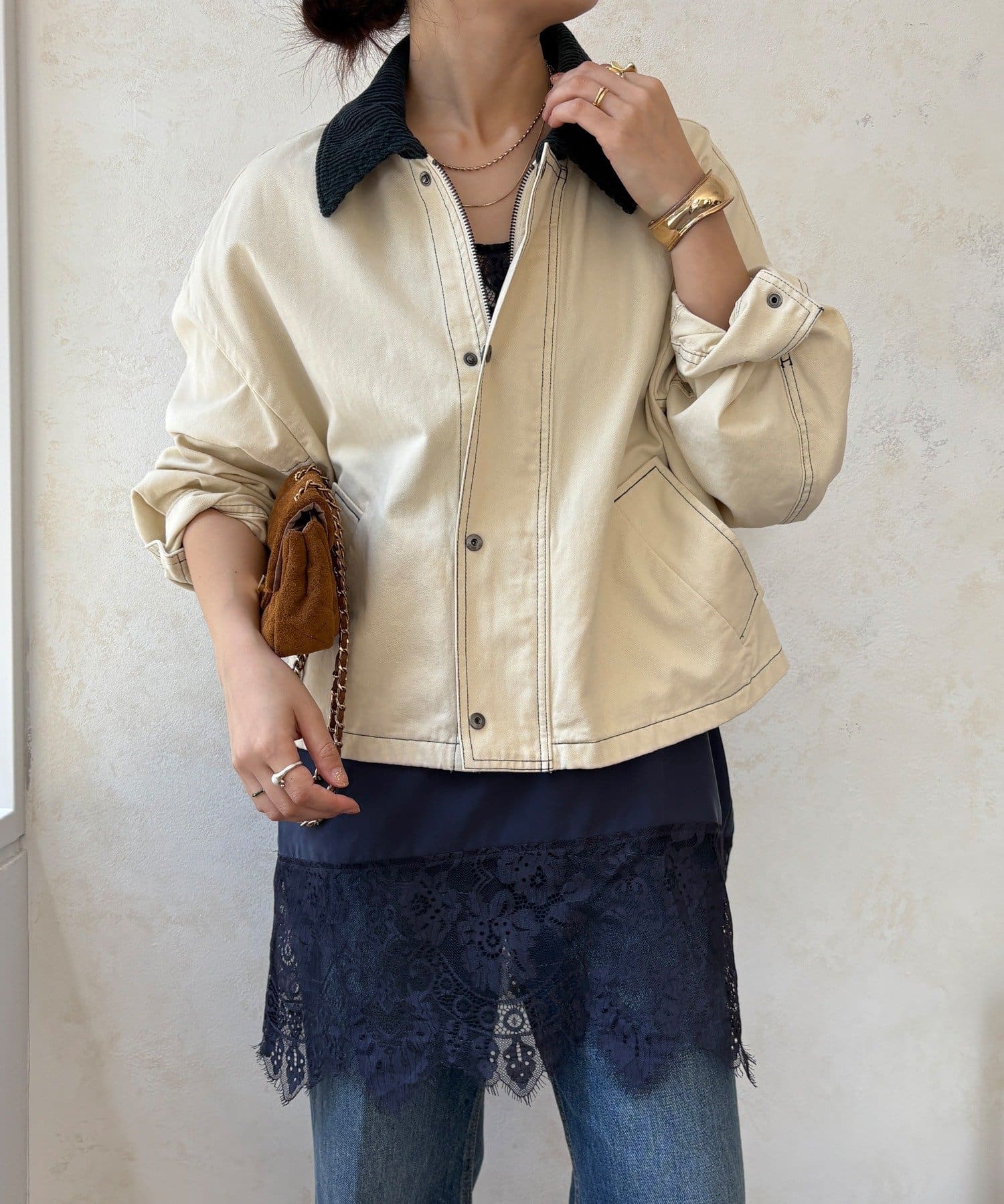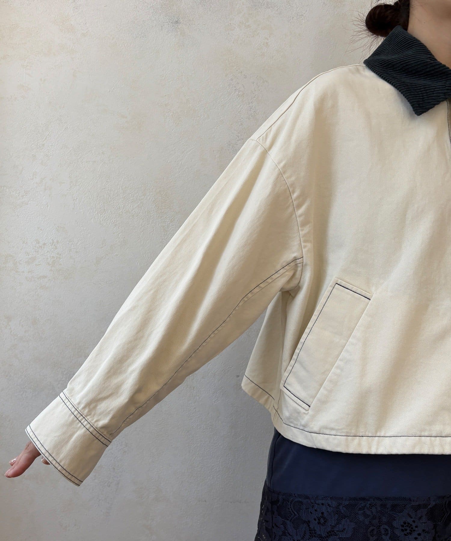 ステッチがアクセント!コーデュロイ襟で仕上げた大人のジャケット