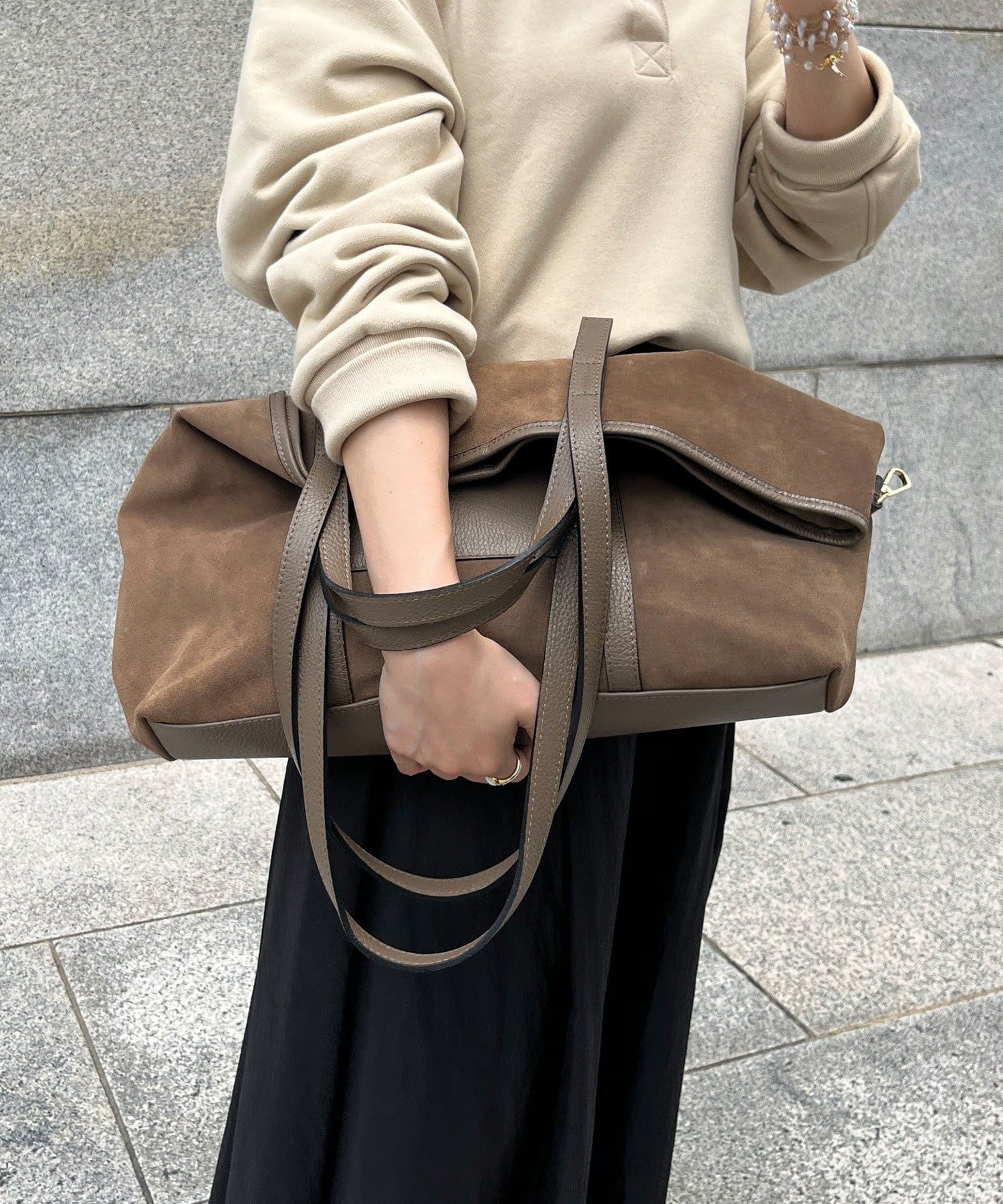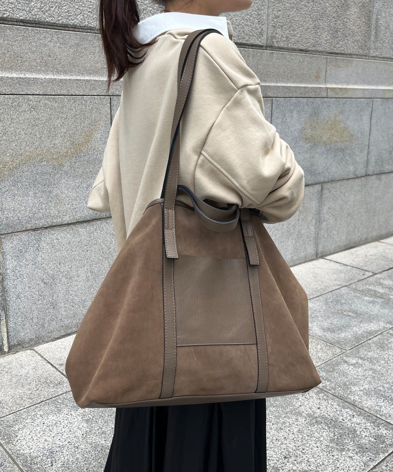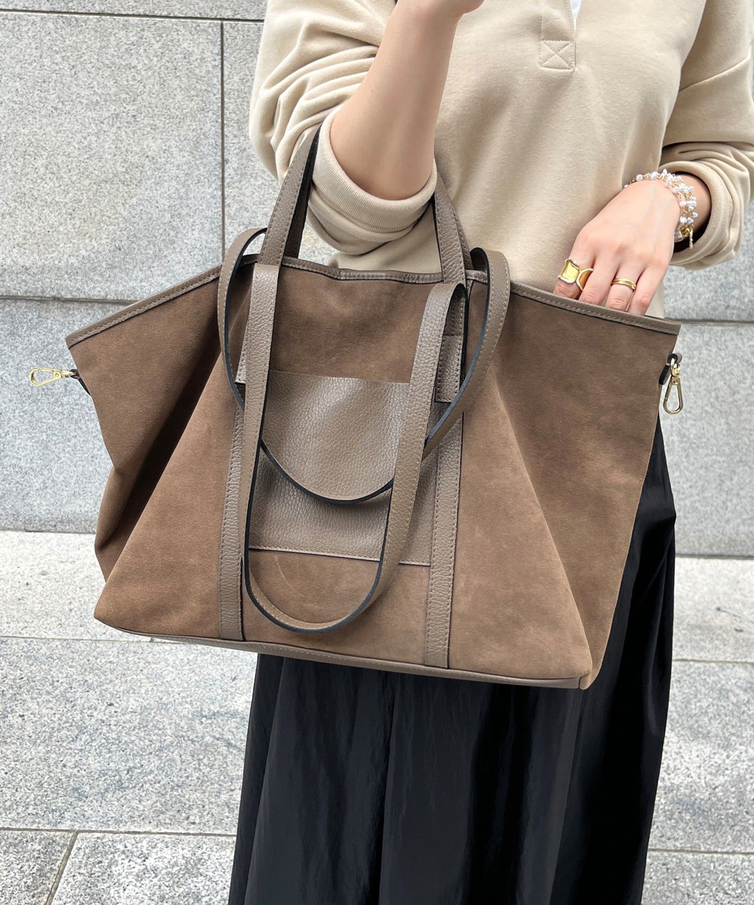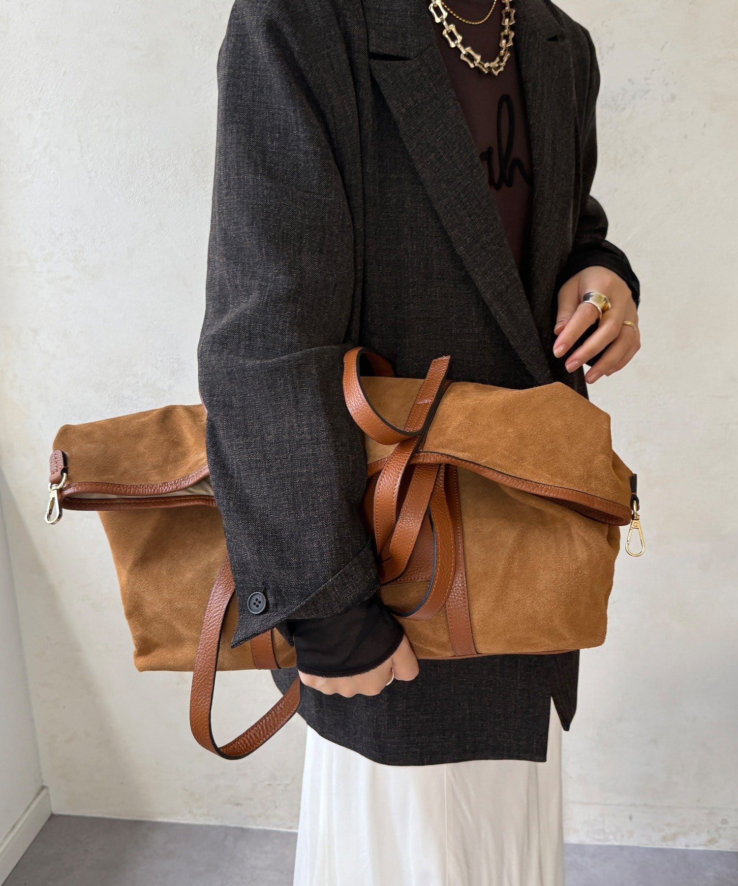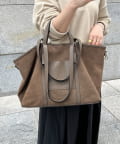 今年っぽいトレンドのスエード調生地に、レザー調の持ち手を合わせて高級感をプラス。