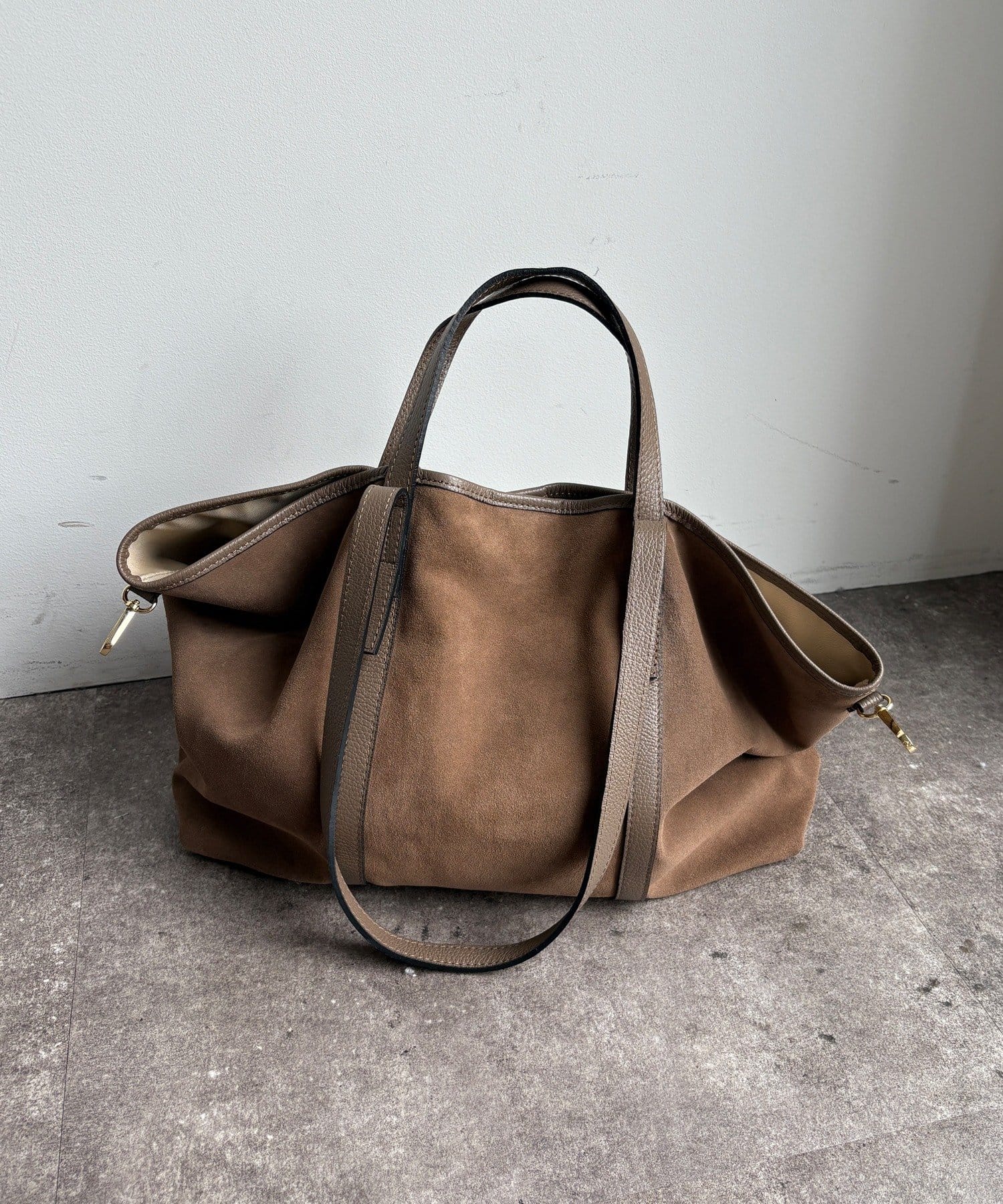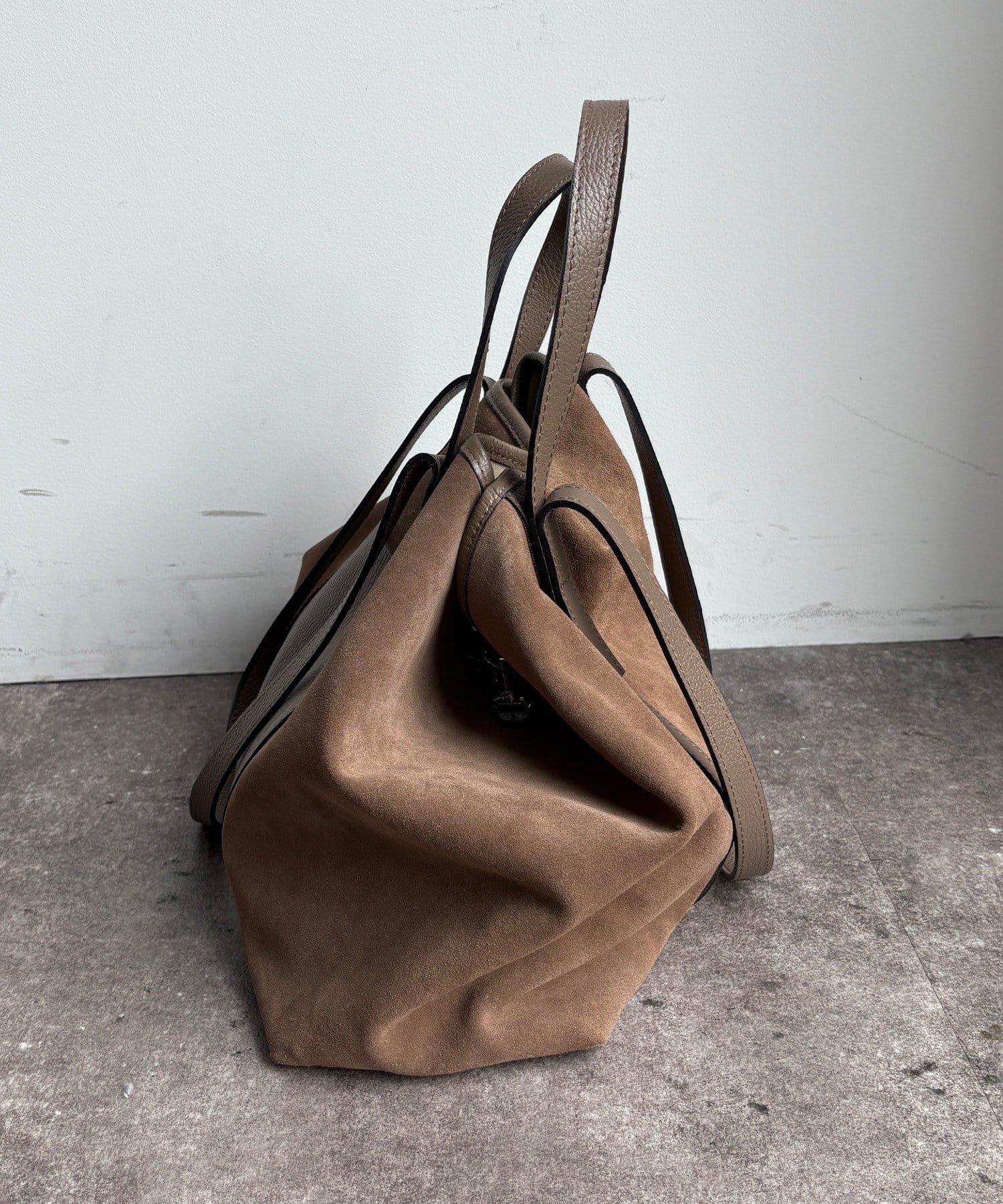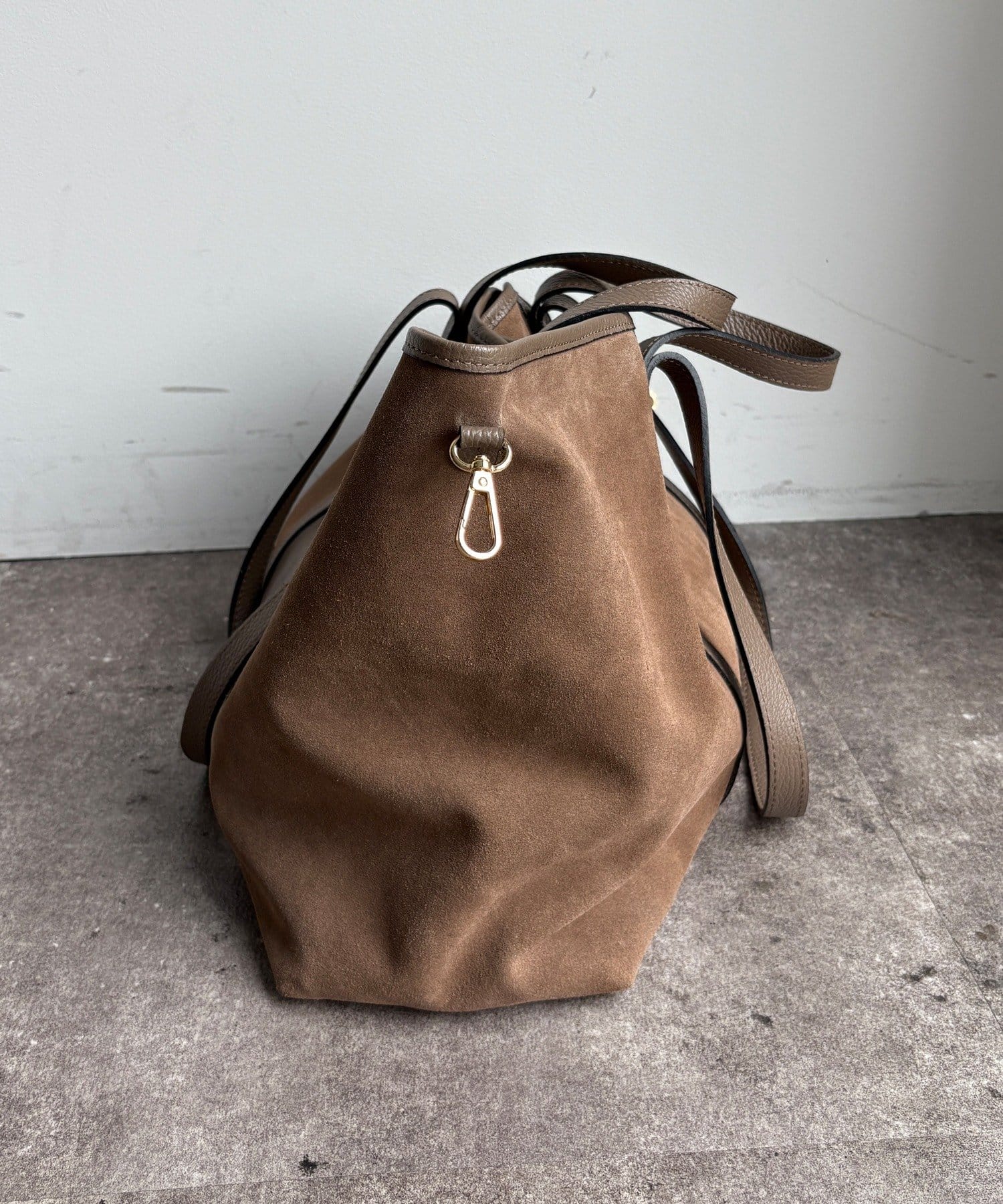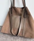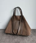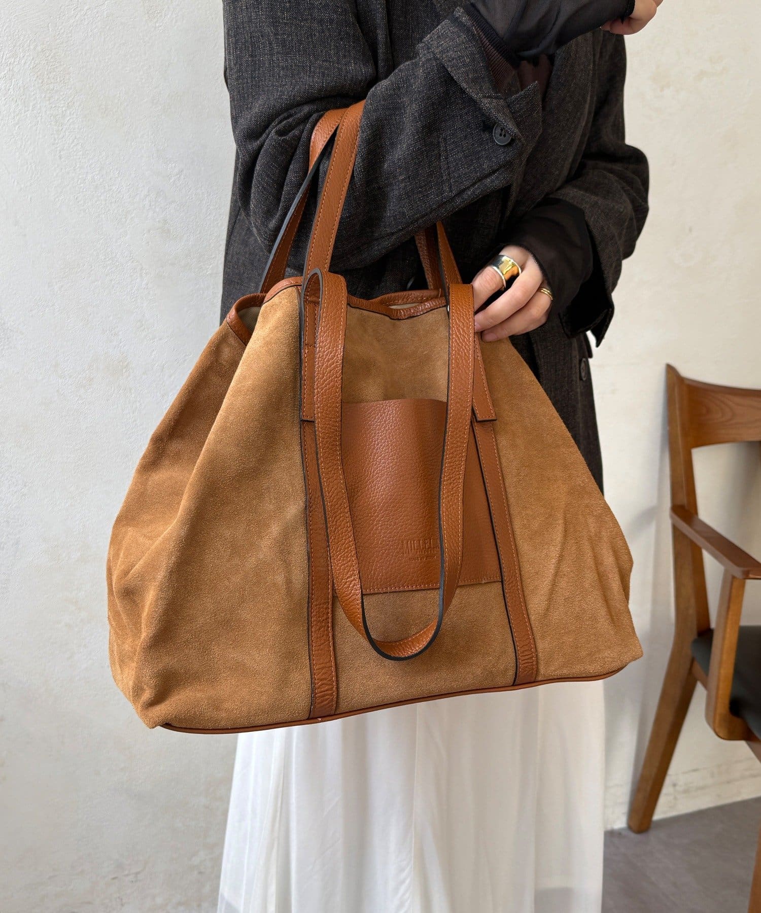 今年っぽいトレンドのスエード調生地に、レザー調の持ち手を合わせて高級感をプラス。