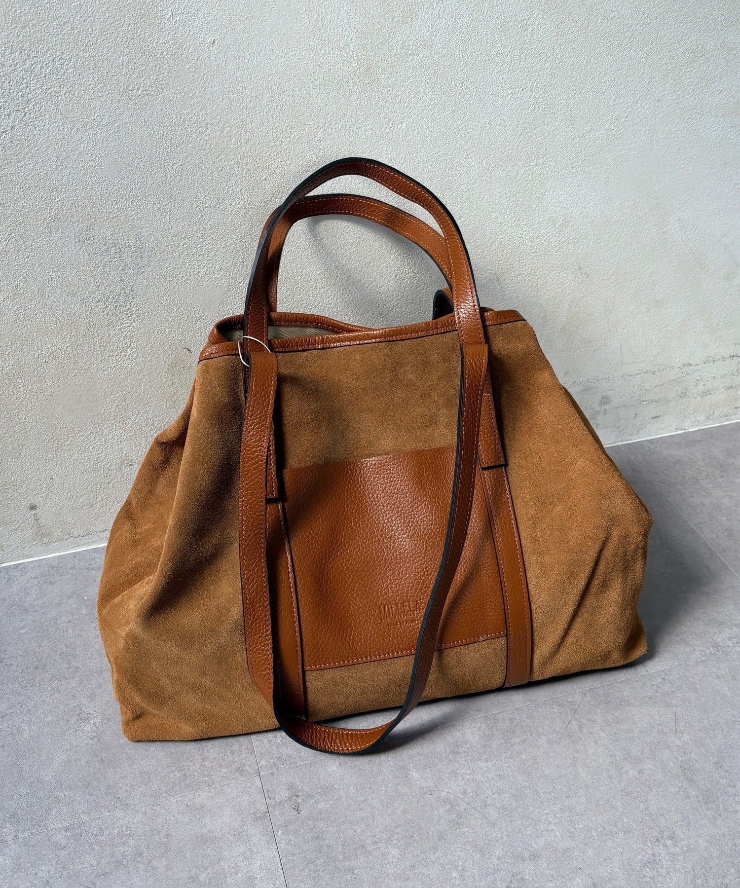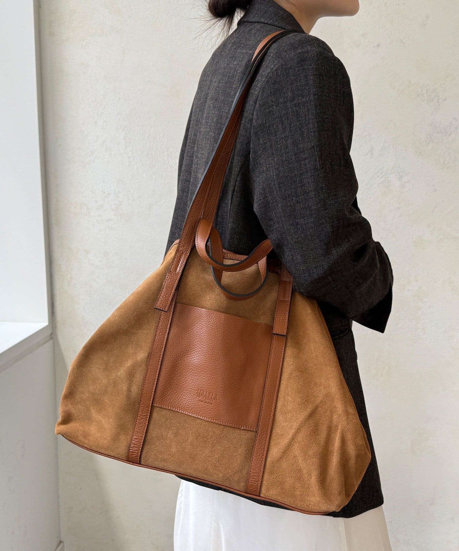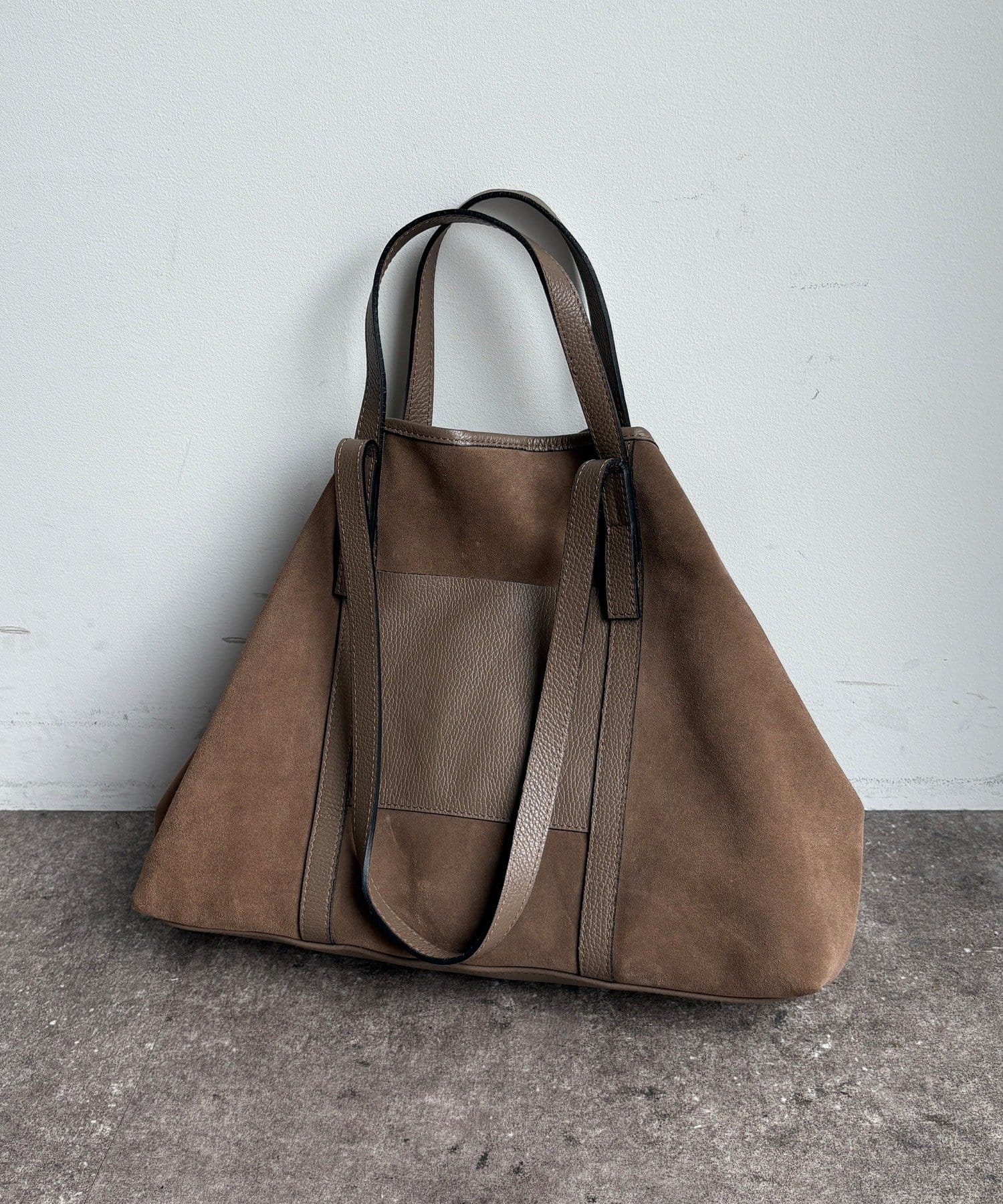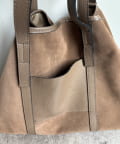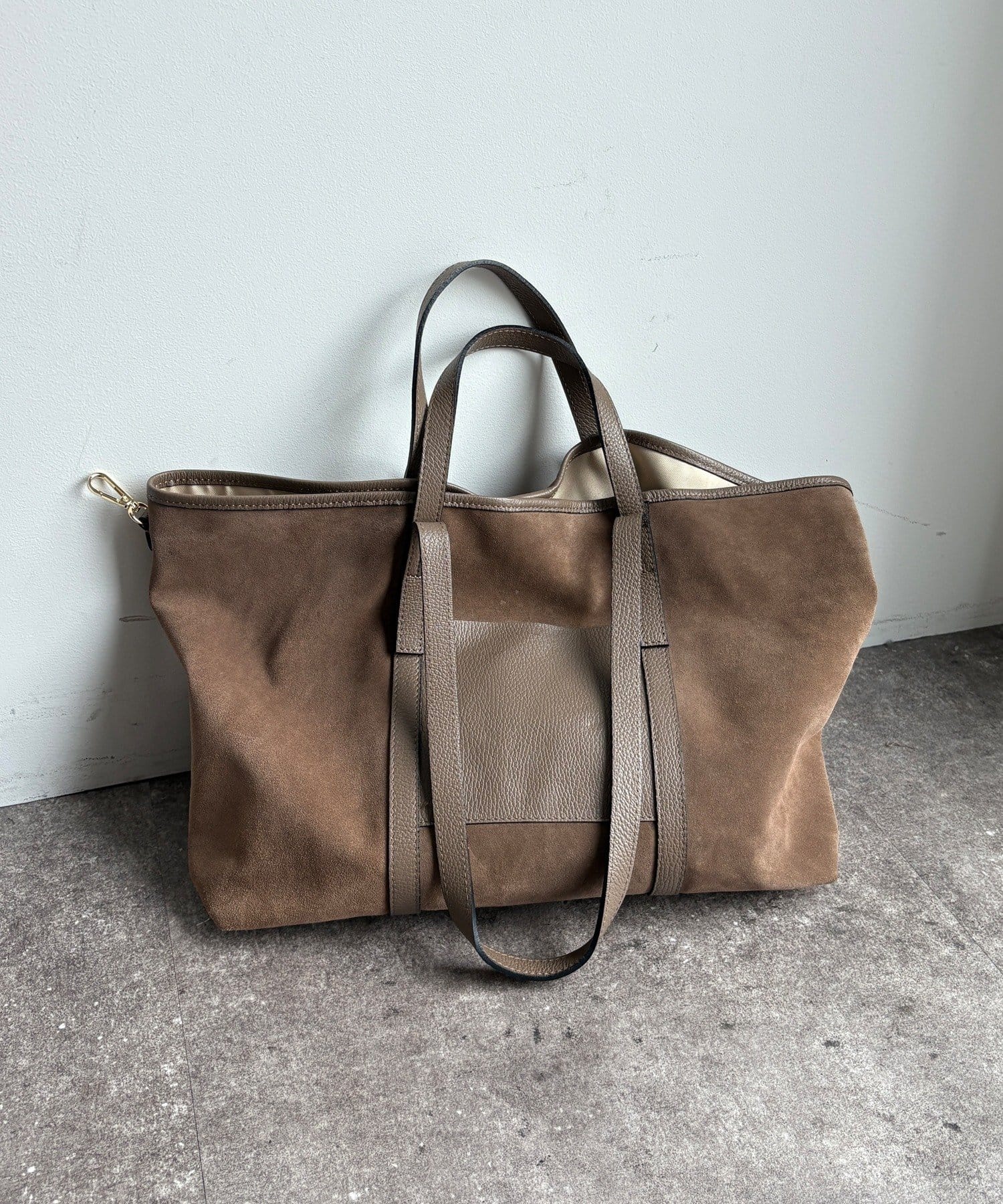 今年っぽいトレンドのスエード調生地に、レザー調の持ち手を合わせて高級感をプラス。