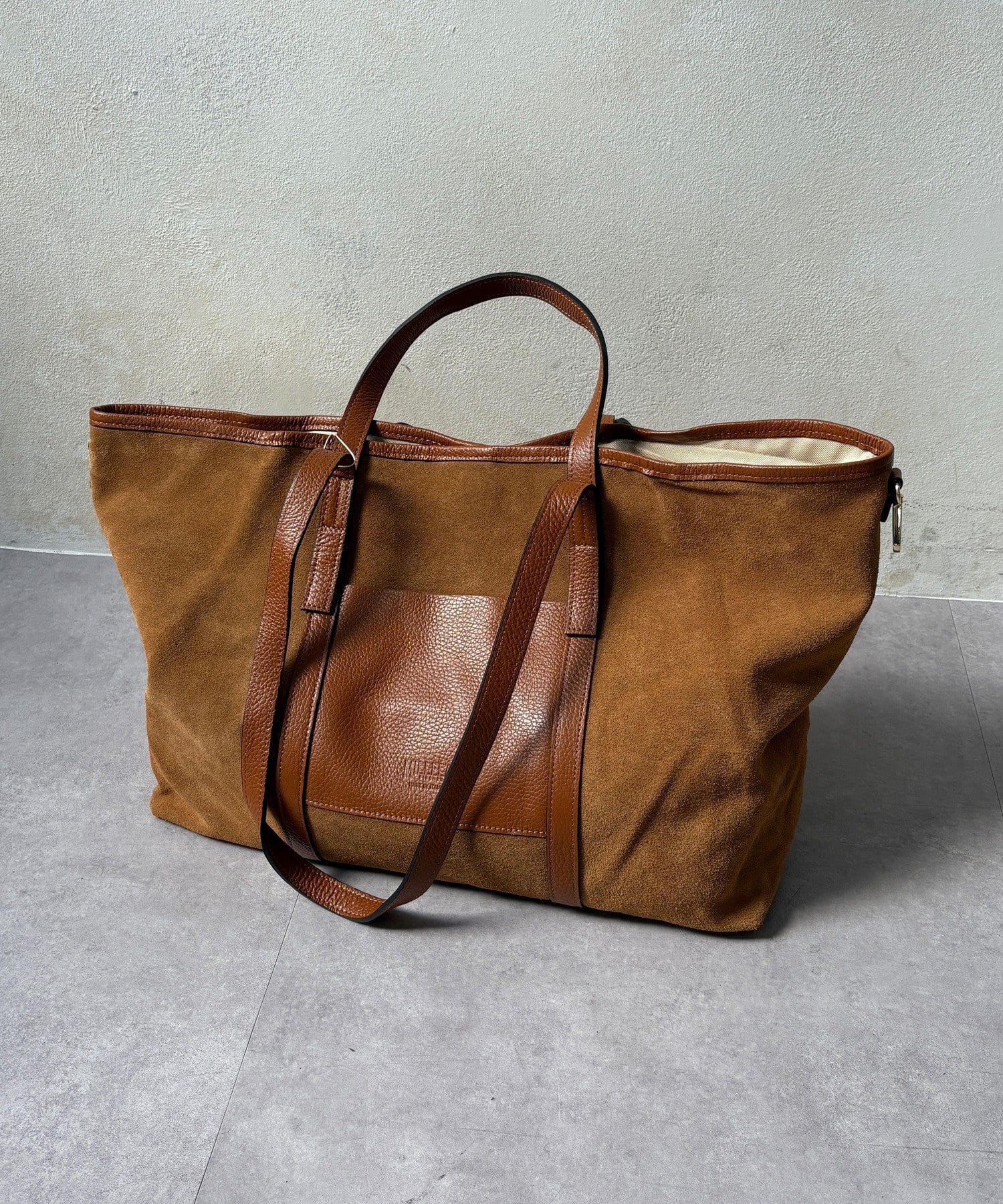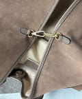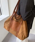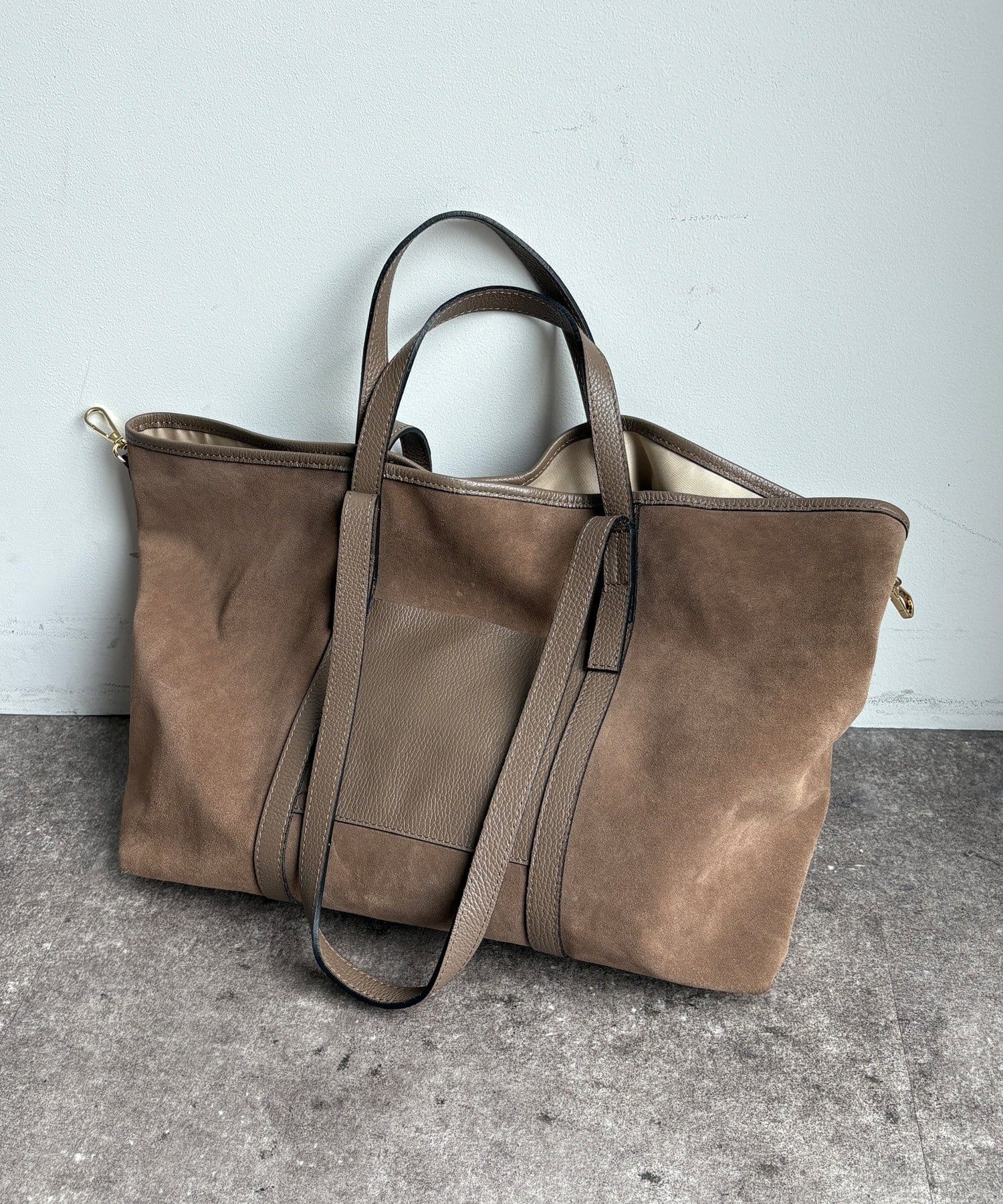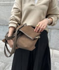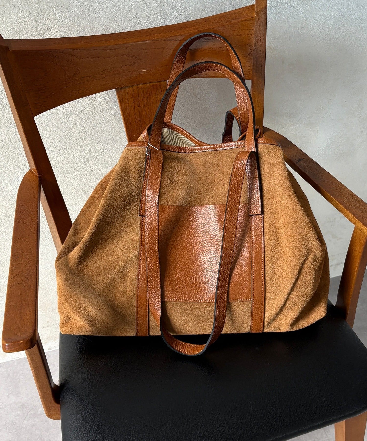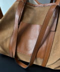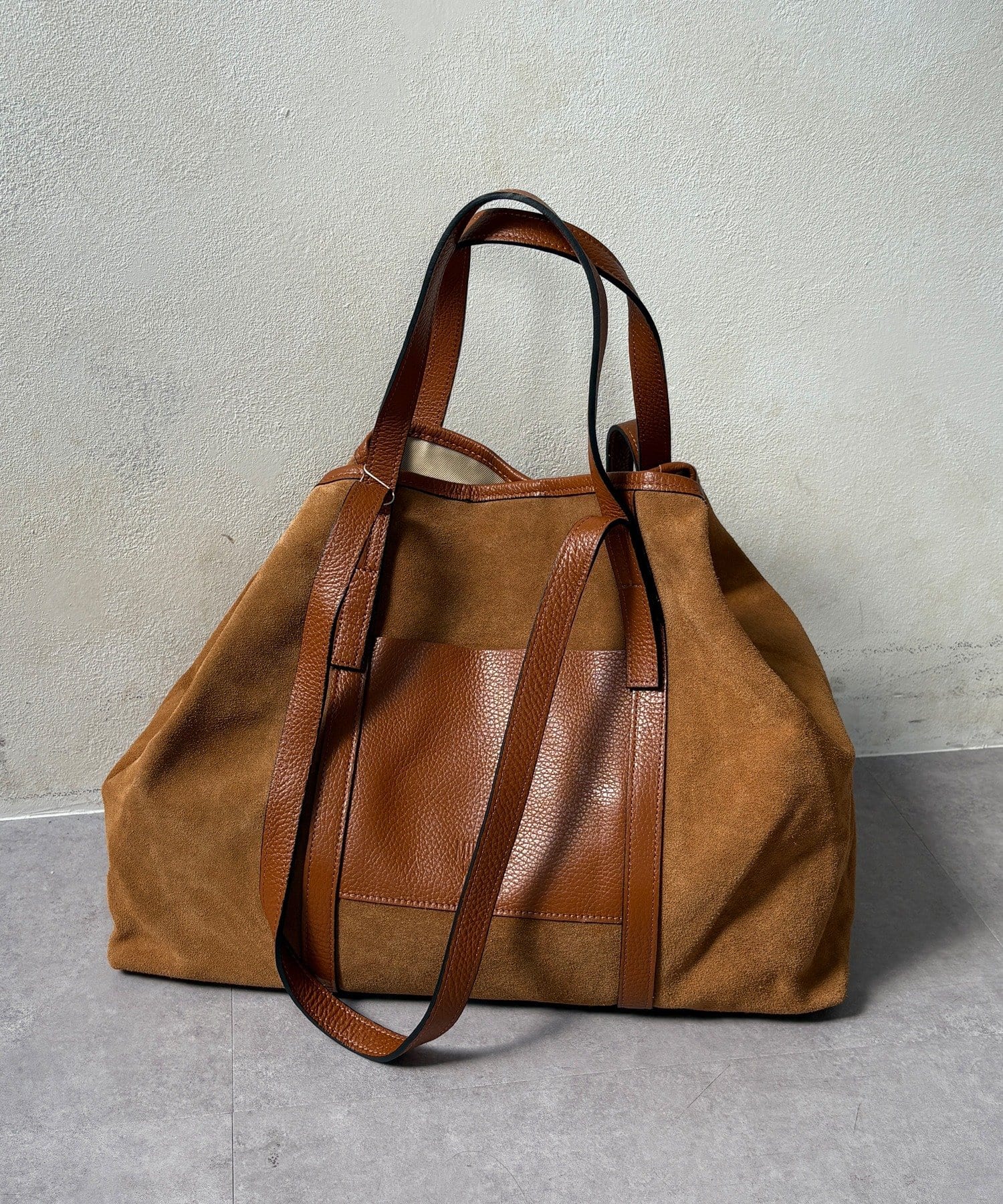 今年っぽいトレンドのスエード調生地に、レザー調の持ち手を合わせて高級感をプラス。