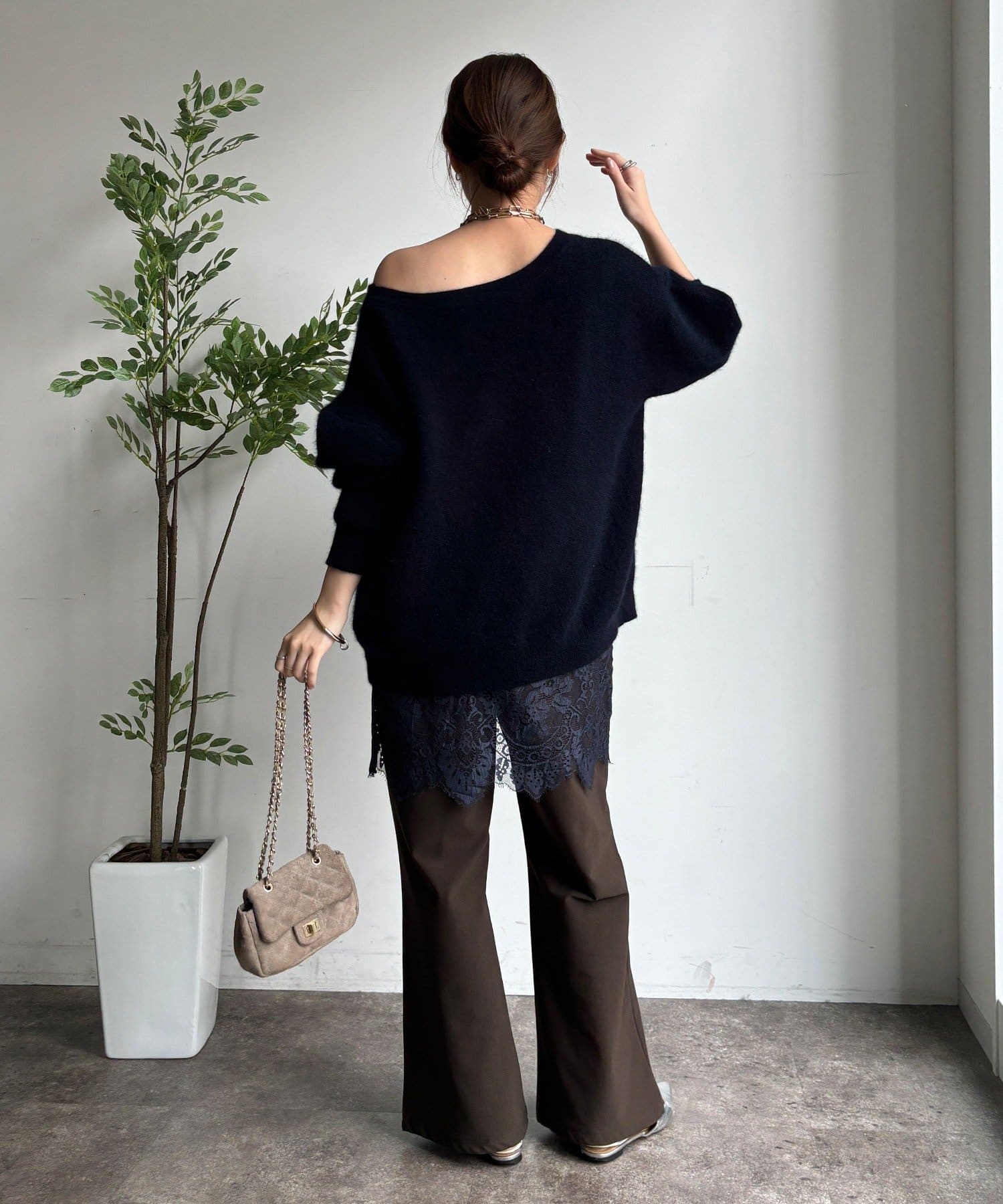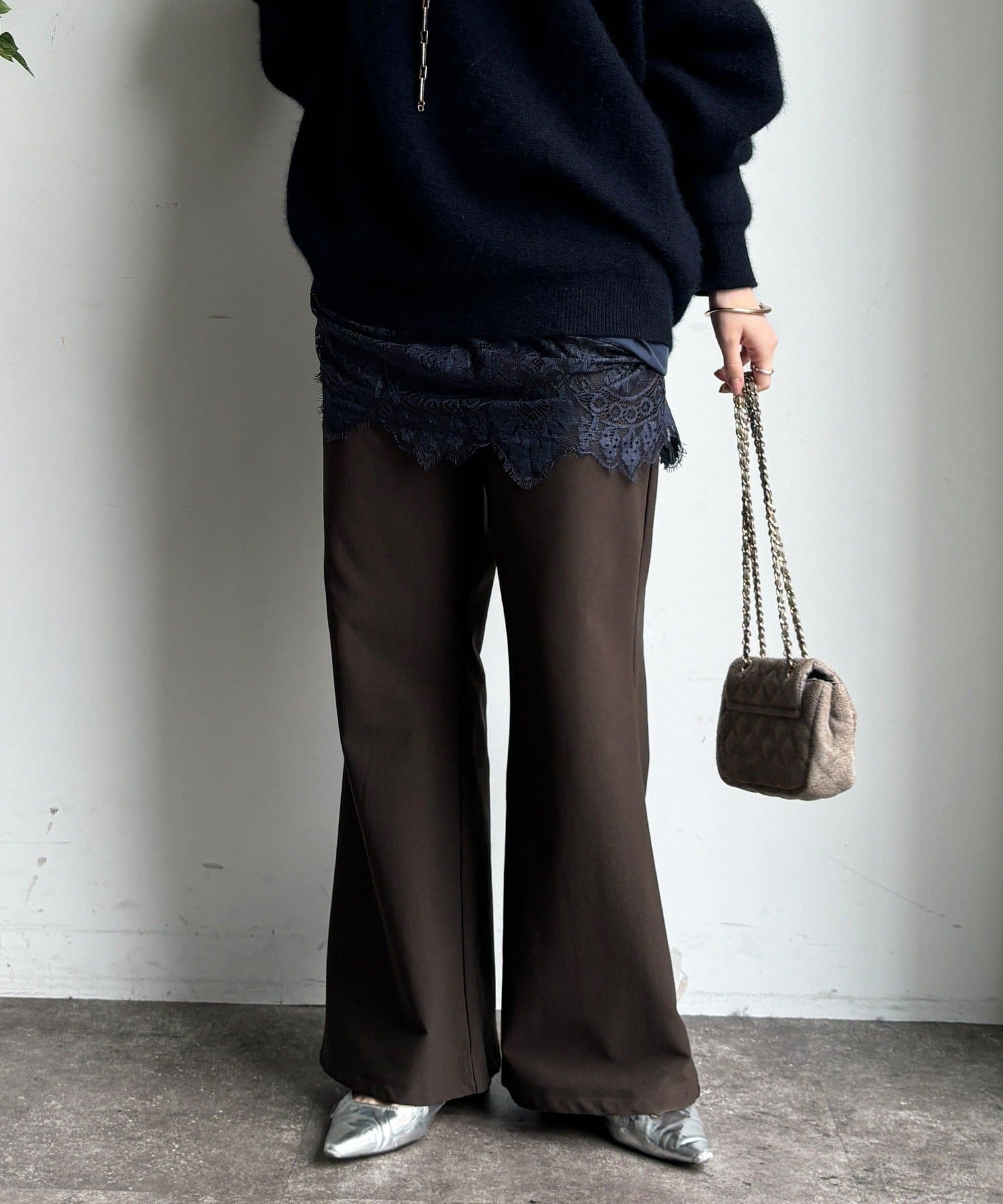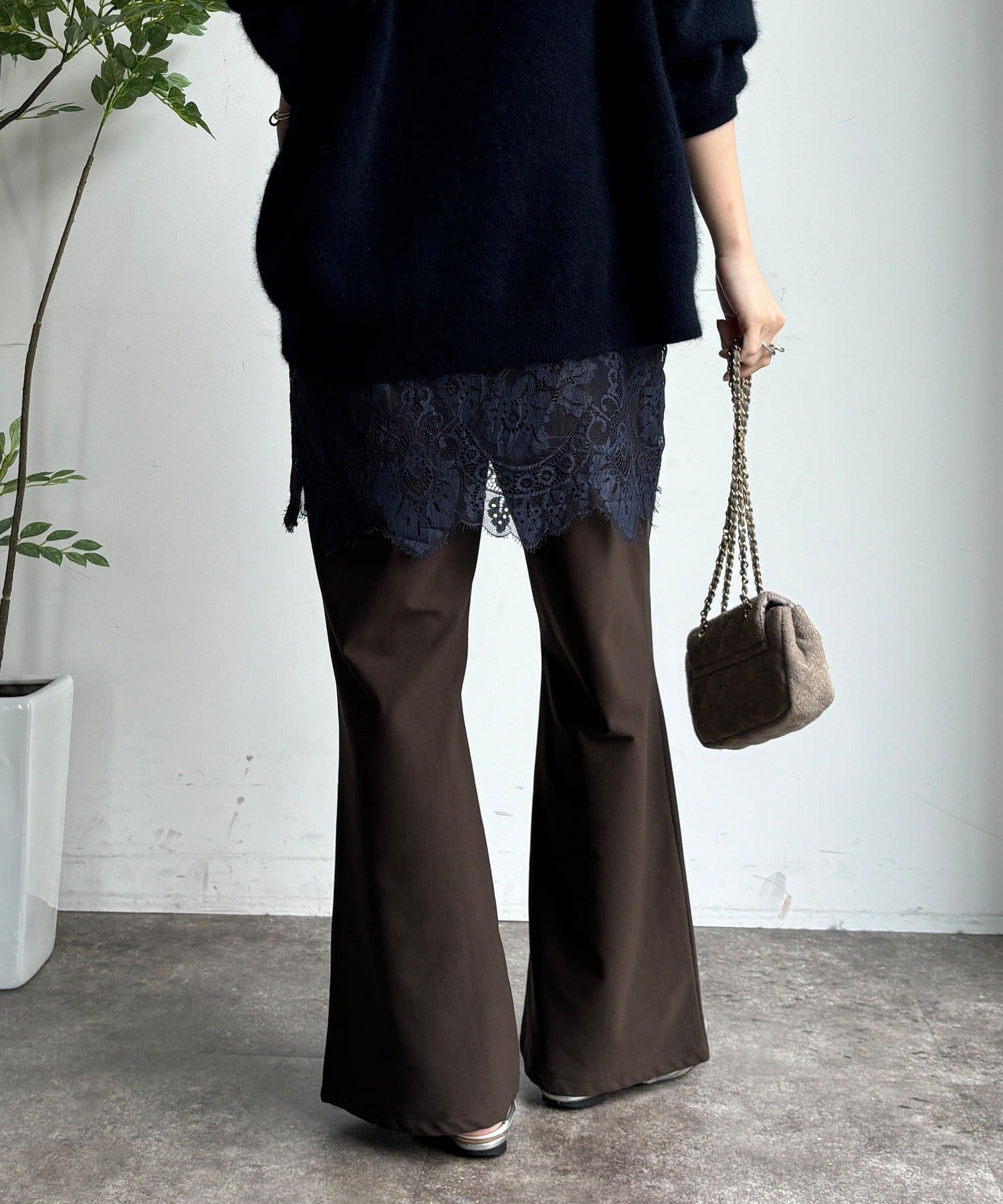 裾に向かってゆるやかに広がるフレアシルエットが、脚長効果とスタイルアップをサポート。