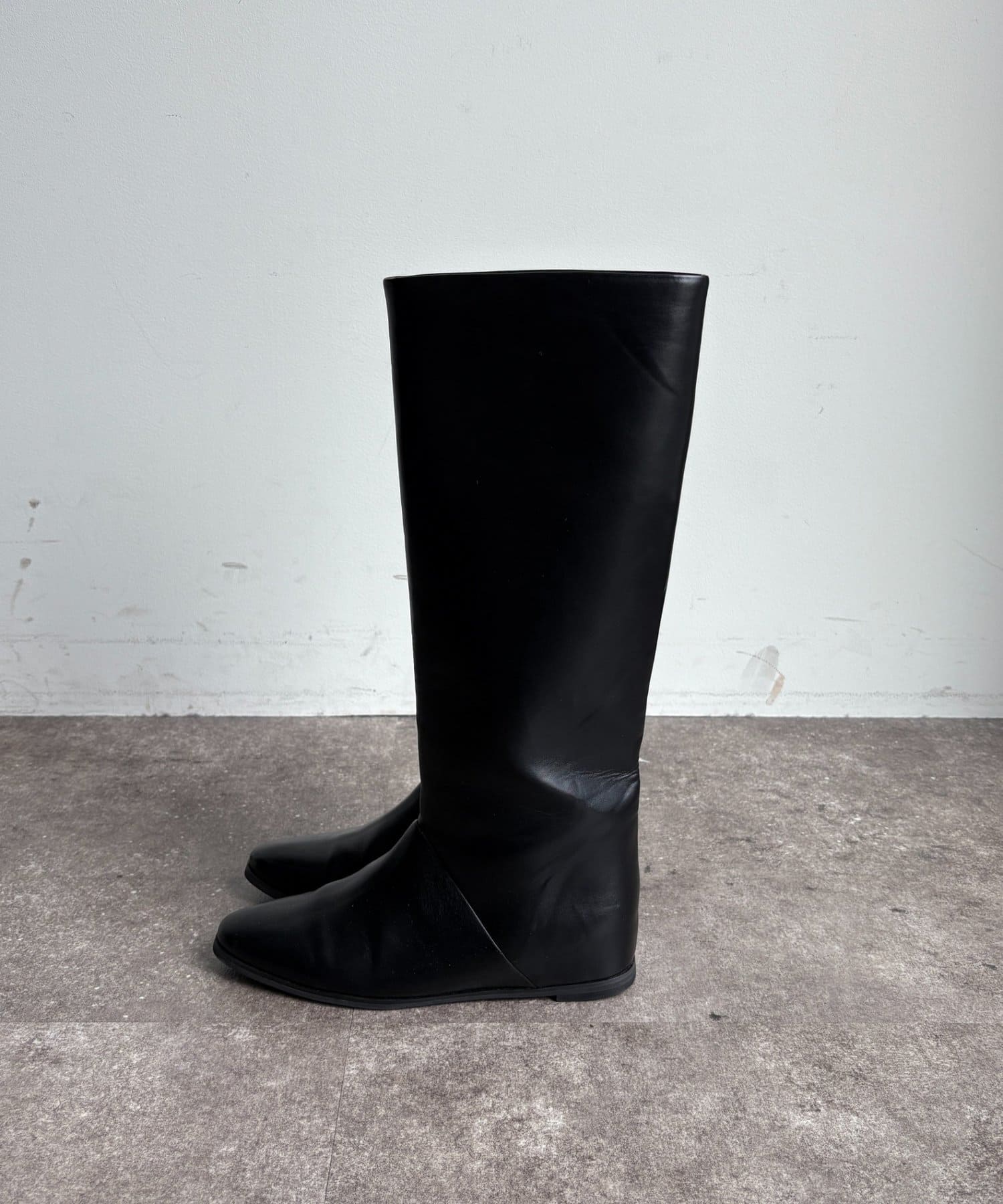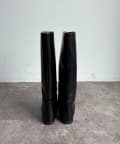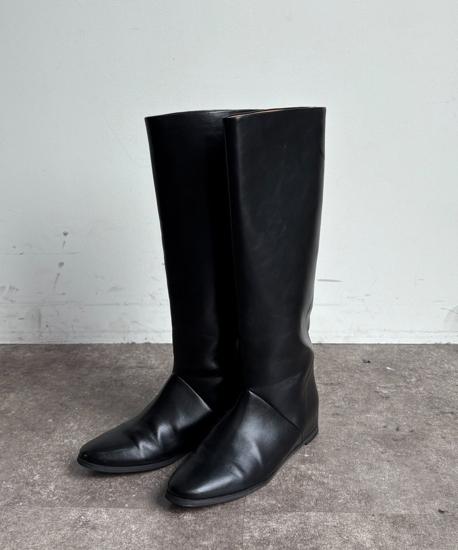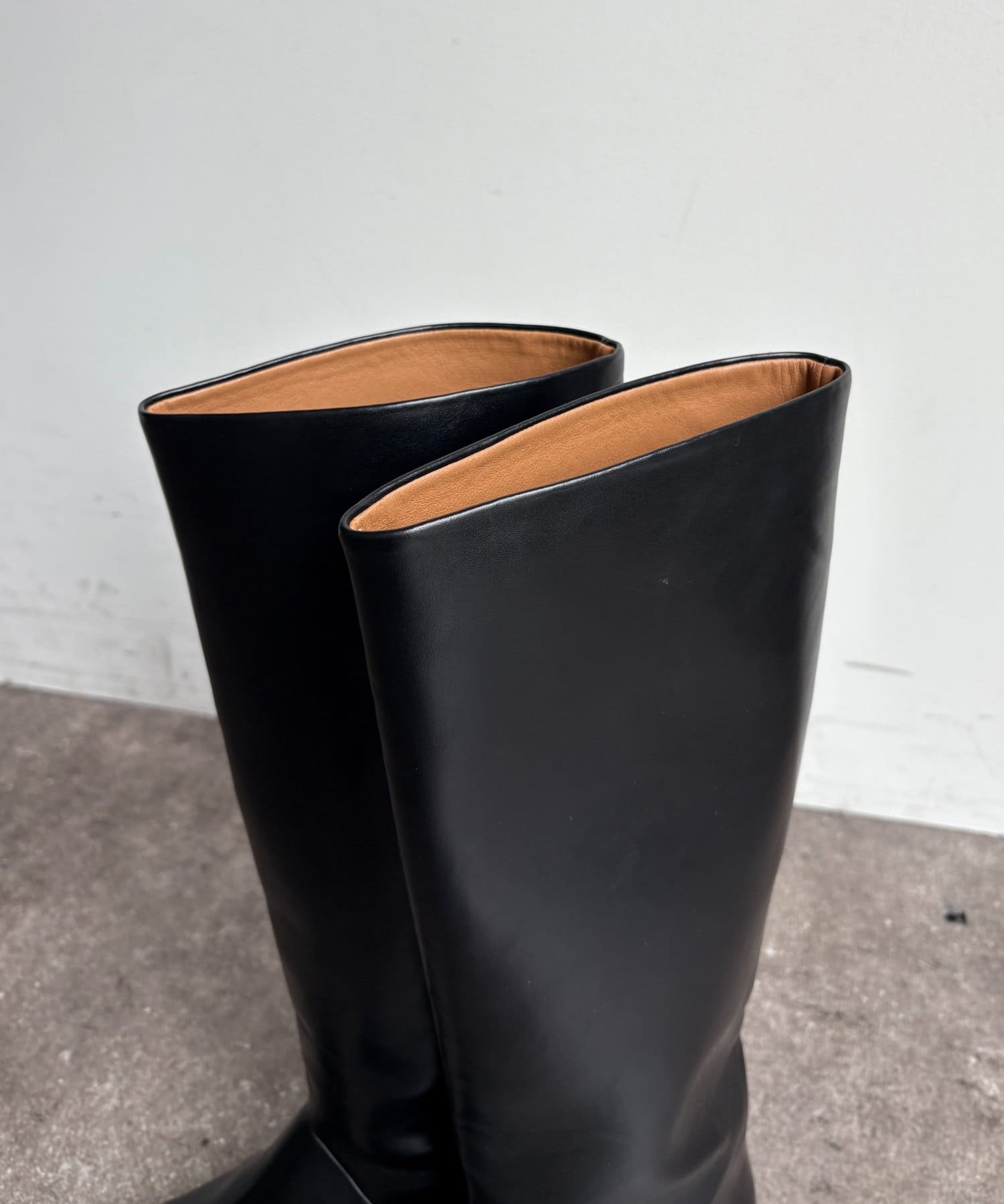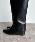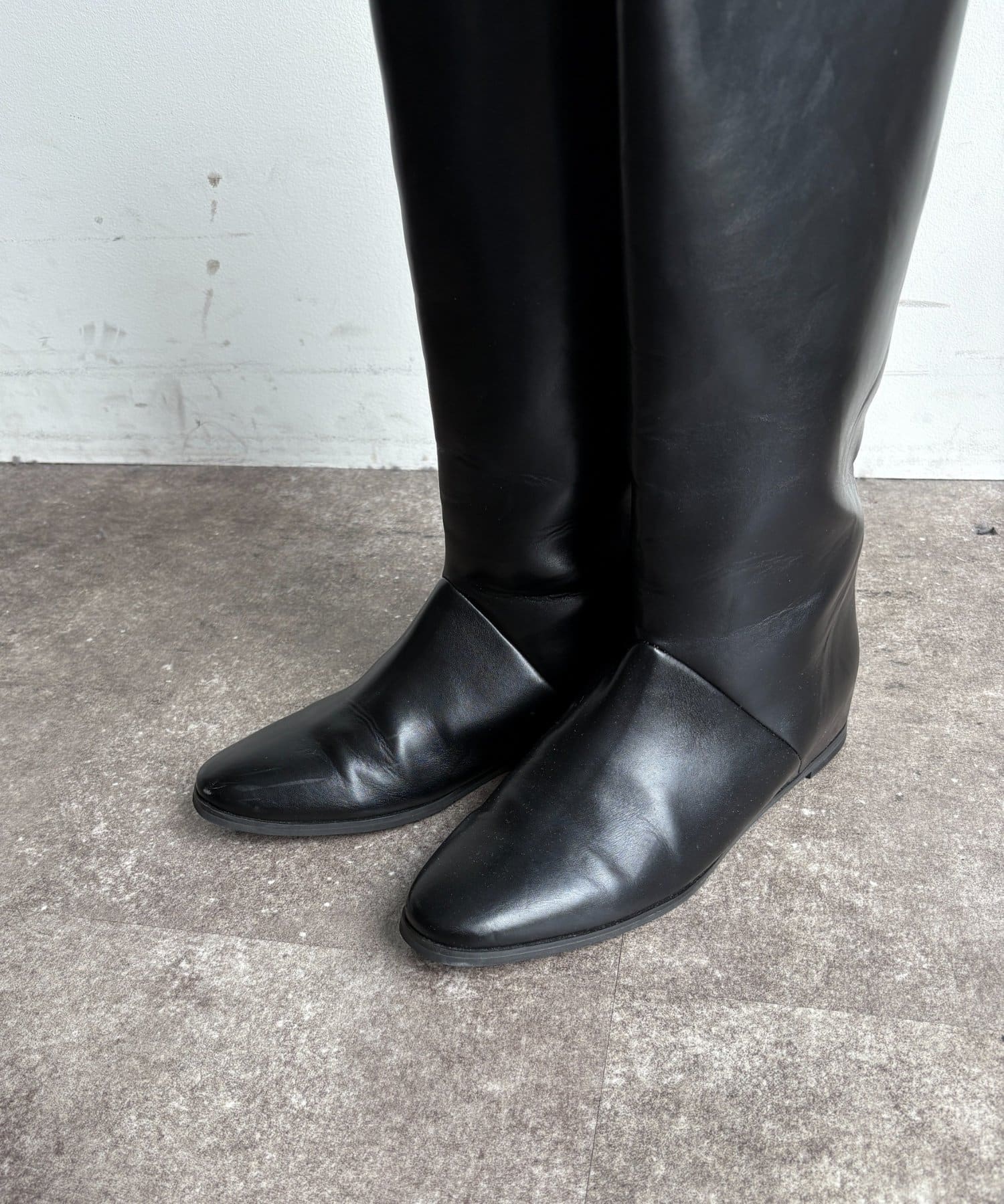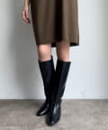 スタイリングを選ばず、おしゃれに決まるアーモンドトゥのロングブーツ。