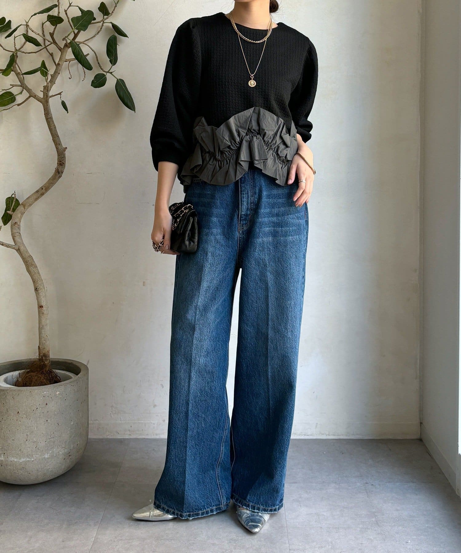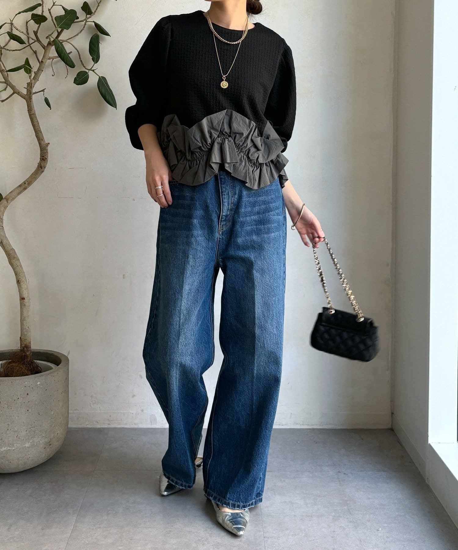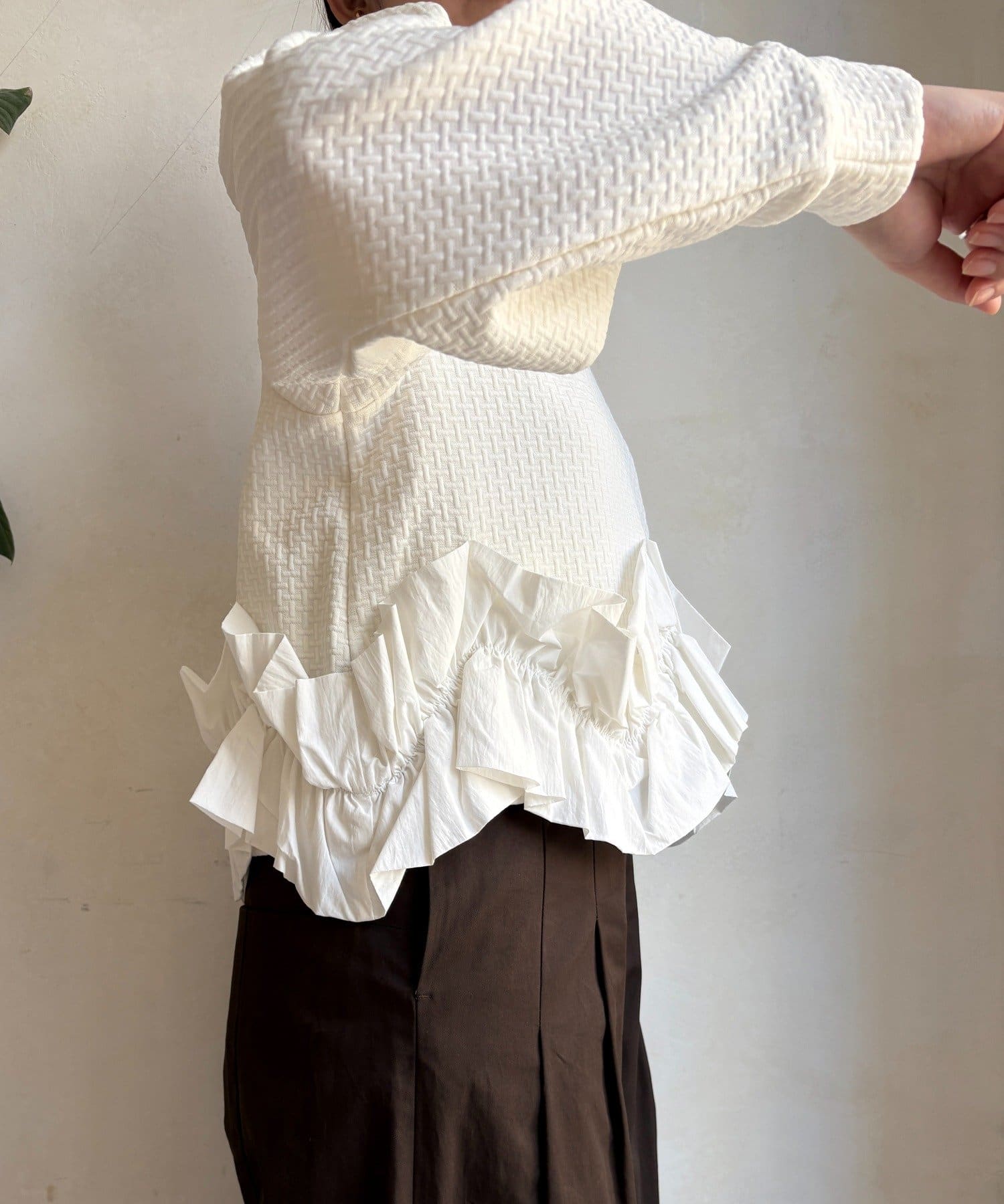 裾にあしらわれたフリル。程よいボリューム感で立体的に仕上げられており軽やかに揺れる姿が印象的。