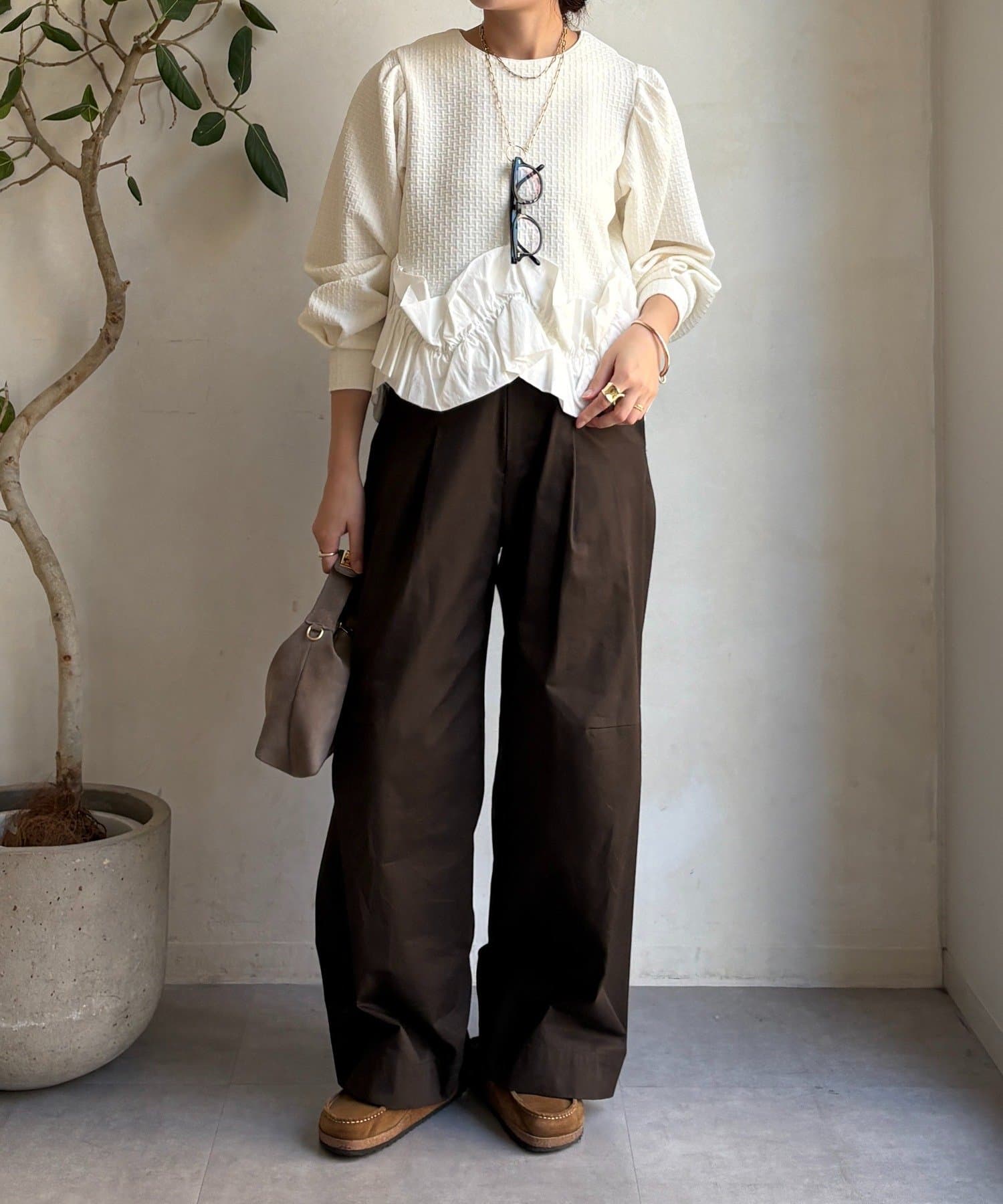 甘すぎないシルエットに整えられているため、大人の女性にも取り入れやすい1着です。