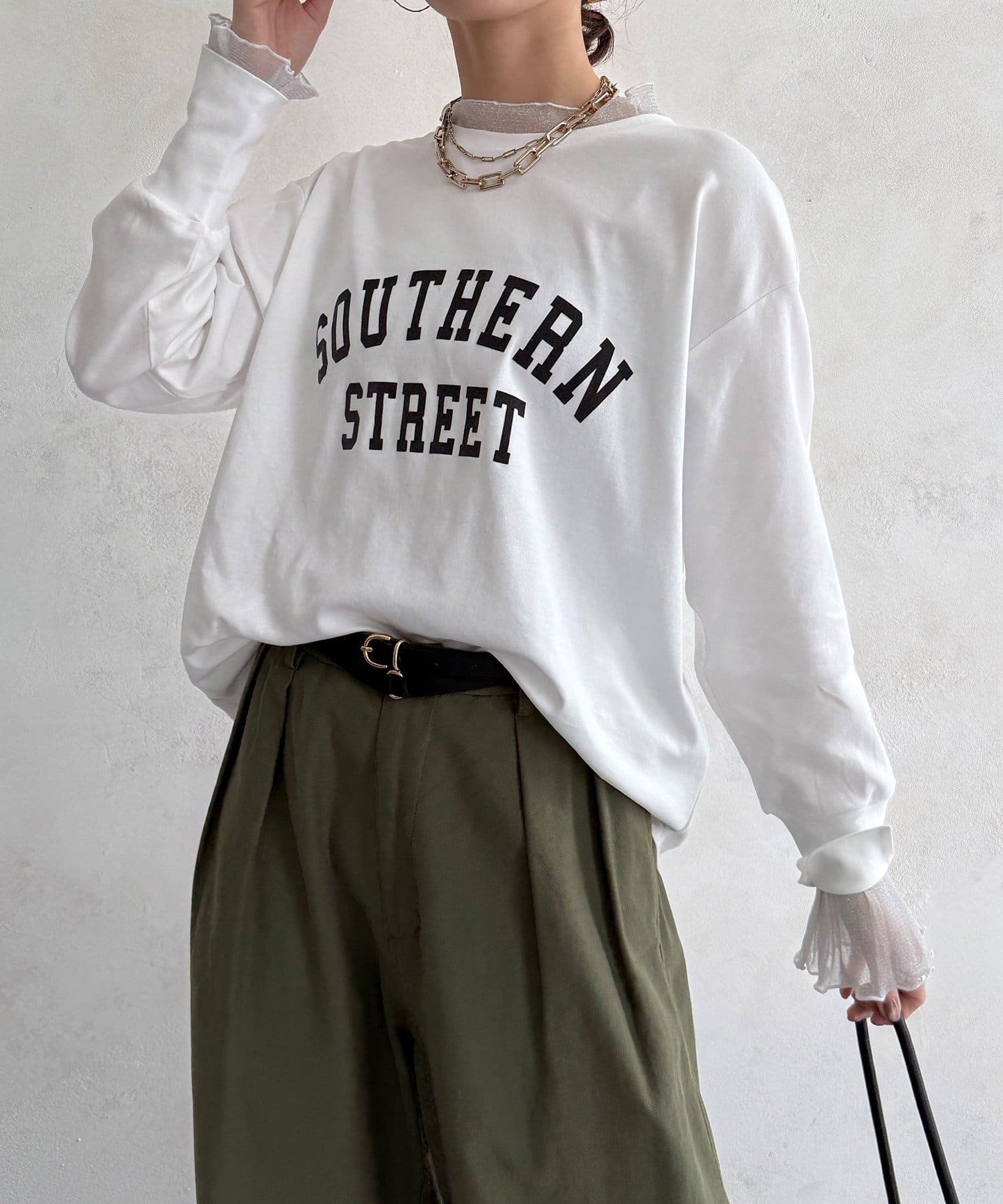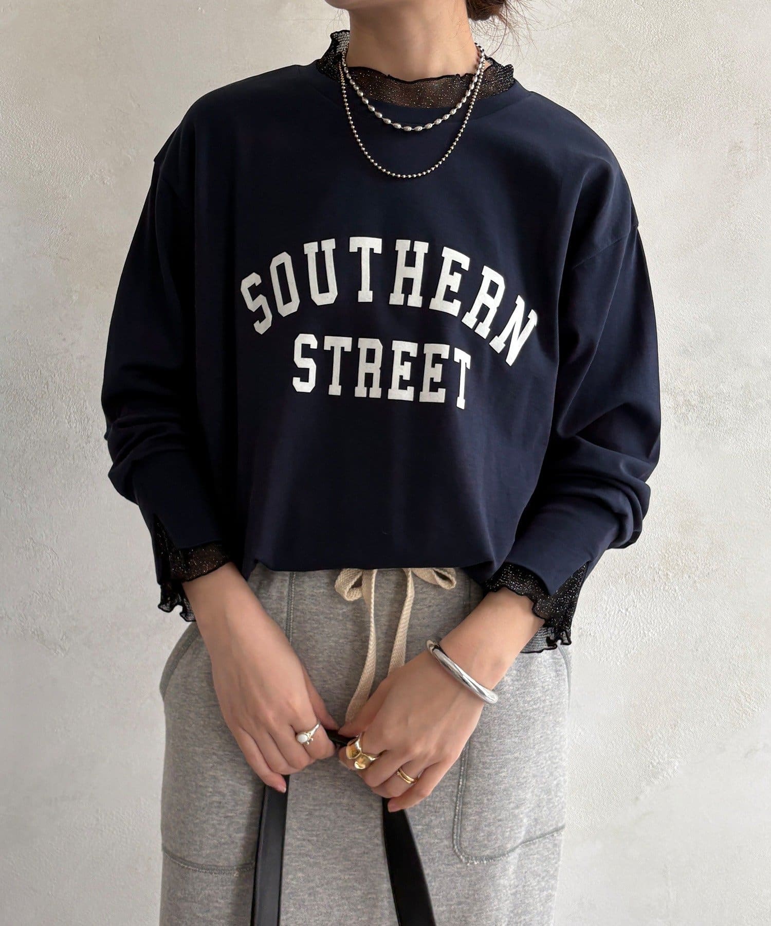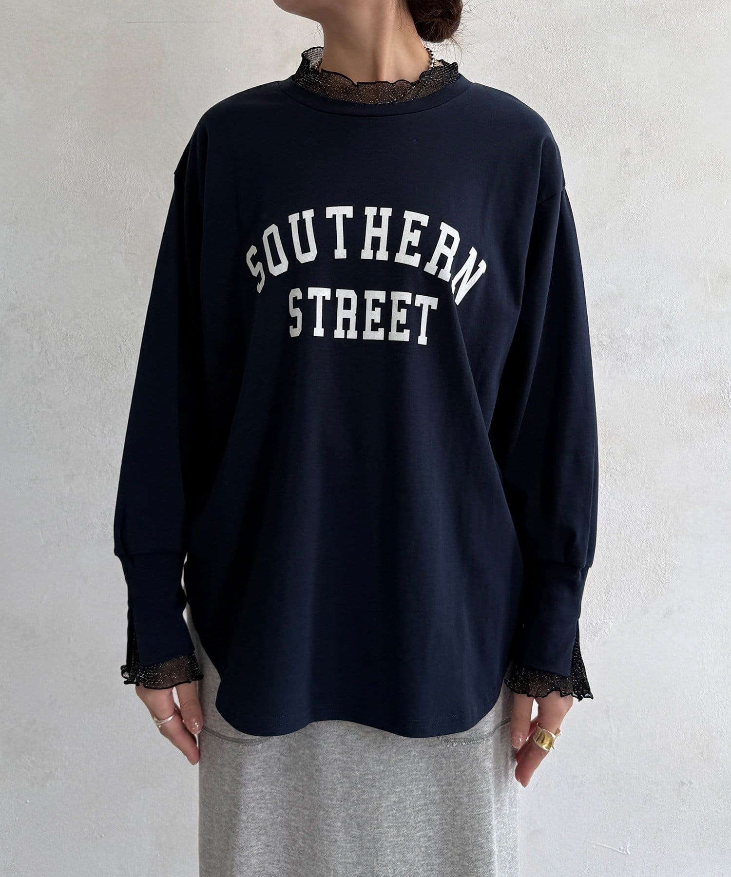 カジュアルなロゴトップスに袖口にはレイヤード風デザインを加えた一枚。