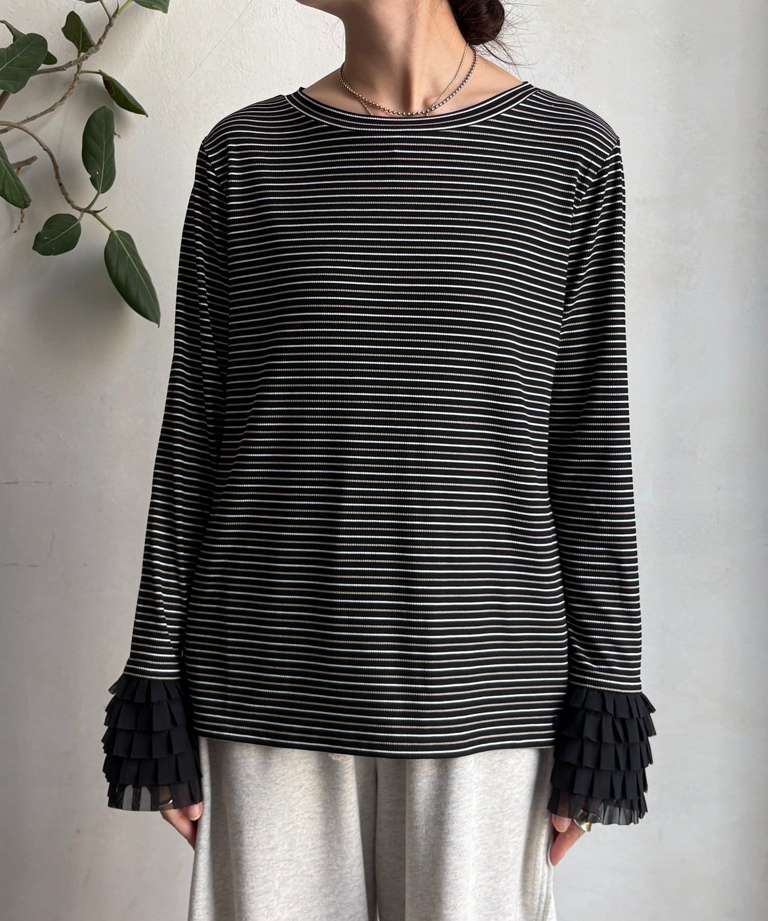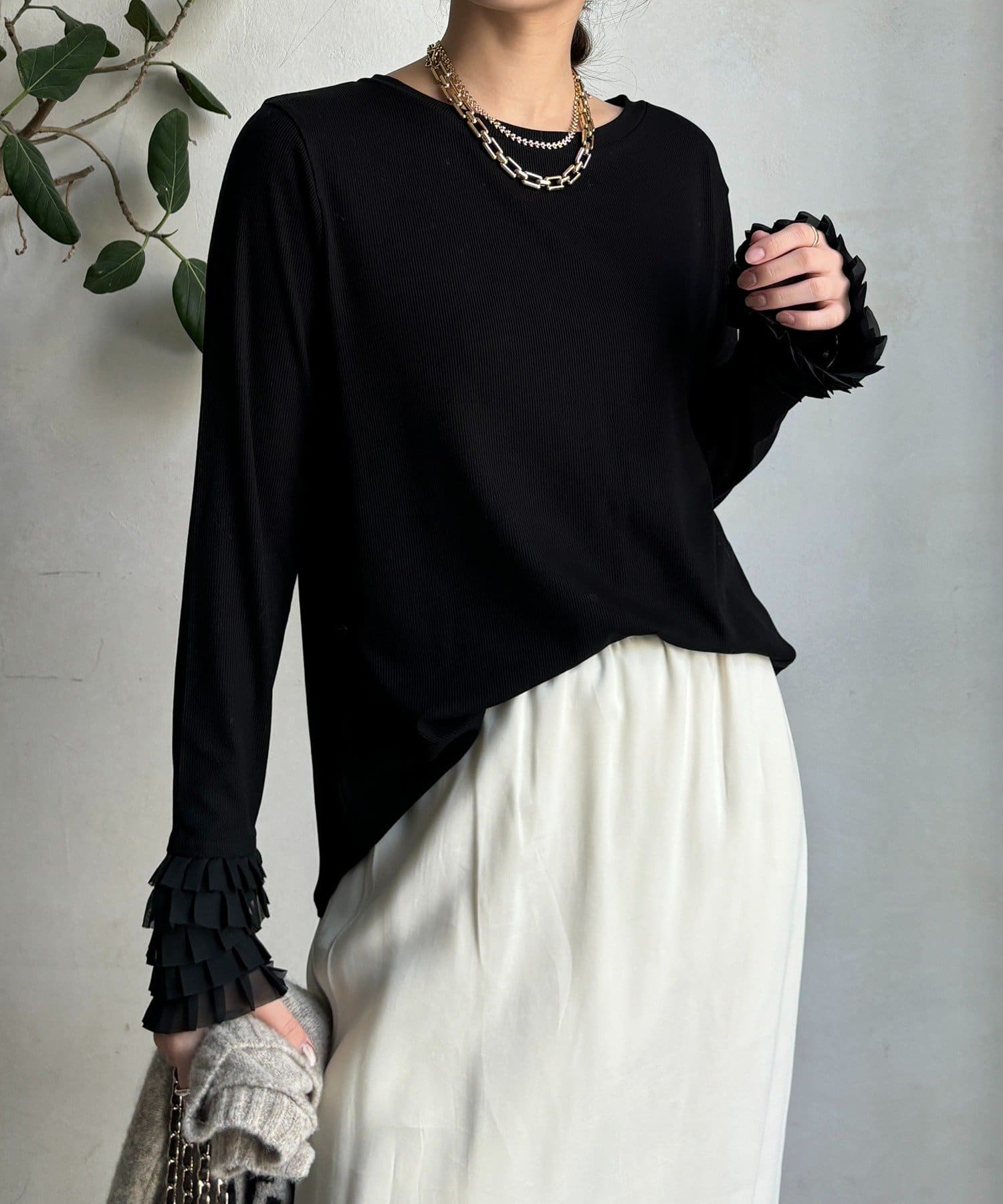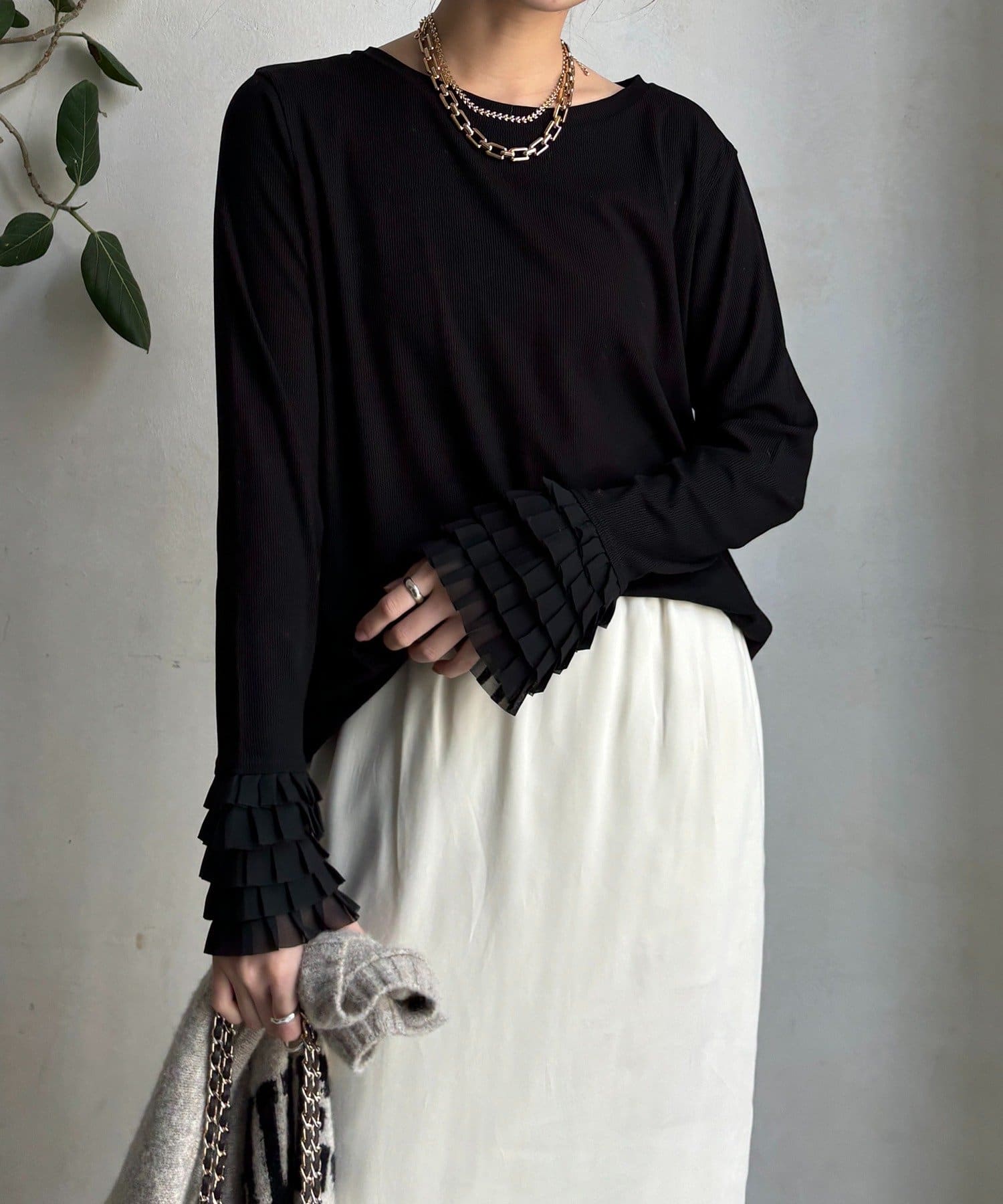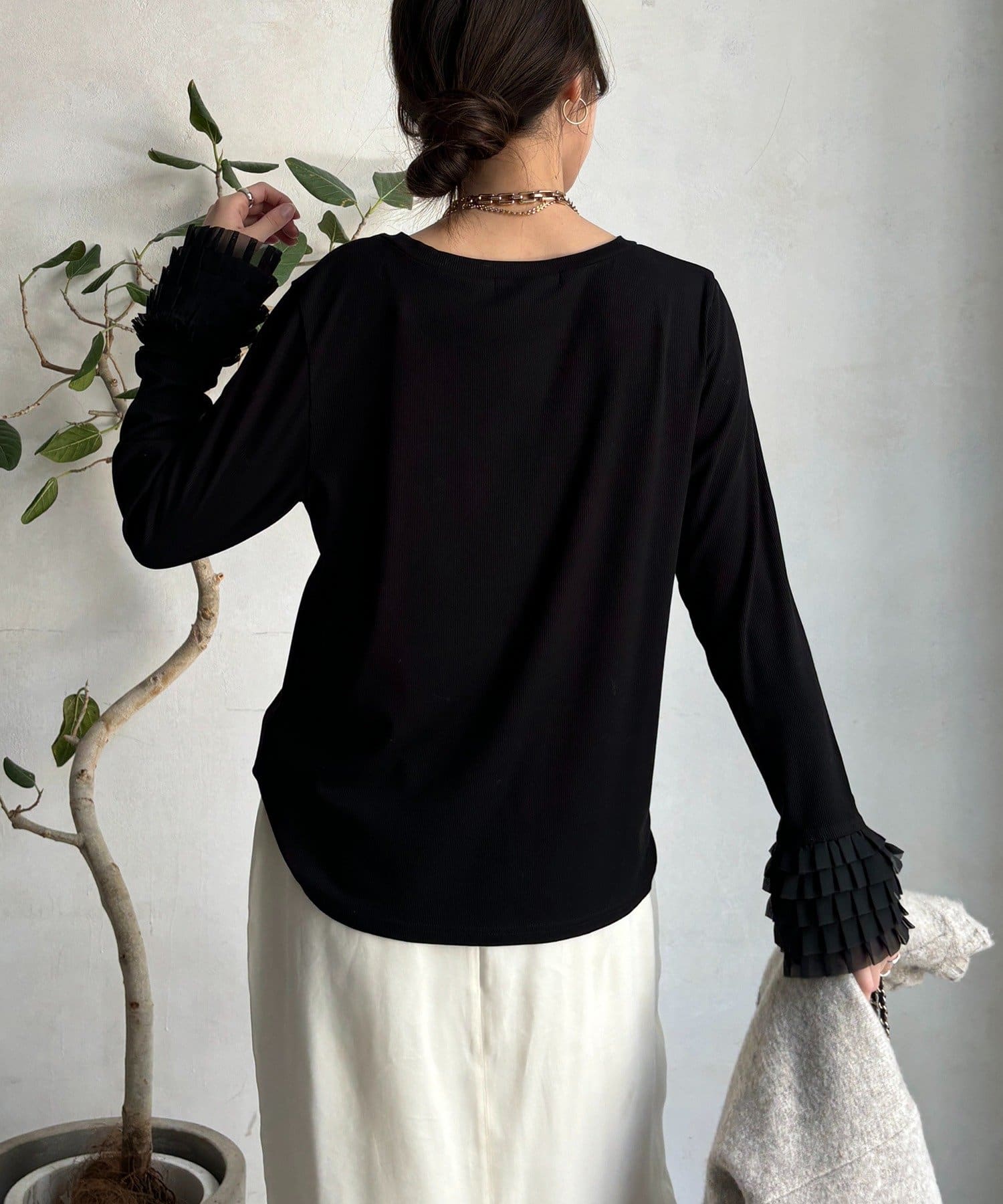 シンプルなシルエットながらも、袖口にあしらわれたフリルが、ワンランク上の着こなしに。
