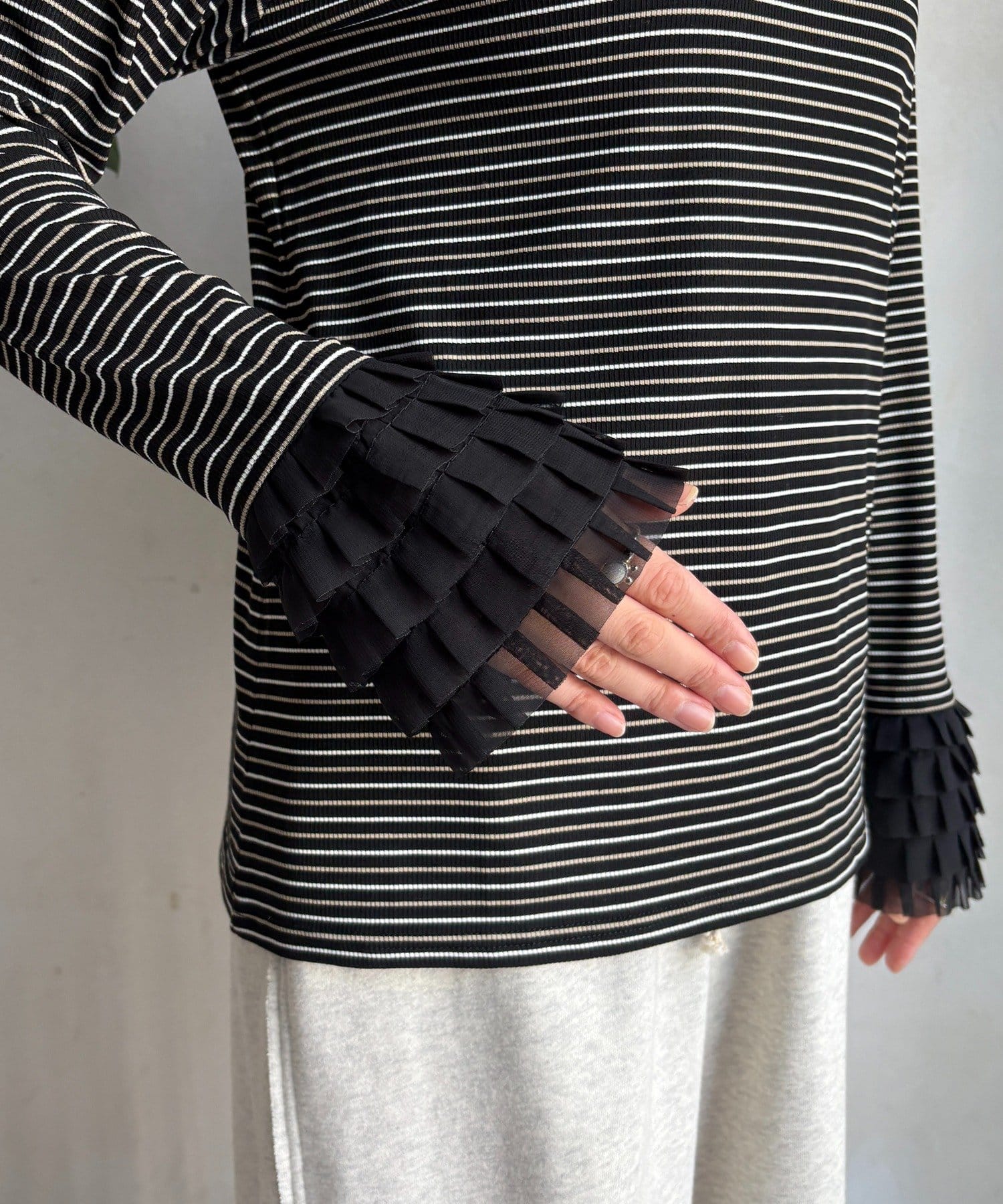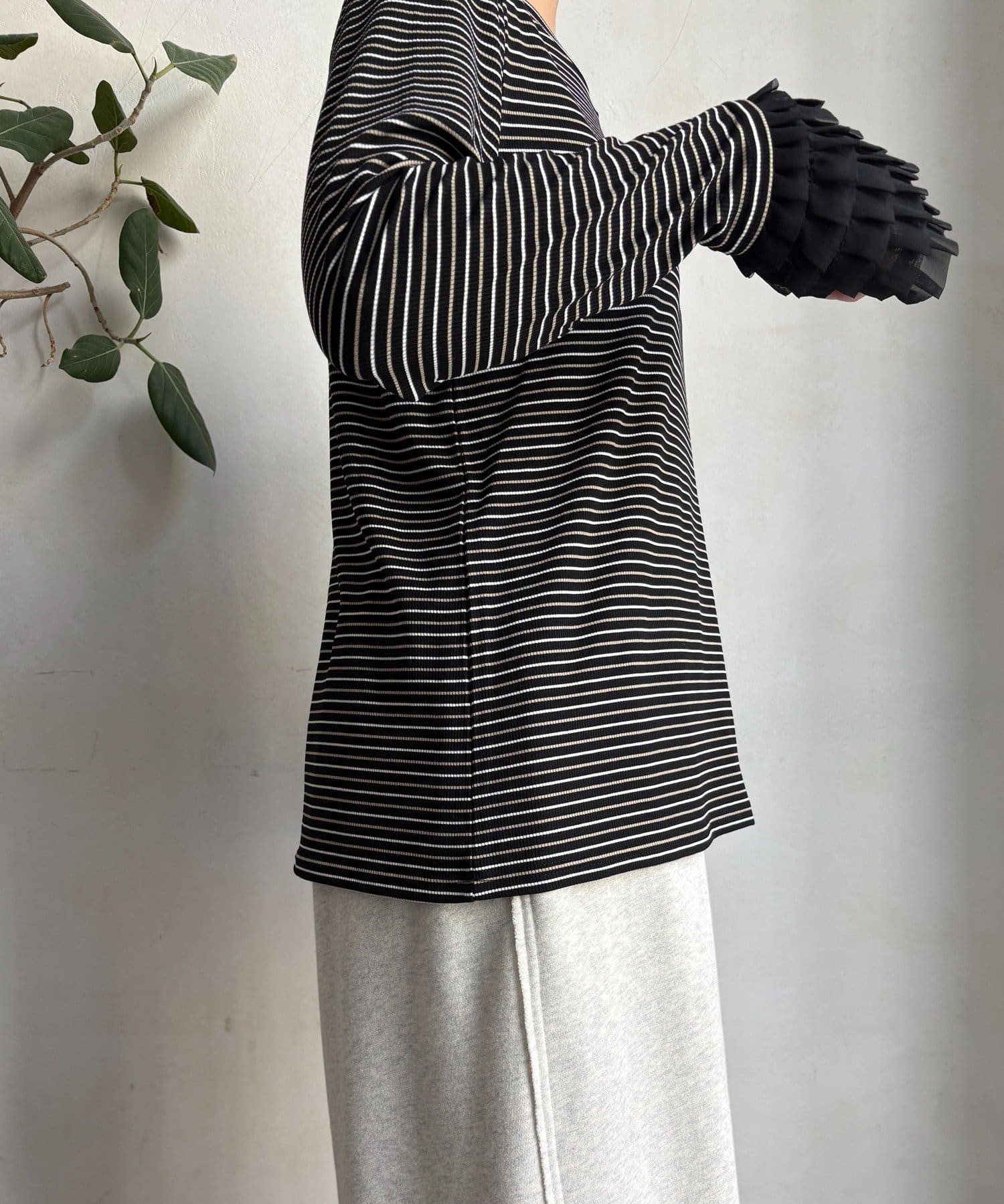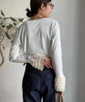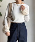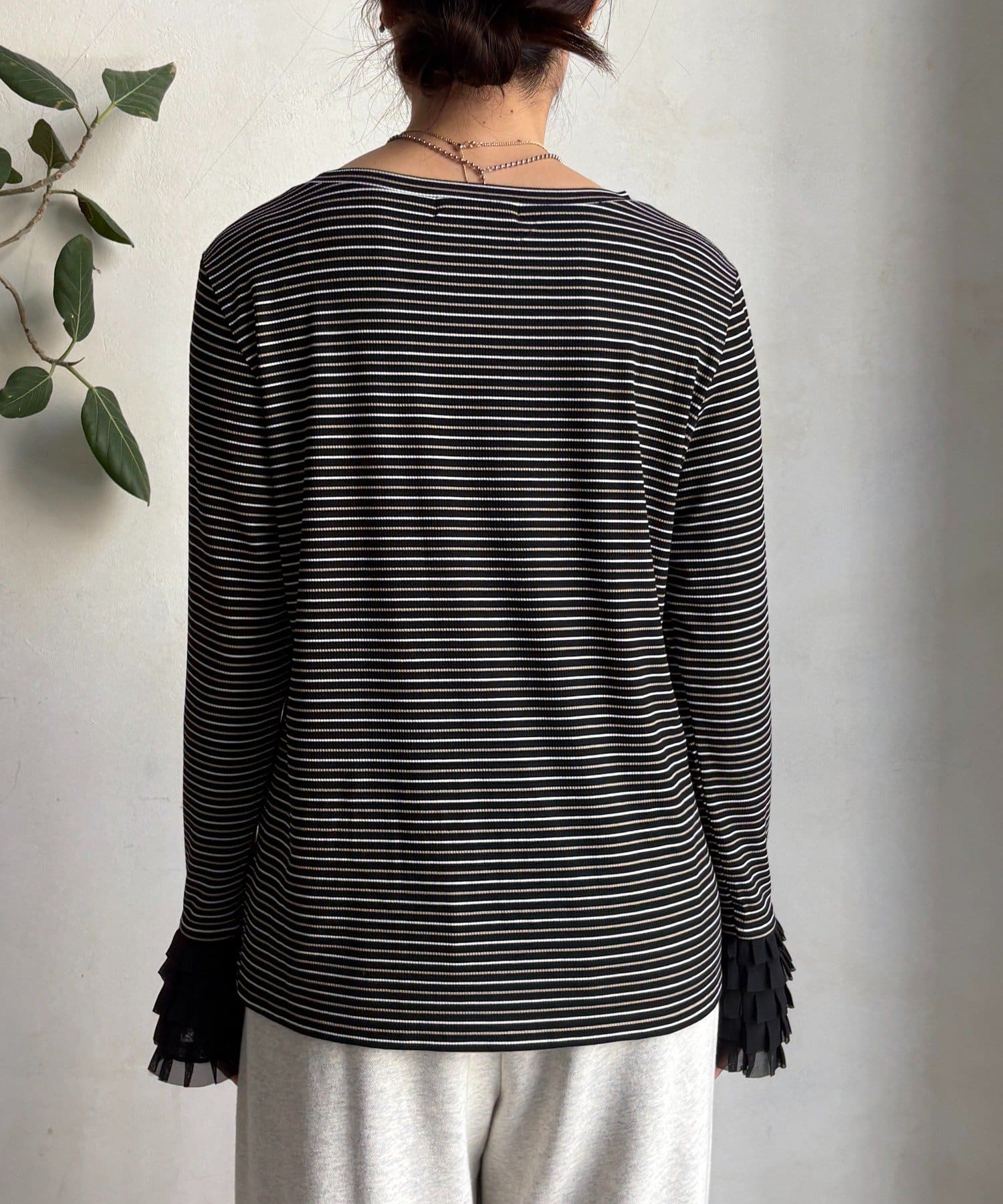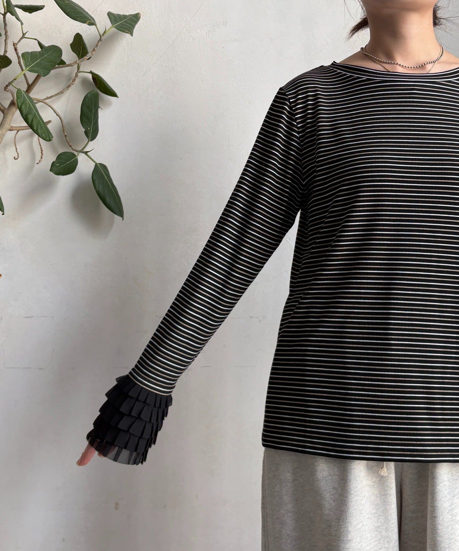 シンプルなシルエットながらも、袖口にあしらわれたフリルが、ワンランク上の着こなしに。