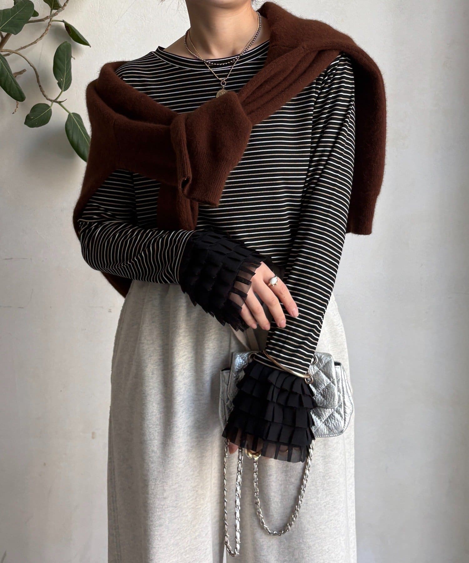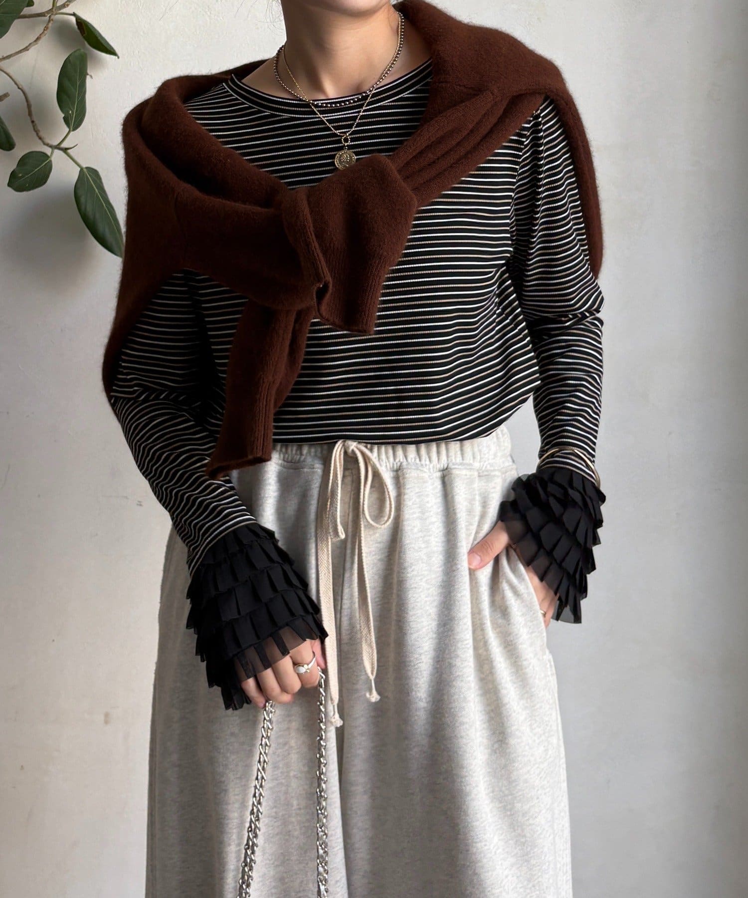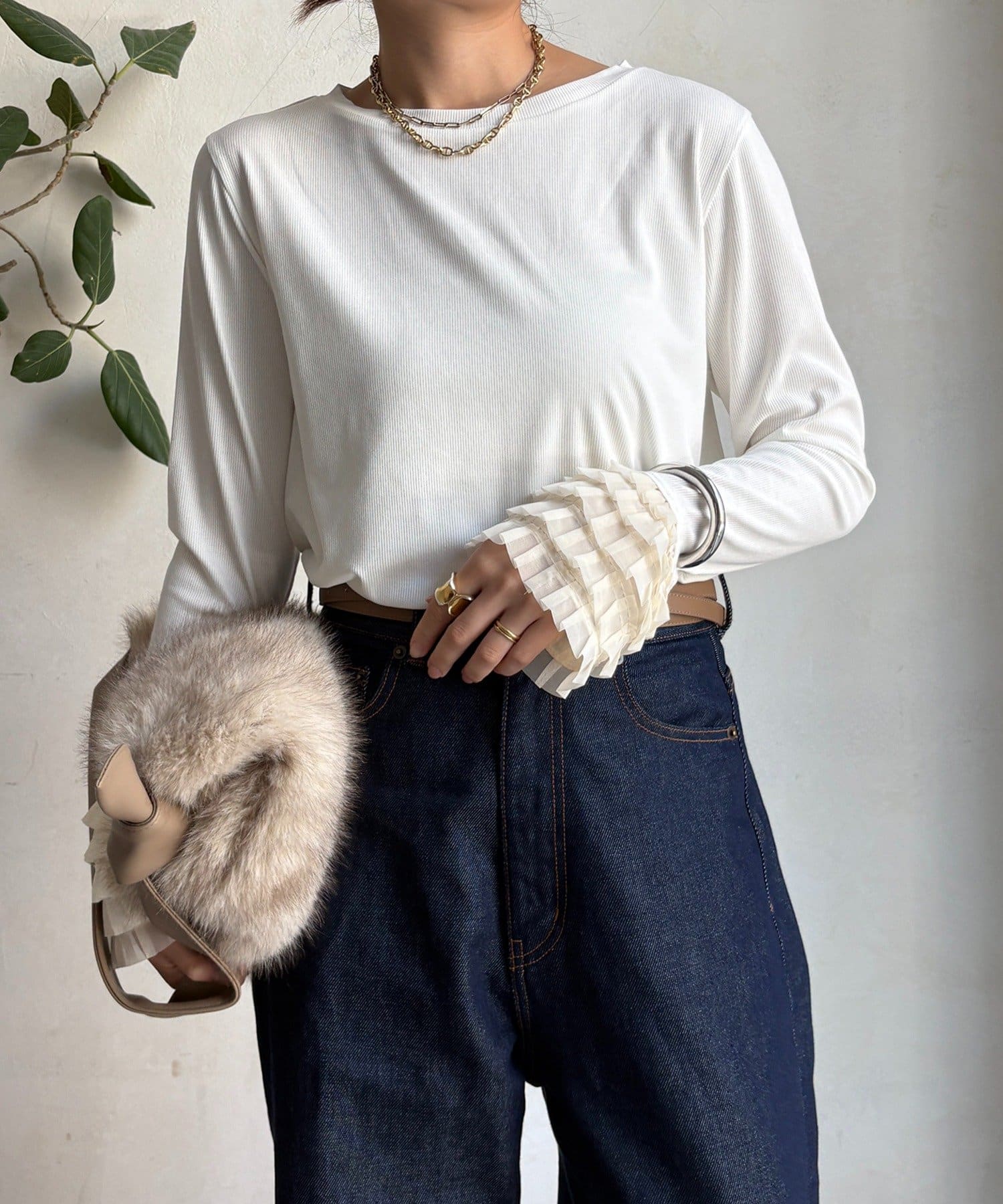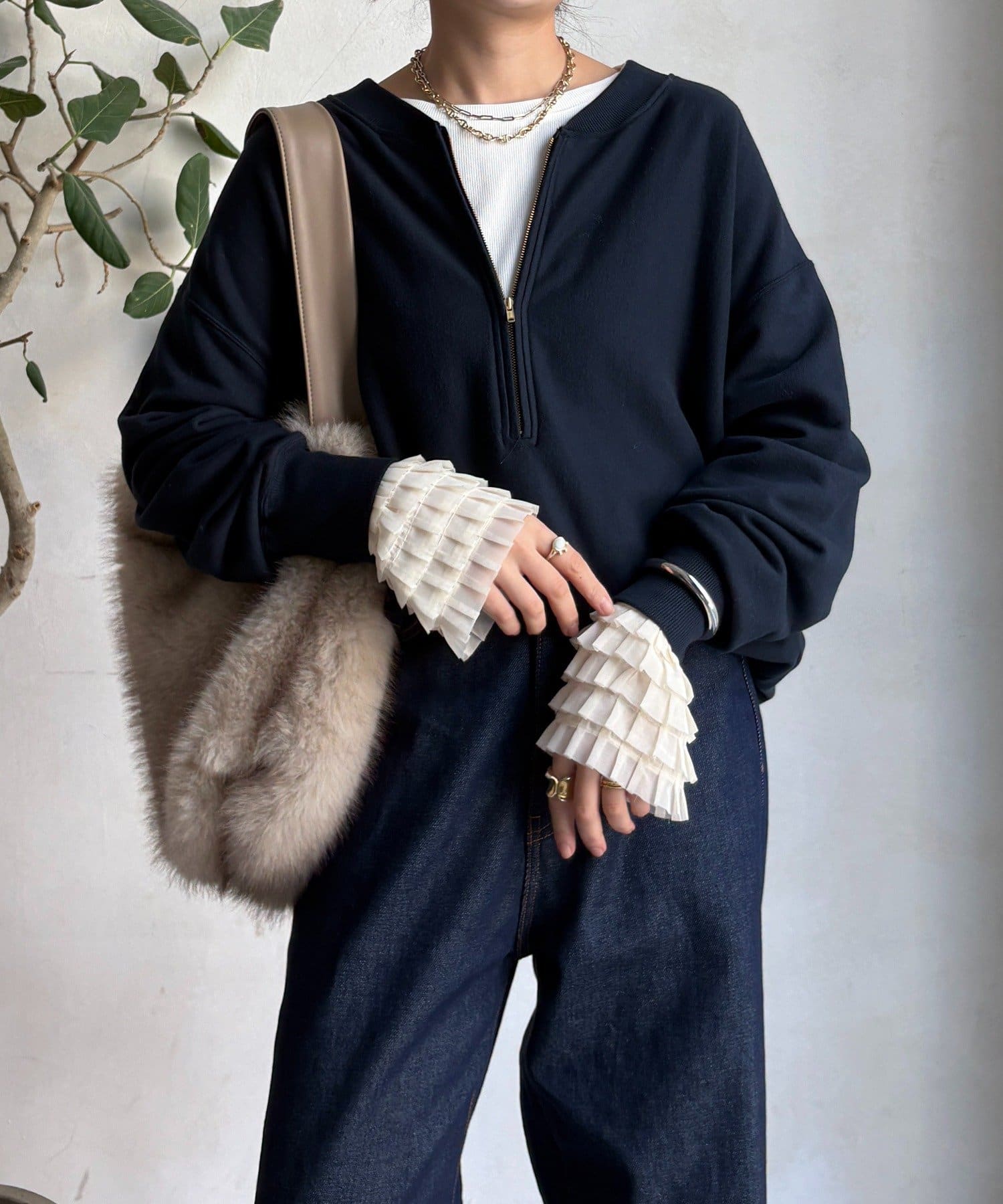 シンプルなシルエットながらも、袖口にあしらわれたフリルが、ワンランク上の着こなしに。