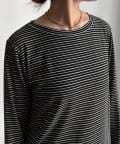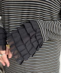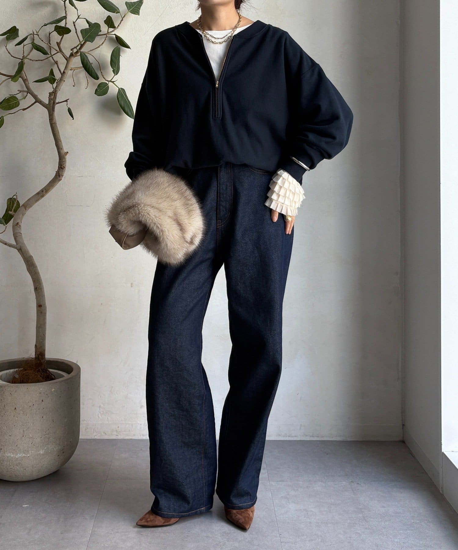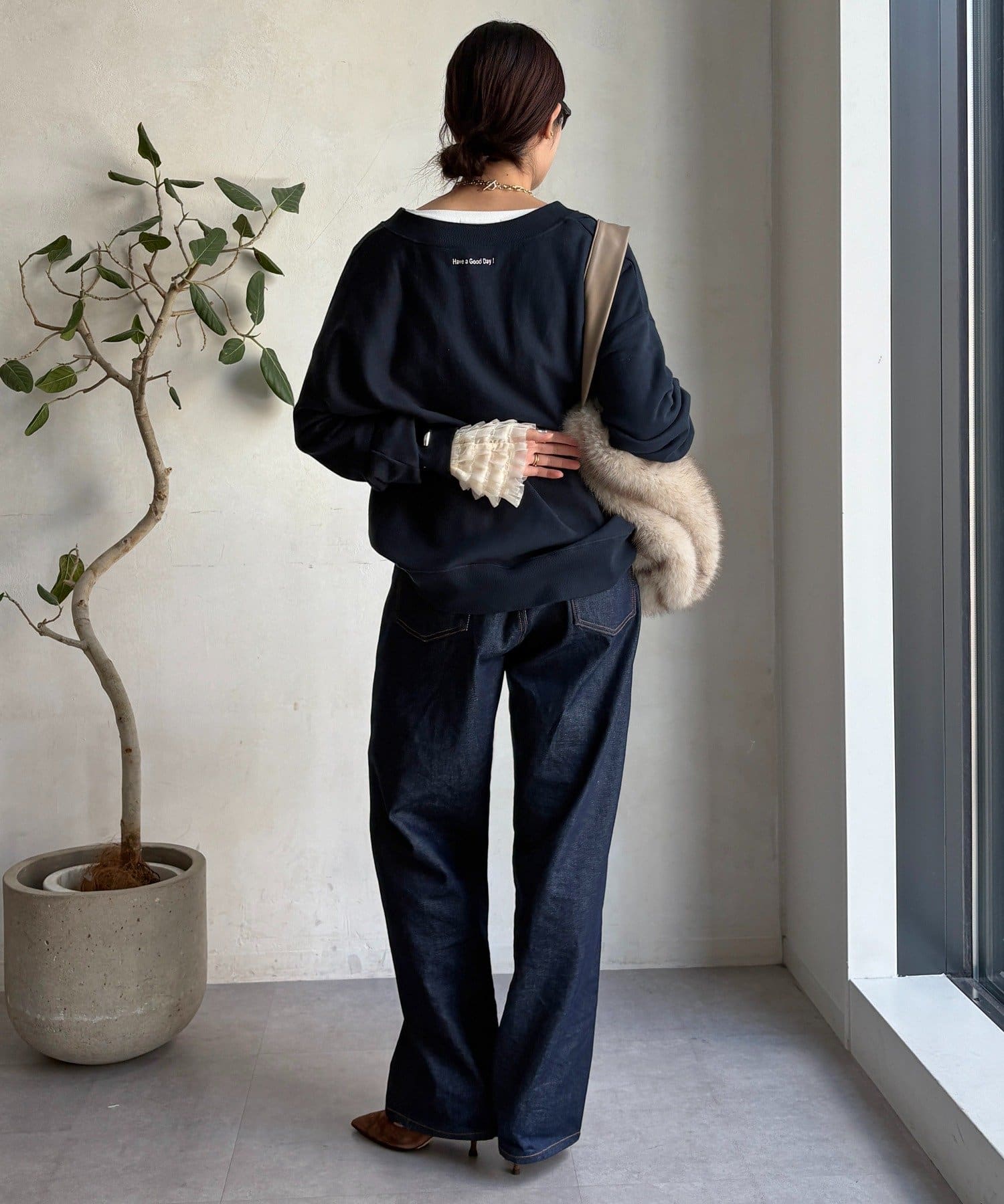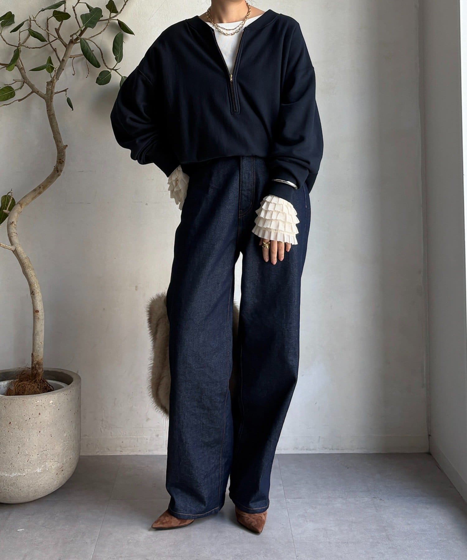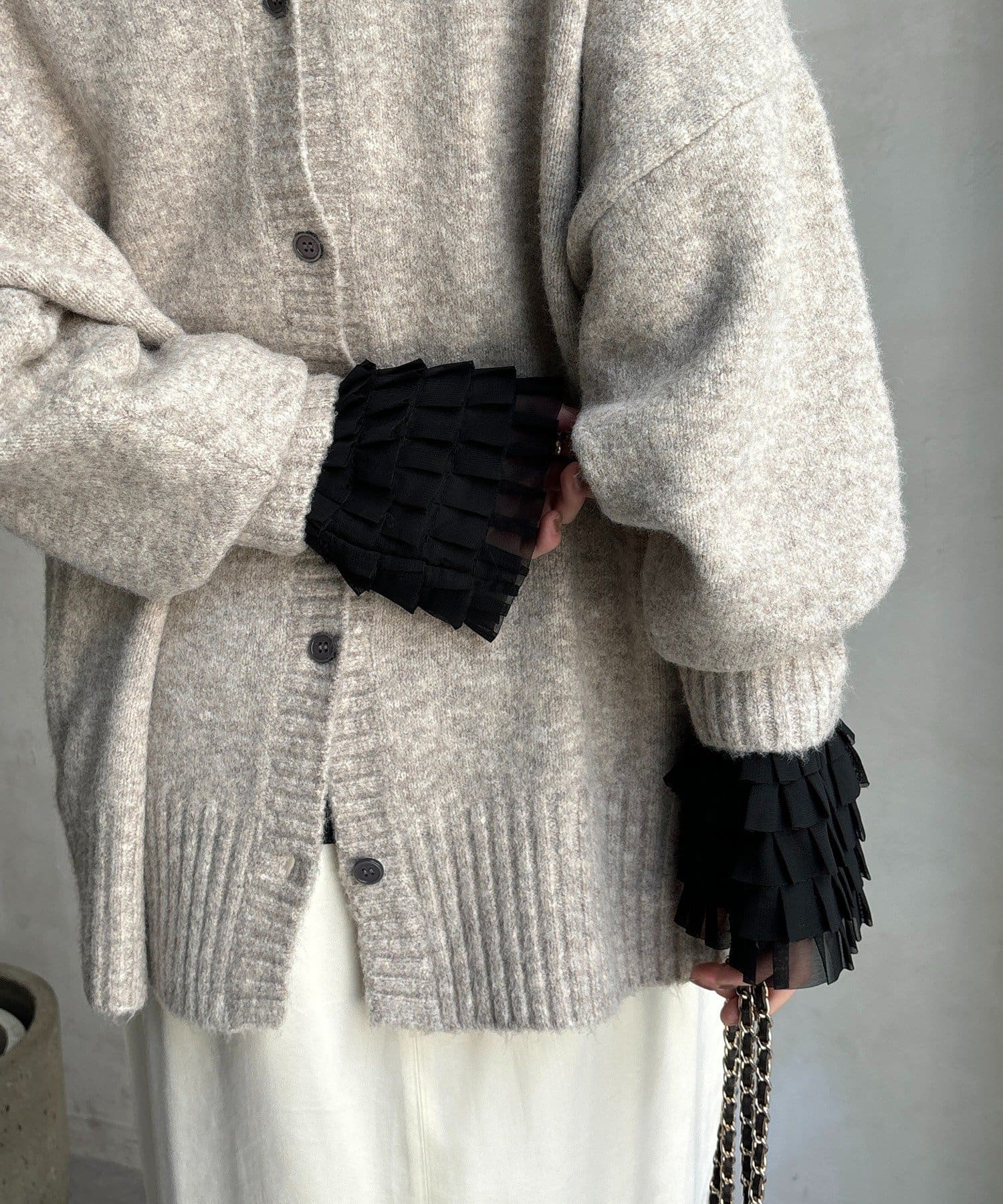 シンプルなシルエットながらも、袖口にあしらわれたフリルが、ワンランク上の着こなしに。