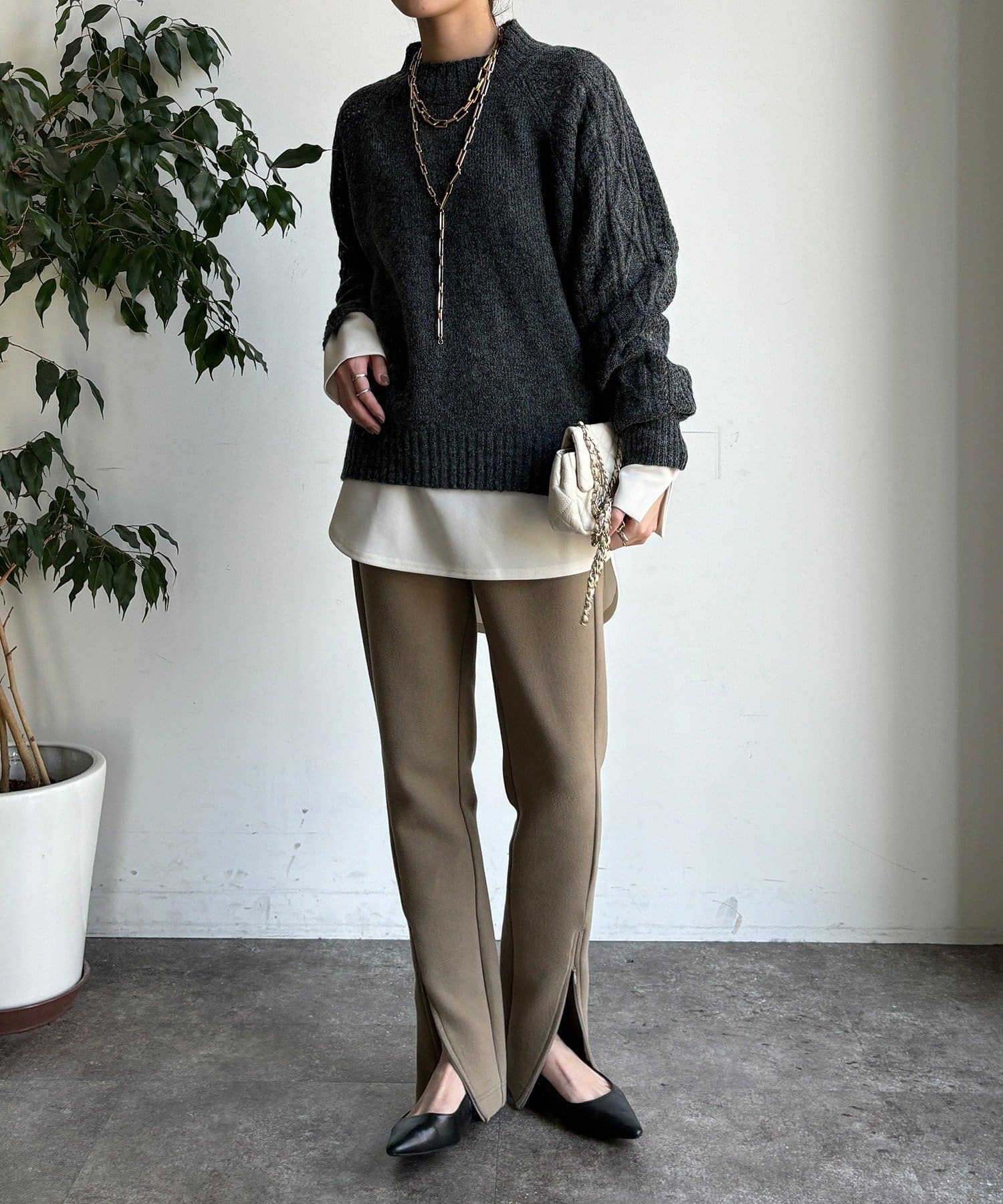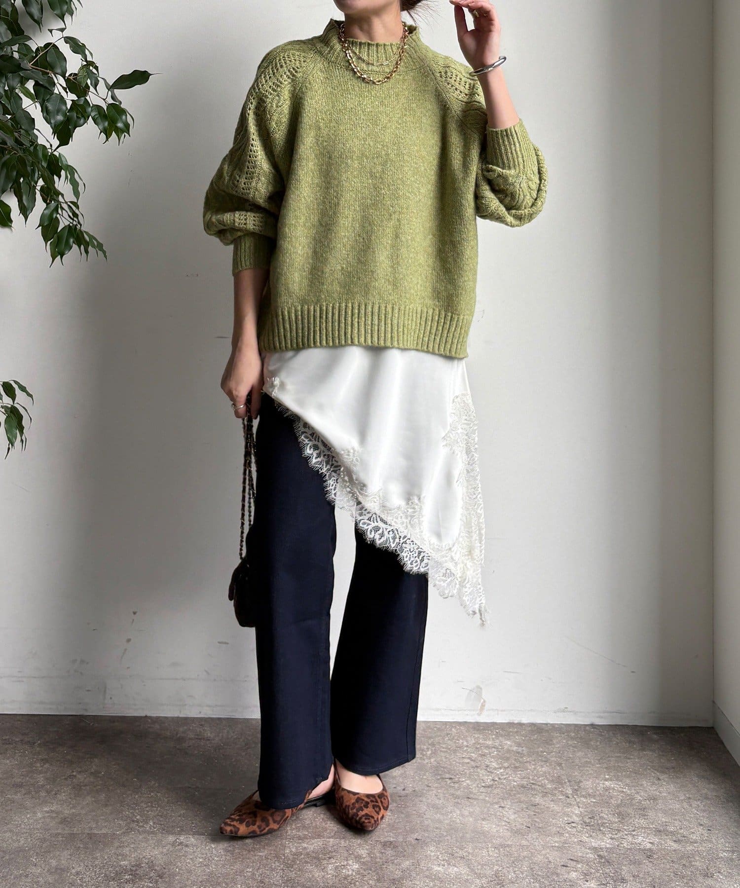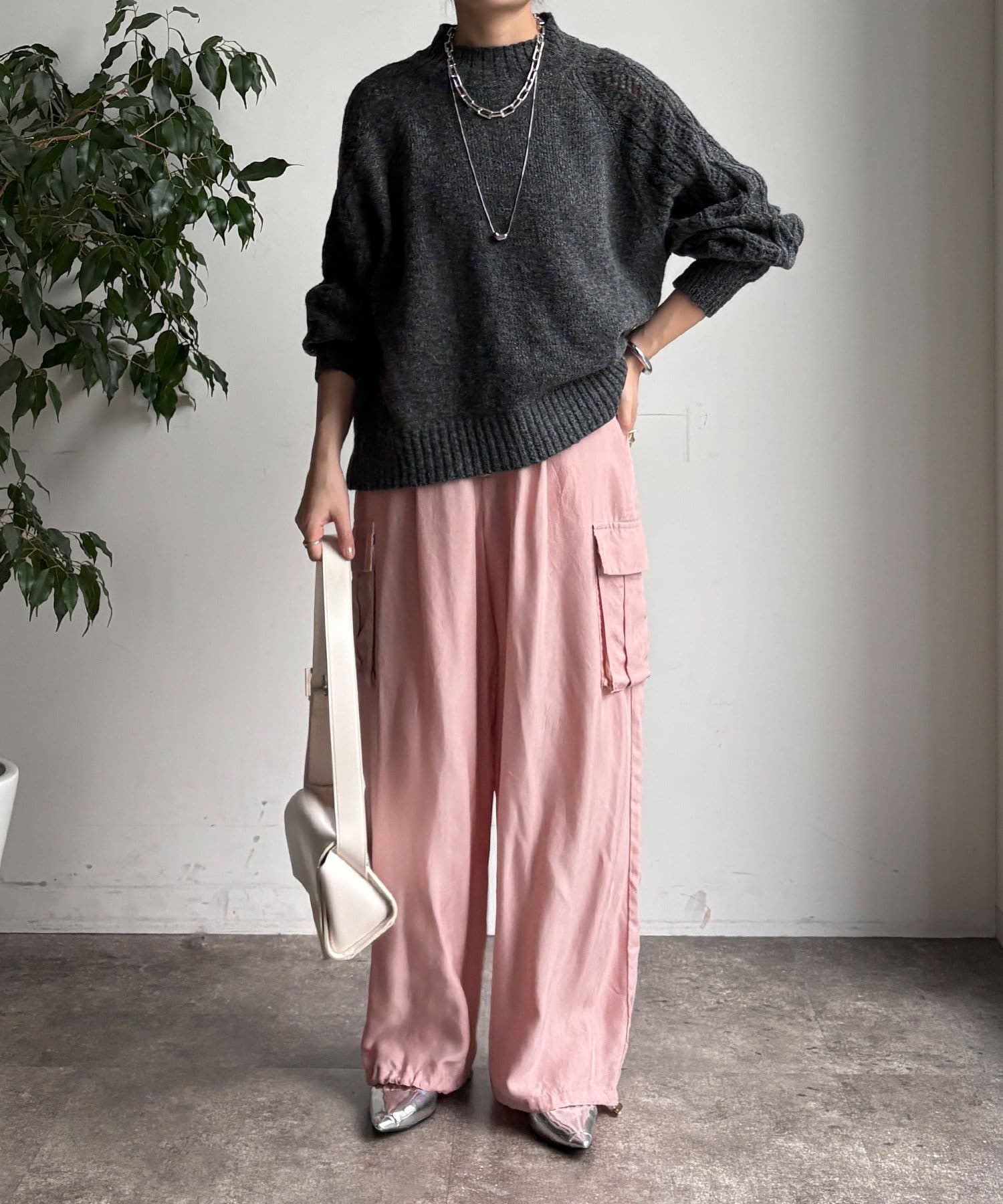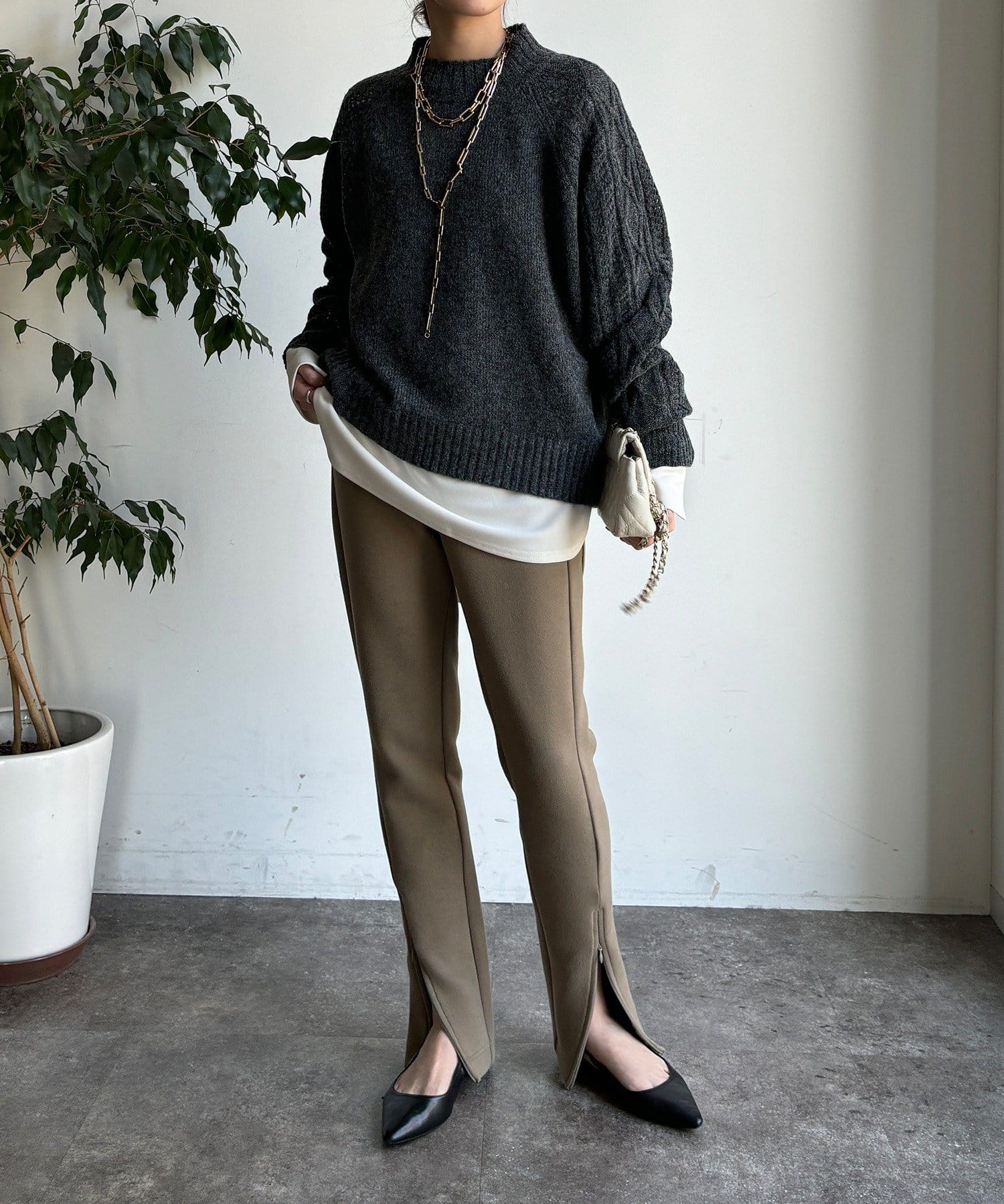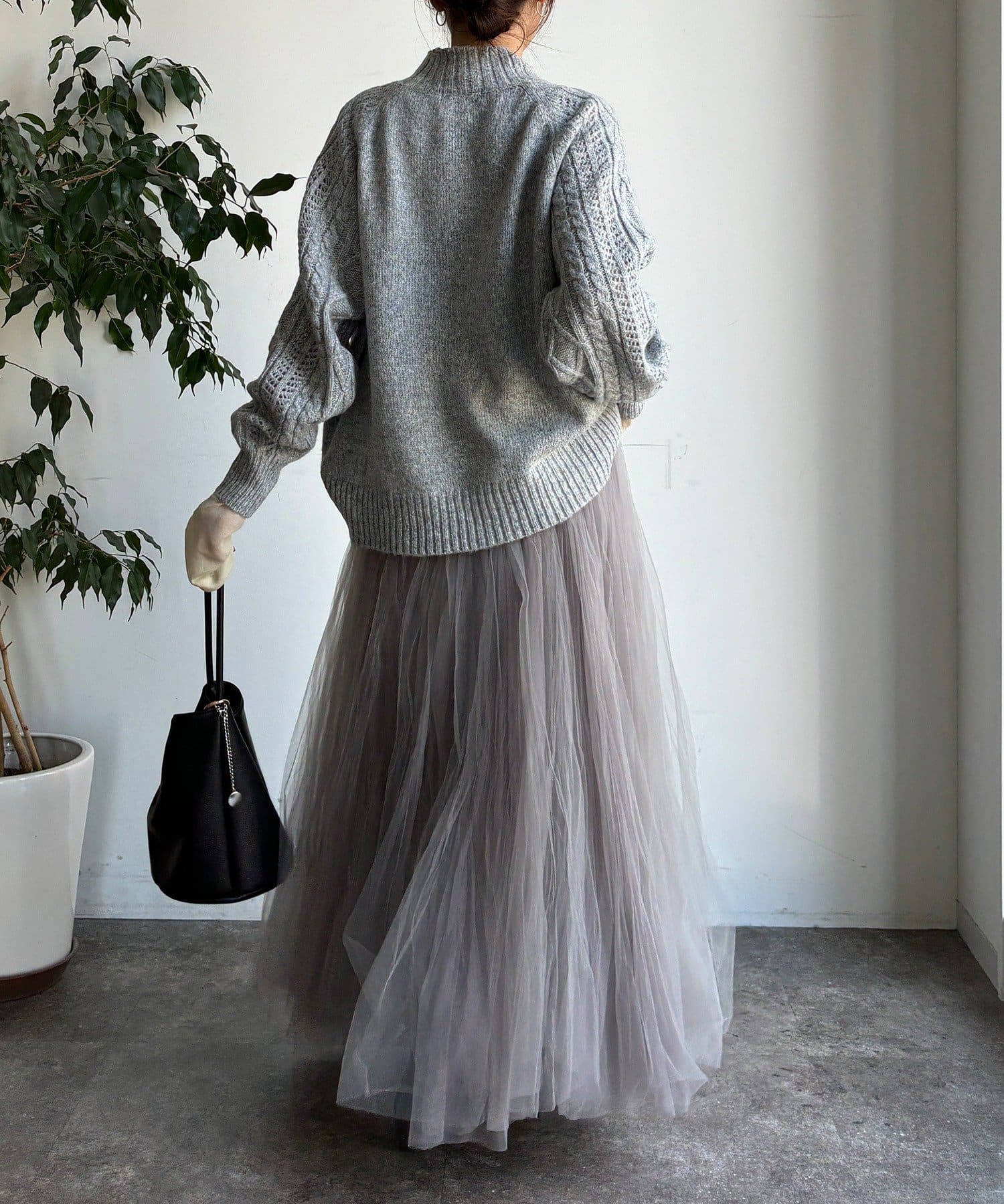 袖に立体感のあるケーブル編みと、程よく抜け感を生む