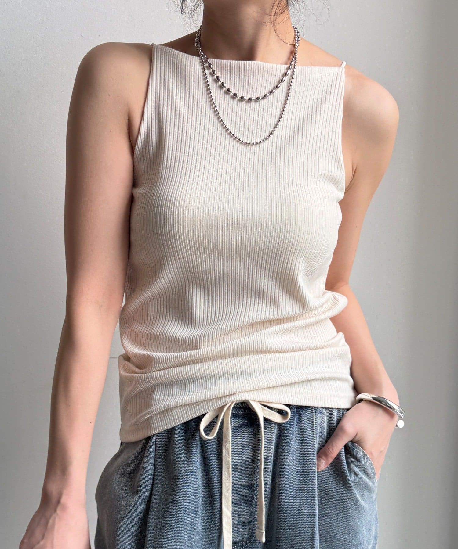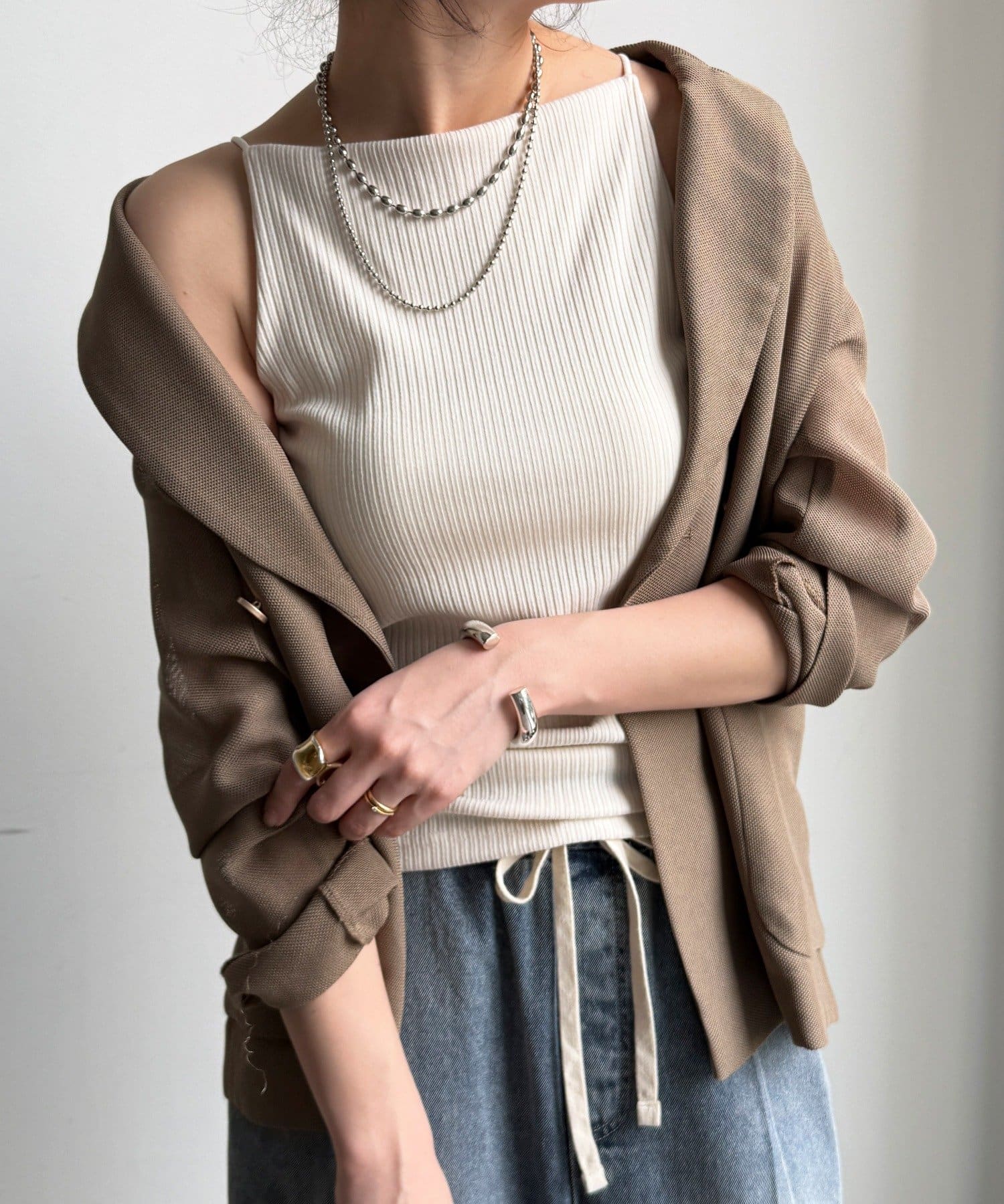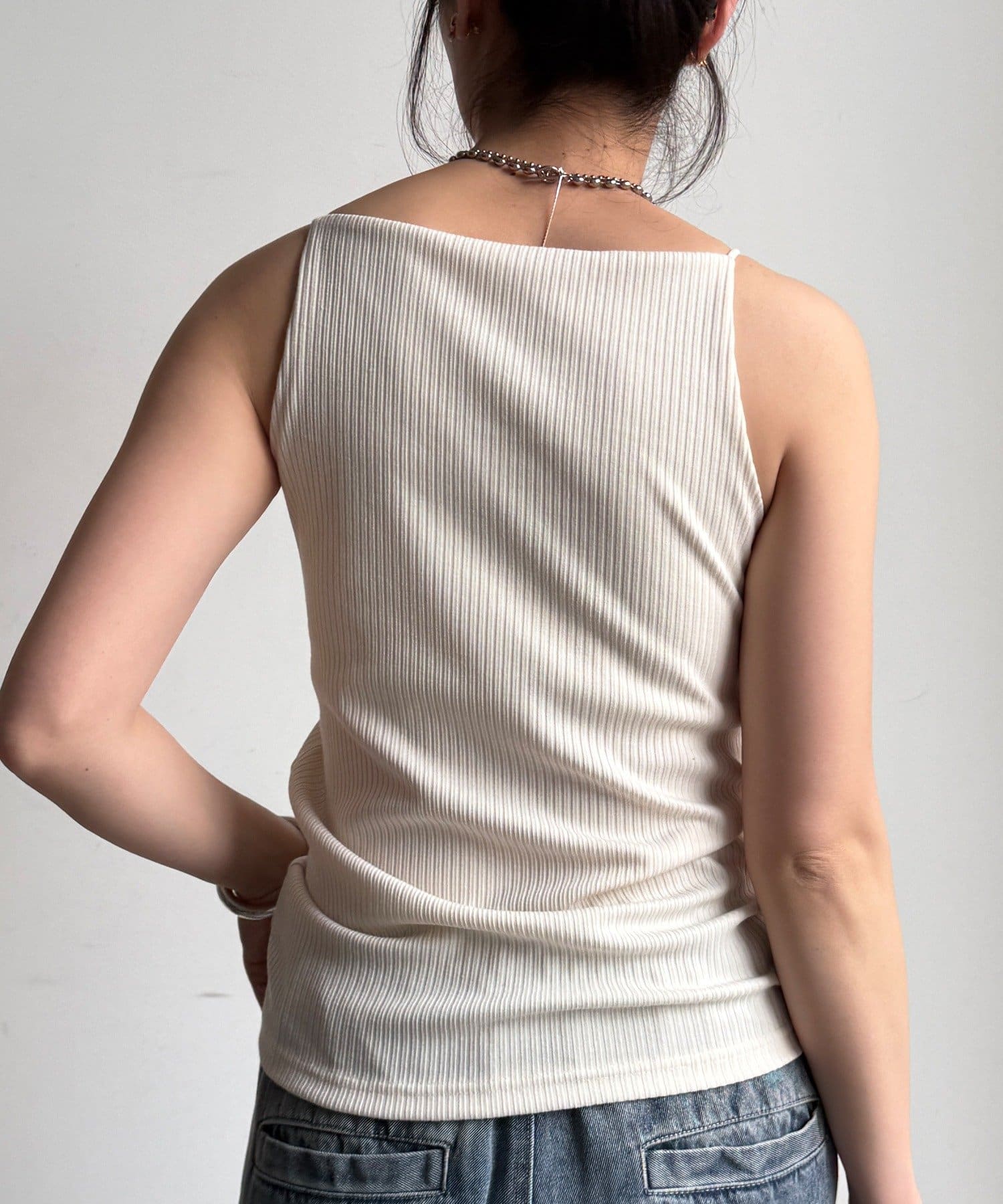 上品なネックライン。首元が開きすぎない頼れるカップ付きキャミ