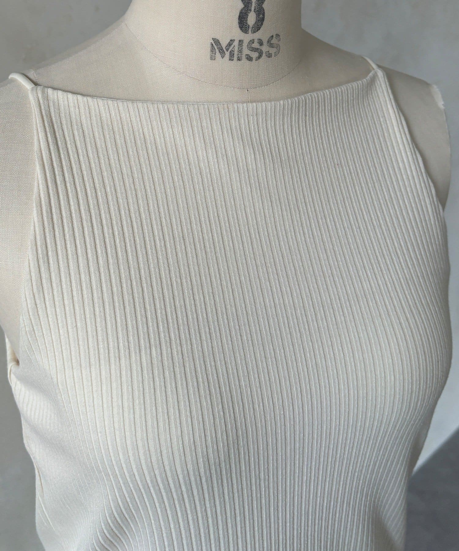 横にまっすぐなネックラインが大人っぽく、開きすぎない上品な印象です。