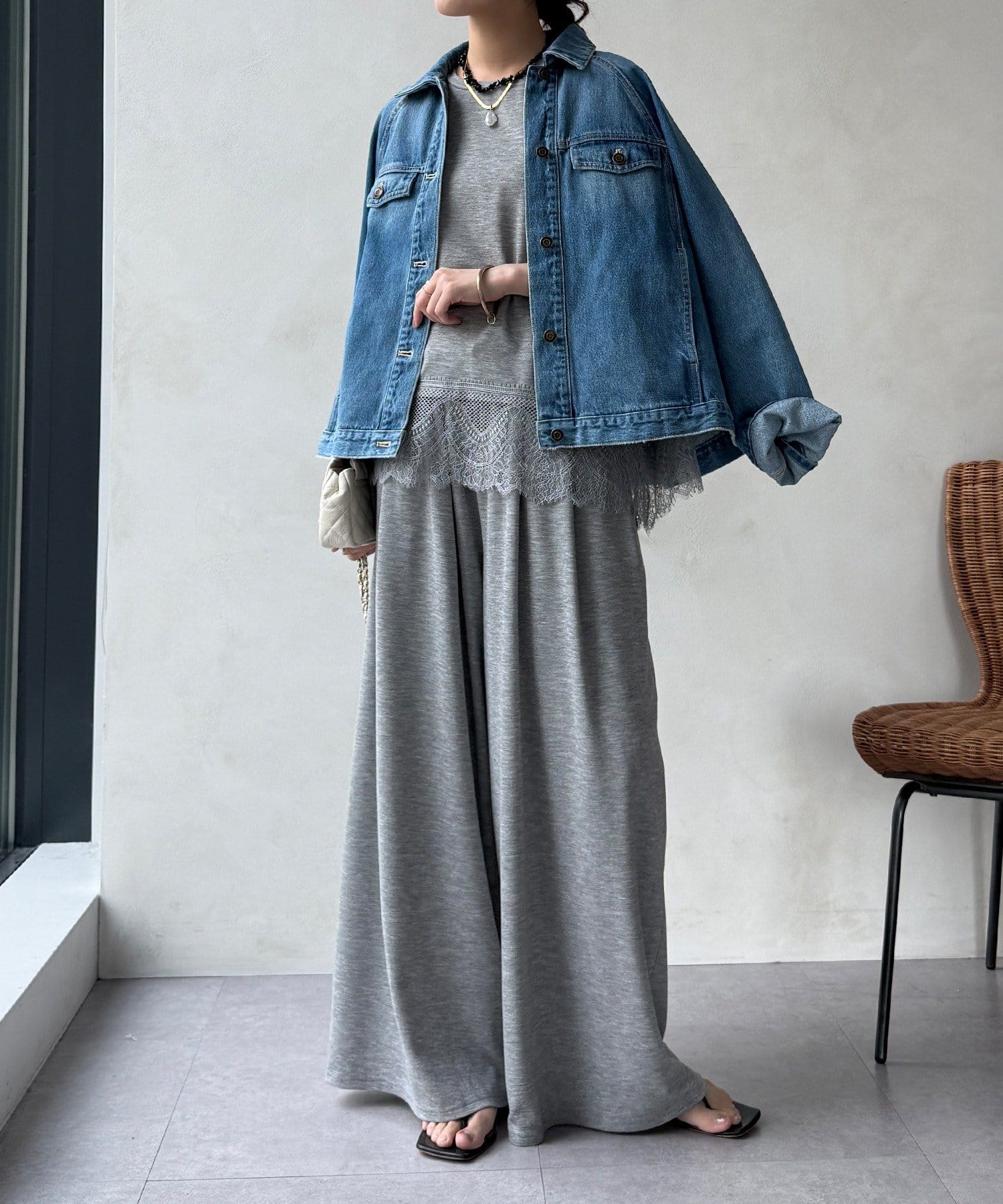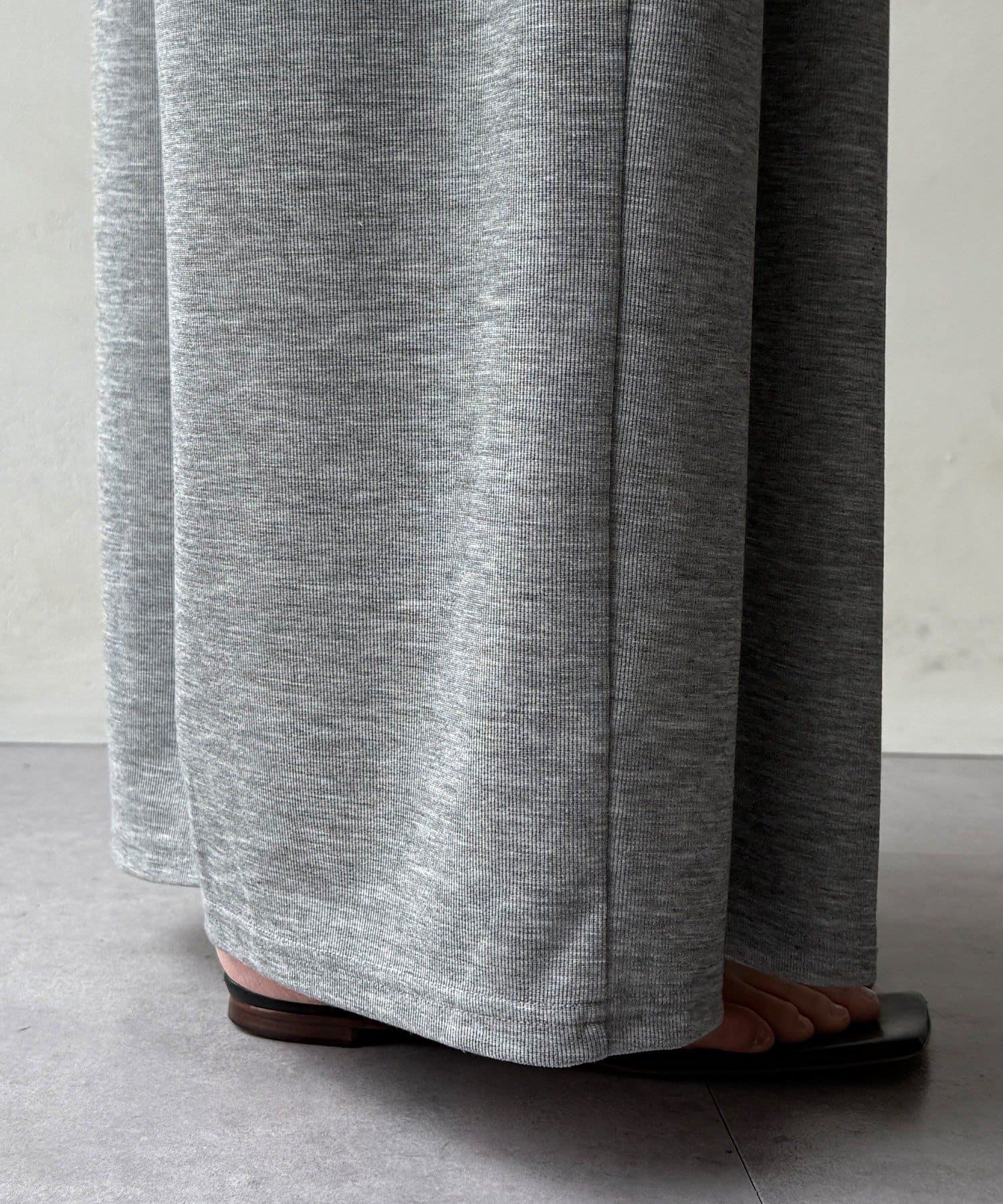 すとんと落ちるシルエットが脚のラインをカバーしつつも、こなれた印象を演出します。