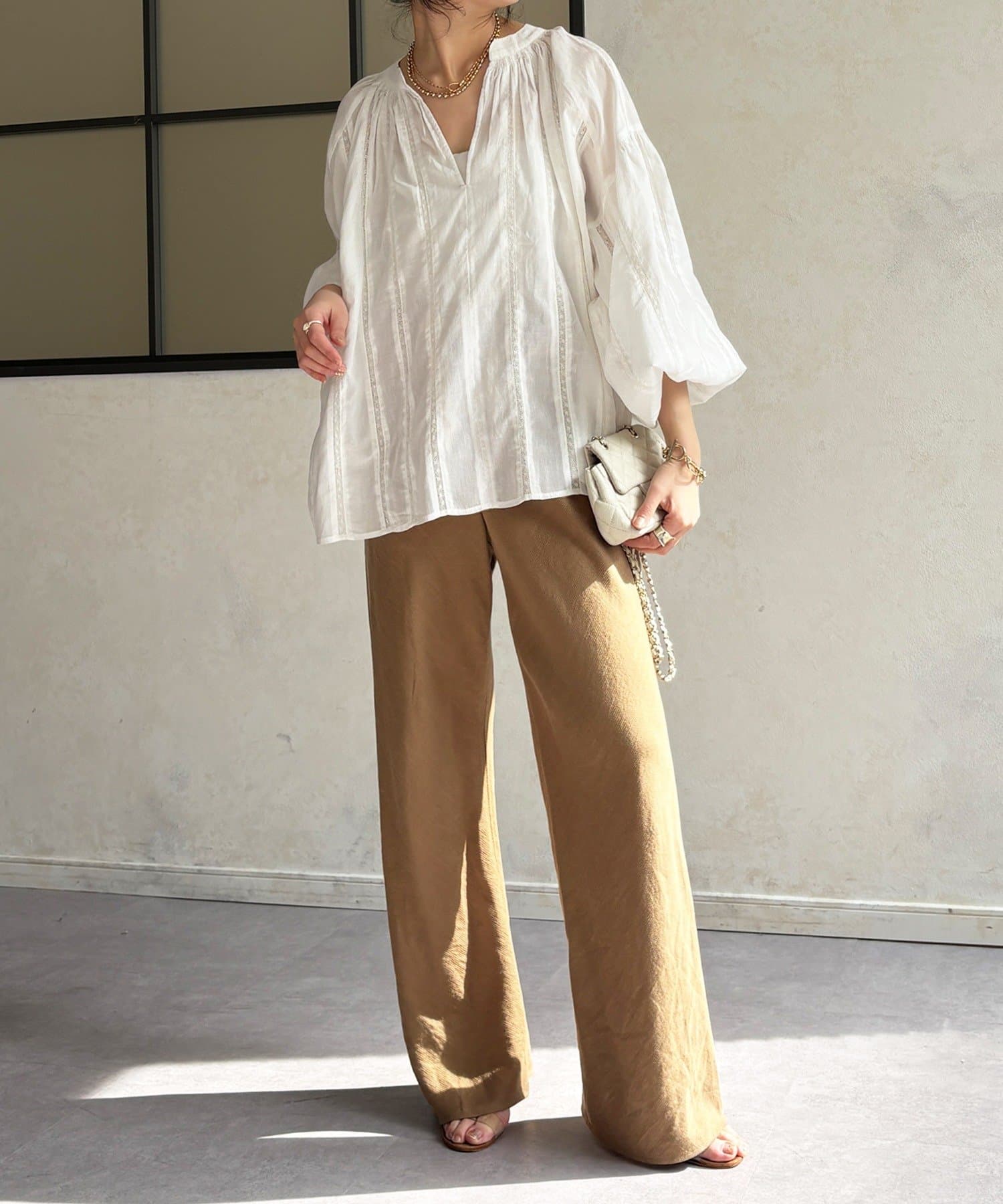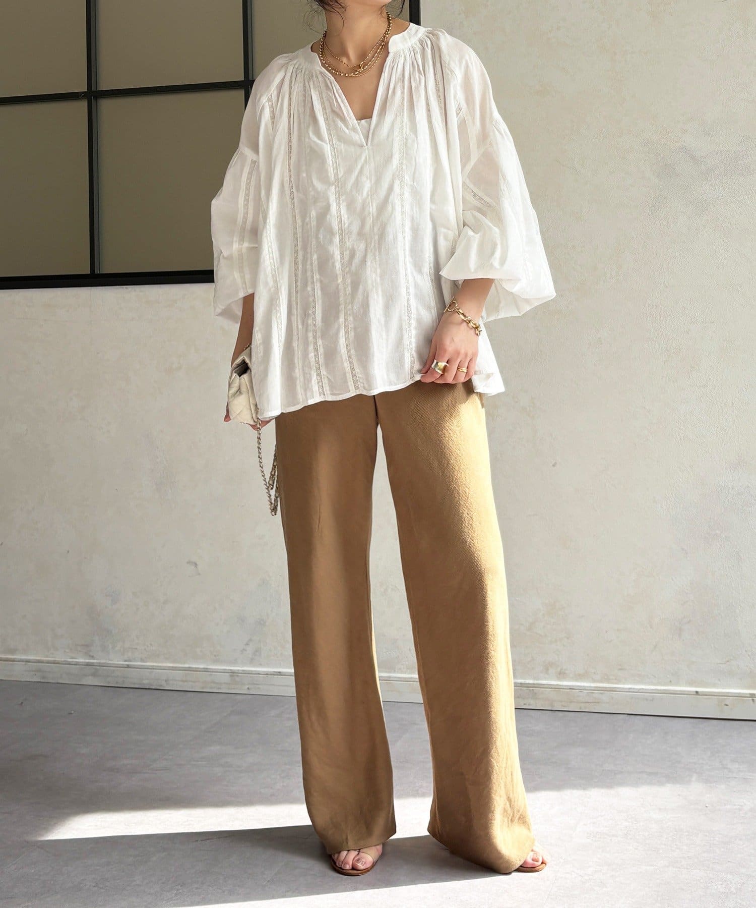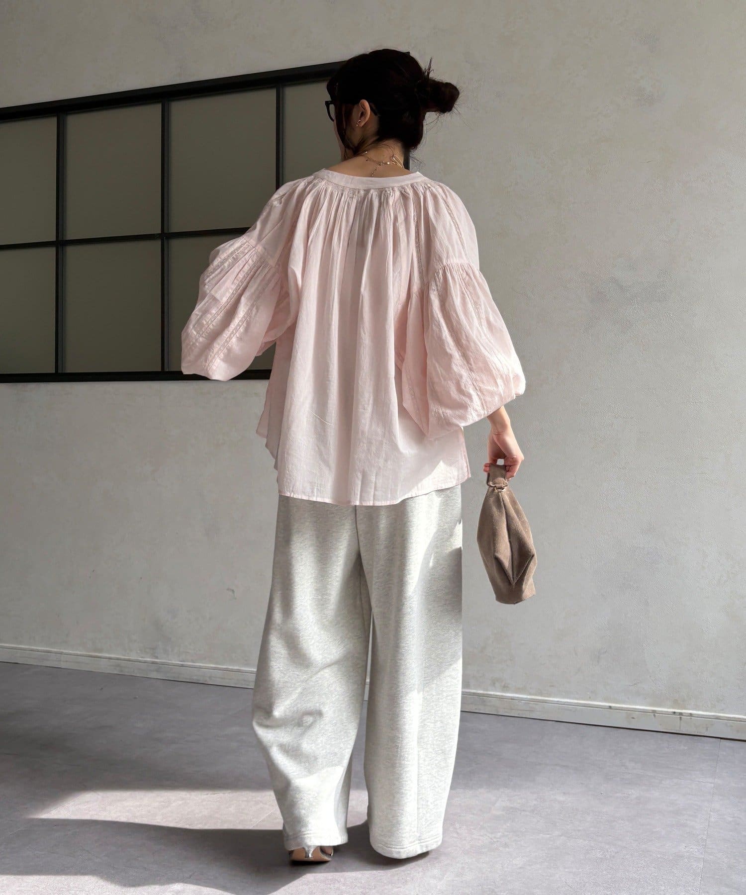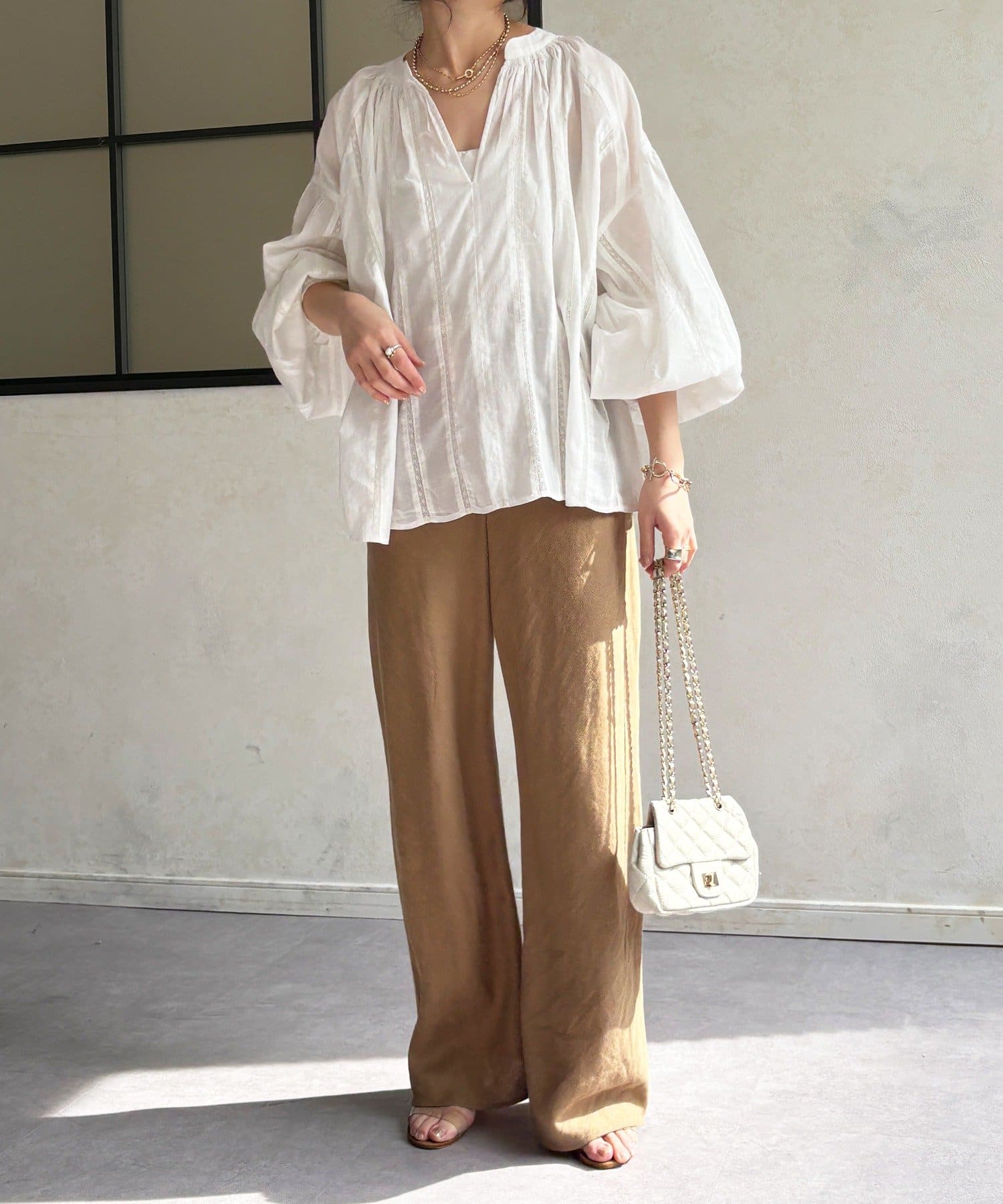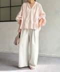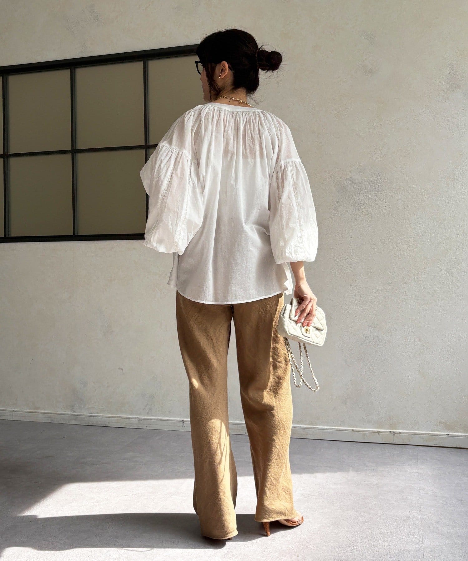 ナチュラルな風合いと、ふんわりとしたボリューム袖が女性らしくやわらかな印象を演出します。