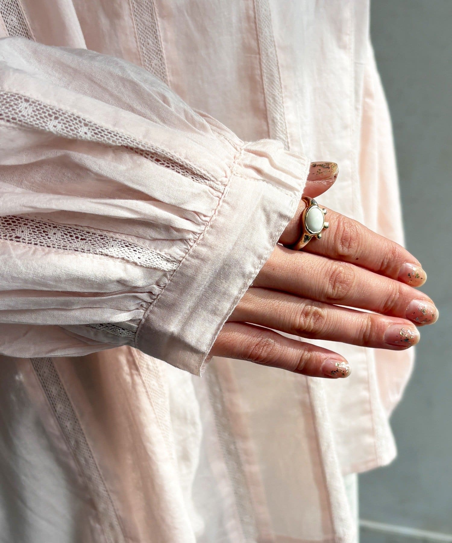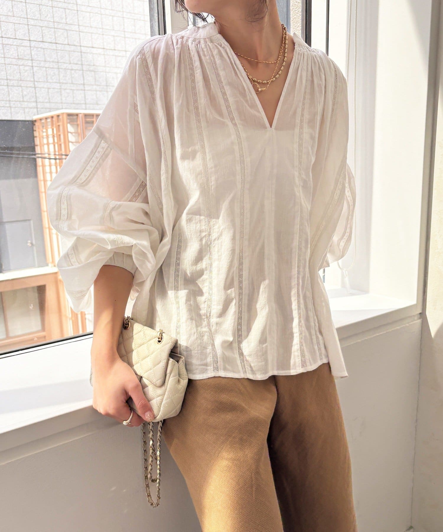 柔らかな綿素材にレースを施したスキッパーブラウス。