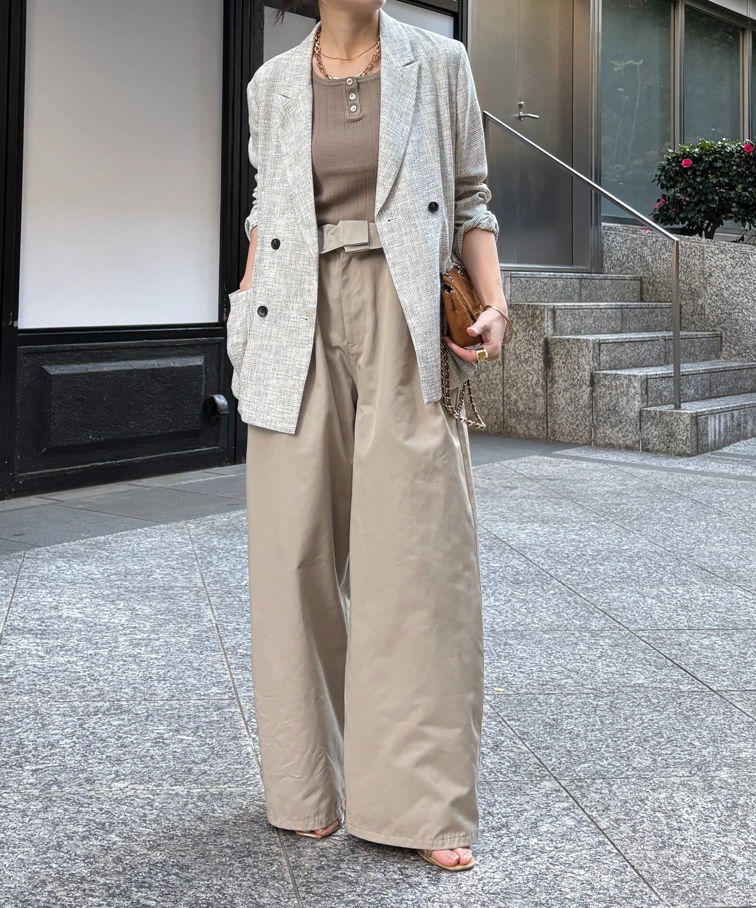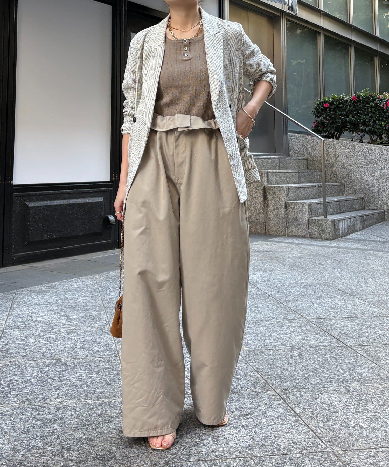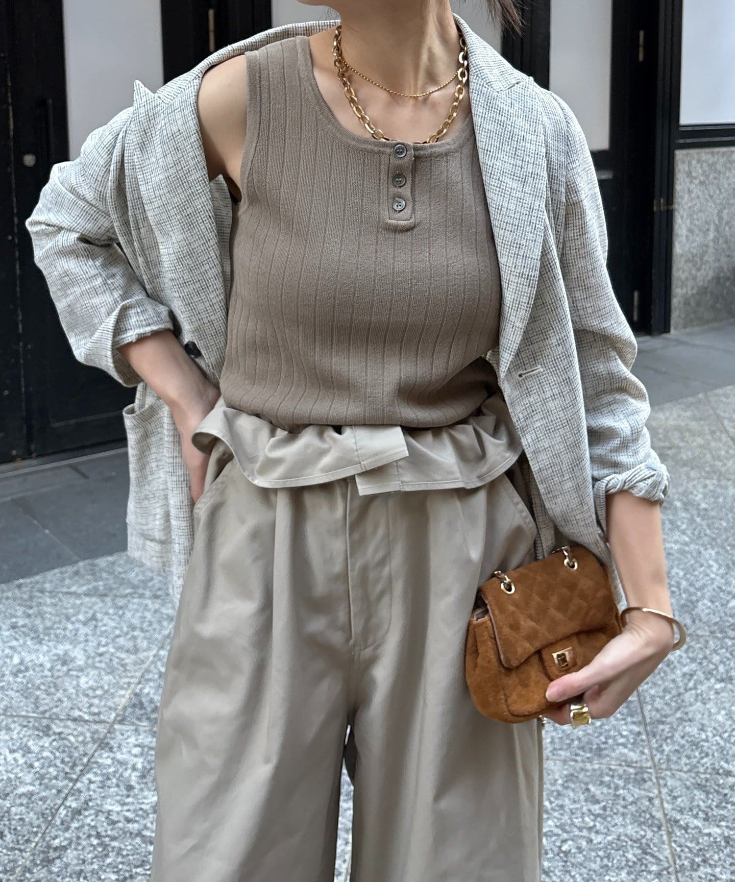 ヘンリーネックデザインは、首元をすっきり見せながらも女性らしさを演出。