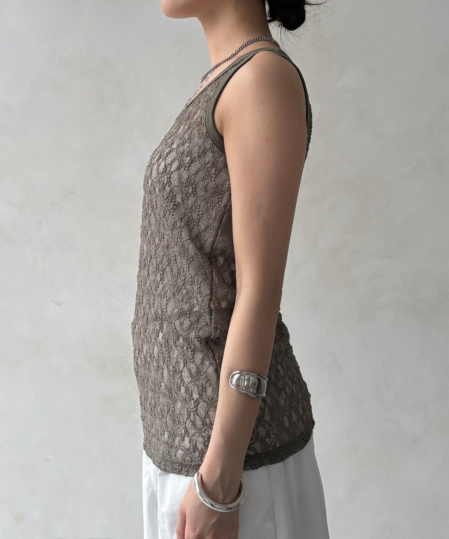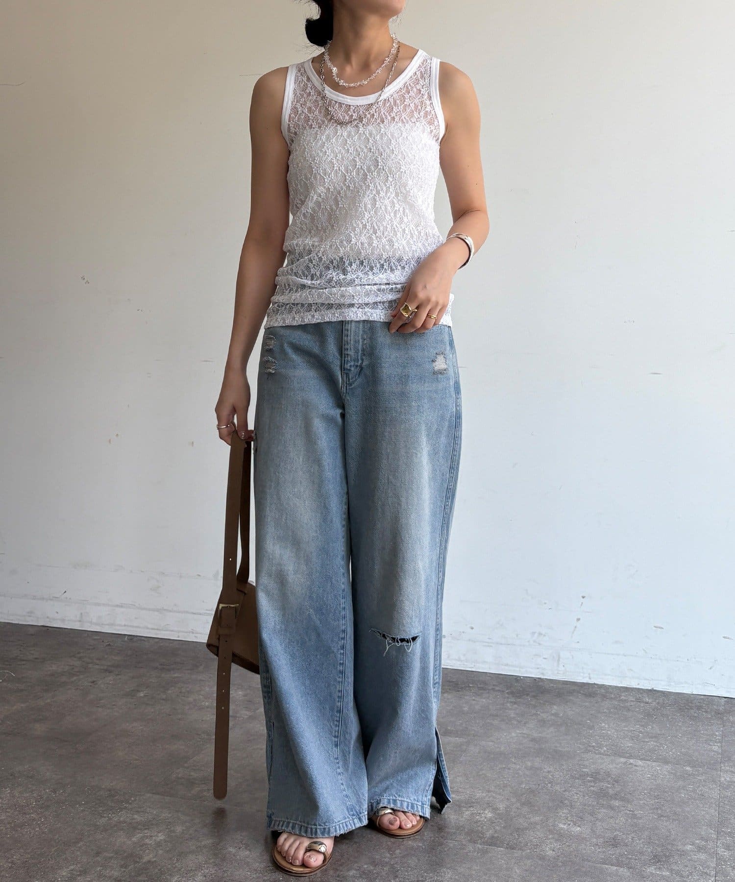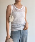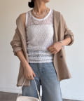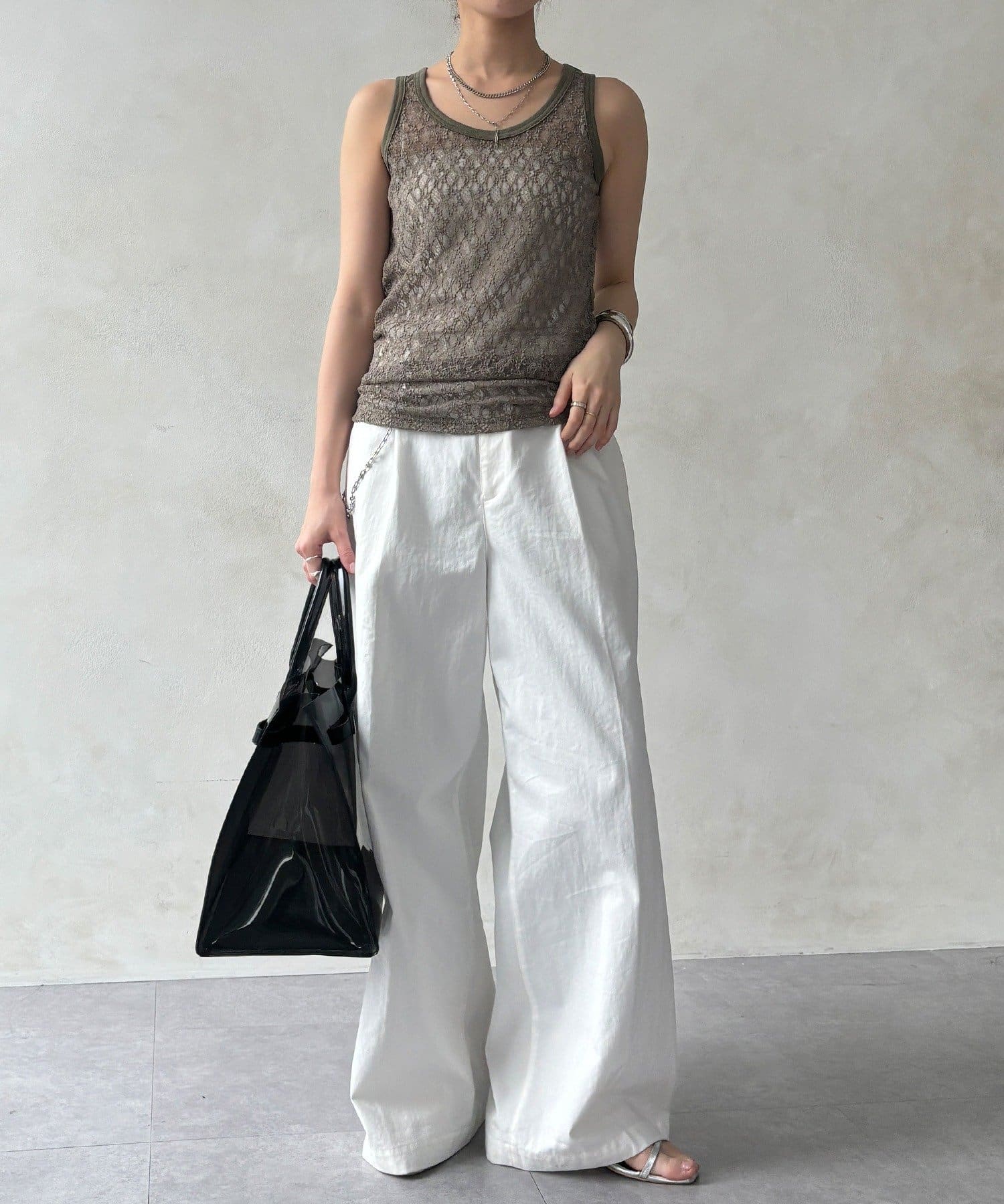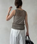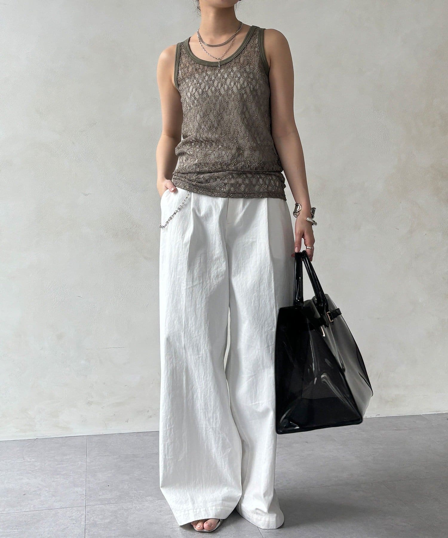 上品なカジュアル感が洗練された印象に。大人の透け感タンク