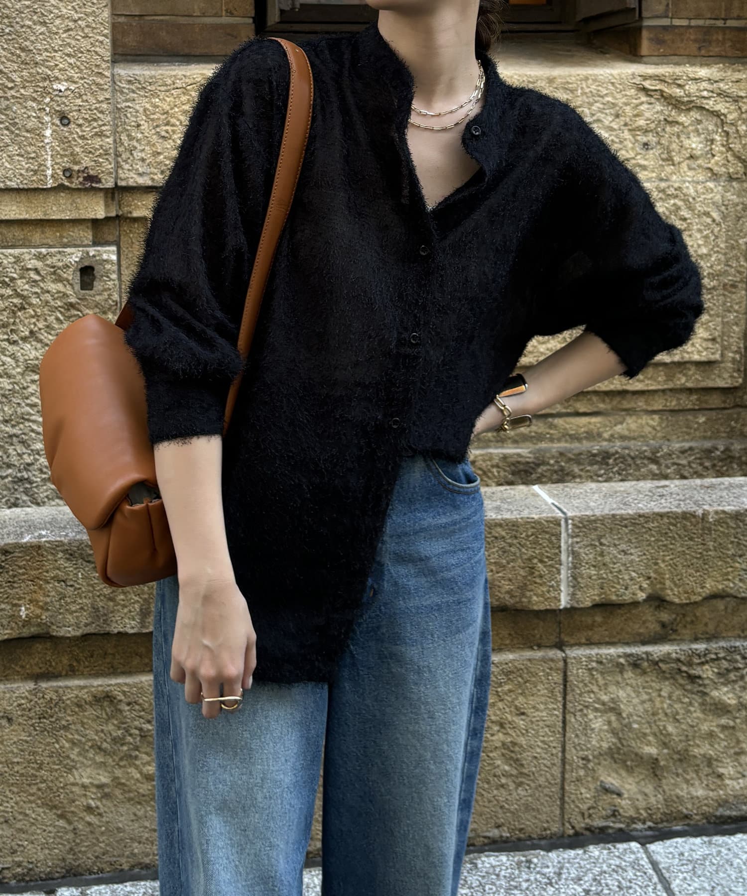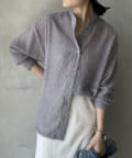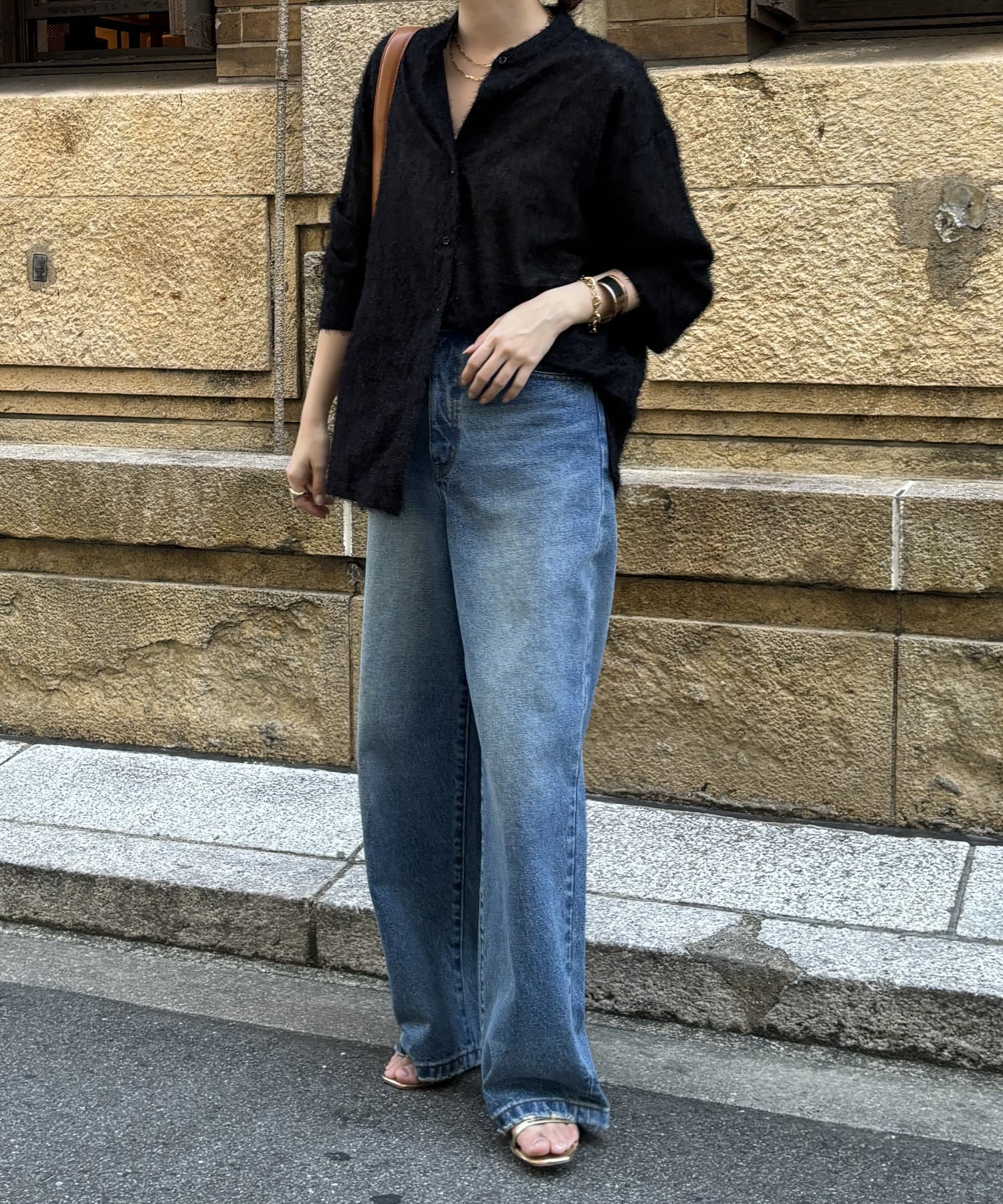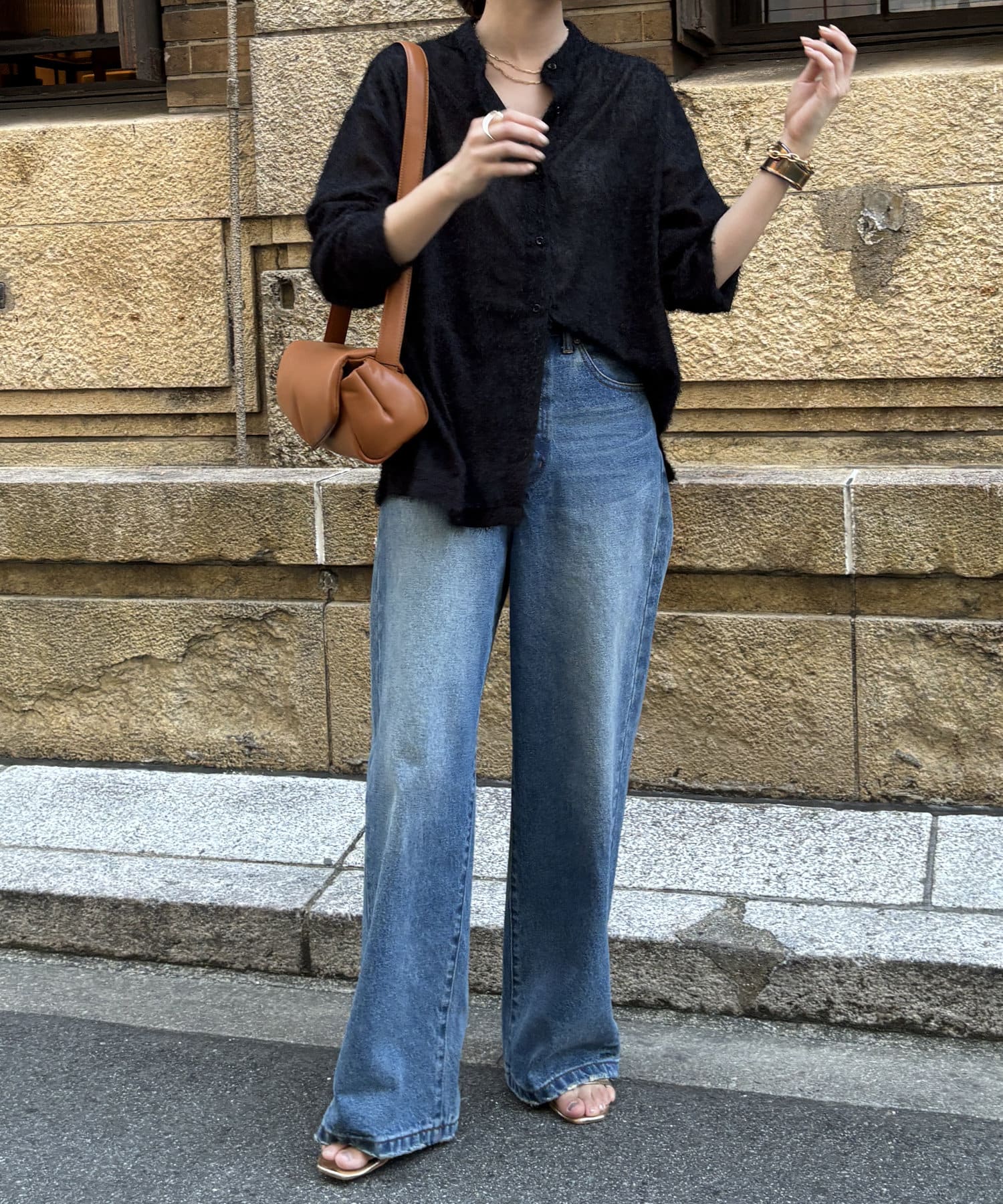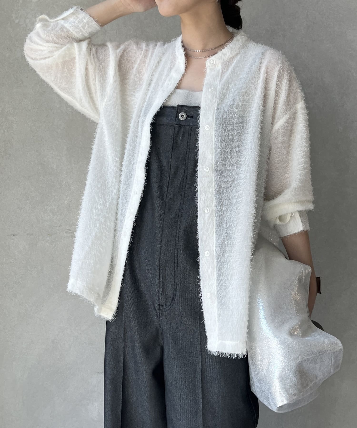 ノーカラー襟が上品な女性らしさをプラスしてくれ、いつものスタイルにマッチ!