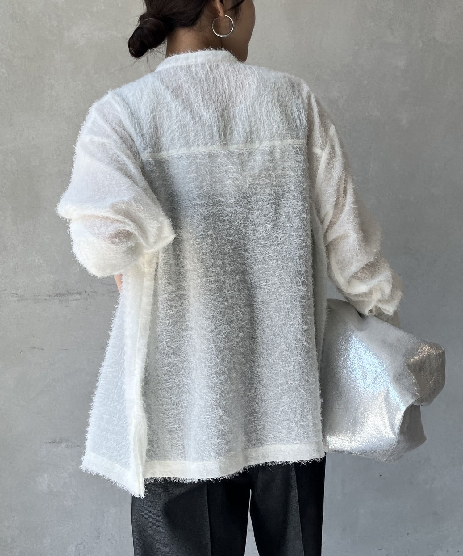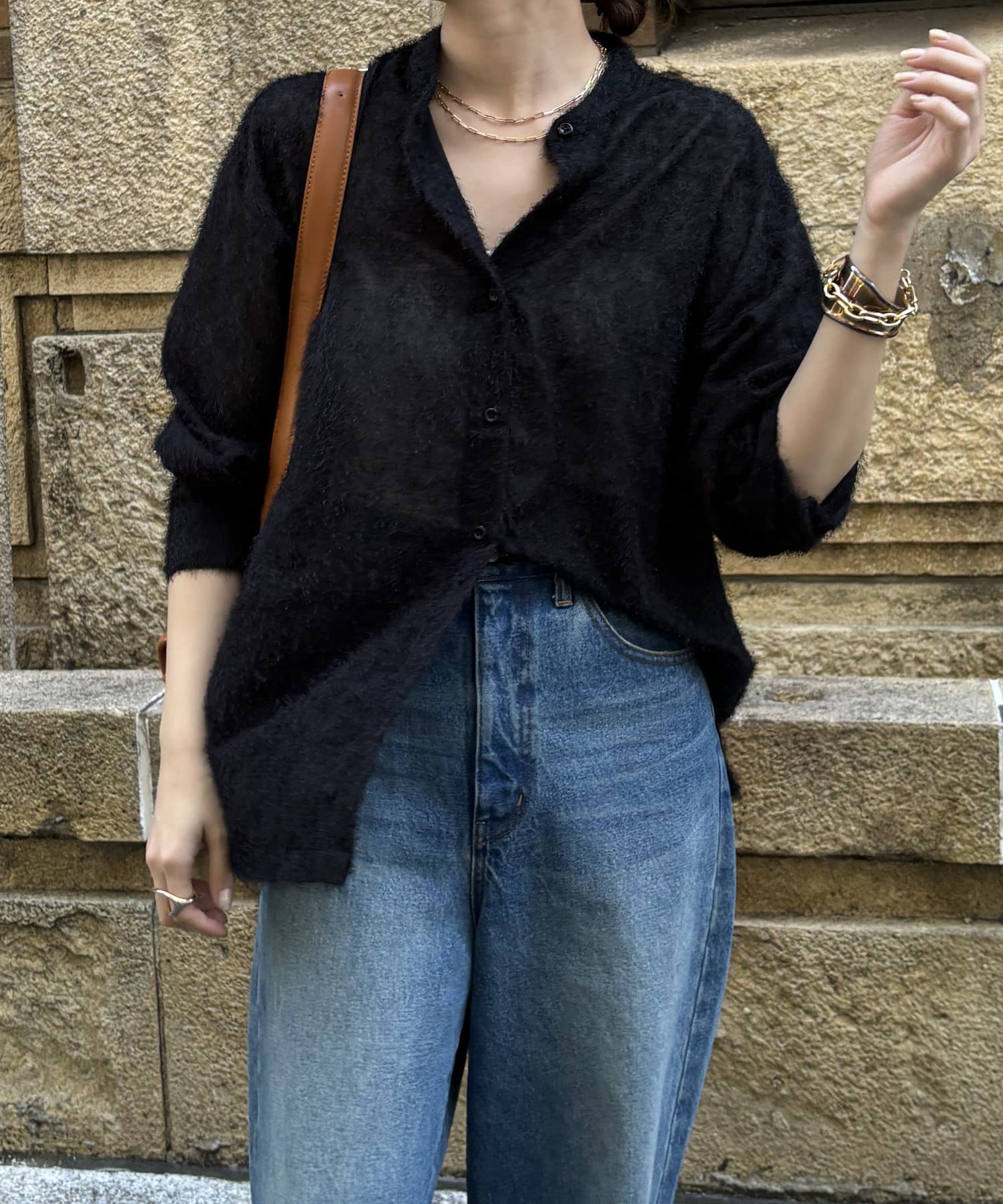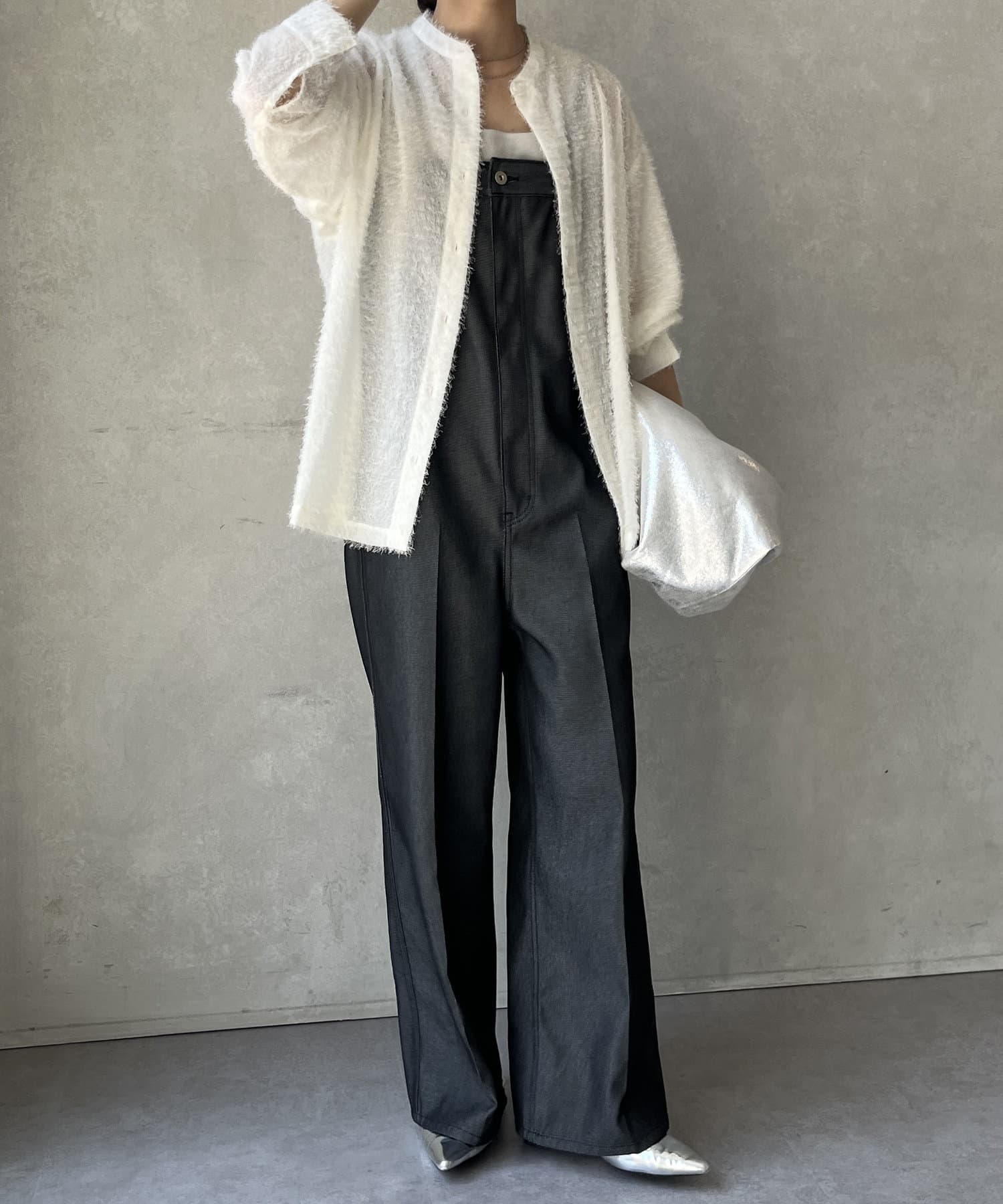 ノーカラー襟が上品な女性らしさをプラスしてくれ、いつものスタイルにマッチ!
