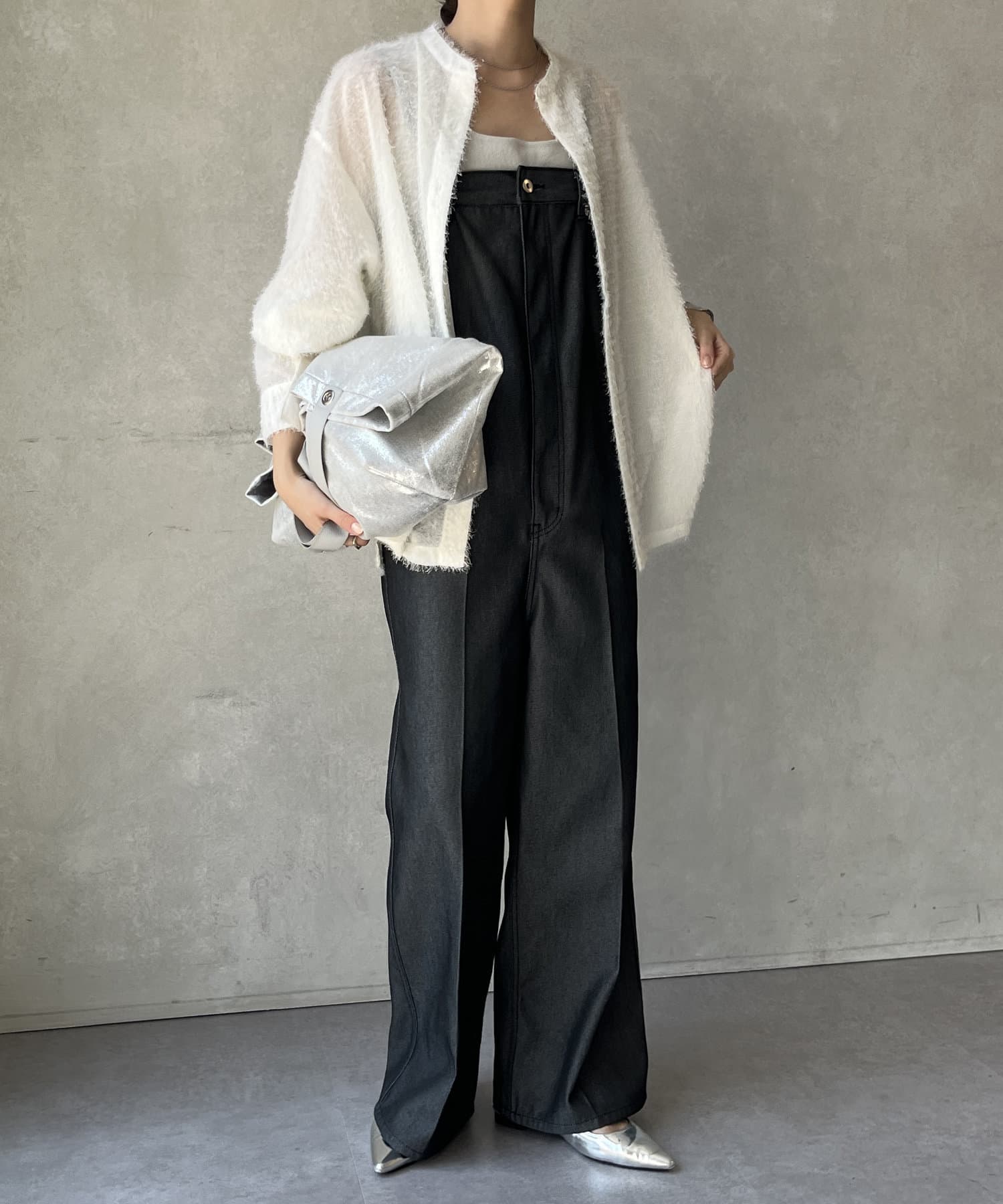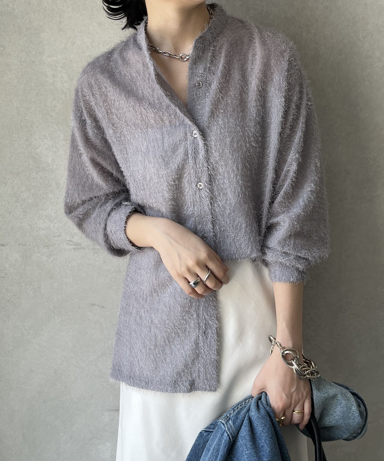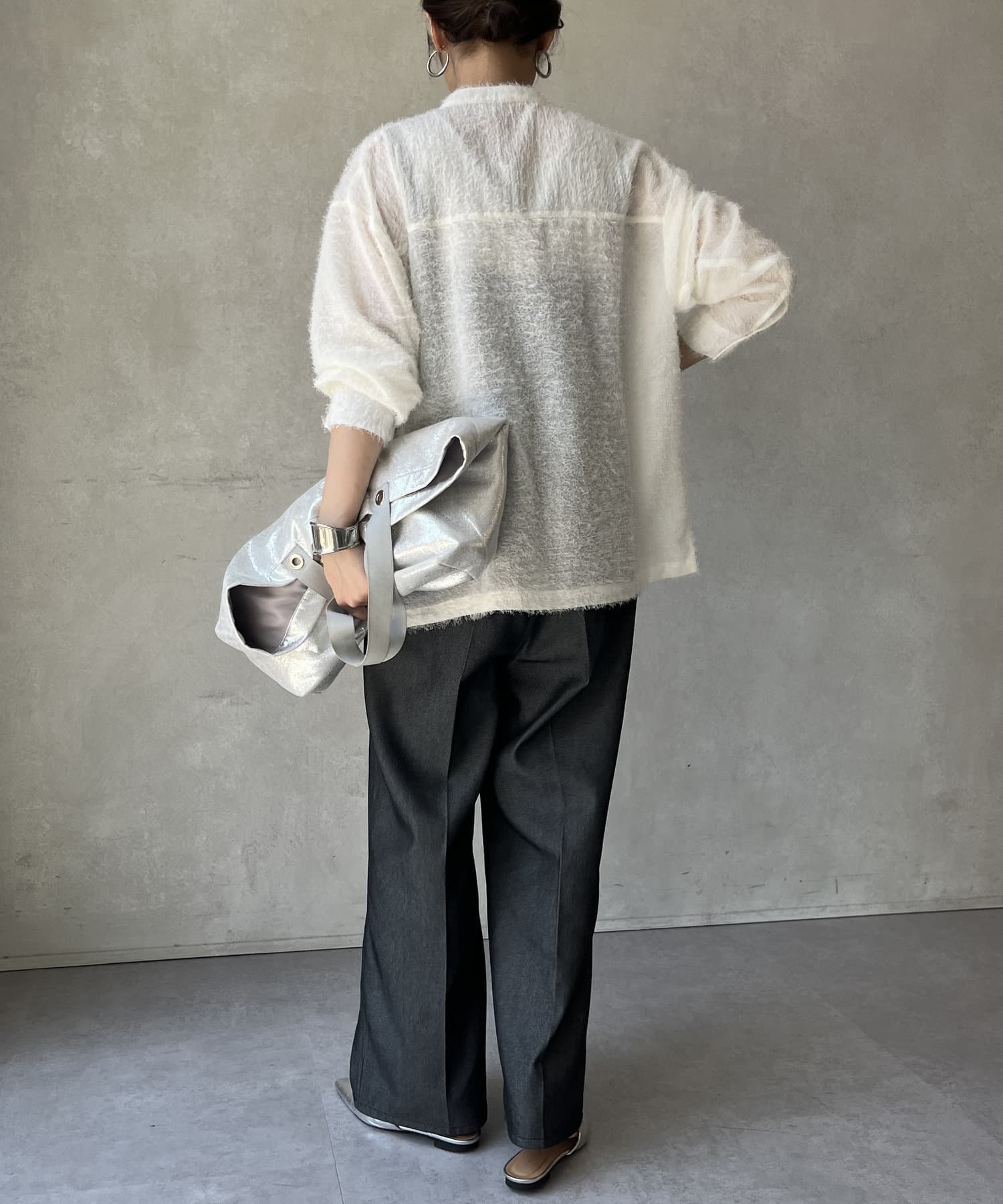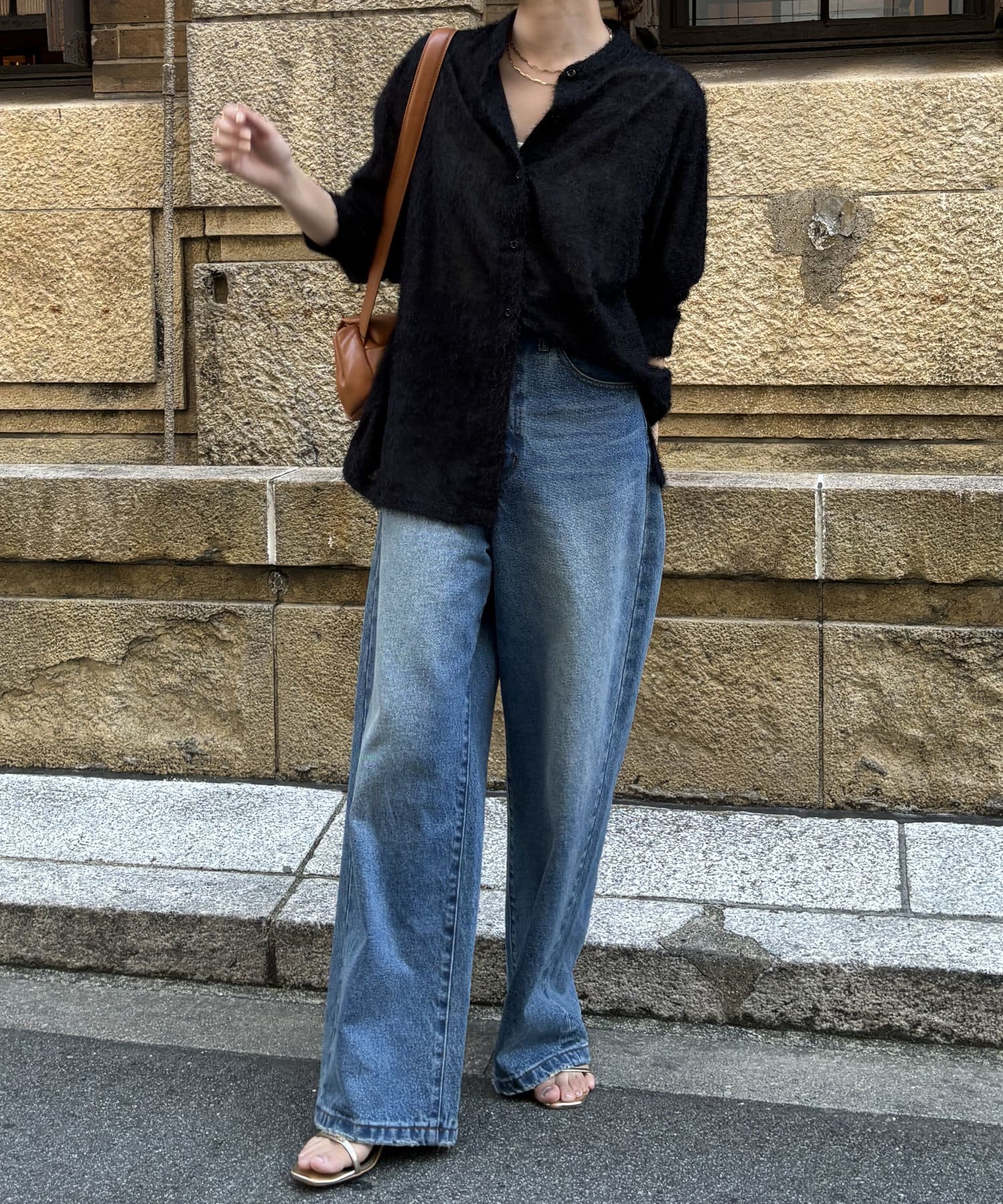ノーカラー襟が上品な女性らしさをプラスしてくれ、いつものスタイルにマッチ!