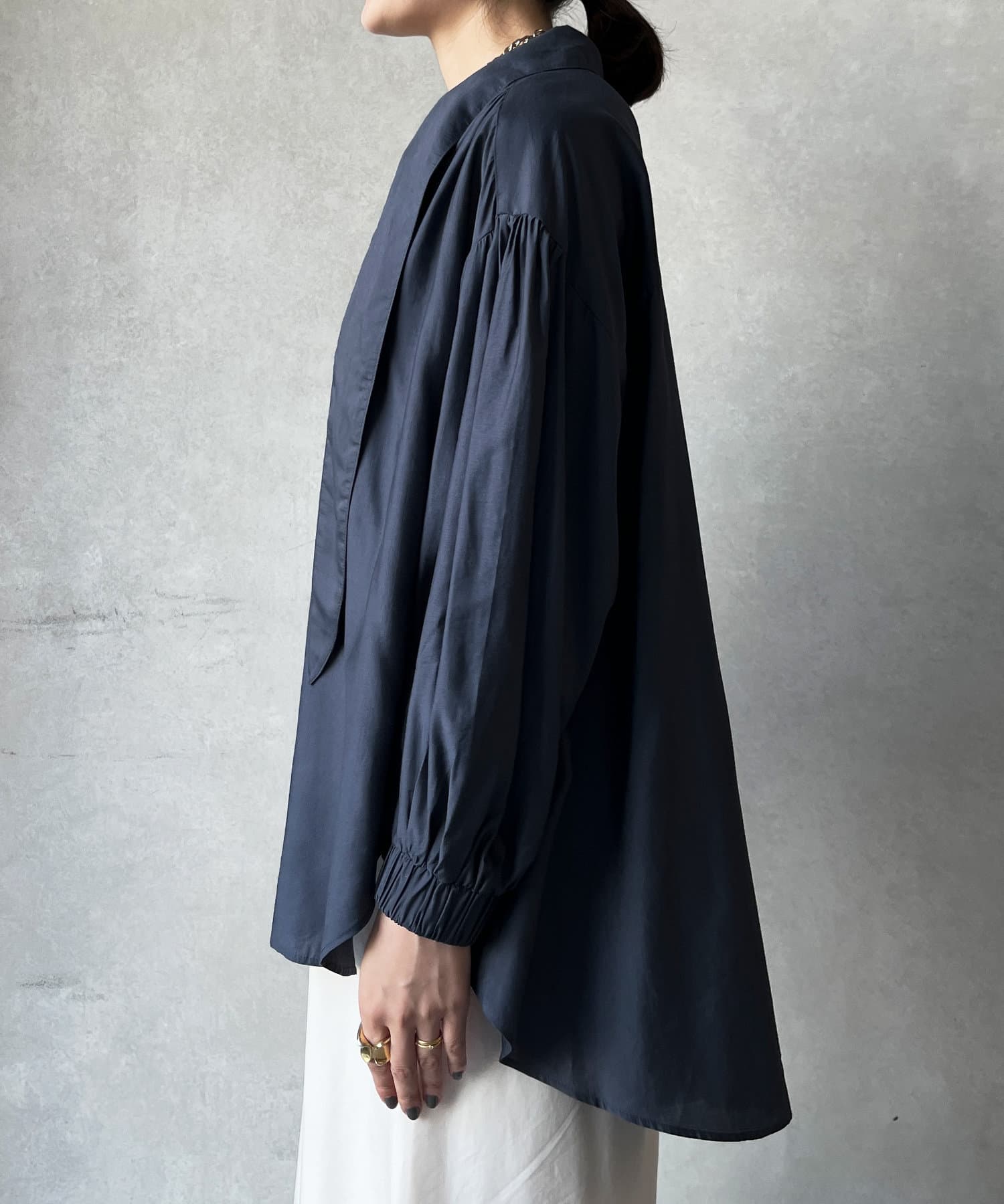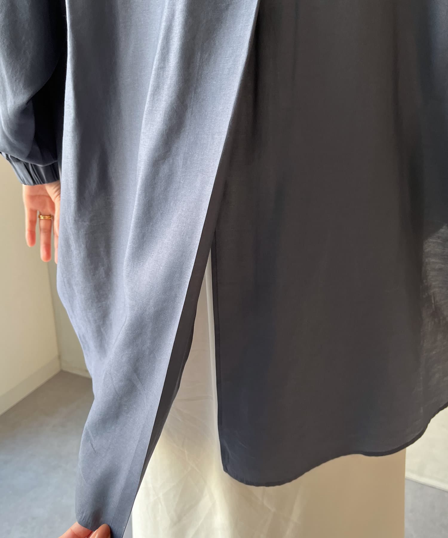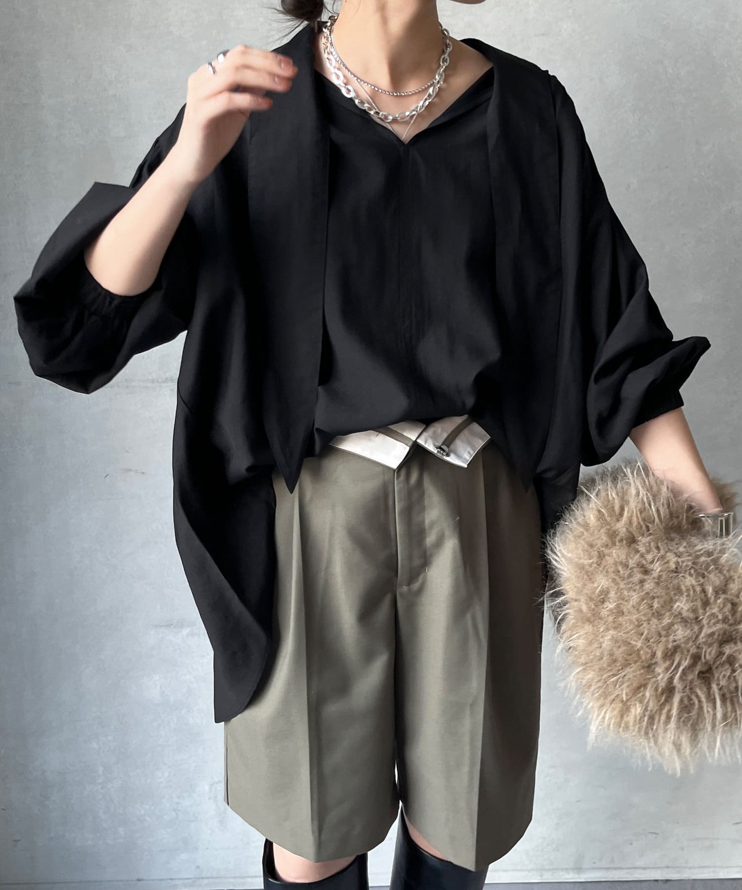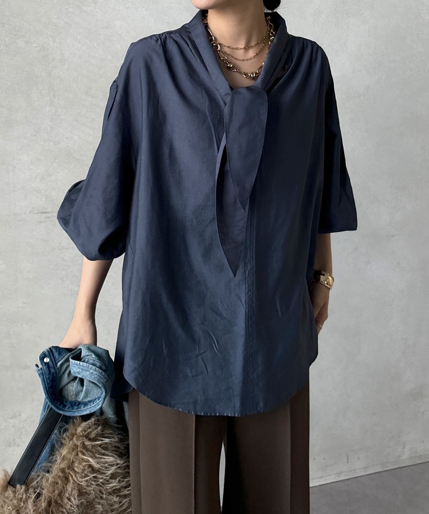 ボリューム感のあるスリーブや、ショルダー・バックのギャザーデザインなど、細かなディティールがおしゃれ感を与え、胸元はスキッパーデザインにすることで、すっきりとした印象をプラス。