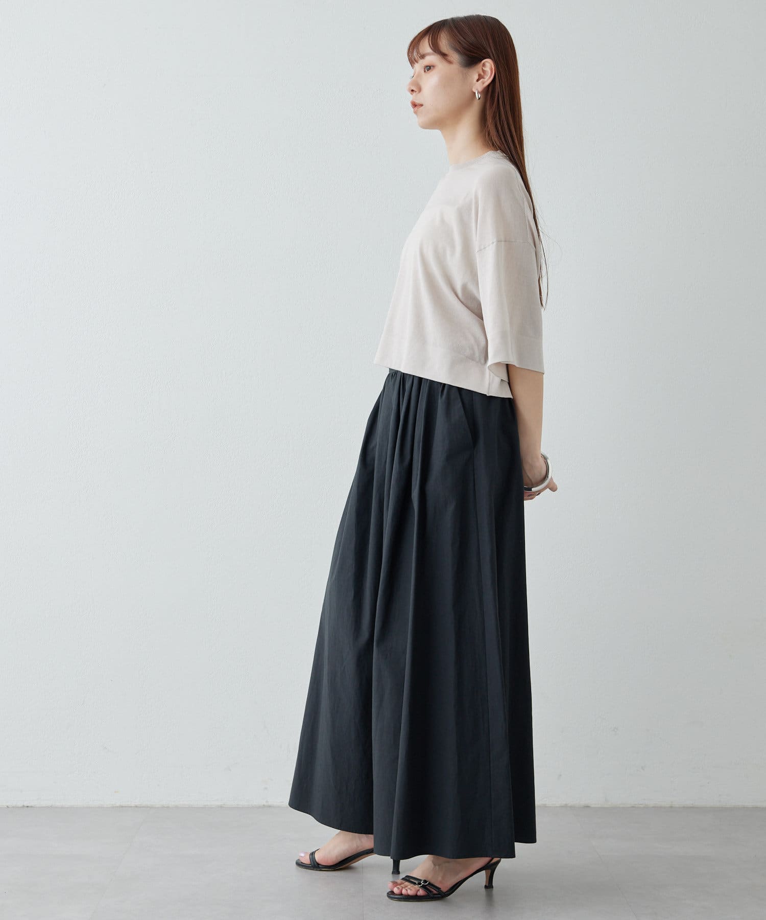 ギャザースカートや甘さのあるアイテムは苦手で、普段はタイトスカートやスラックスが多いのですが、こちらはスタイリッシュさがあるので新しいシルエットに挑戦できました!