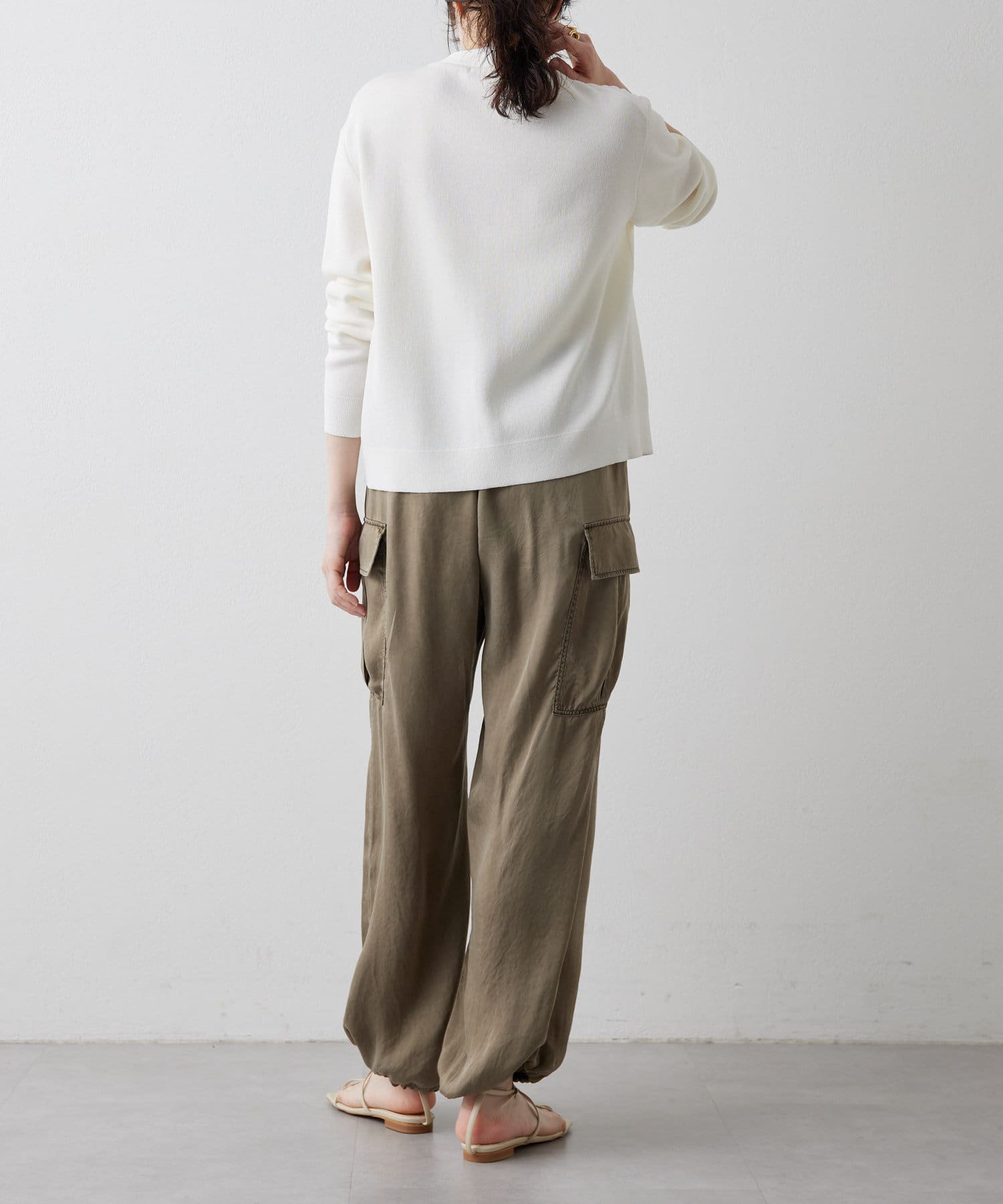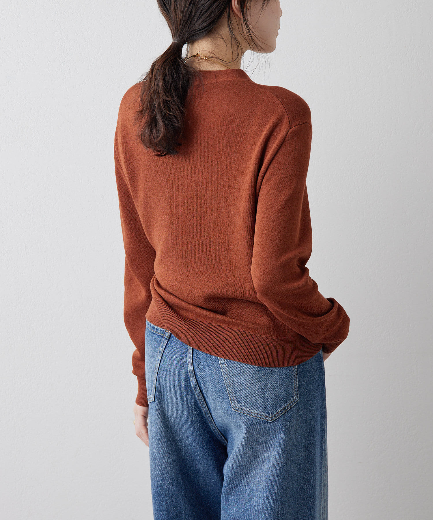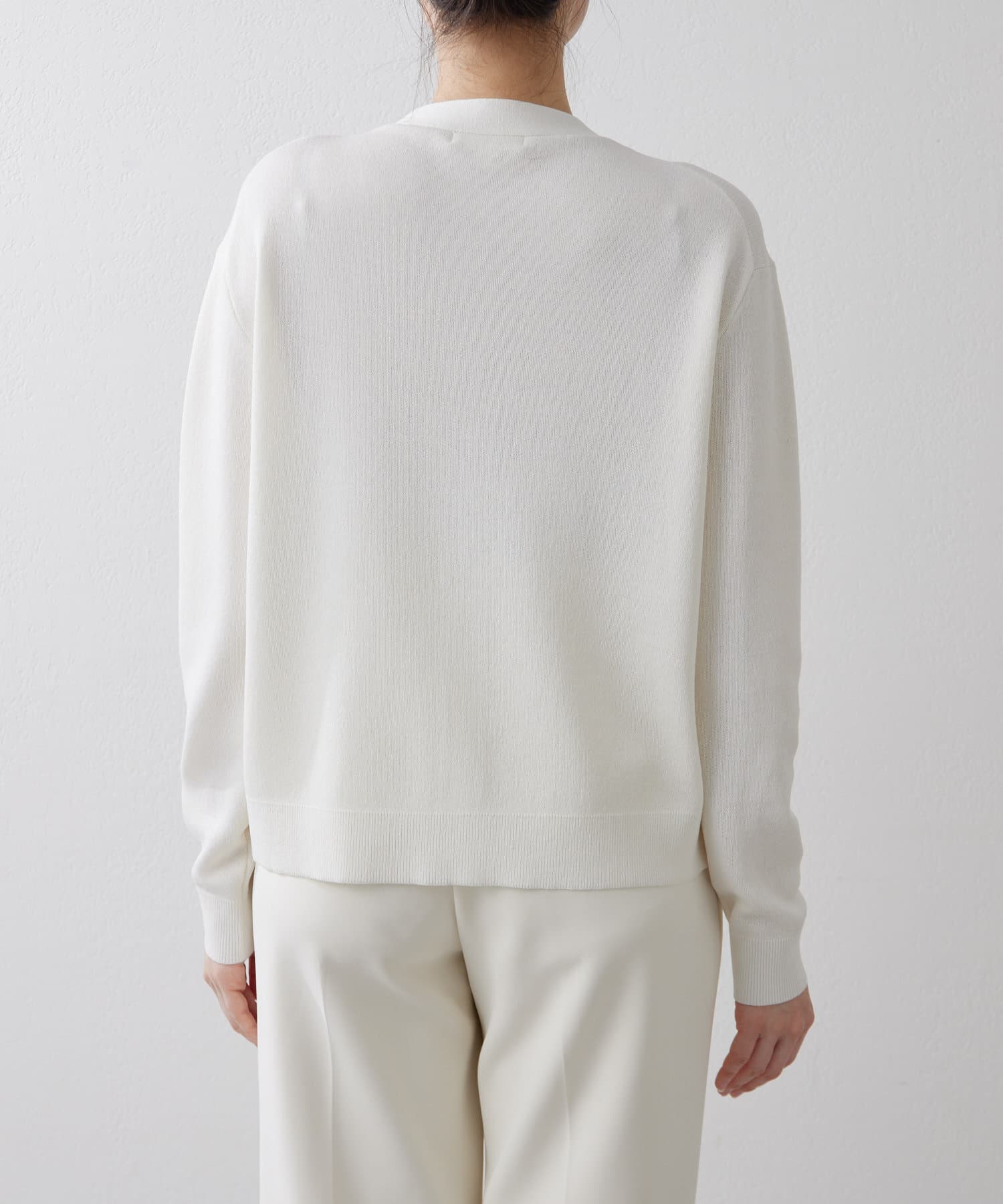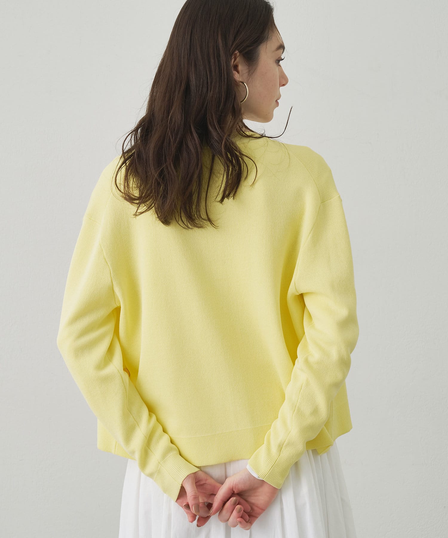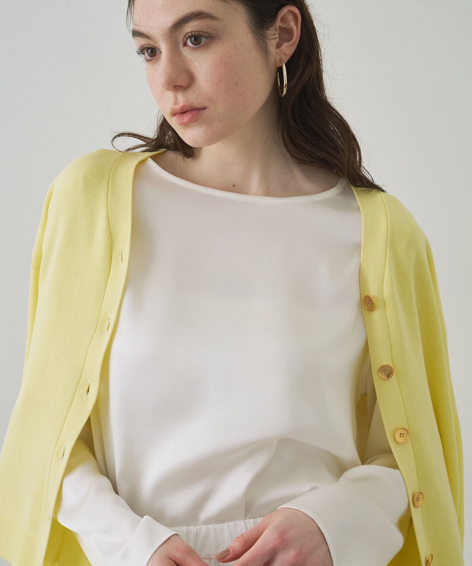 レーヨンポリのサラッとした質感の糸を使用し、ハイゲージのスムース編みで軽いのにしっかりした編地を表現した生地。
