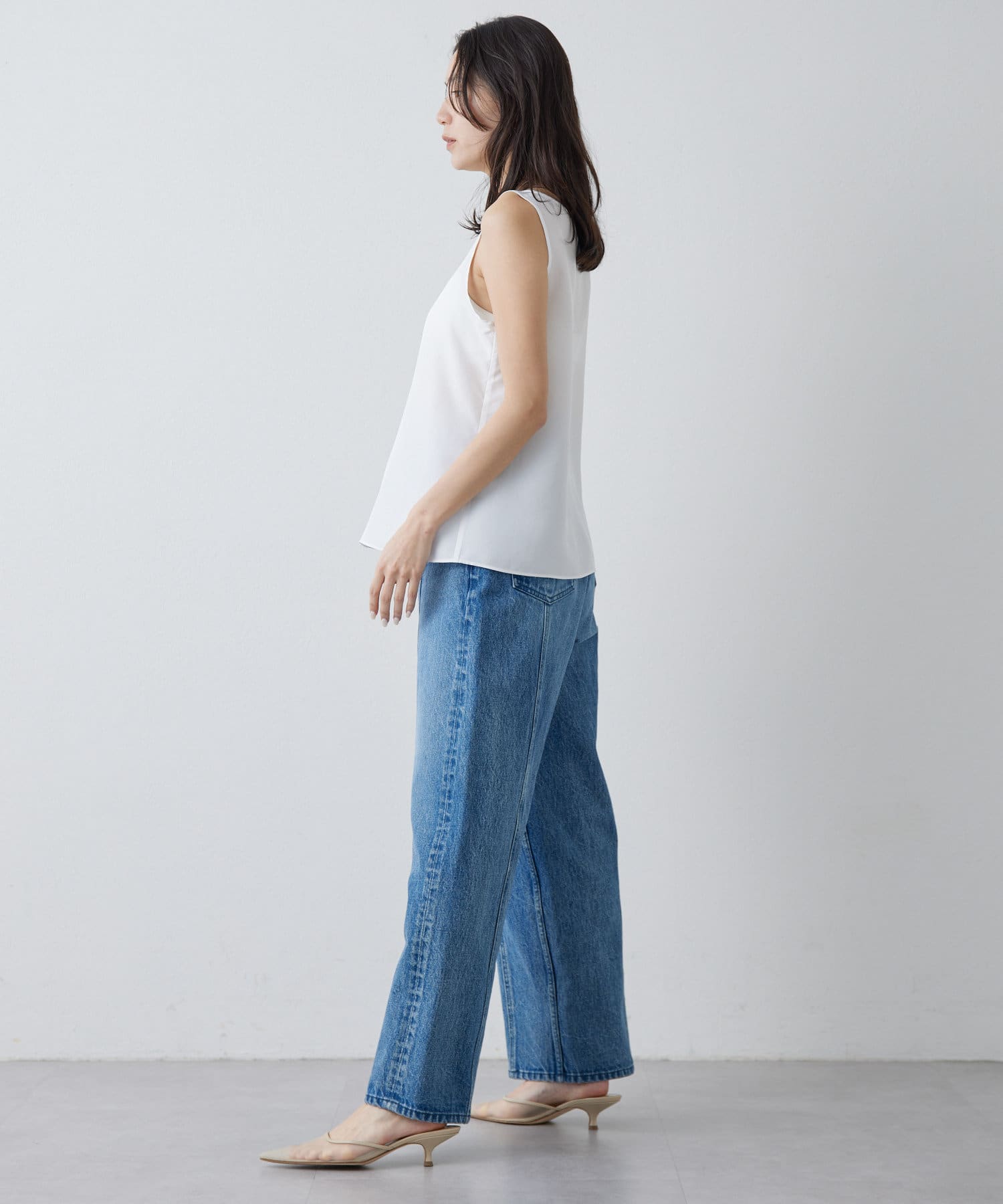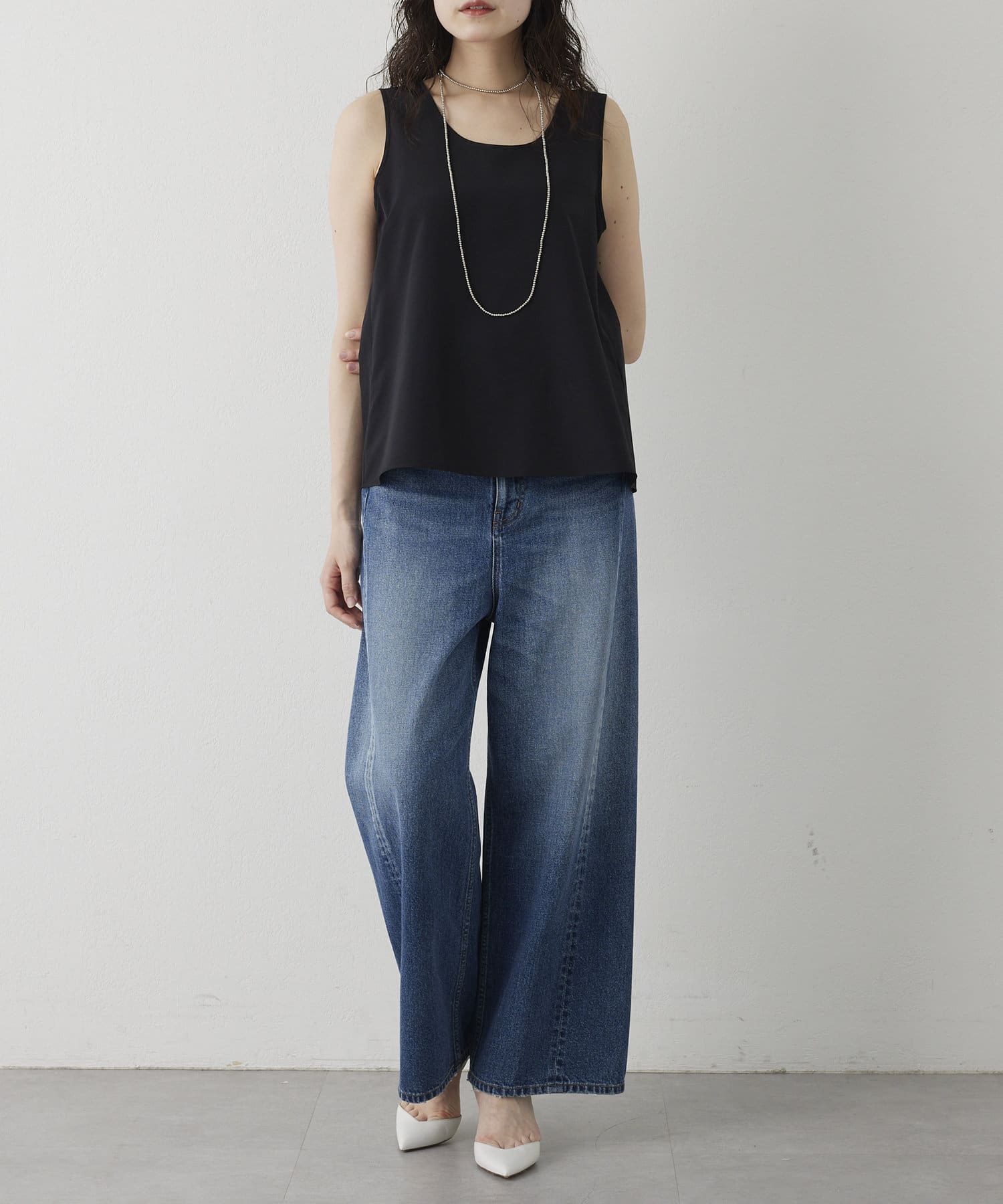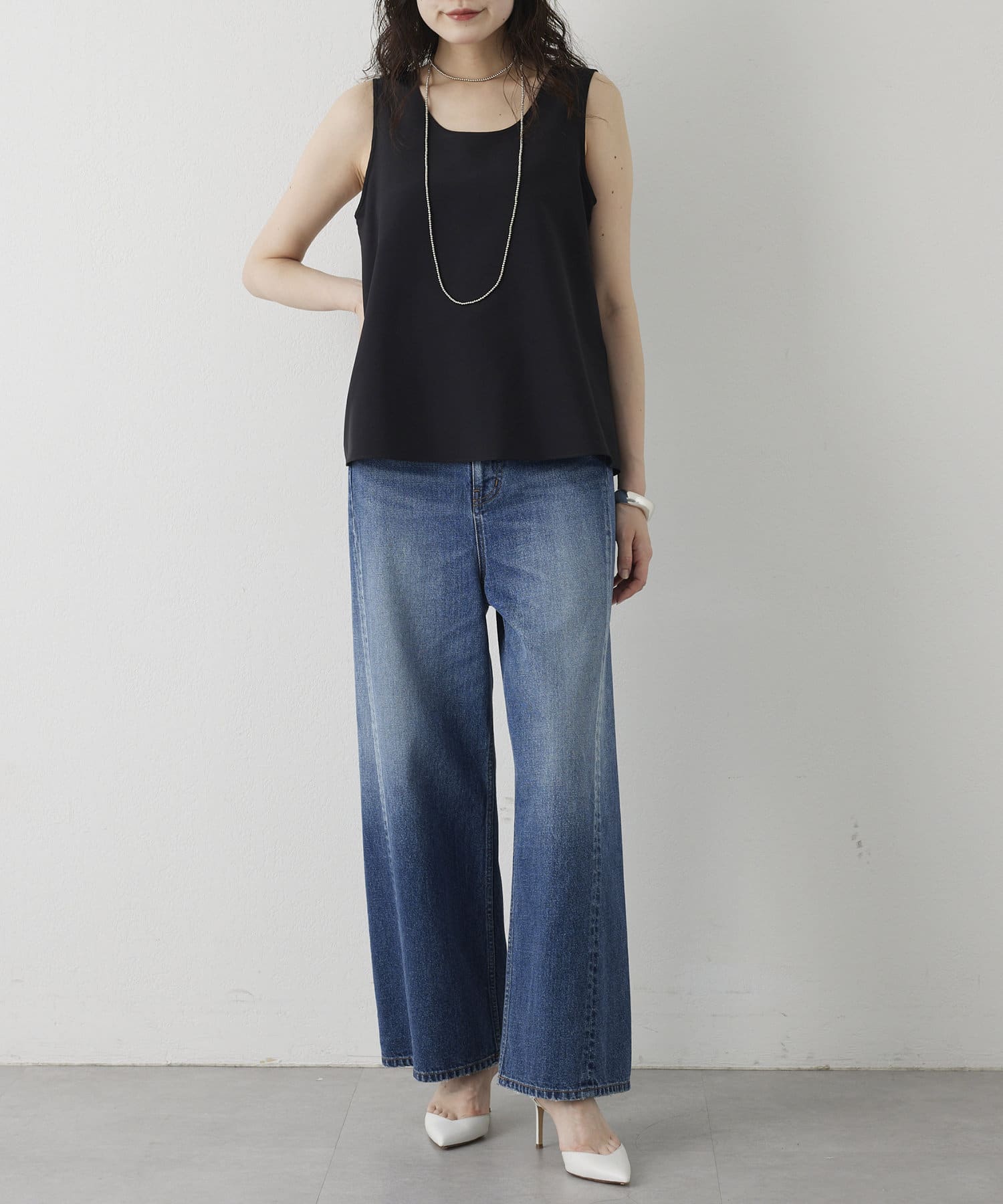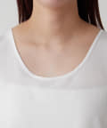 ■ツルツルとした素材感で上にシャツやカーディガンを羽織ても着膨れず、すっきりと着こなせるのも◎。