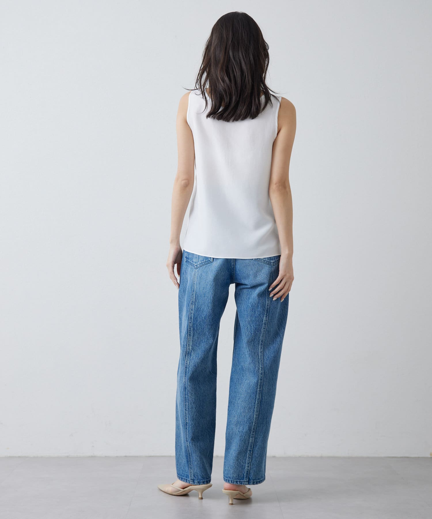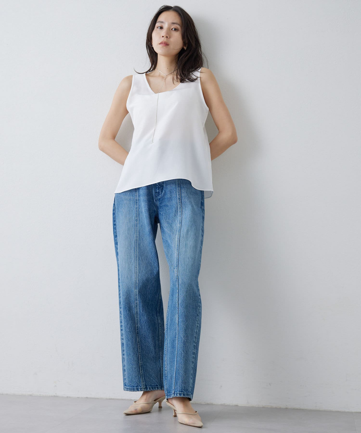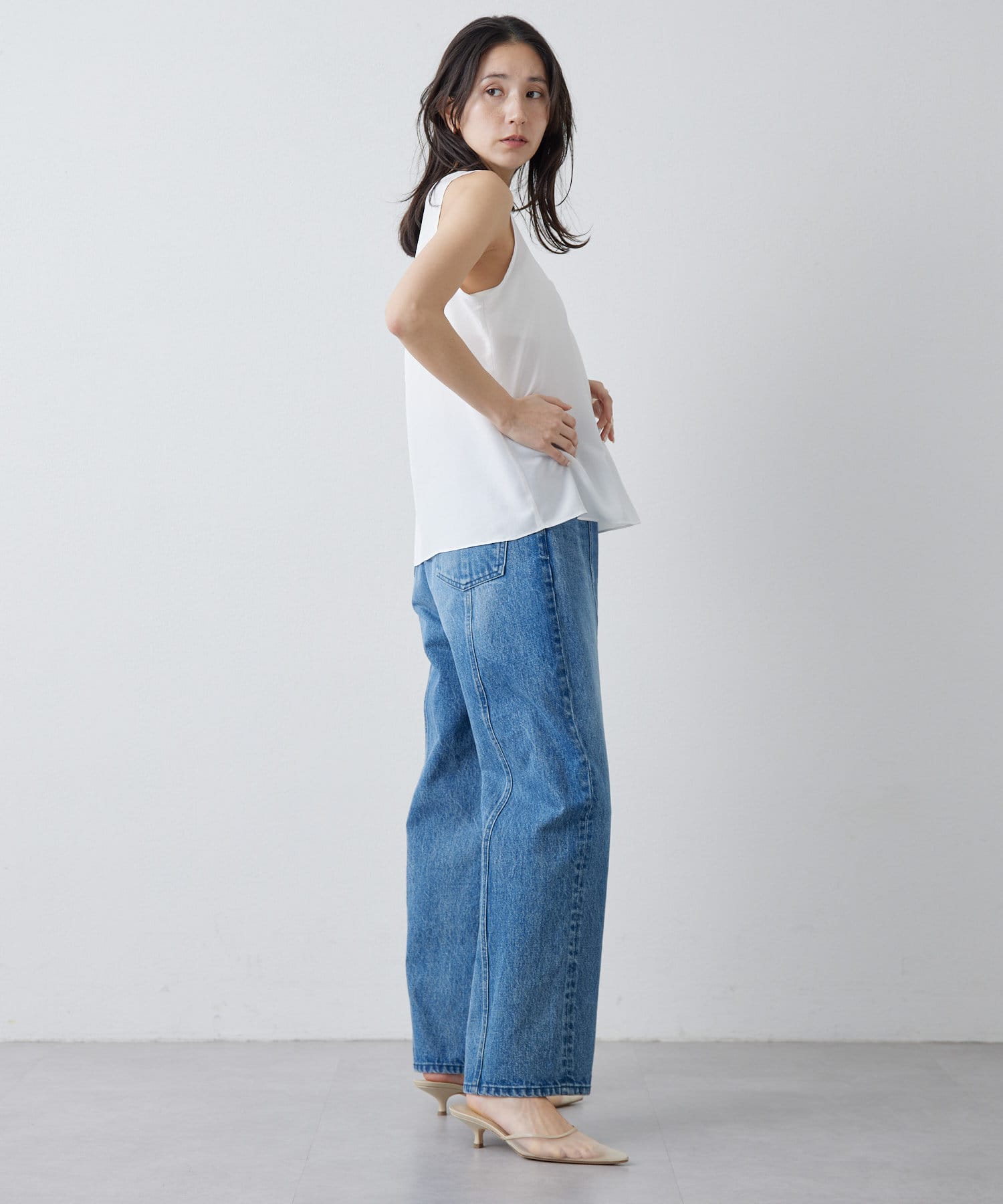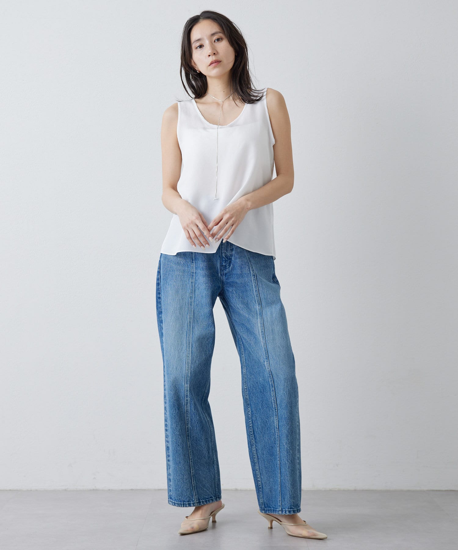 ■ツルツルとした素材感で上にシャツやカーディガンを羽織ても着膨れず、すっきりと着こなせるのも◎。