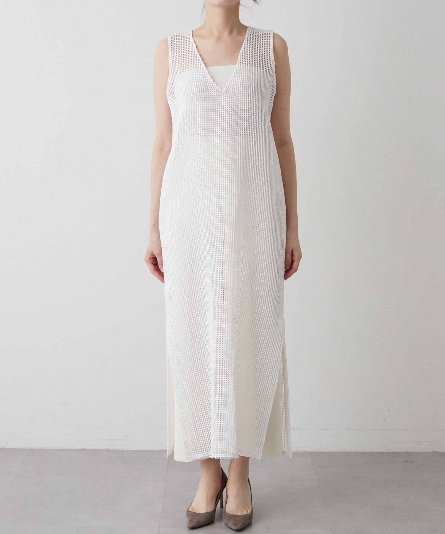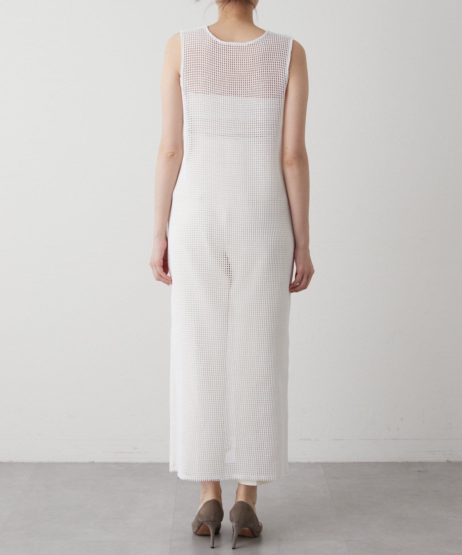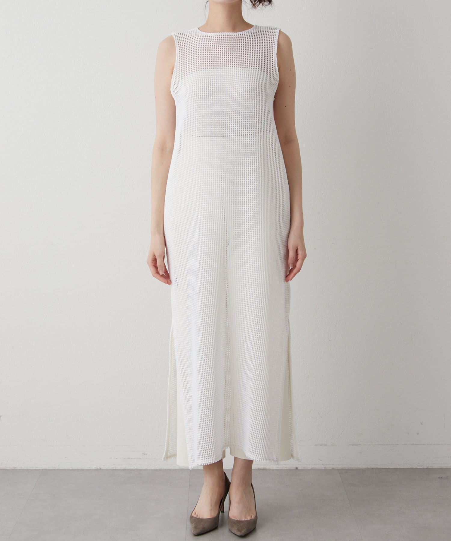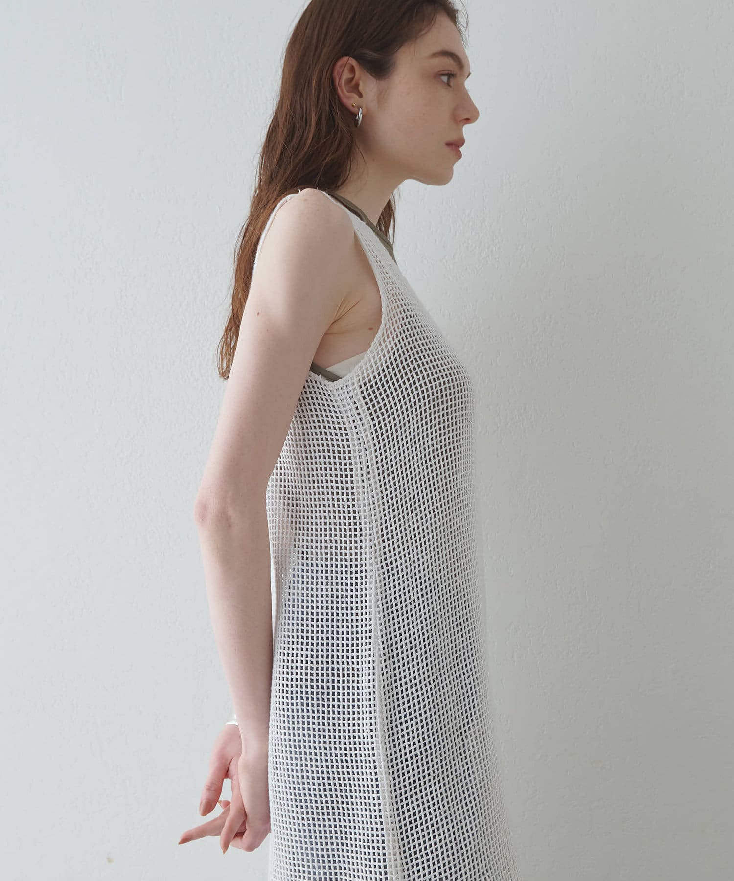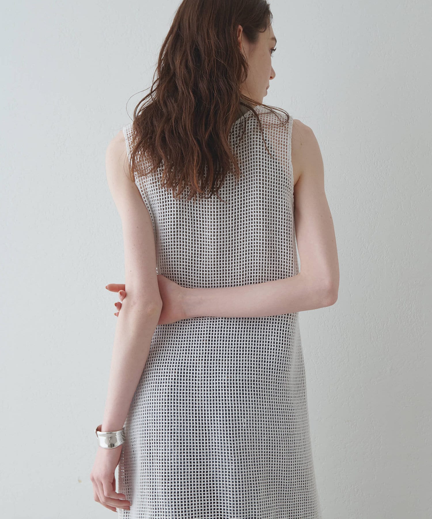 ■スクエアメッシュの表情がポイントのノースリーブワンピース。
