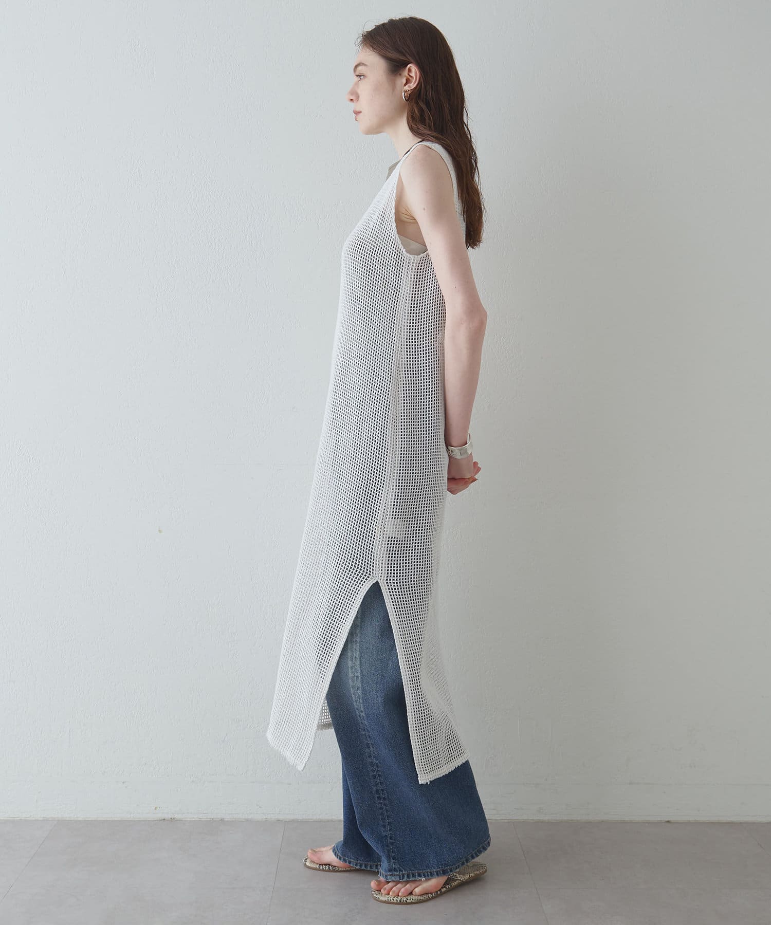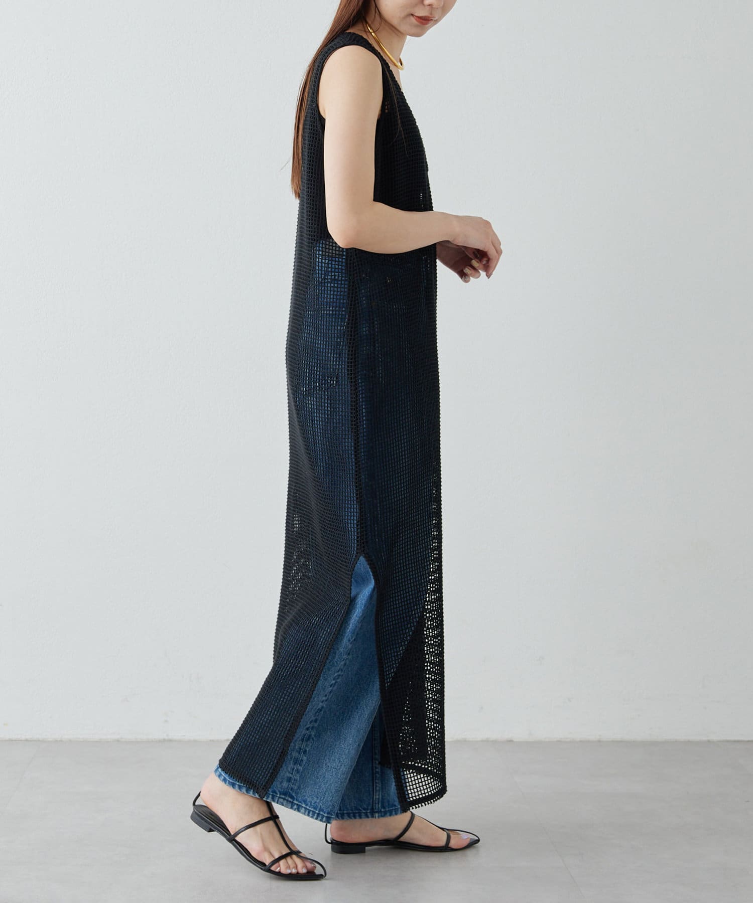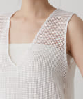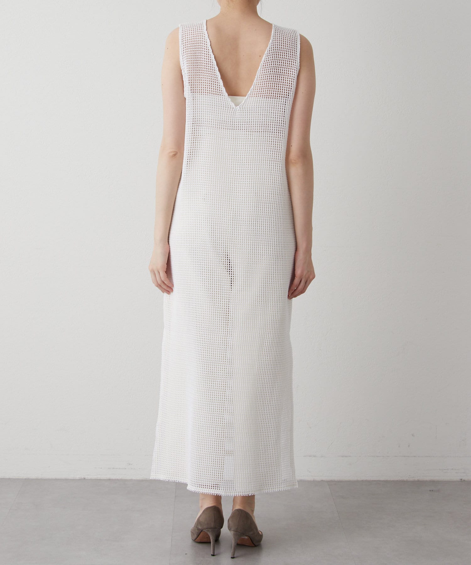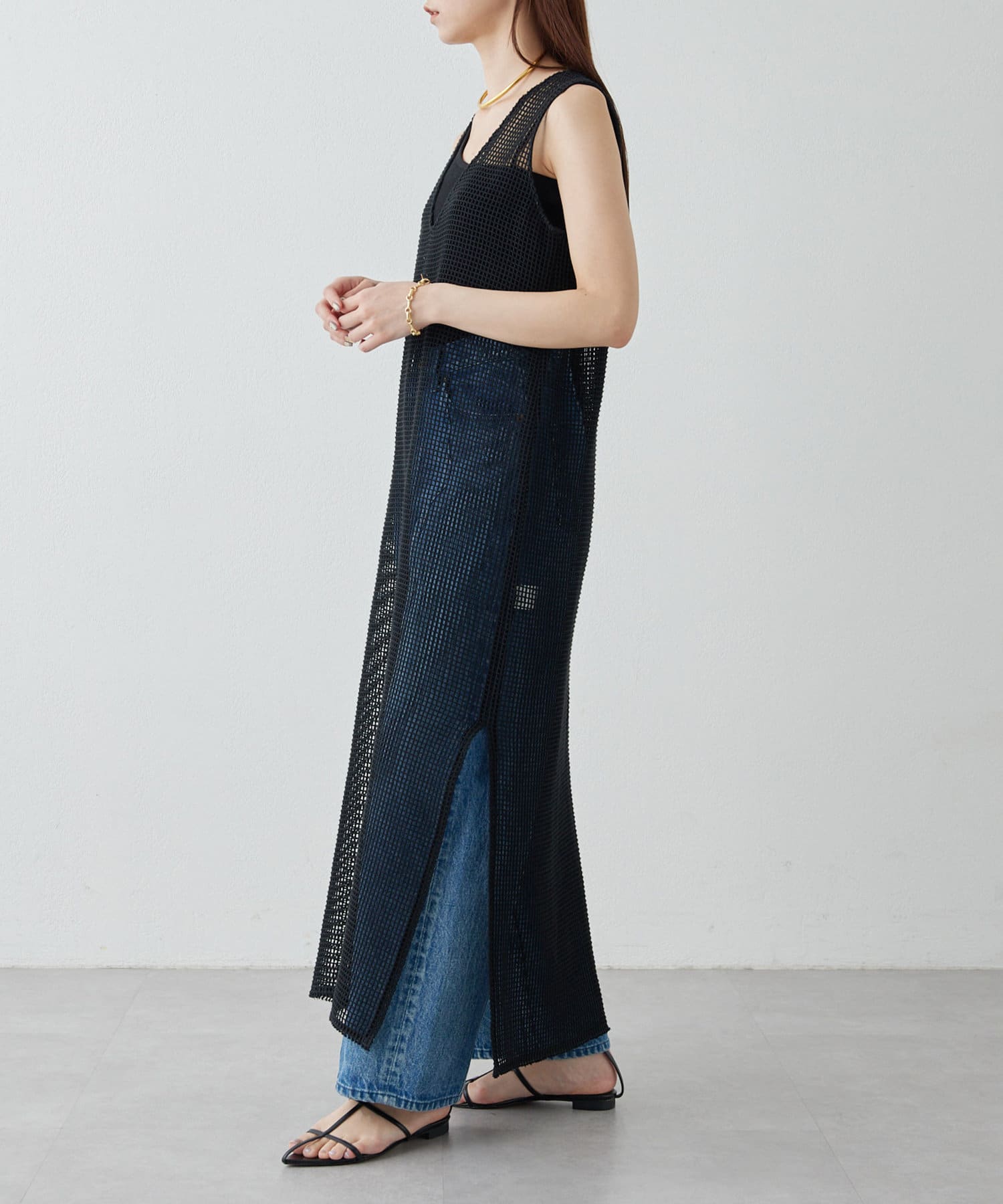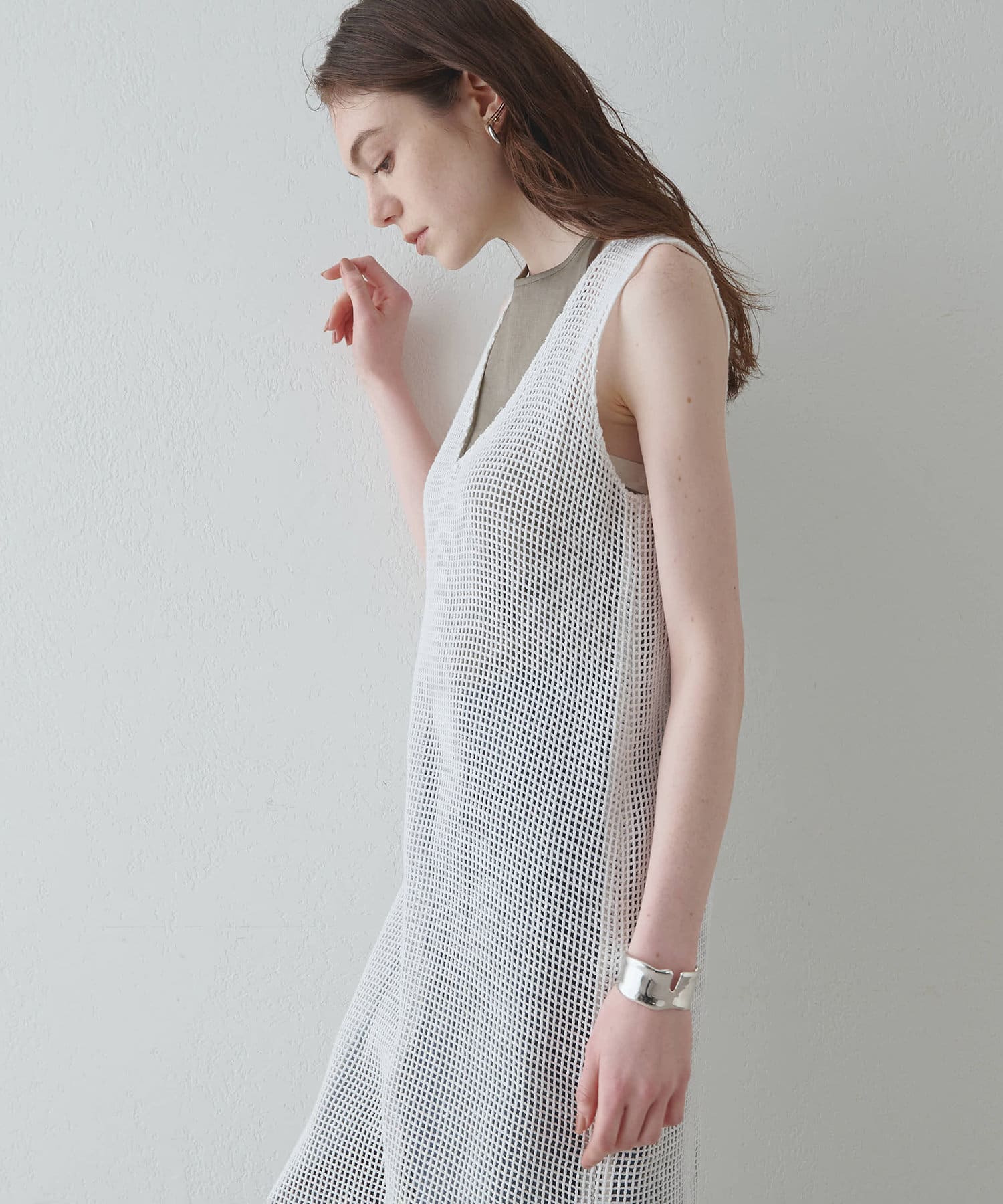 ■スクエアメッシュの表情がポイントのノースリーブワンピース。