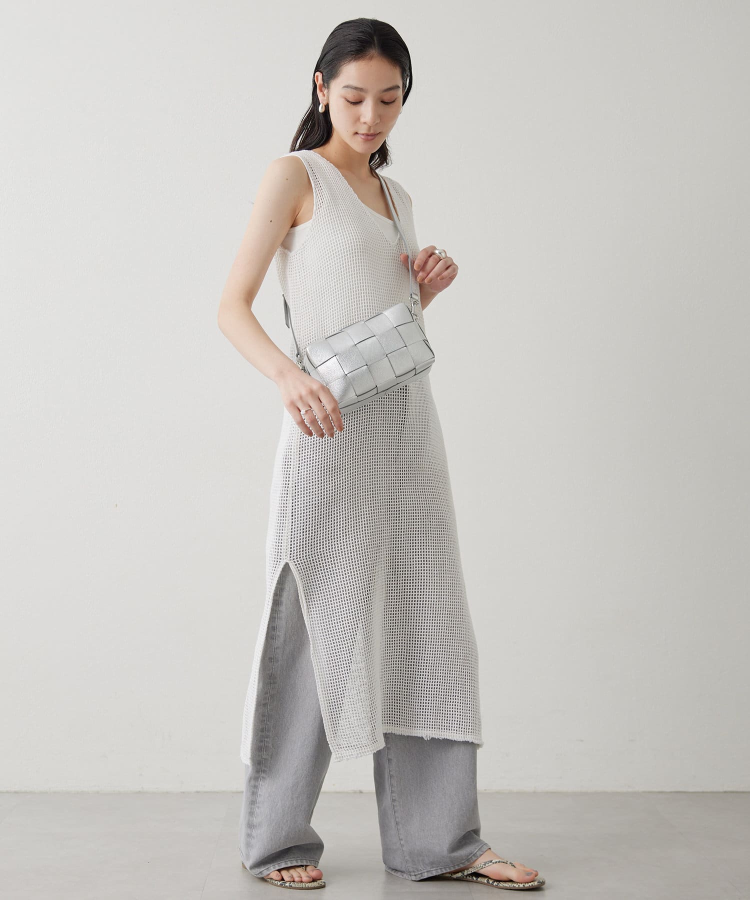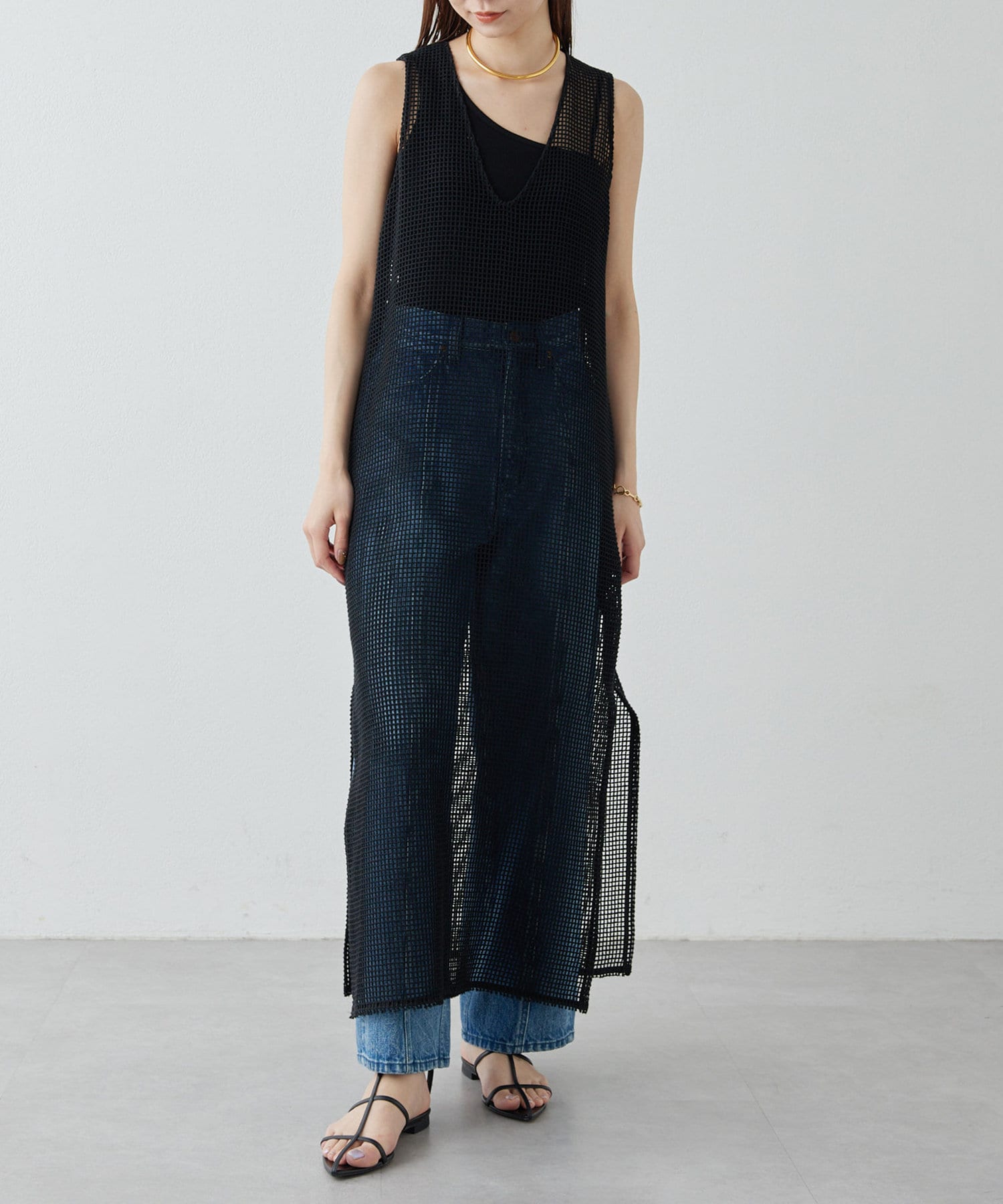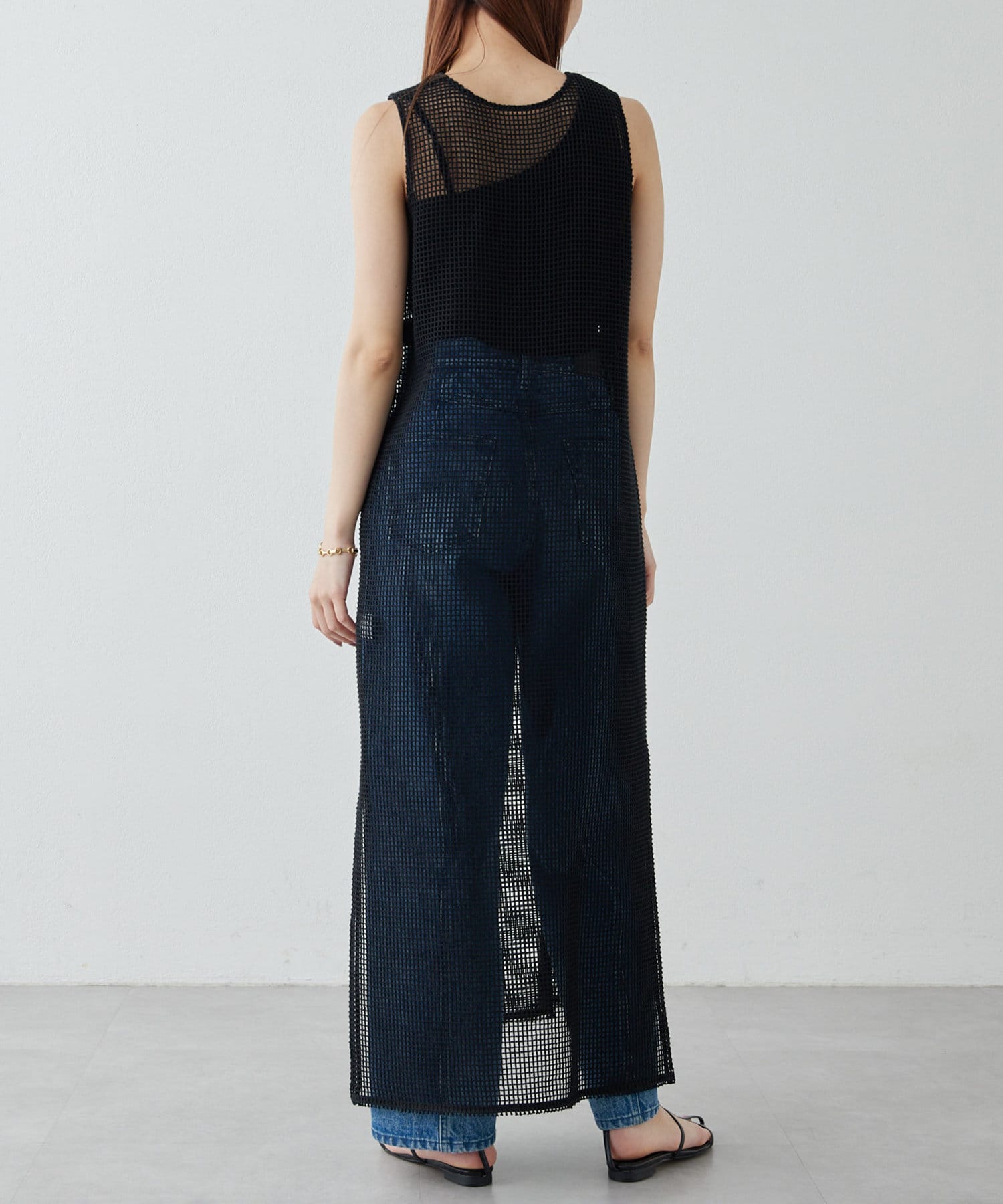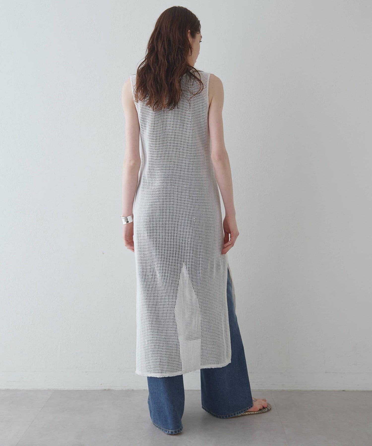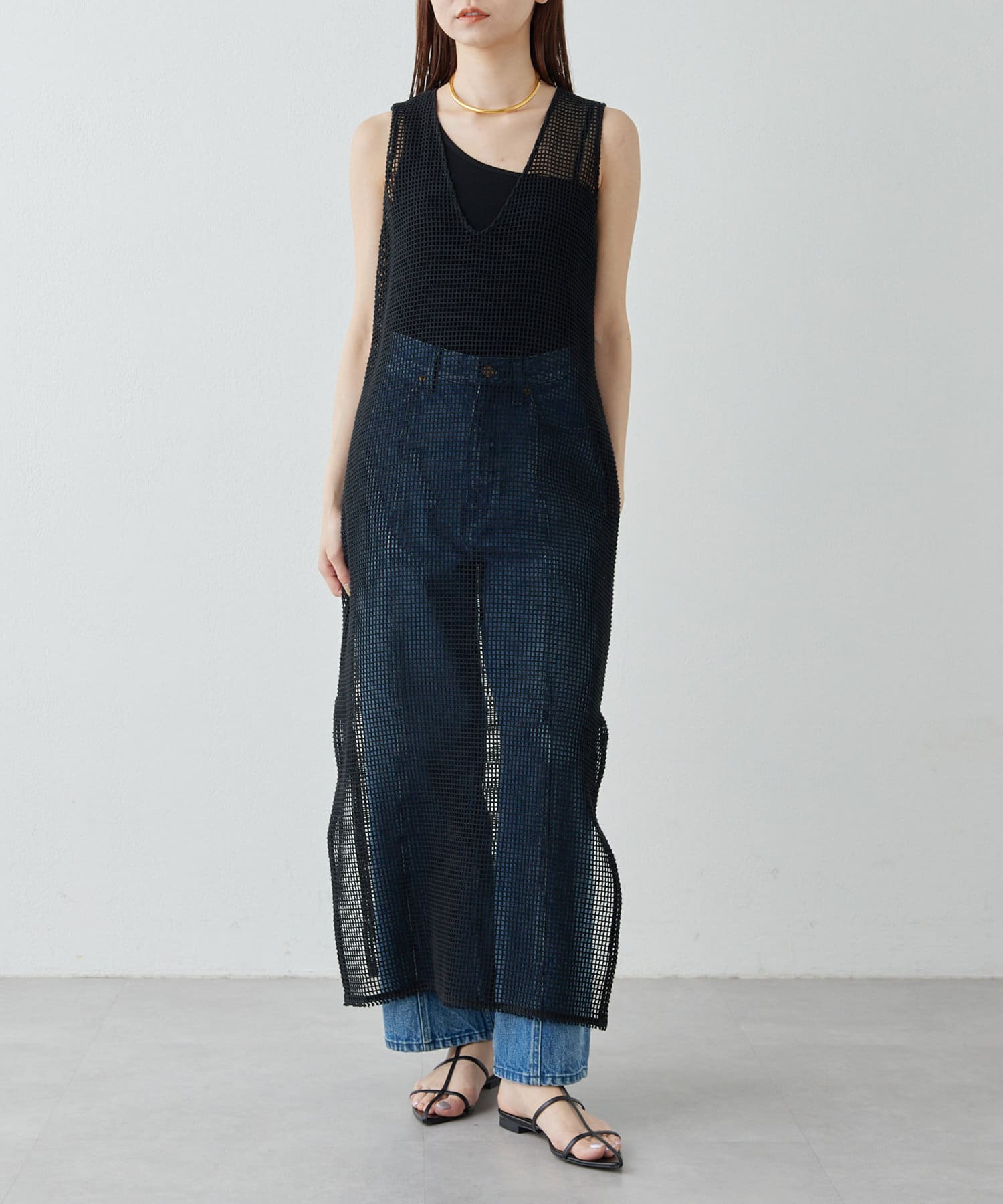 ■スクエアメッシュの表情がポイントのノースリーブワンピース。