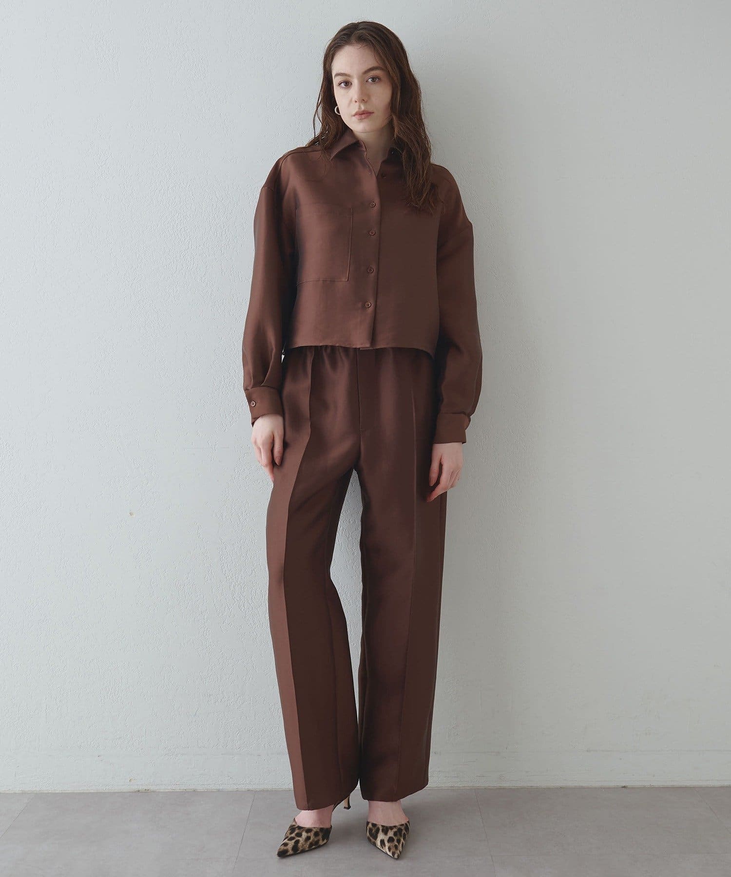 シルクのような上品な光沢感が美しいパンツ。他にはないカラーでオシャレな雰囲気に。