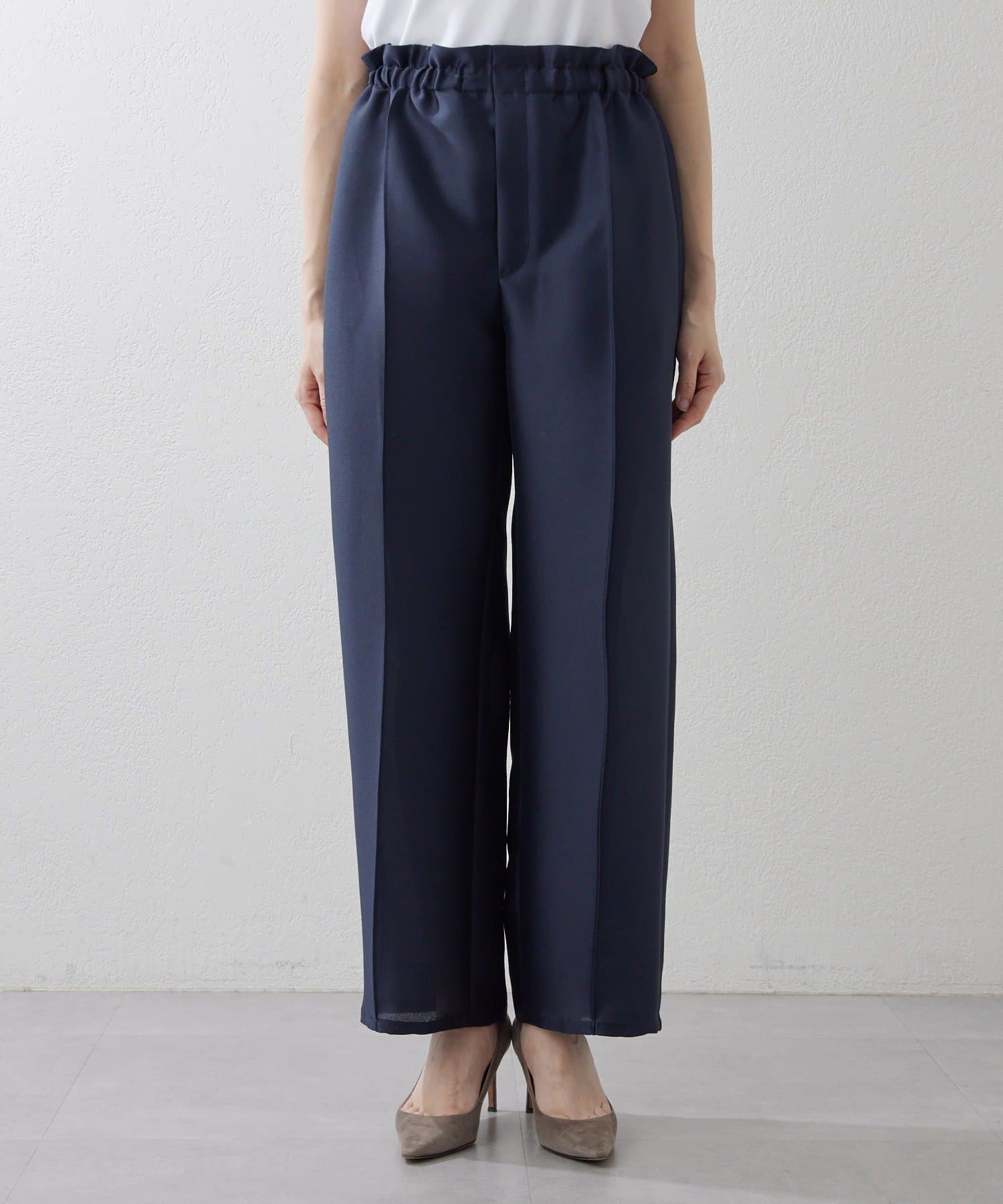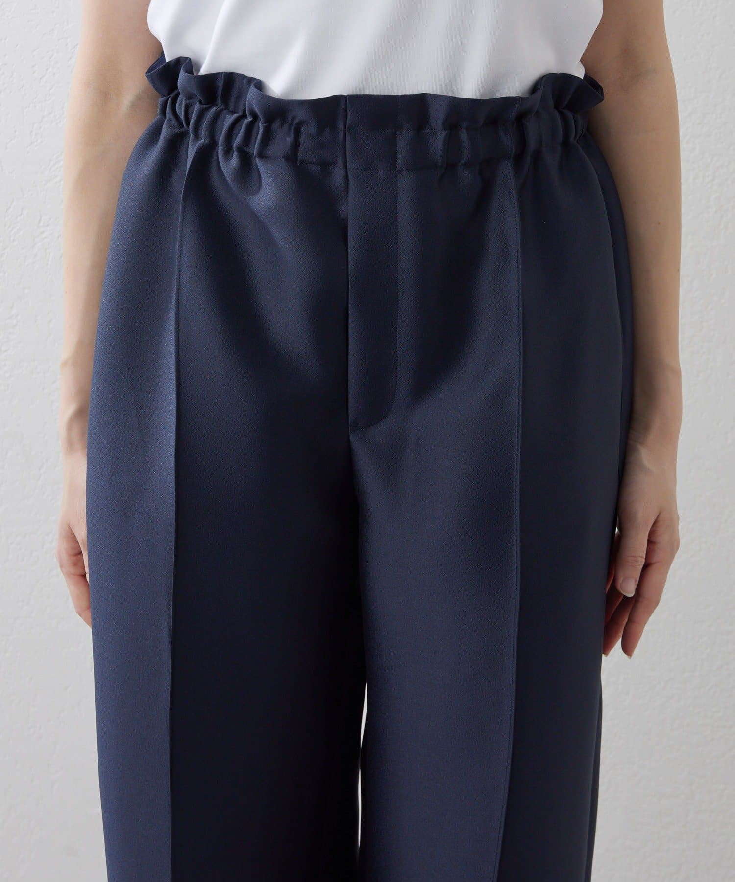 ウエストがギャザーになって見た目にも可愛いですし、楽さも兼ね備えていて良いです!ゴムは本当に履きやすくて感動!ウエストが細い方も、絞れるので安心です。前後の縫い付けられたセンタープレスで美脚見えが持続するのも◎