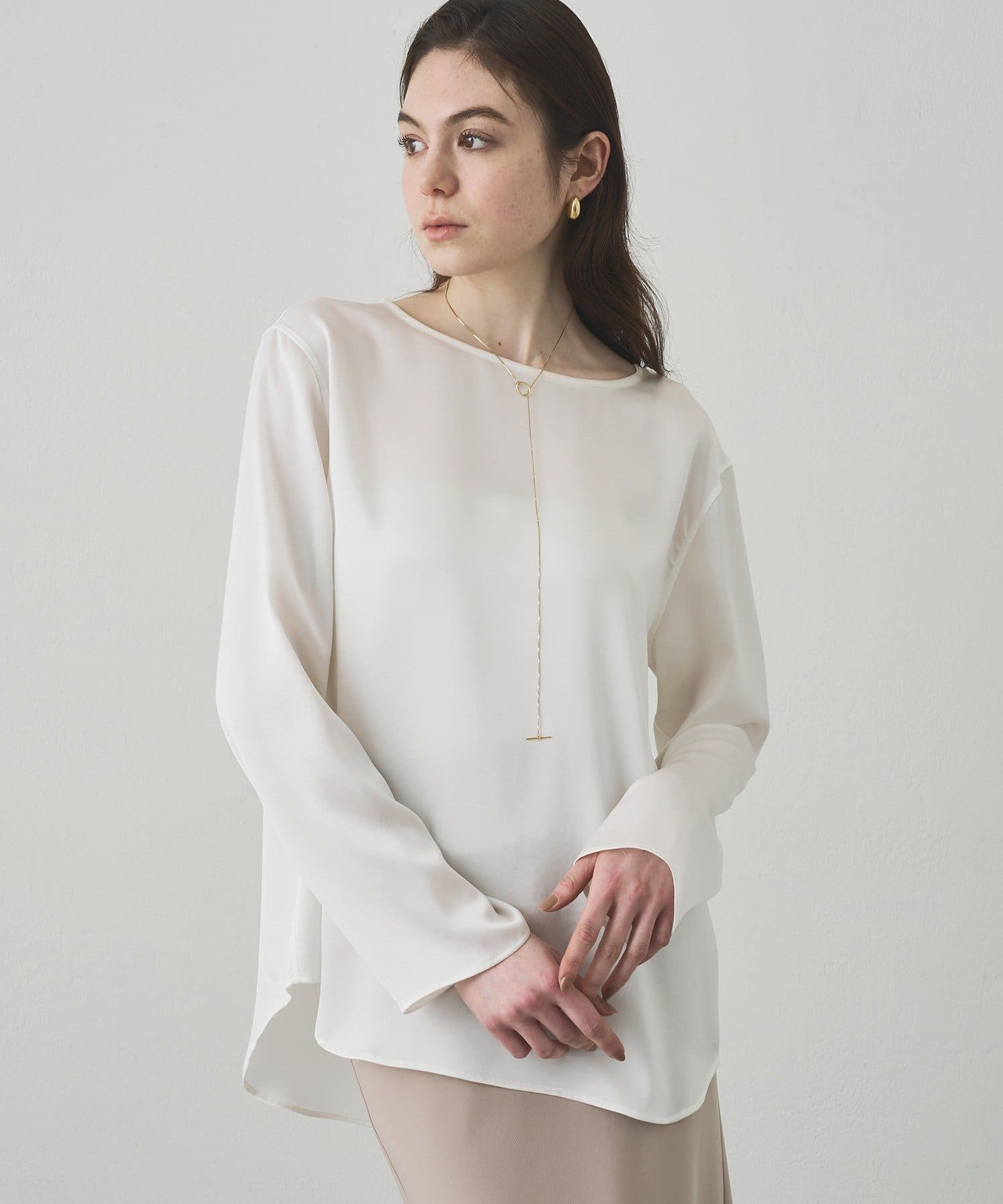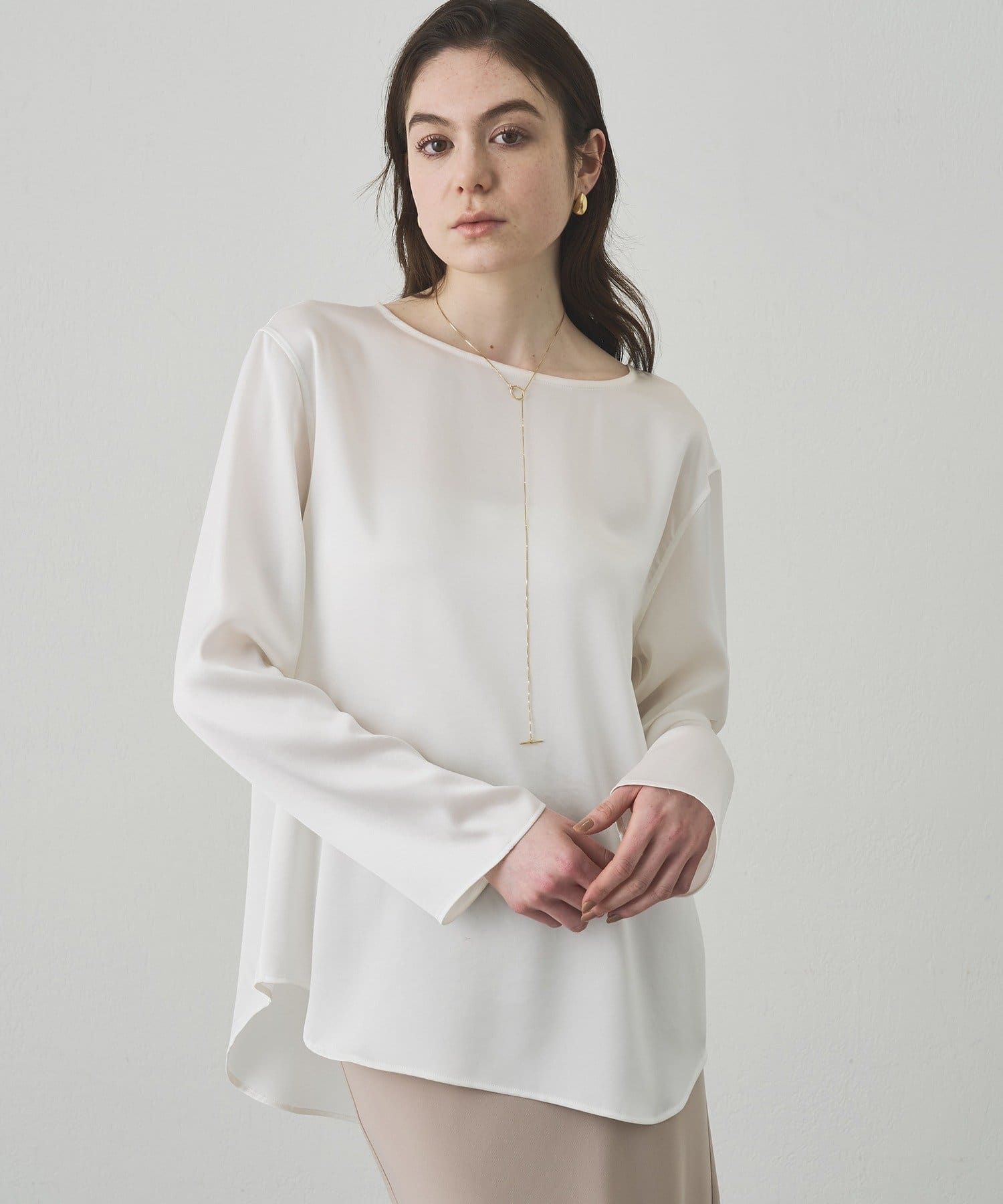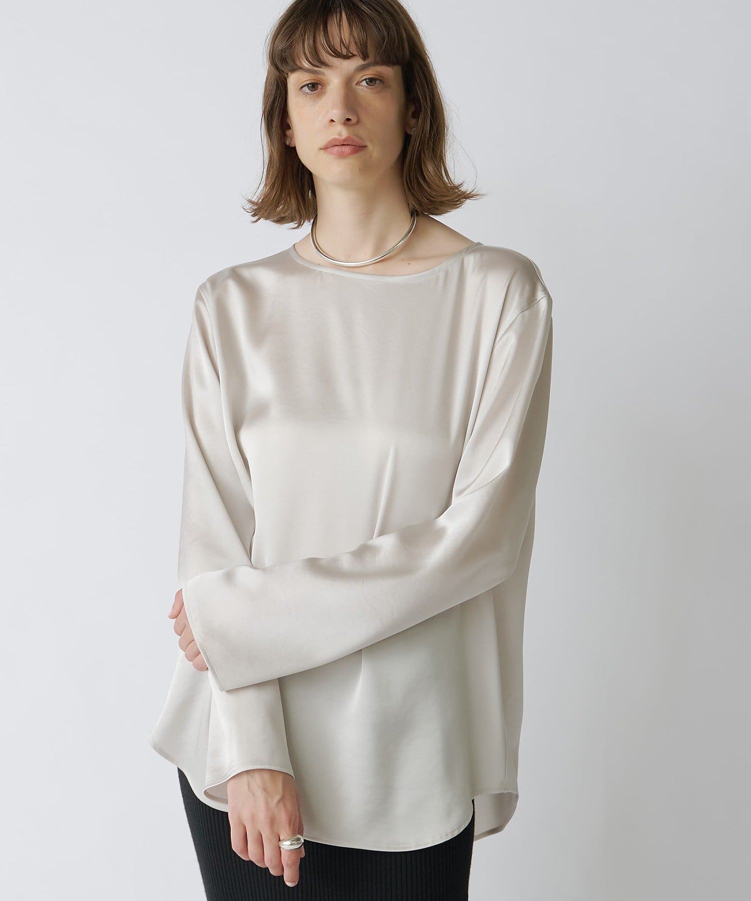 人気のサテンボートブラウス!単体でも、インナーでも、重ね着でも万能な1枚です◎ボートネックで適度に抜け感があるので、ジャケットを羽織っても首が詰まりすぎないですし、重ね着しても、変に襟が出てくることがなく綺麗です。