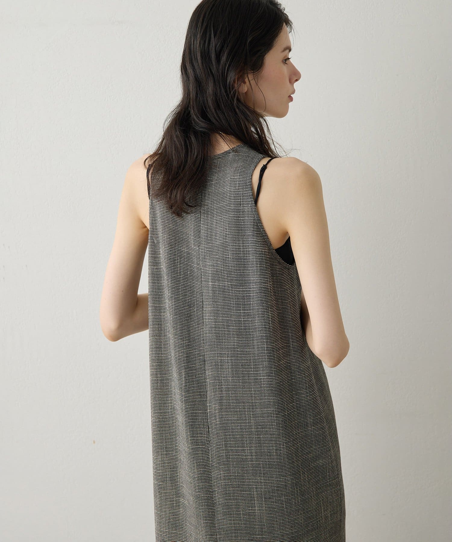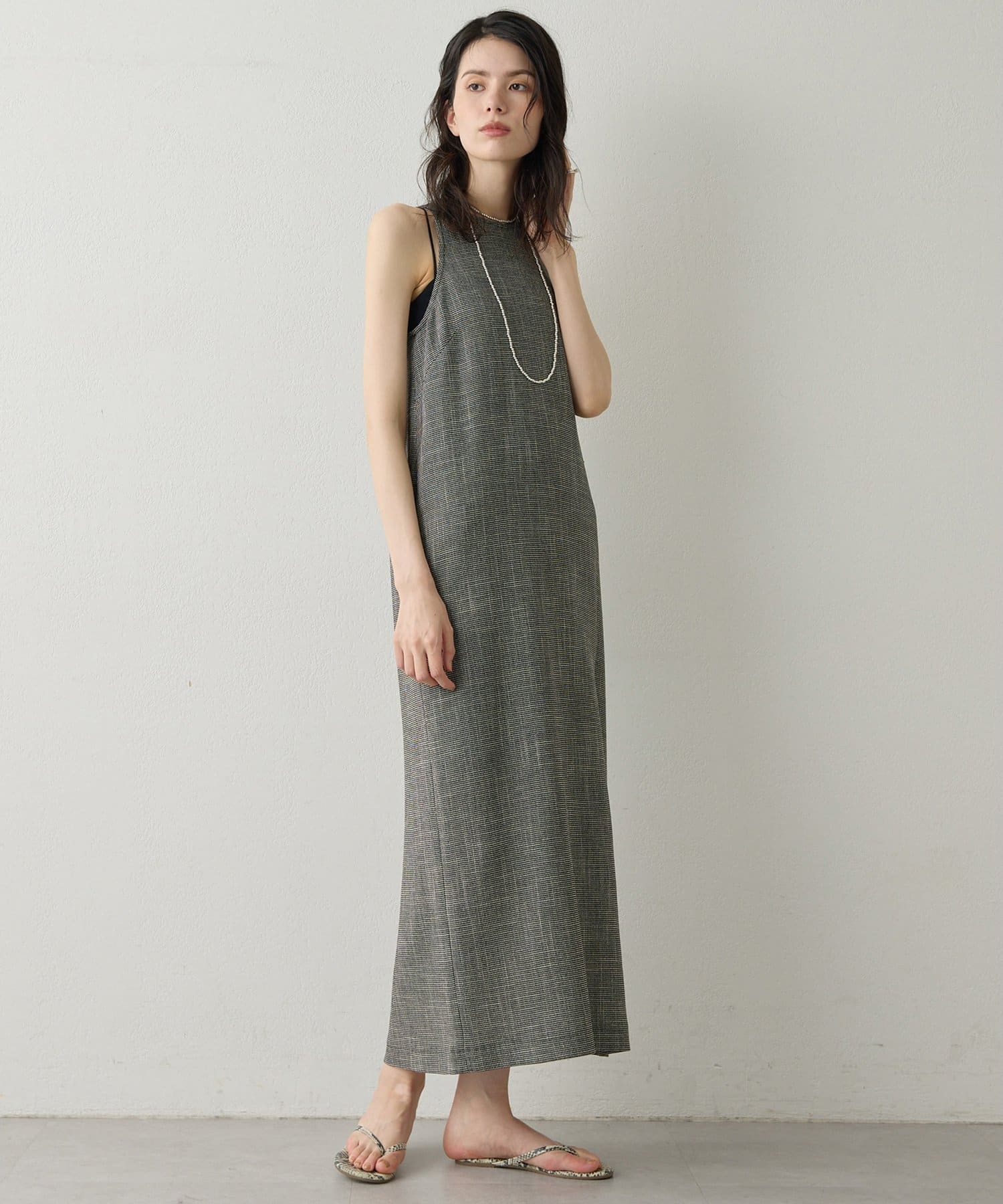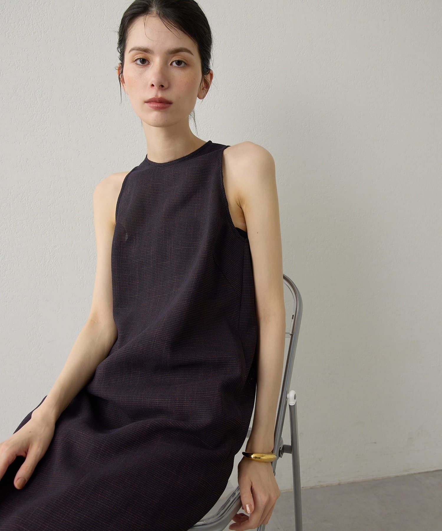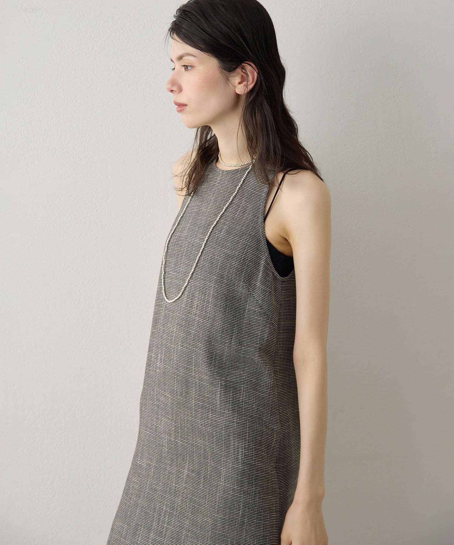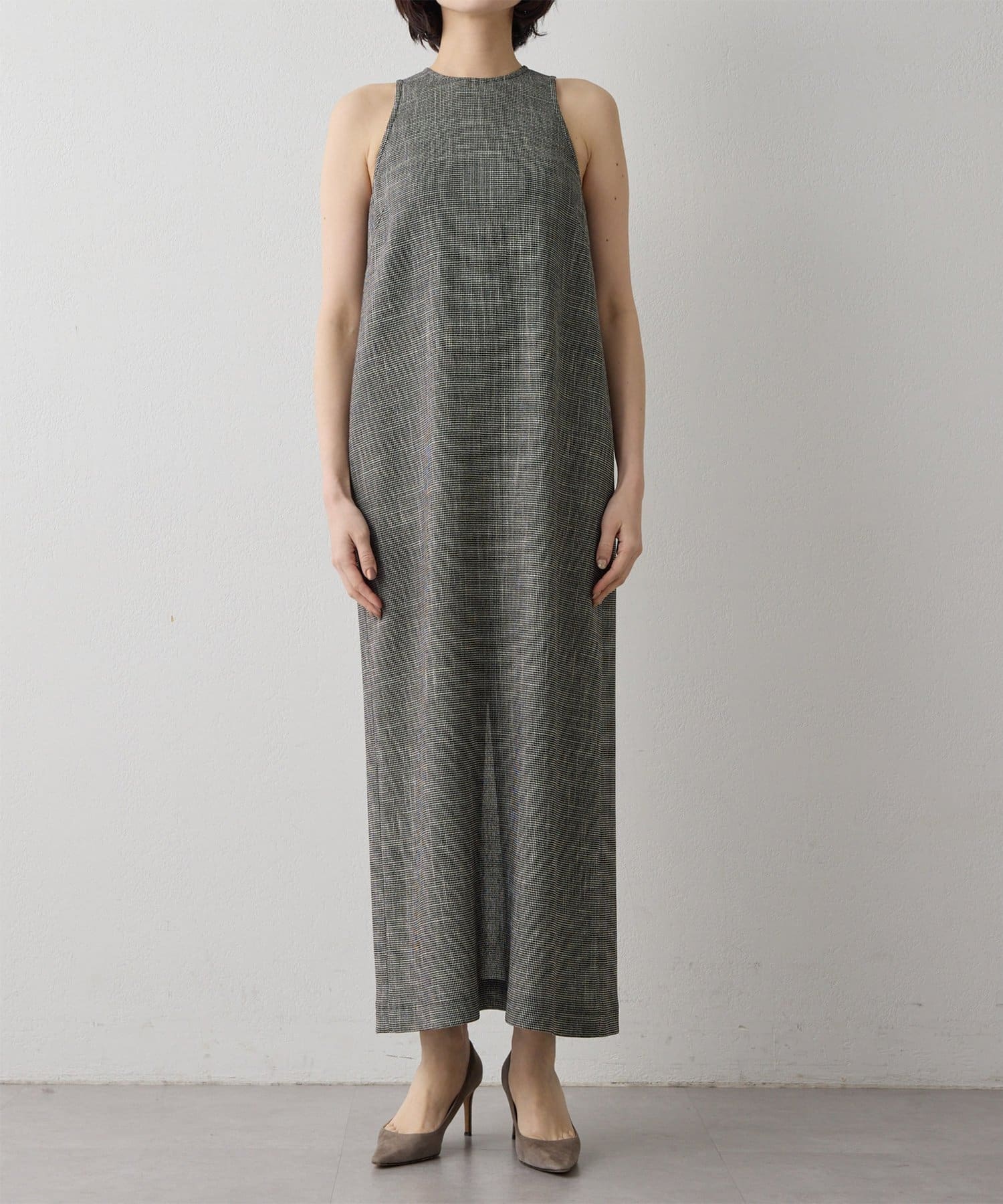 ■表情感のある生地で仕立てたノースリーブワンピース。