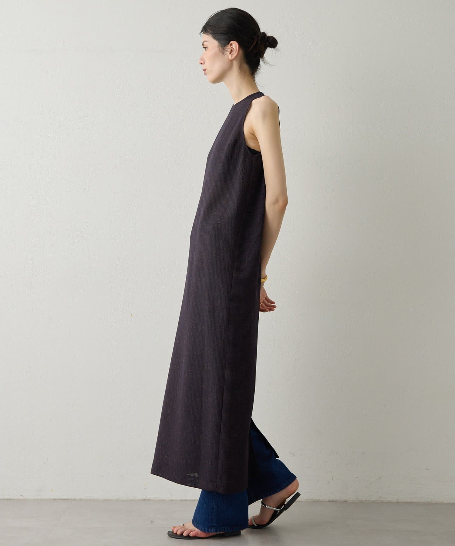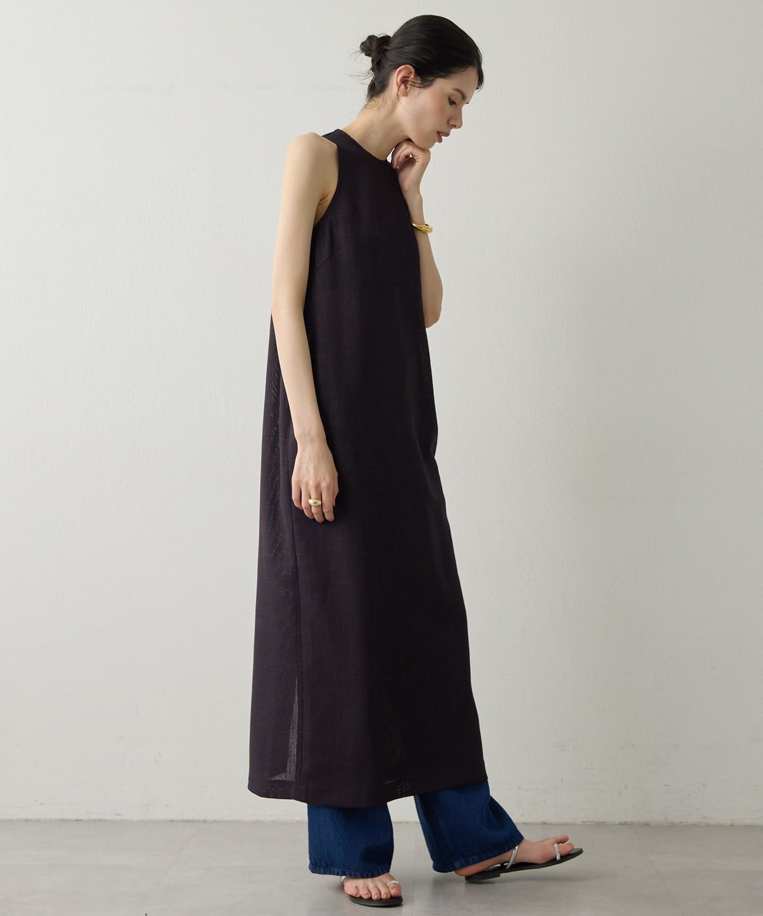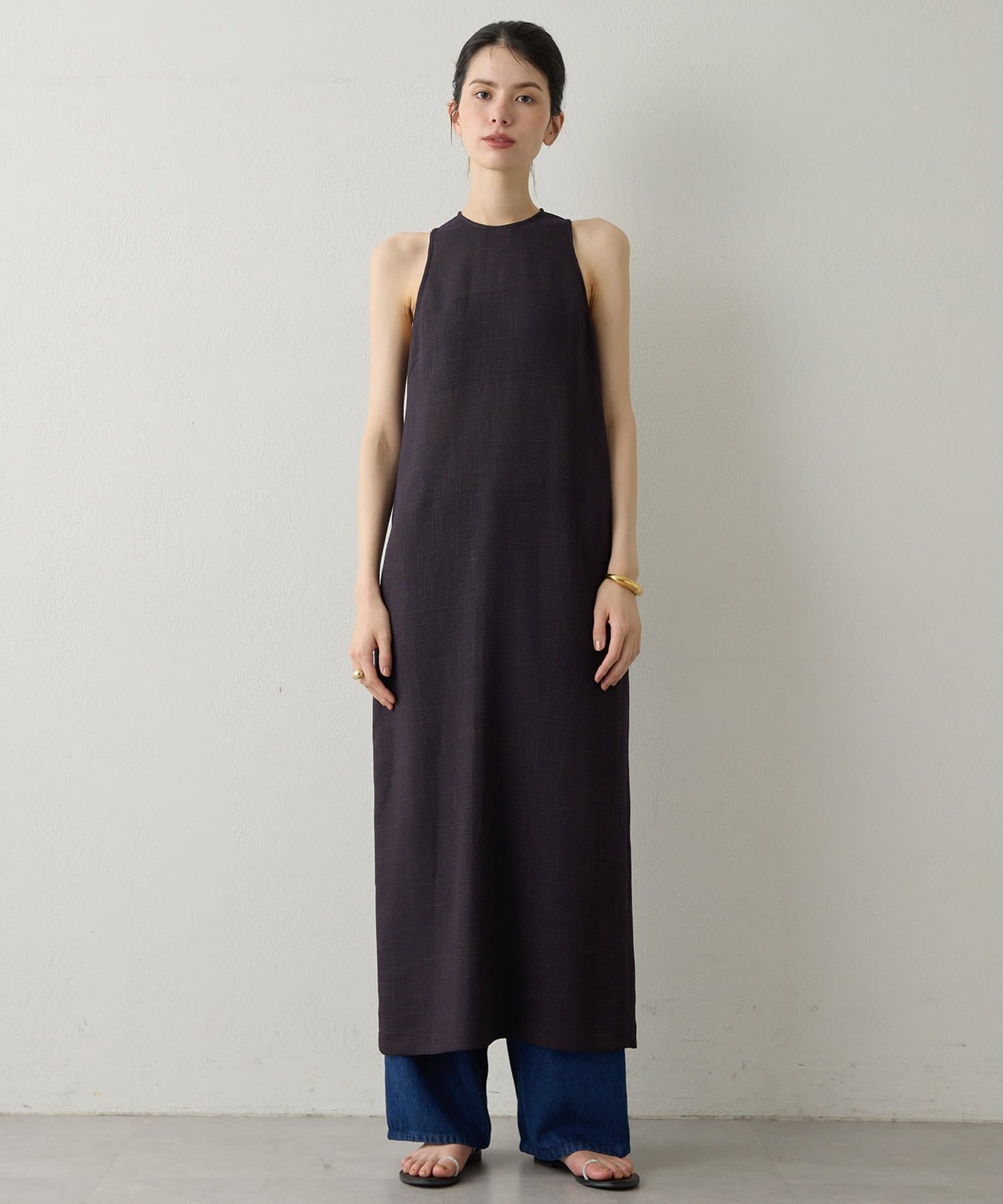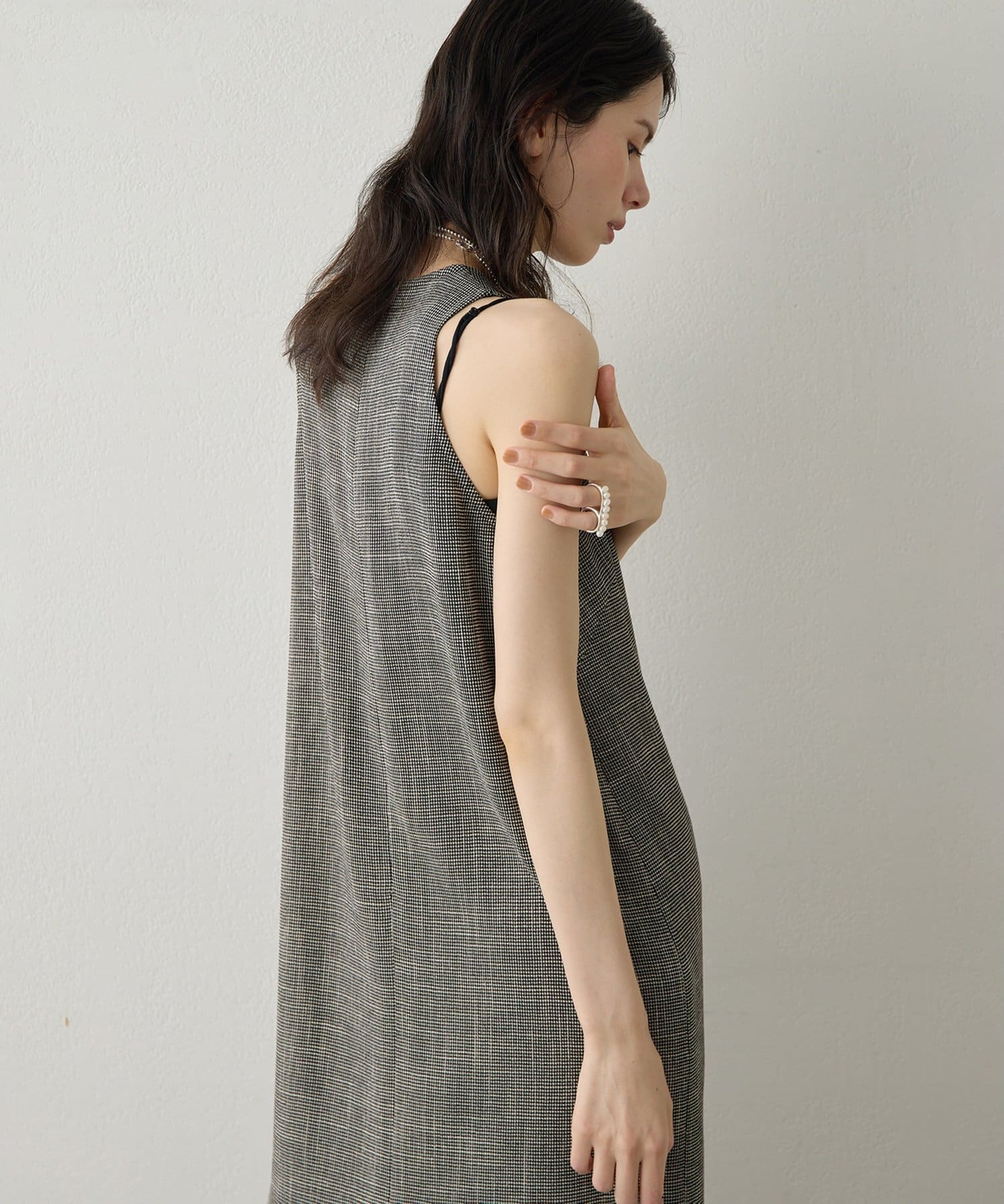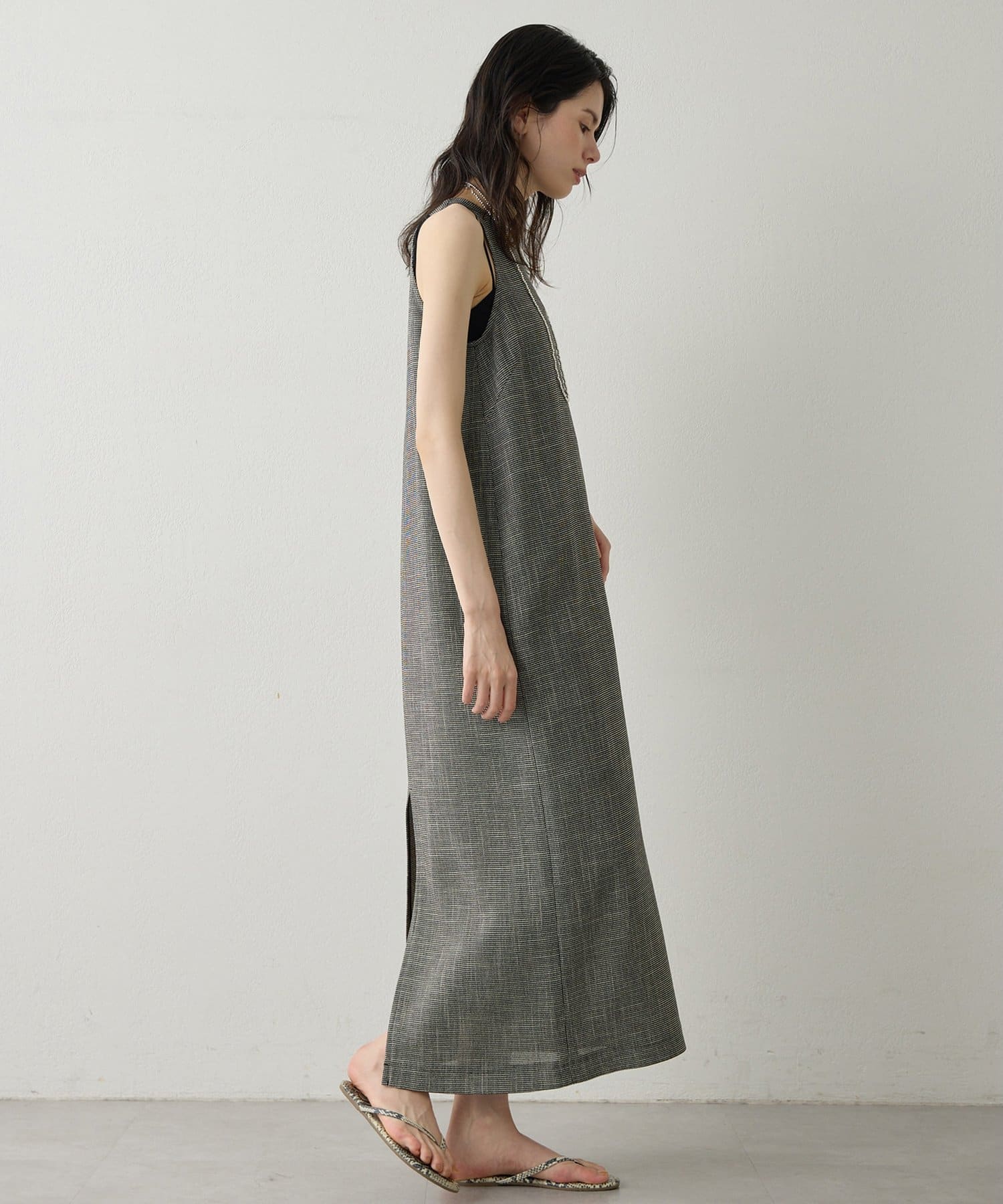 ■表情感のある生地で仕立てたノースリーブワンピース。